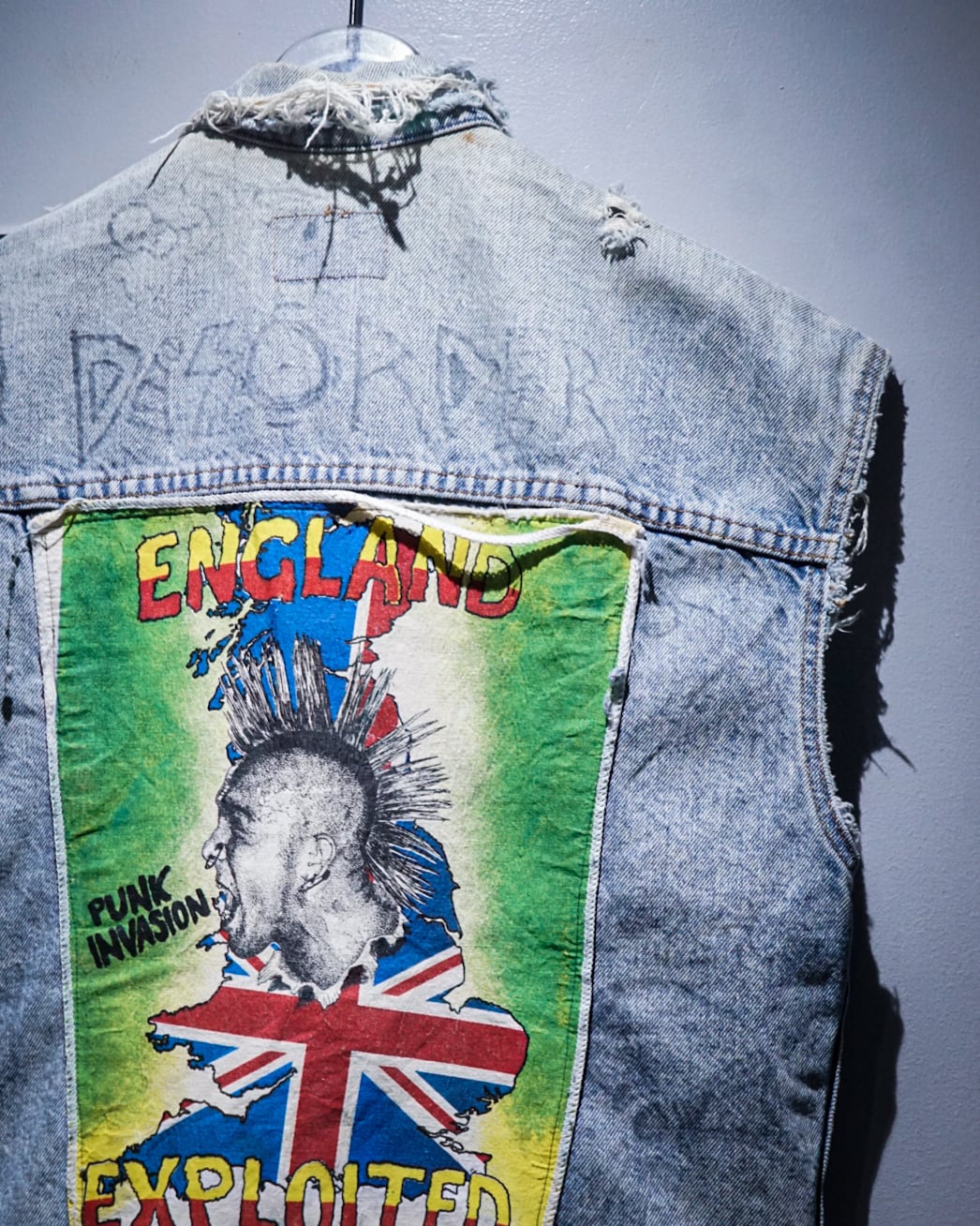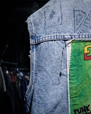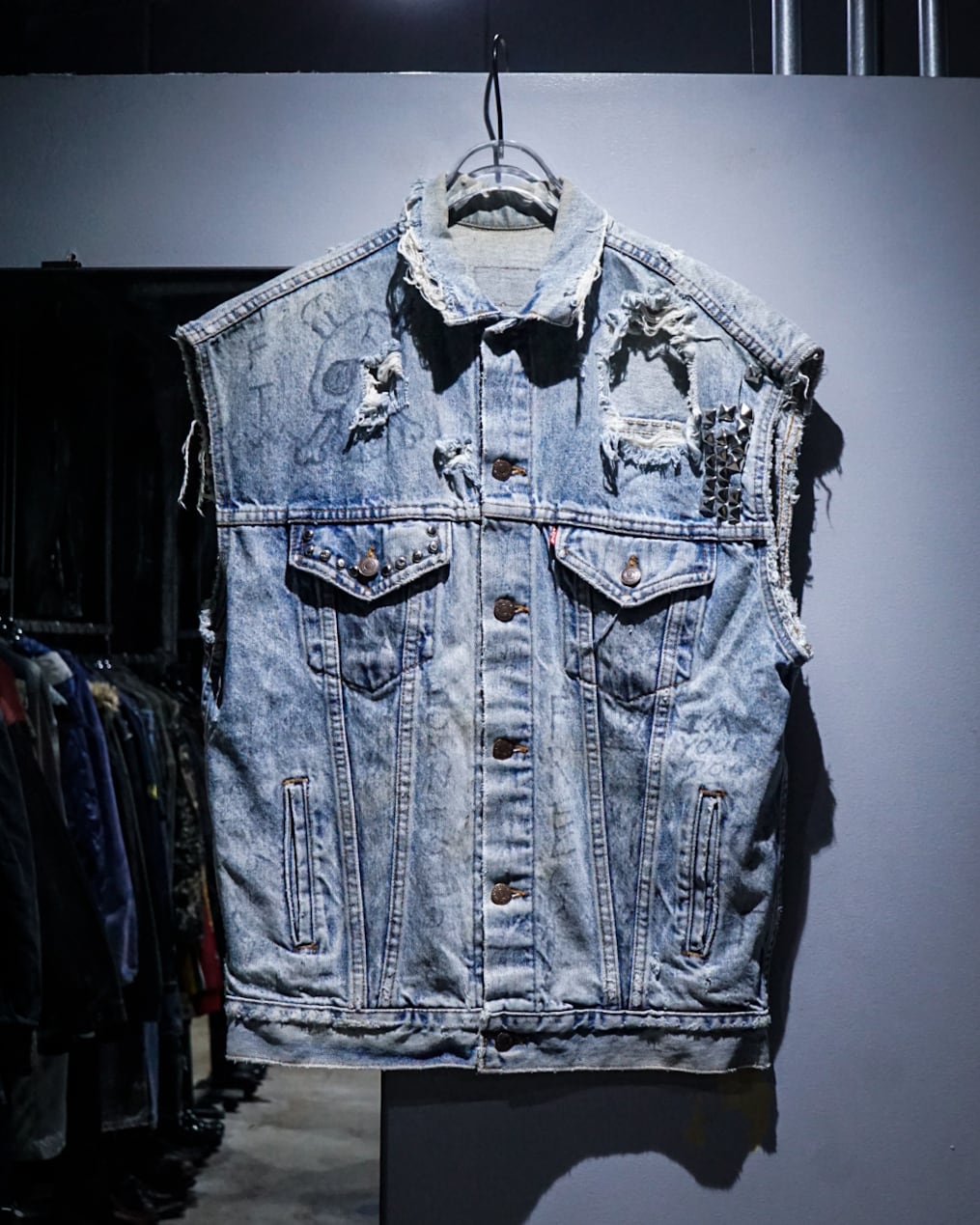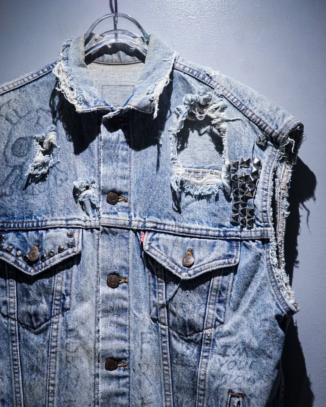 アームホールや襟周りのほつれ、激しいクラッシュ跡、随所に書き込まれたハンドペイントや、胸元に打ち込まれたスタッズに前所有者の思想をヒシヒシと感じられますね。