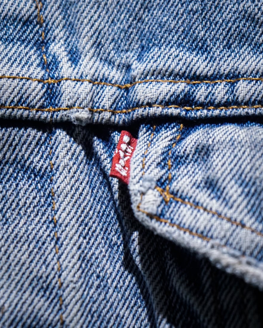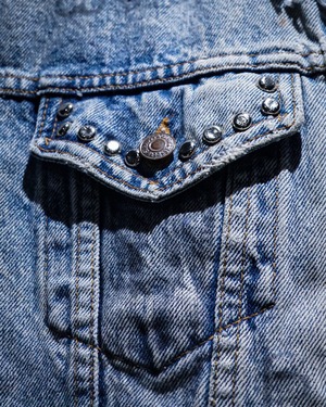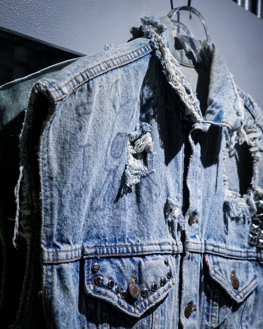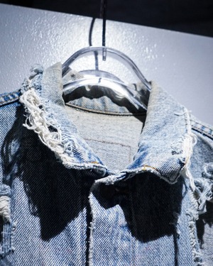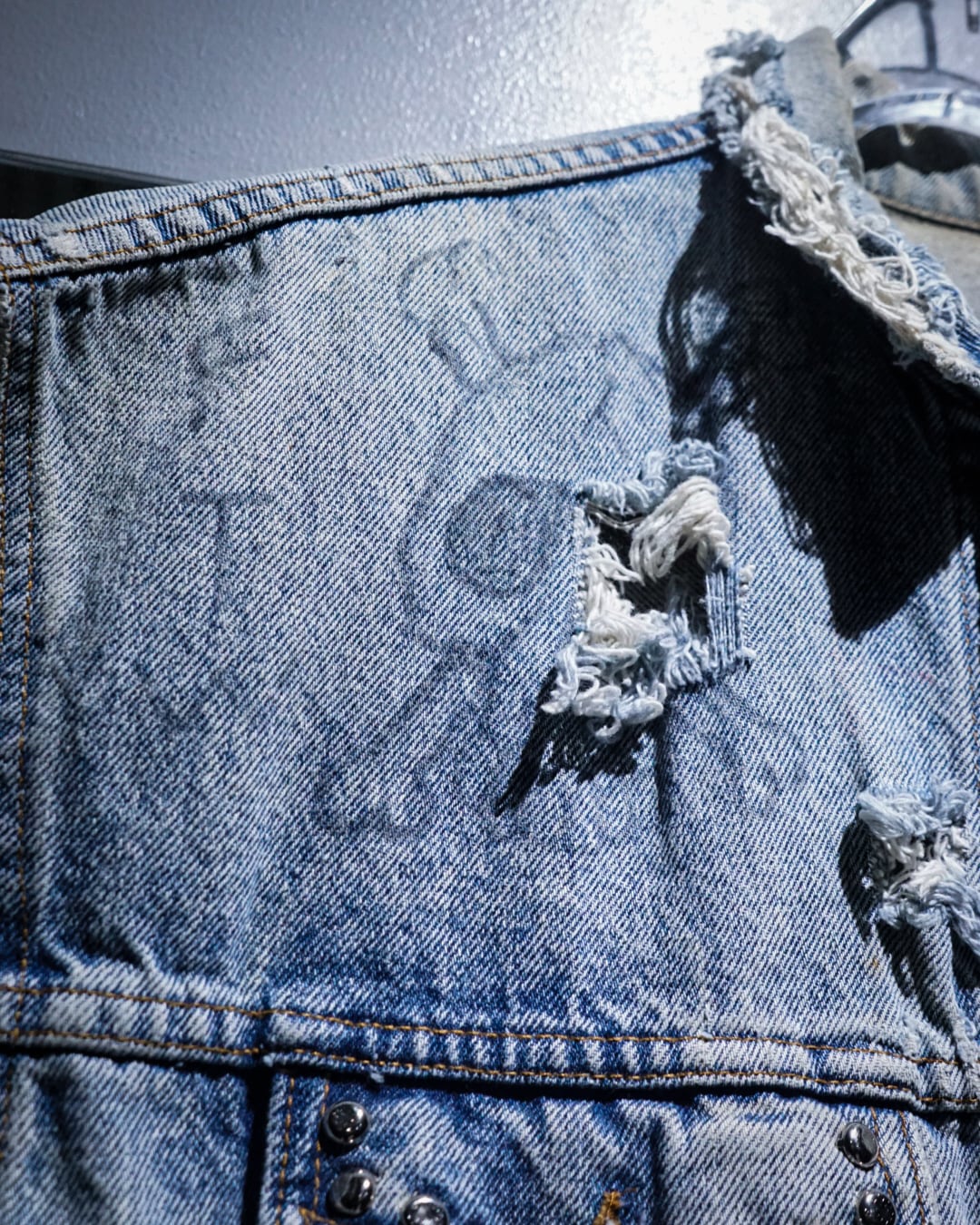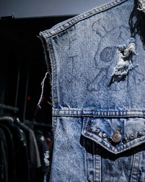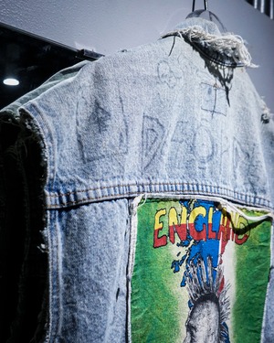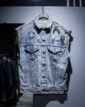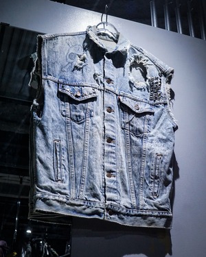 “Levi's”のデニムジャケットのアームを大胆にカットし、パンクカスタムを施したスペシャルなデニムジャケット。