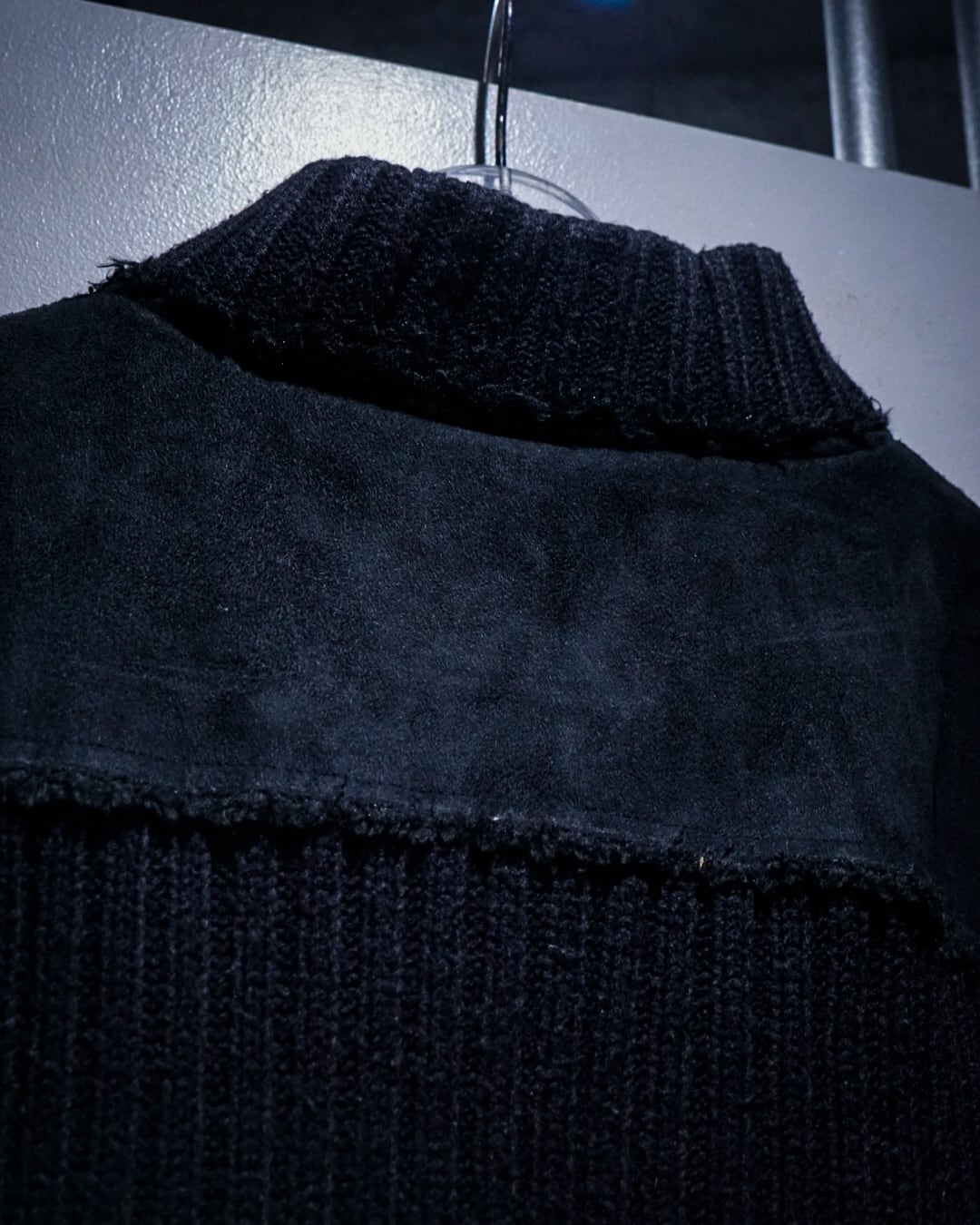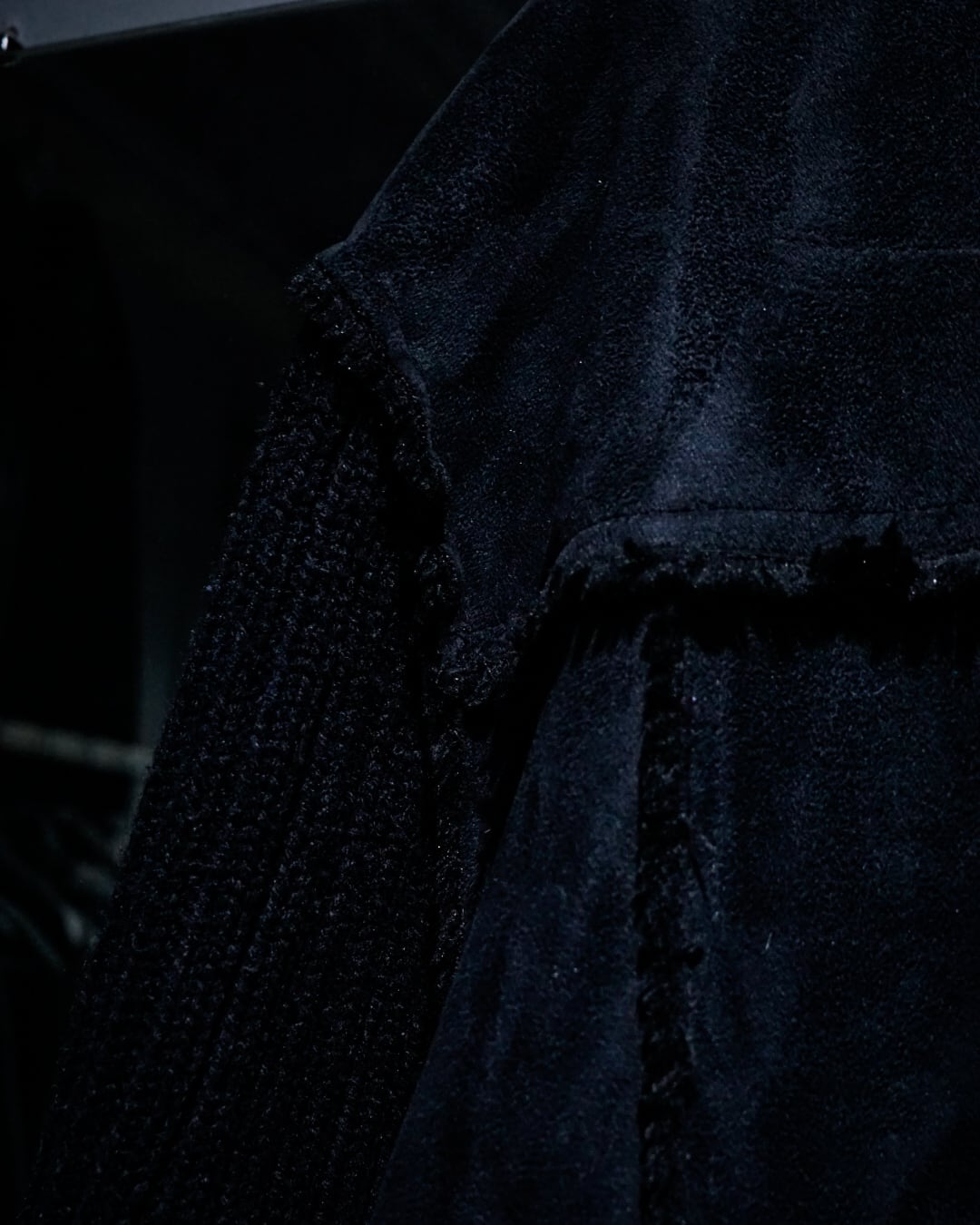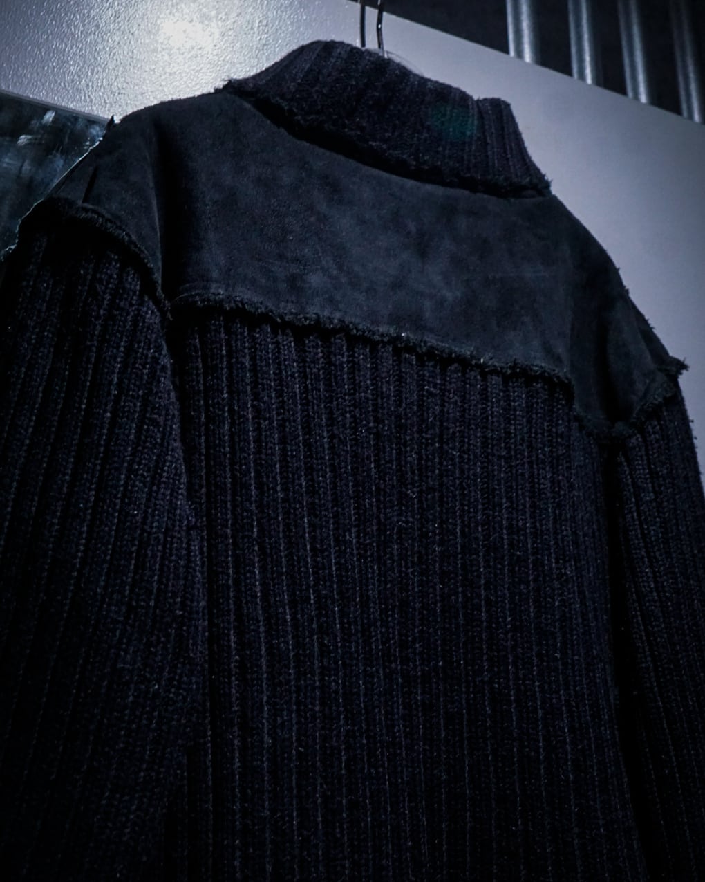 異素材のコントラストが際立つ、立体的で奥行きのあるブラックワントーン。マットなスエード調フェイクレザーとニットの柔らかな編地が生み出す陰影に、インサイドアウトのディテールが無骨さと上品さを同時に演出します。