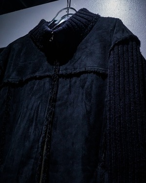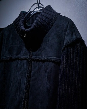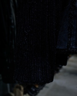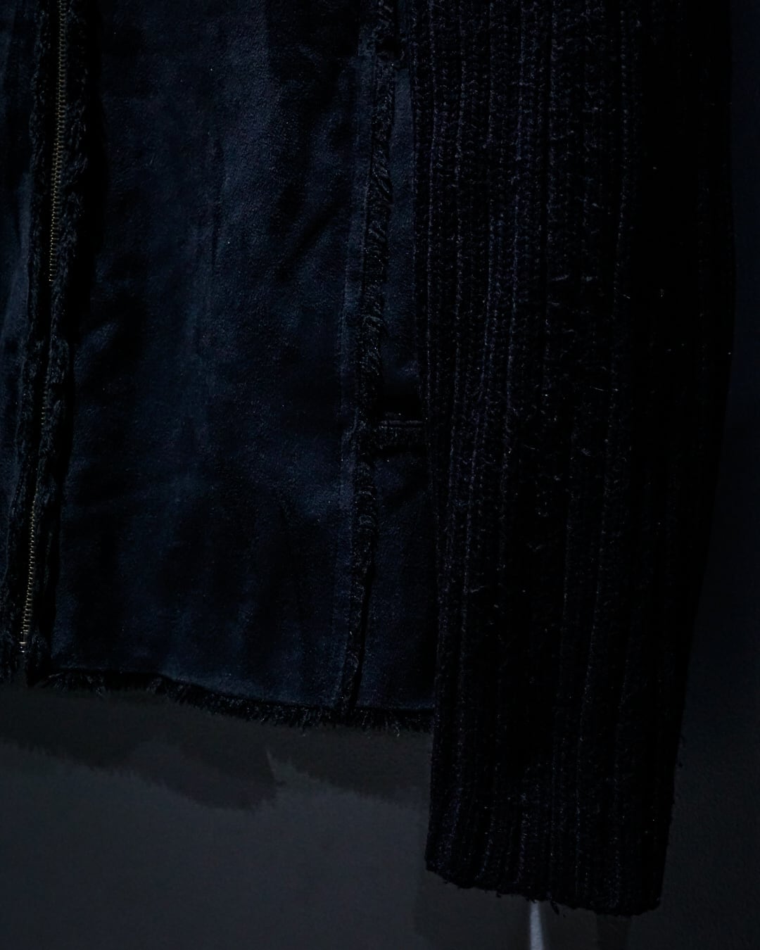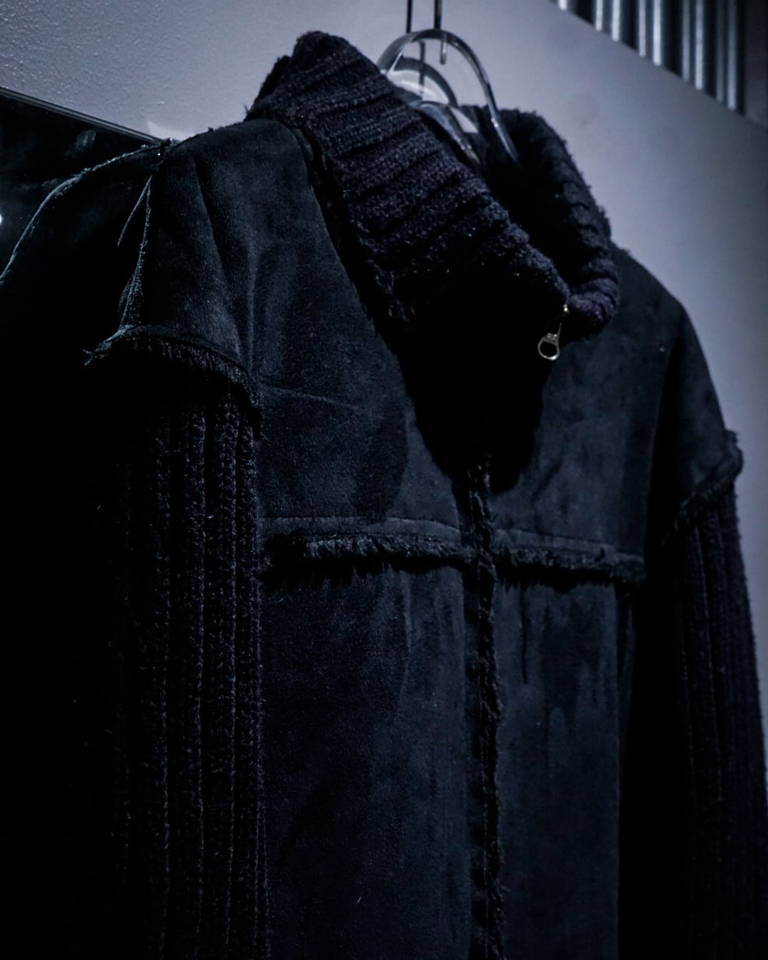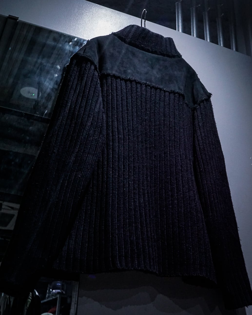 異素材のコントラストが際立つ、立体的で奥行きのあるブラックワントーン。マットなスエード調フェイクレザーとニットの柔らかな編地が生み出す陰影に、インサイドアウトのディテールが無骨さと上品さを同時に演出します。