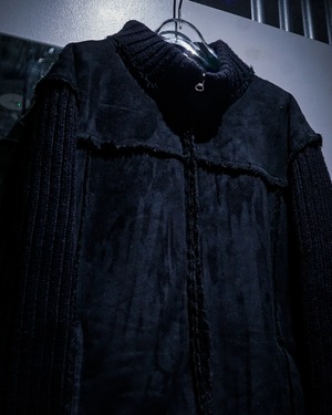 伸縮性のあるリブニットをベースに、身頃へ滑らかなムートン調のフェイクレザーを切り替えたニットジャケット。