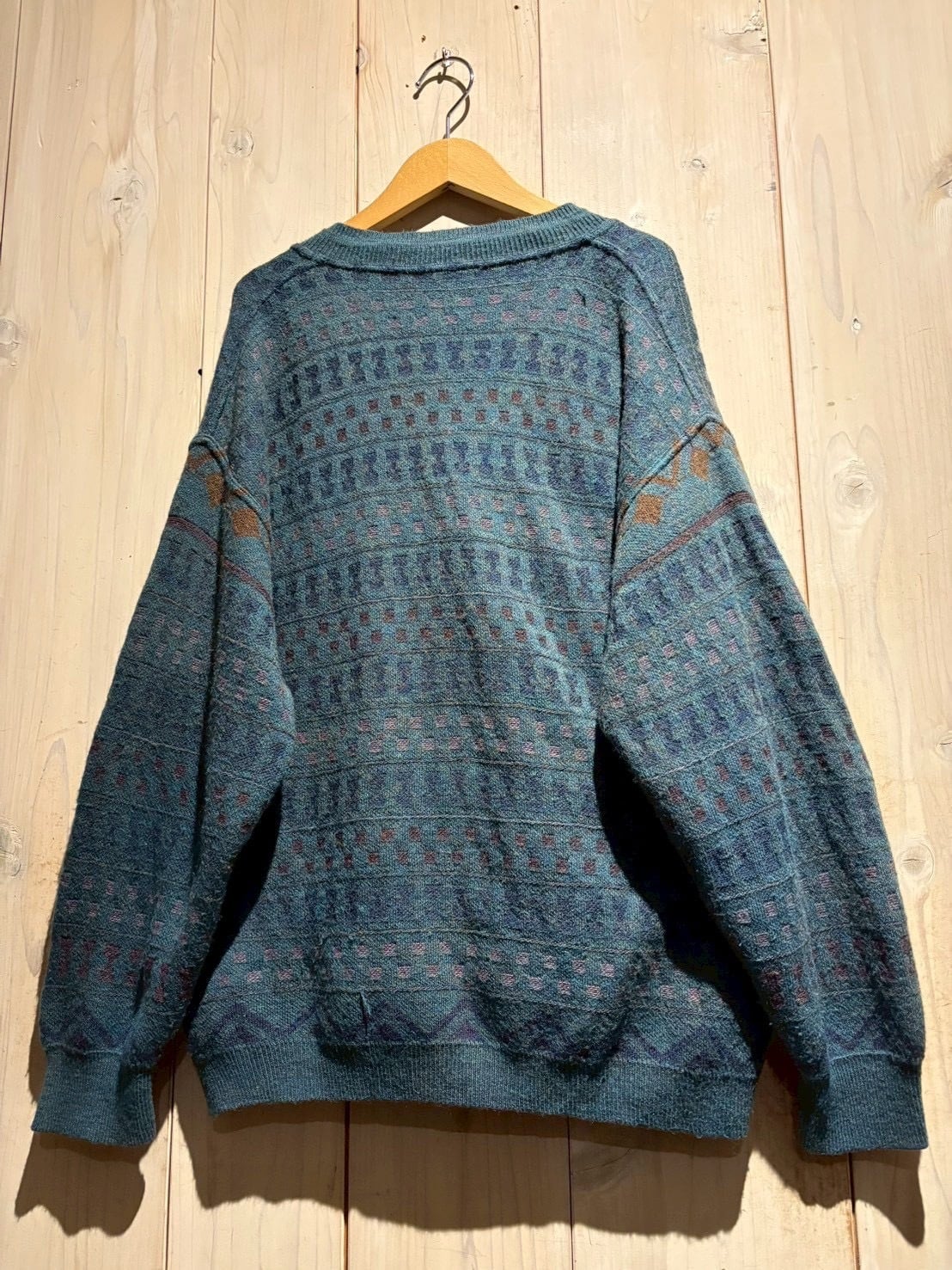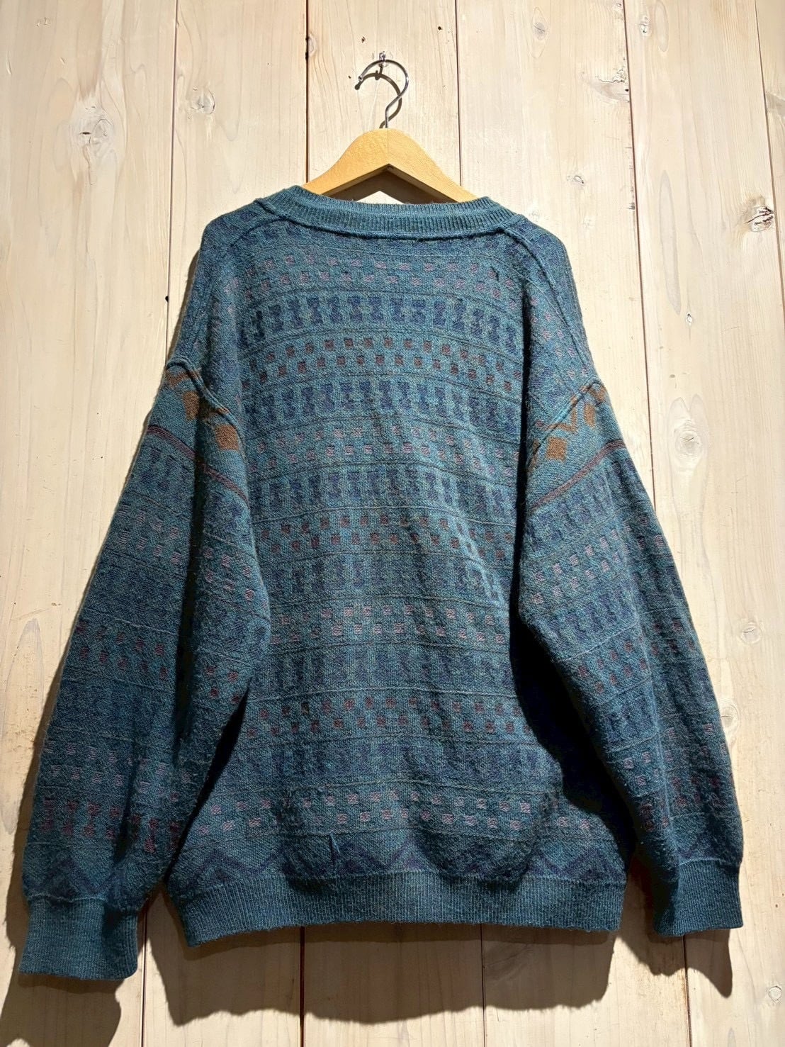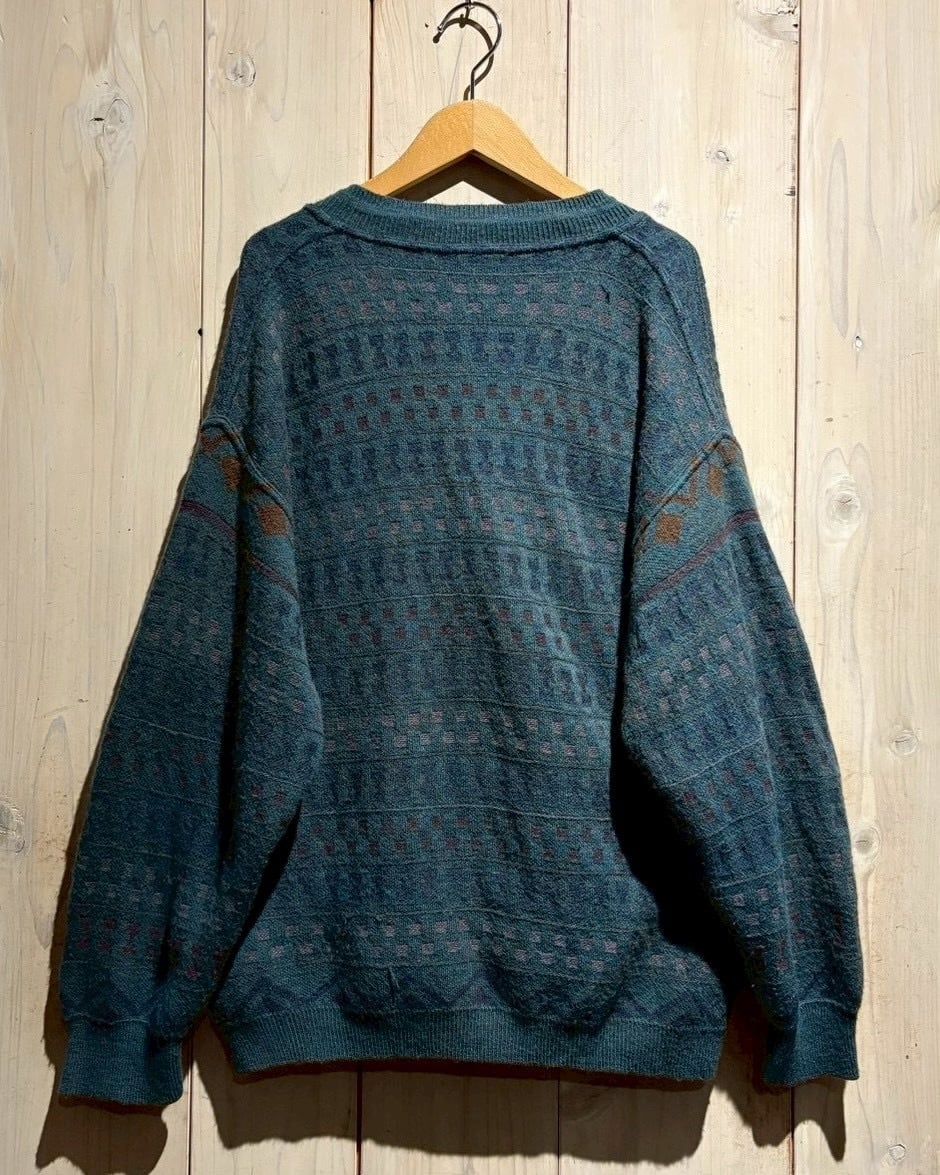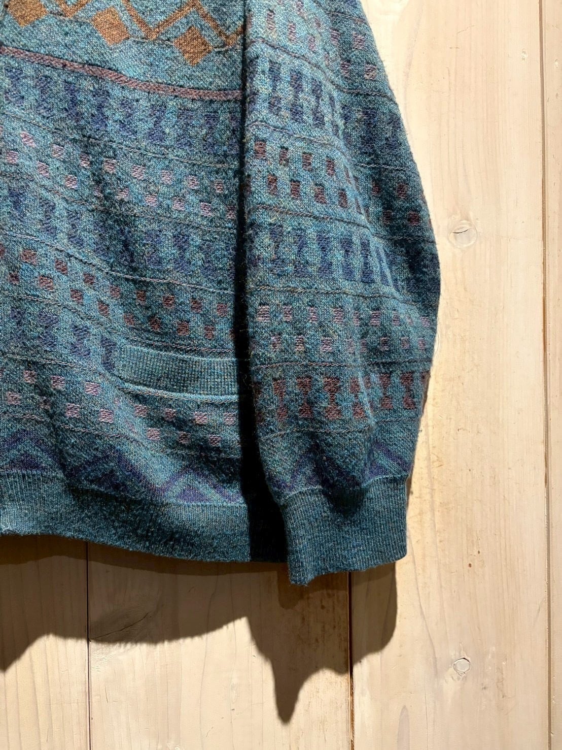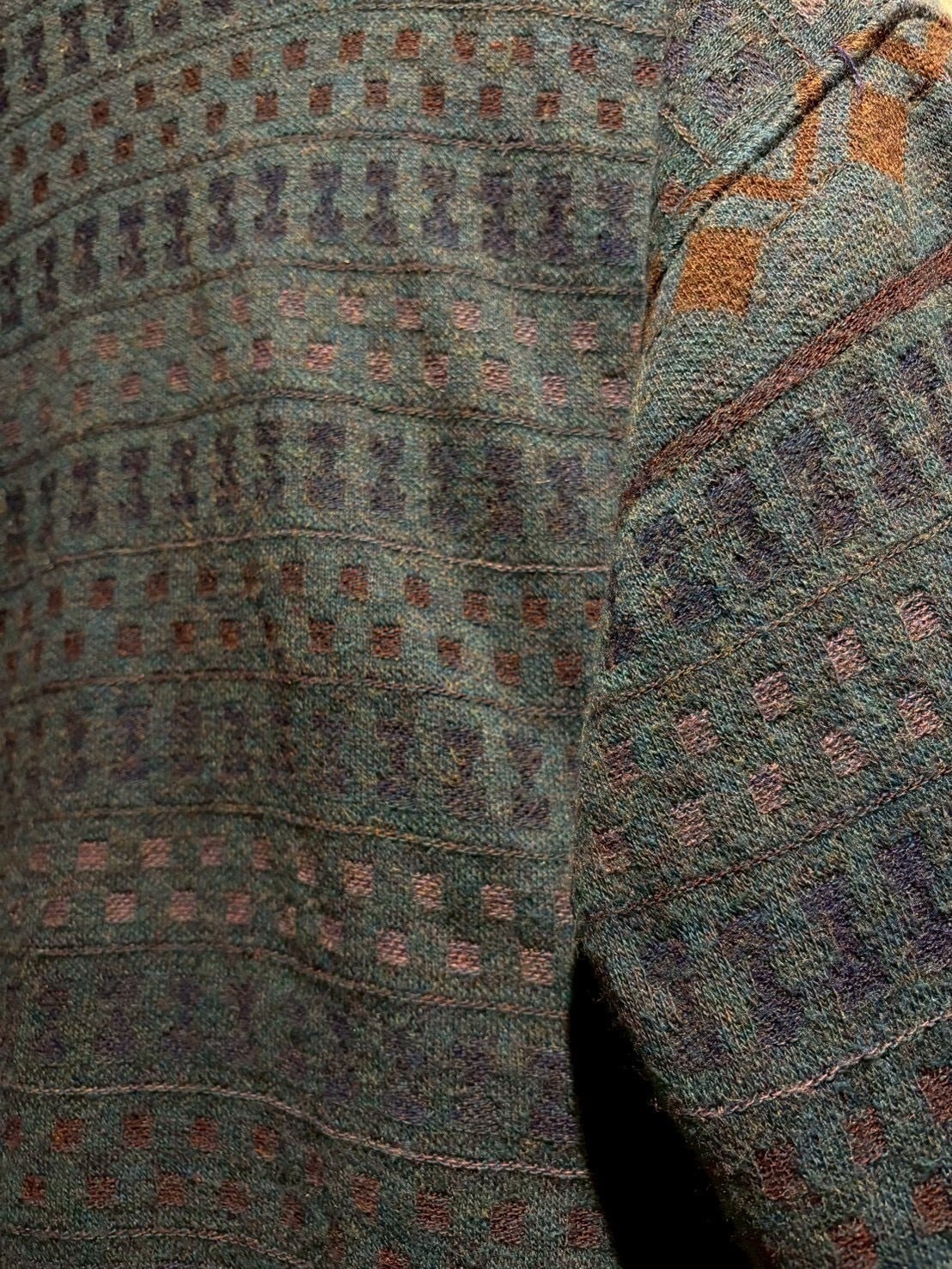 深みのあるティールブルーをベースに、ブラウンとパープルの糸を織り交ぜた幾何学パターンがクラシカルでありながらも温もりのある表情を演出。繊細な配色のコントラストがヴィンテージらしい奥行きを生み出しています。