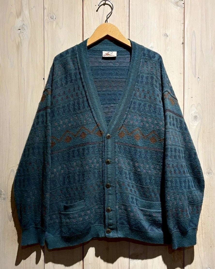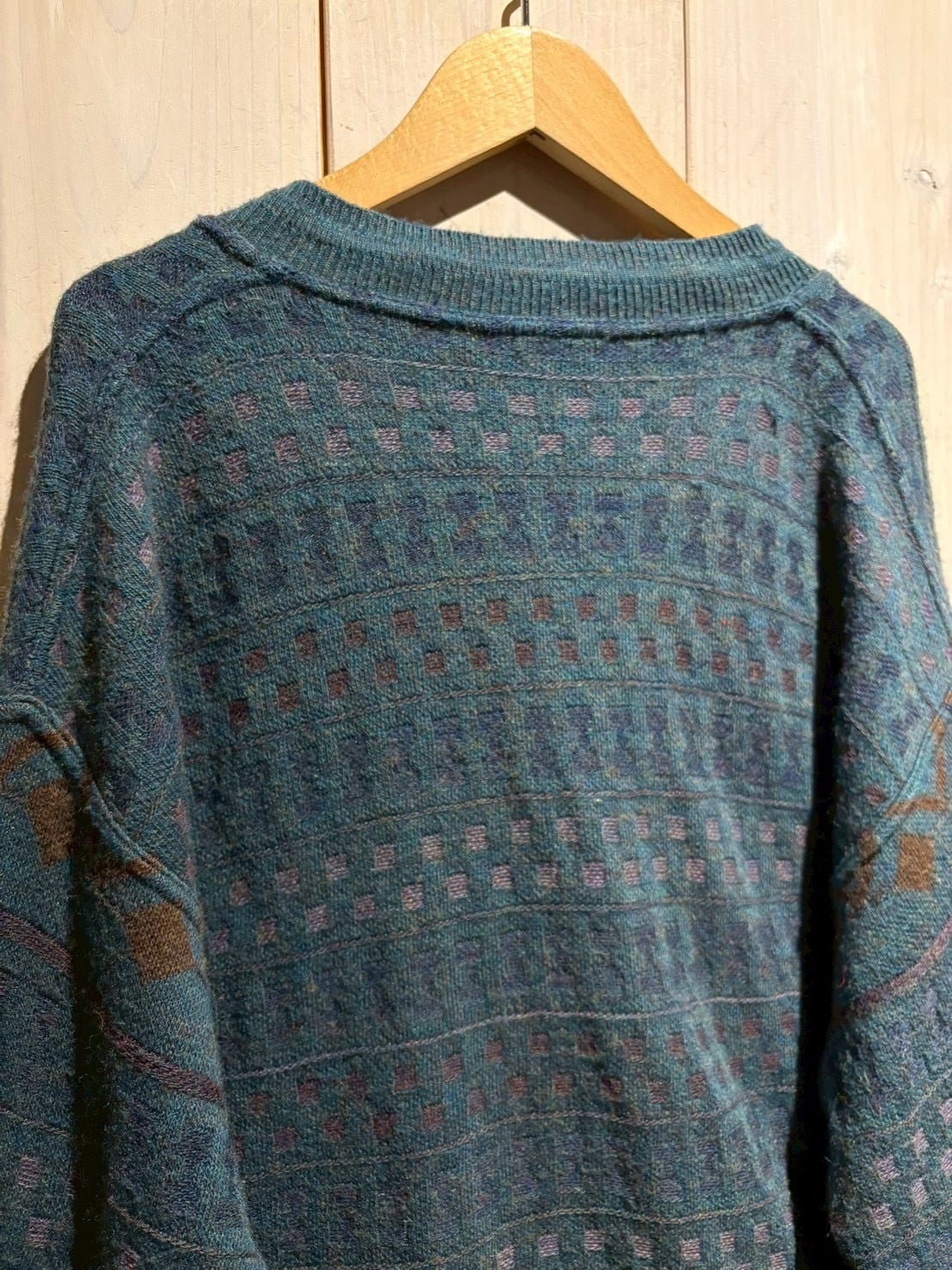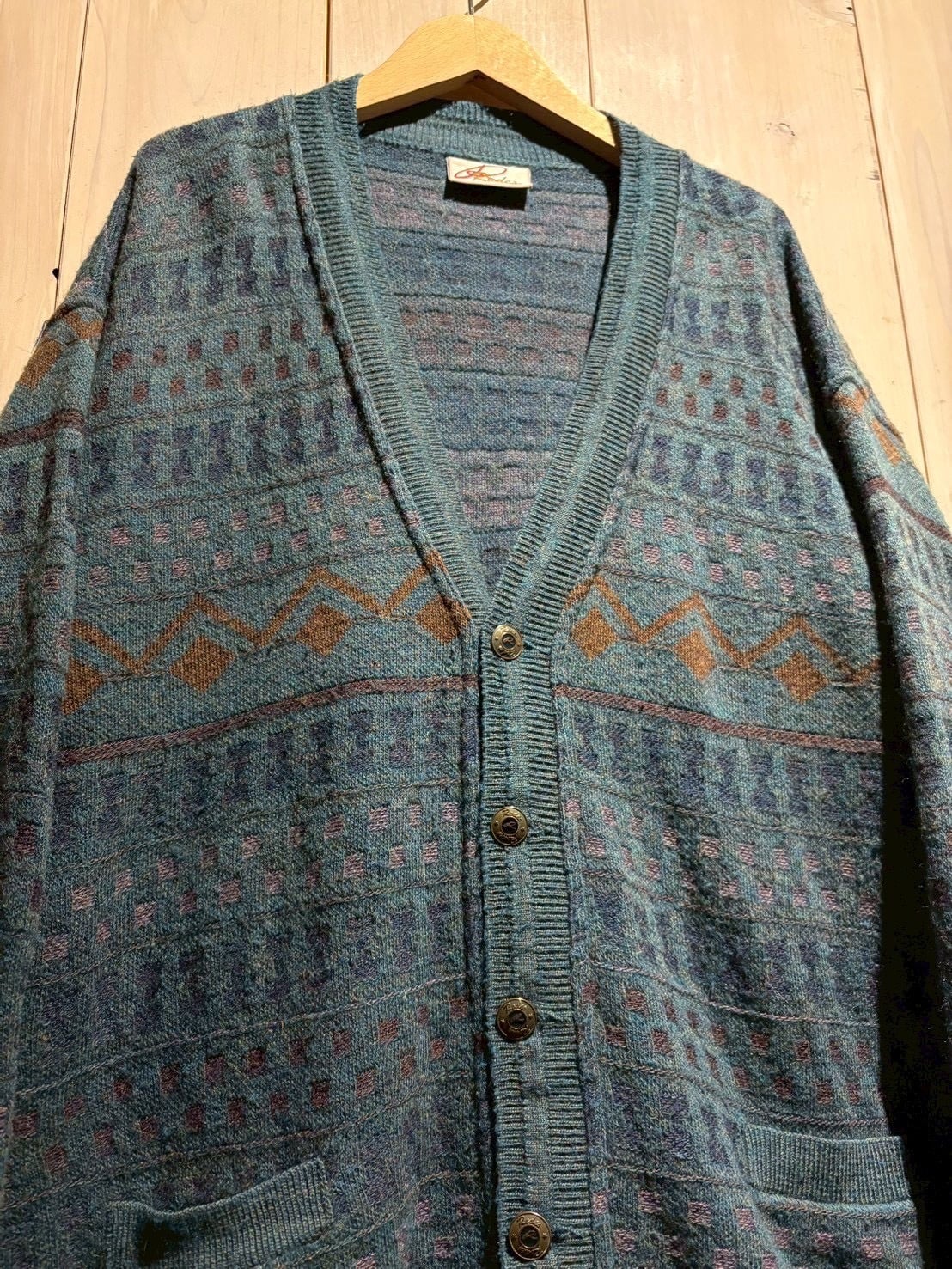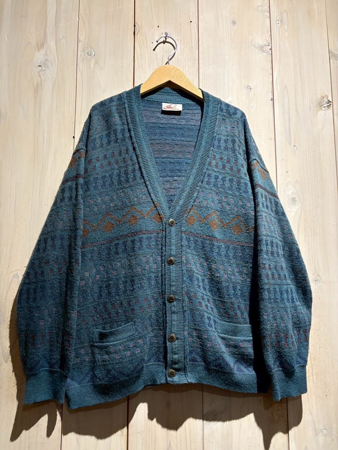 深みのあるティールブルーをベースに、ブラウンとパープルの糸を織り交ぜた幾何学パターンがクラシカルでありながらも温もりのある表情を演出。繊細な配色のコントラストがヴィンテージらしい奥行きを生み出しています。