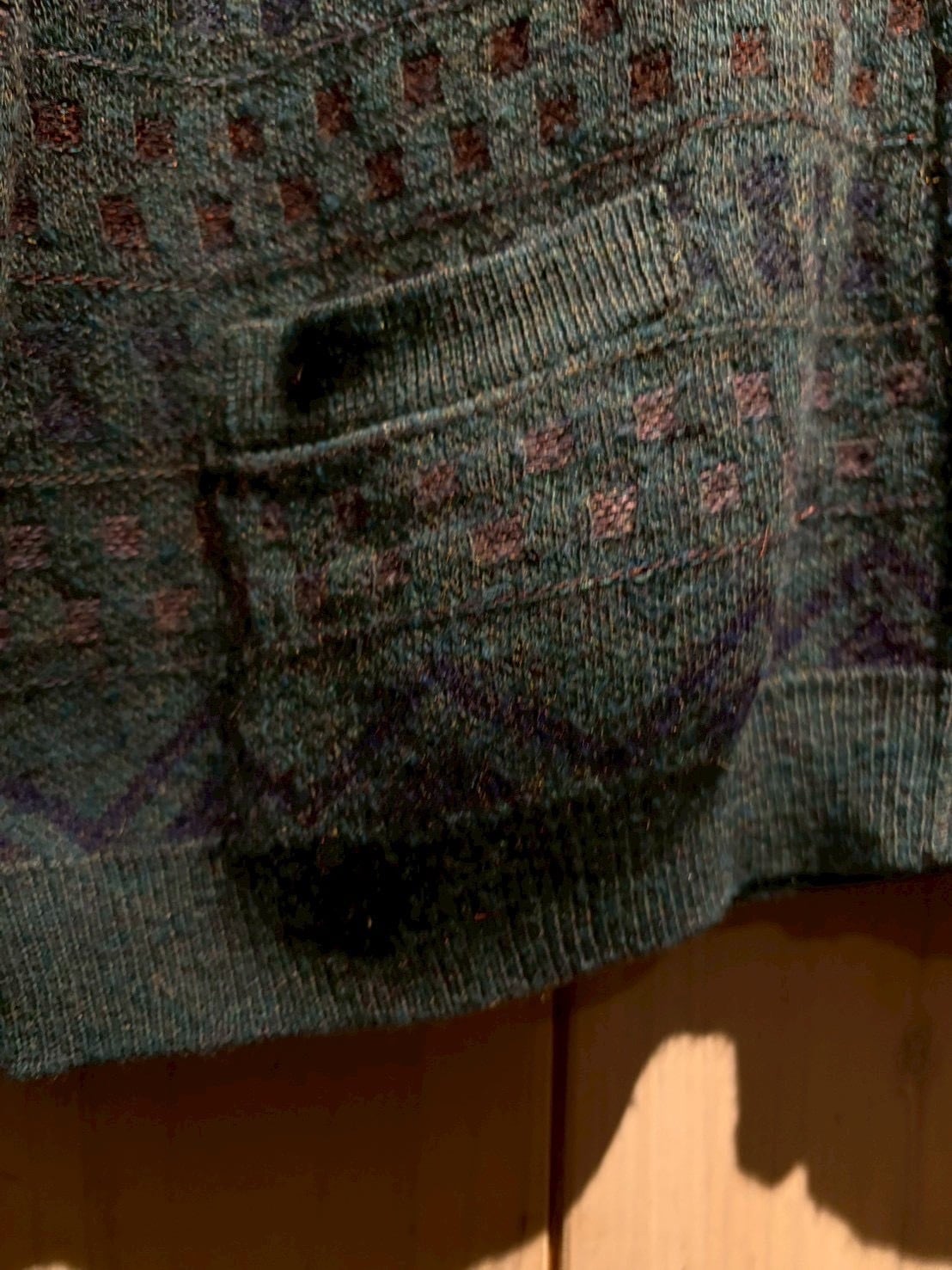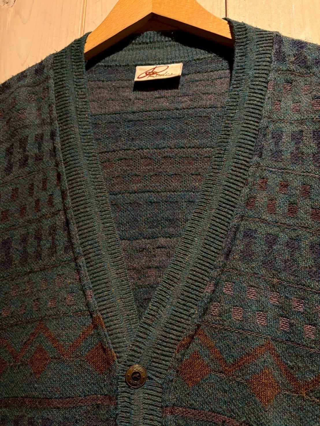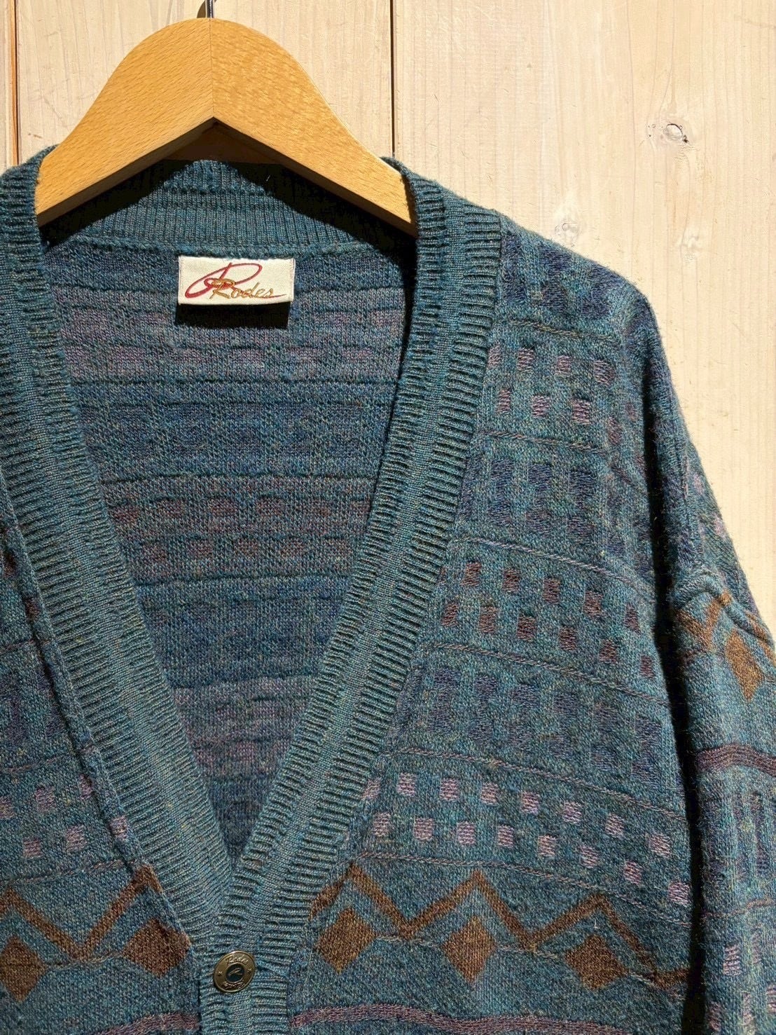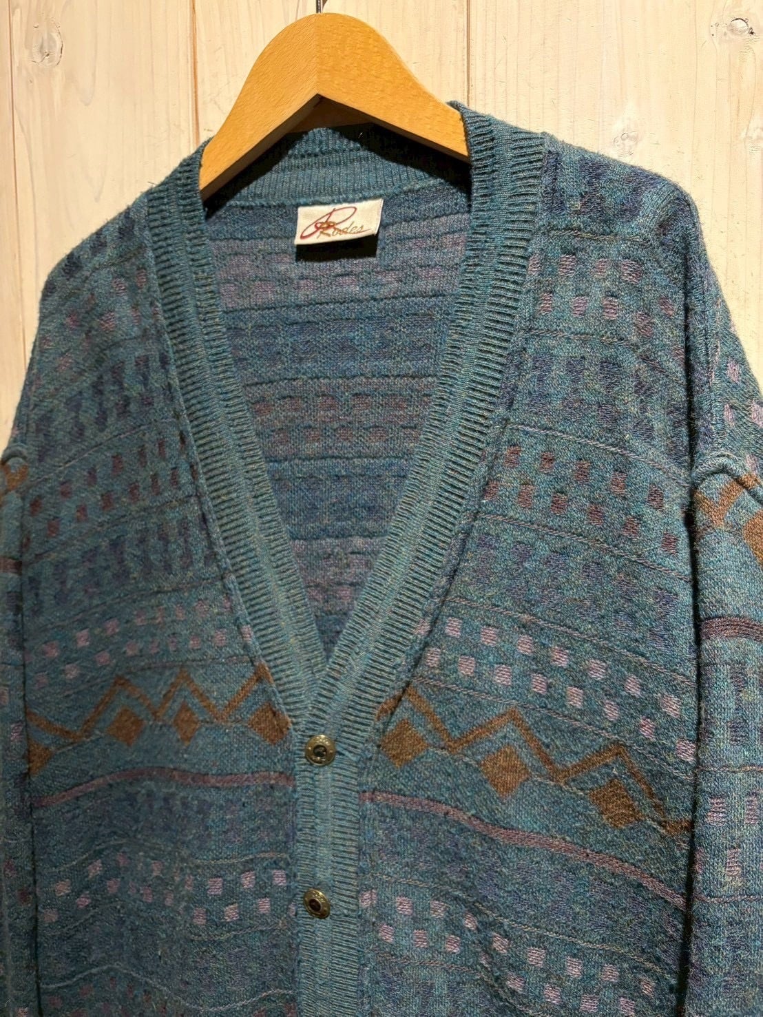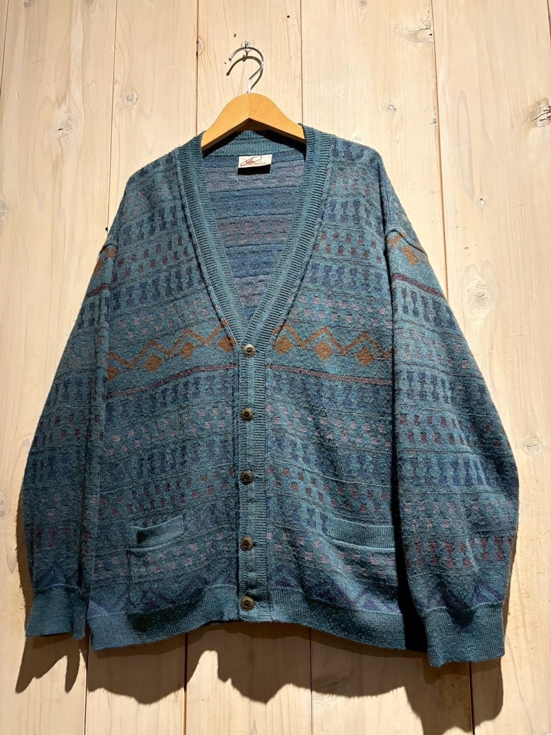 深みのあるティールブルーをベースに、ブラウンとパープルの糸を織り交ぜた幾何学パターンがクラシカルでありながらも温もりのある表情を演出。繊細な配色のコントラストがヴィンテージらしい奥行きを生み出しています。
