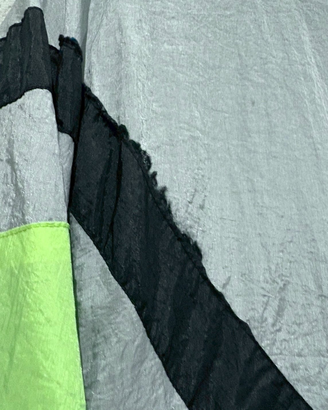 シャリ感のある軽量のナイロンを使用しており、ドライな質感と独特の光沢感が存在感を放ちます。ゆったりとしたアームホールとルーズなシルエットで、レトロなムードを漂わせつつも現代的なスタイリングにも自然に溶け込んでくれるかと。