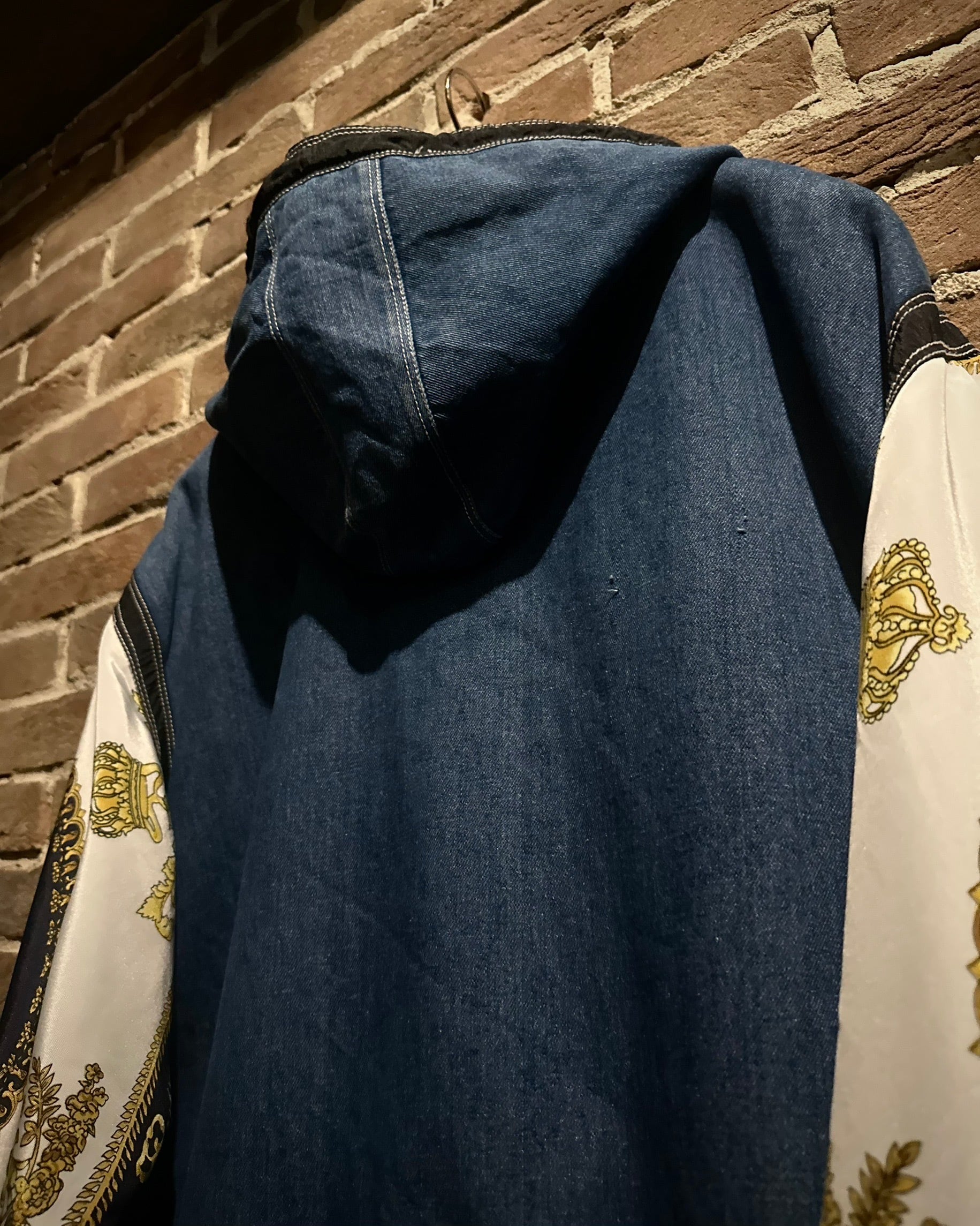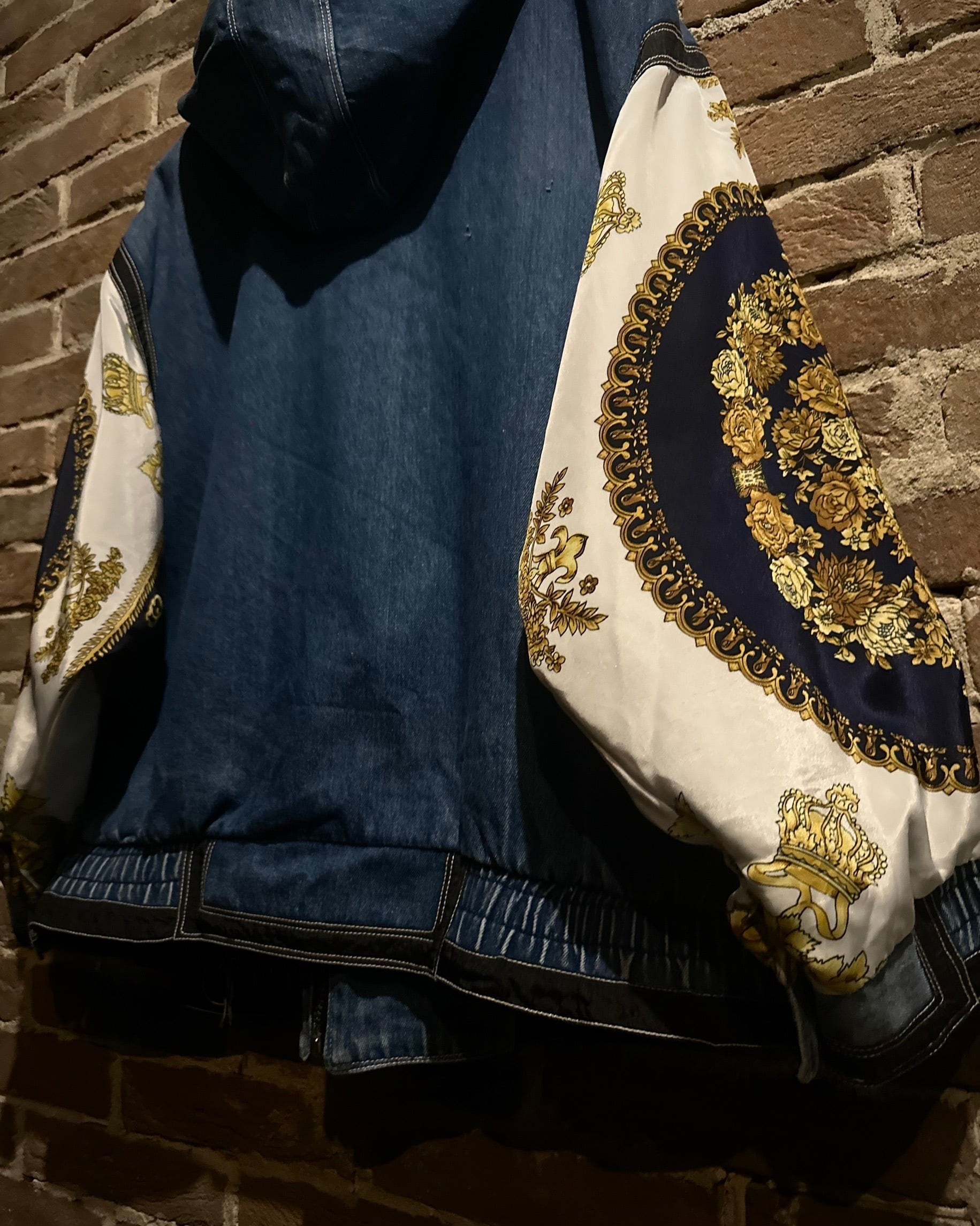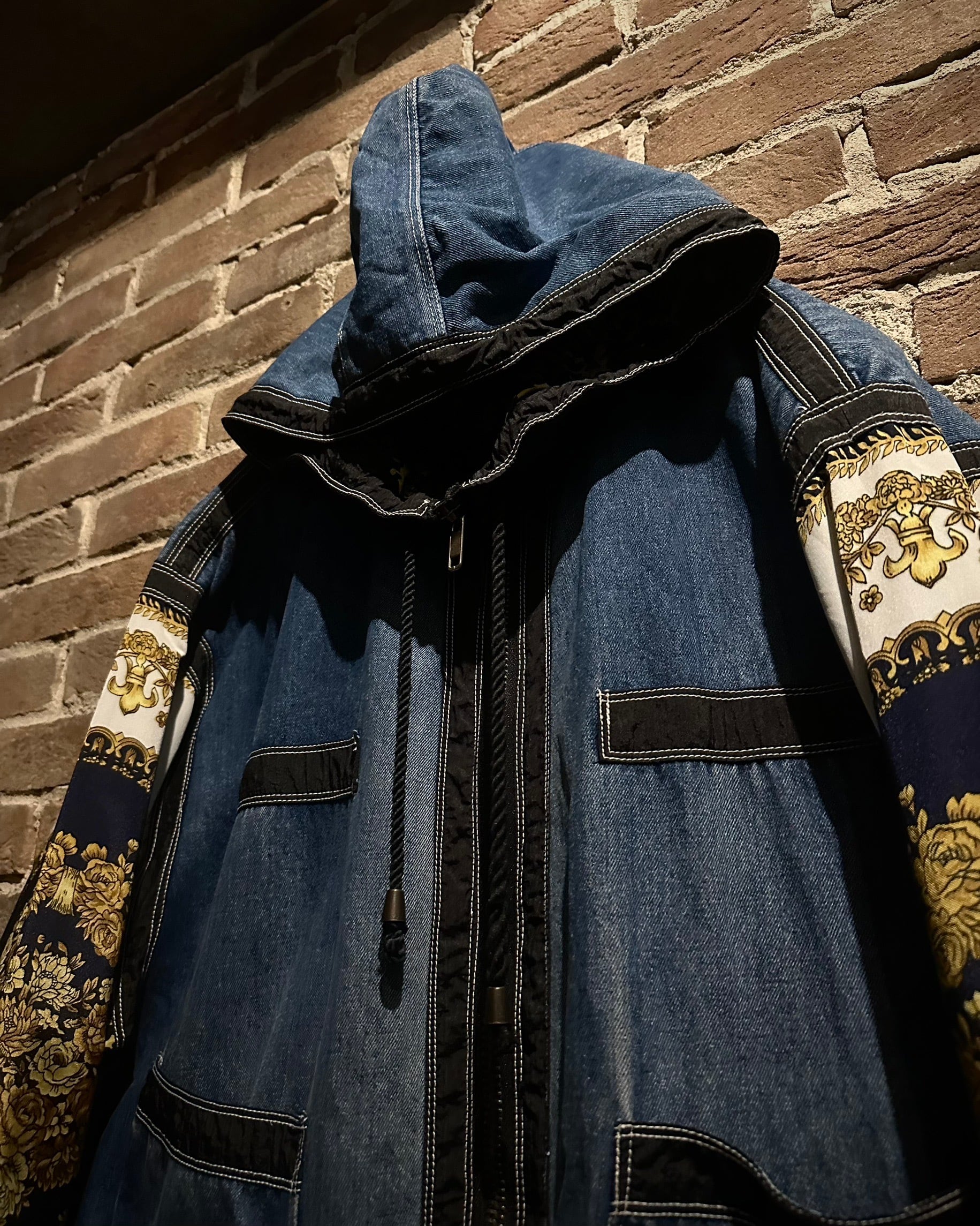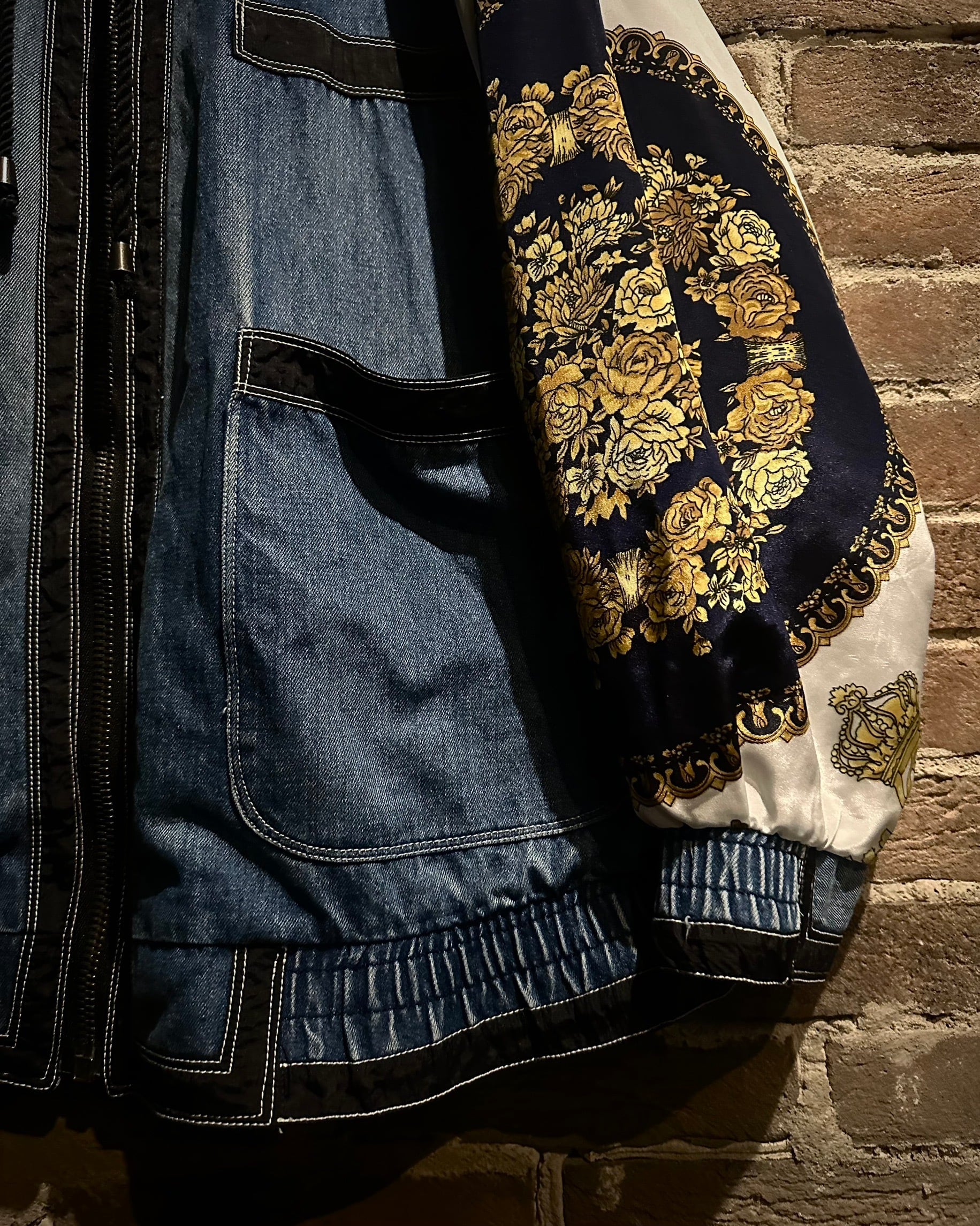 ボディにはタフなインディゴデニム、アームにはスカーフのようなバロック調デザインを採用。カジュアルさとラグジュアリーなエッセンスが絶妙に調和しています。