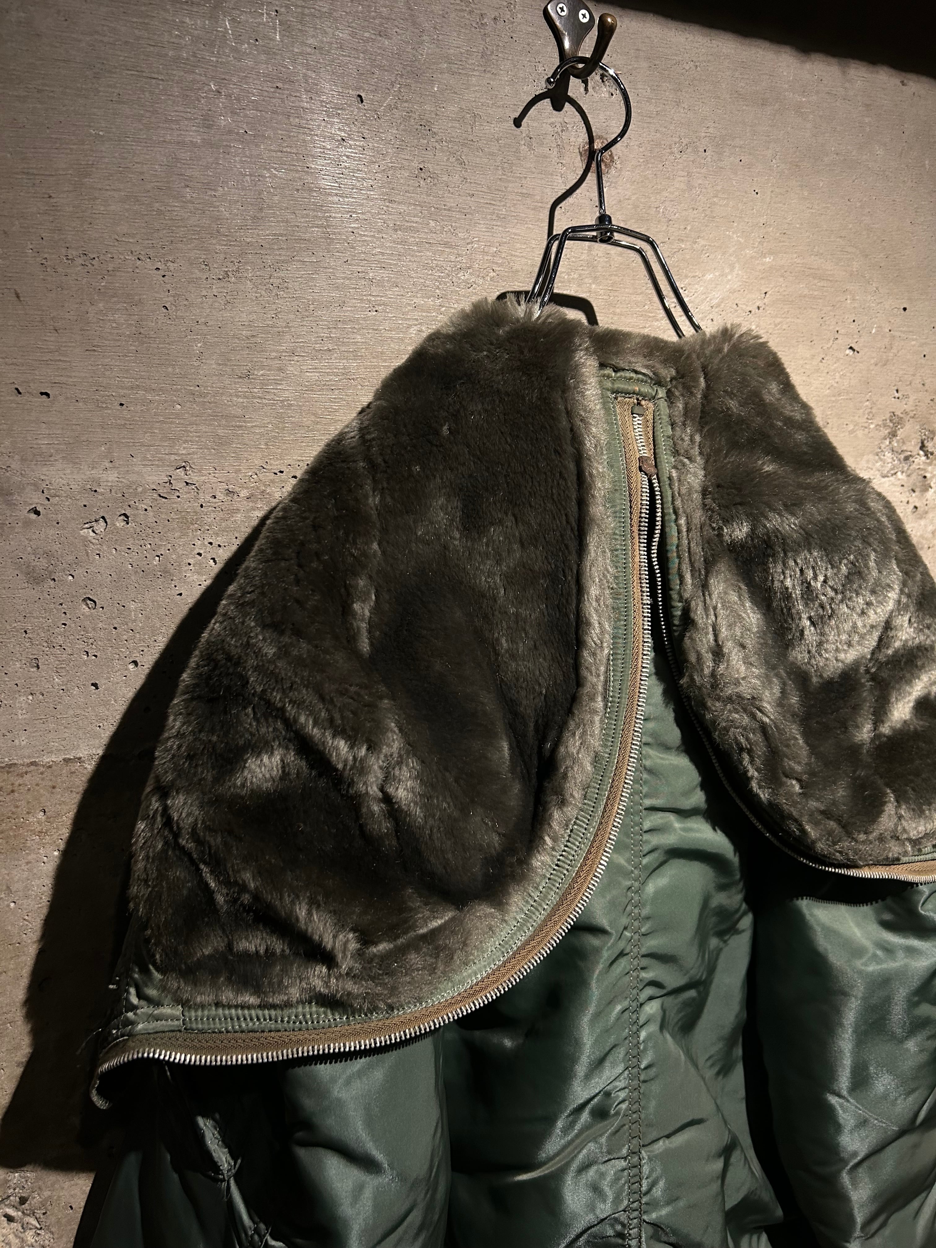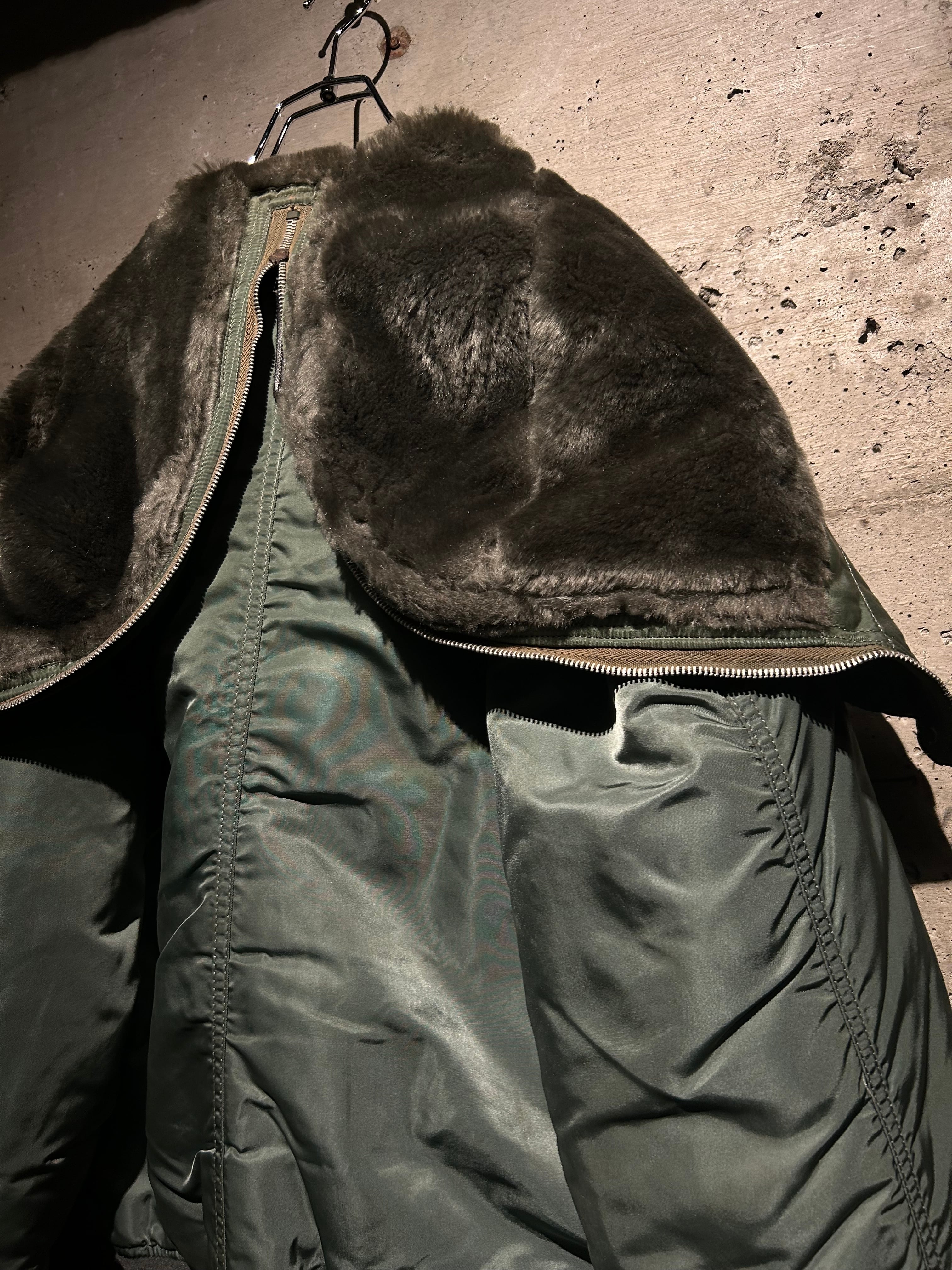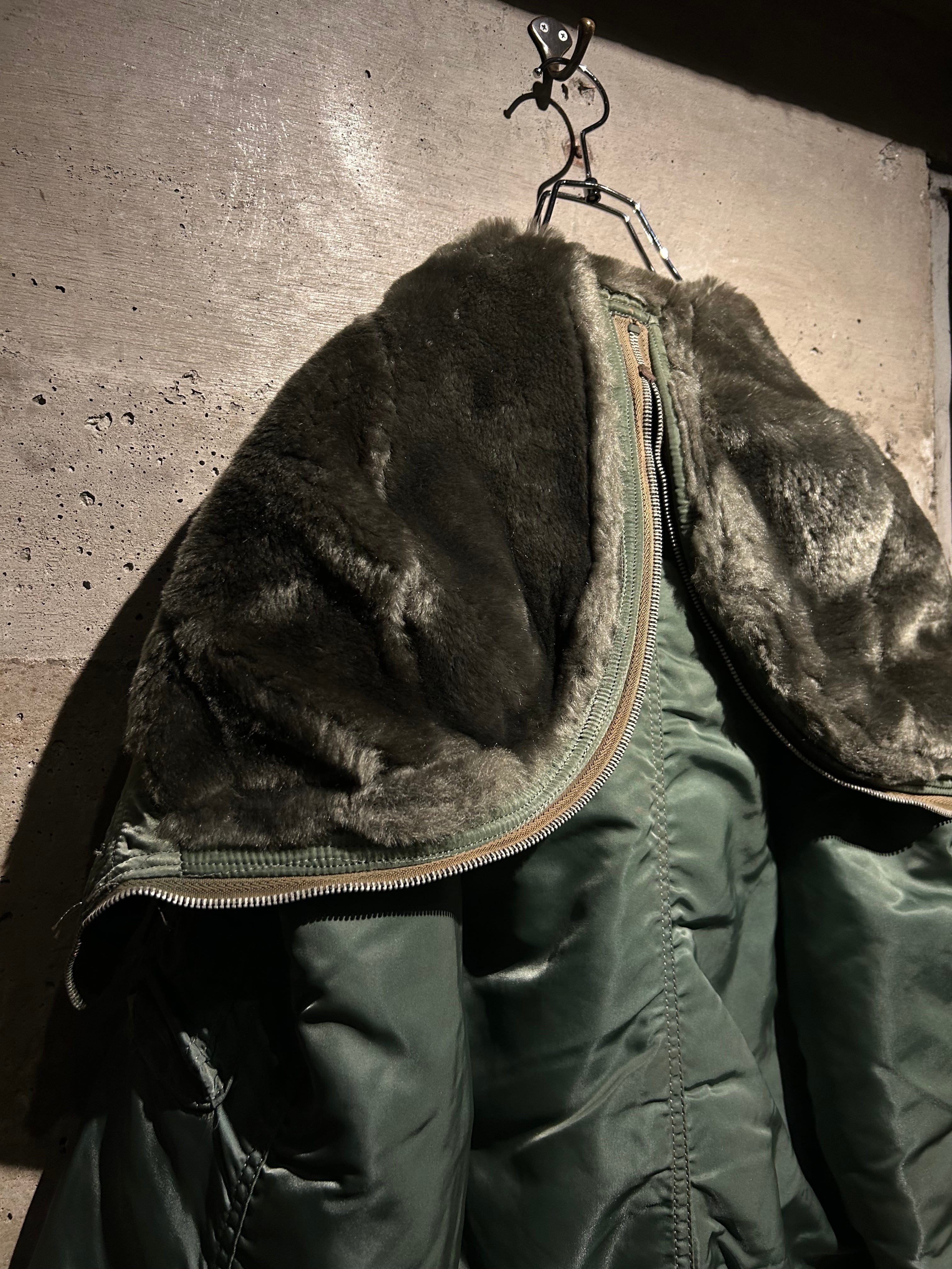 光沢を抑えたセージグリーンのナイロンシェルに、ジップで分割可能なフードの内側には密度の高いフェイクファーを搭載。風を遮断するリブ袖やフロントの比翼構造など、現代でも通用する機能的ディテールが満載。