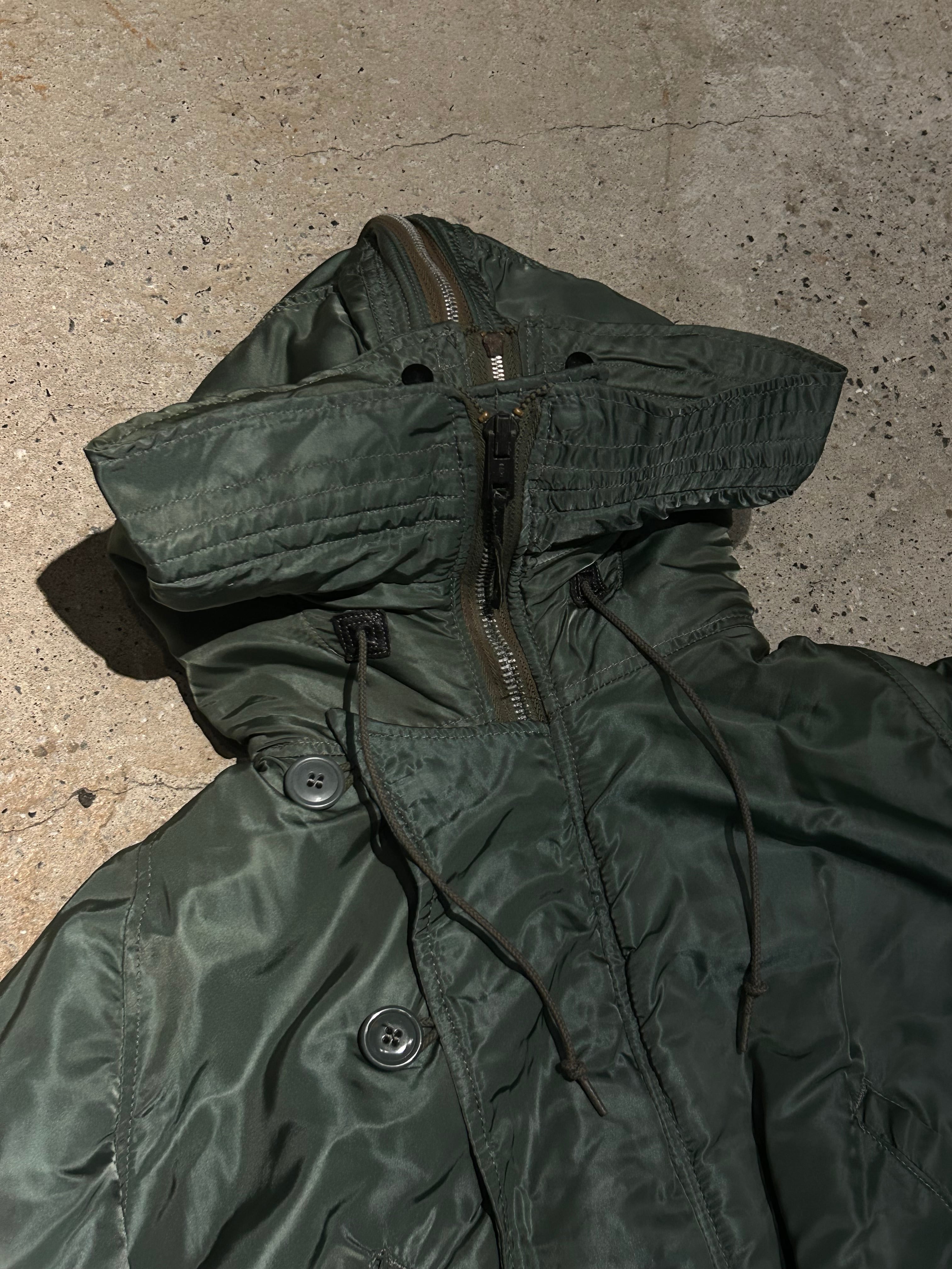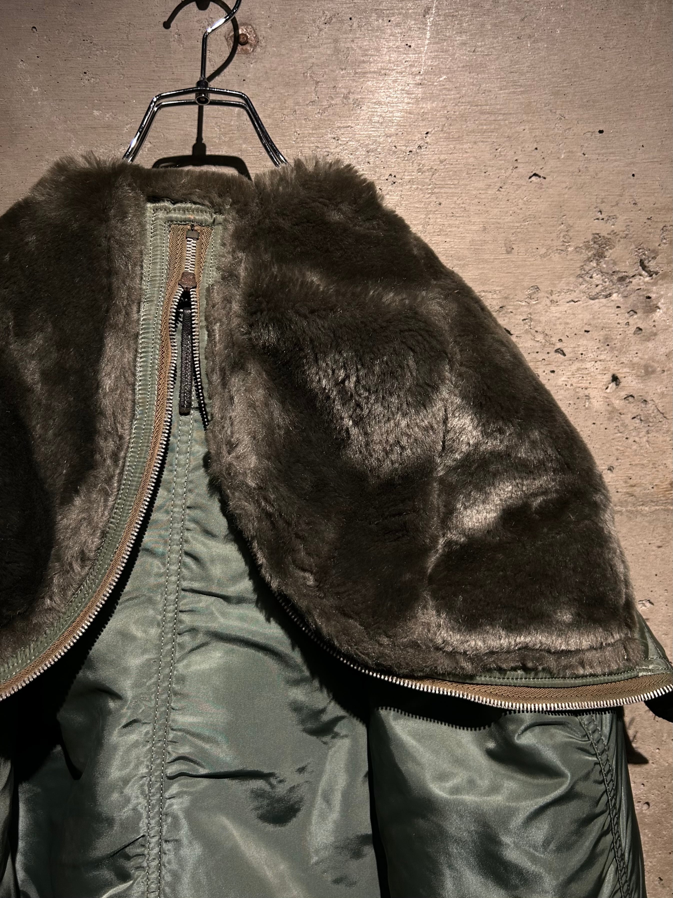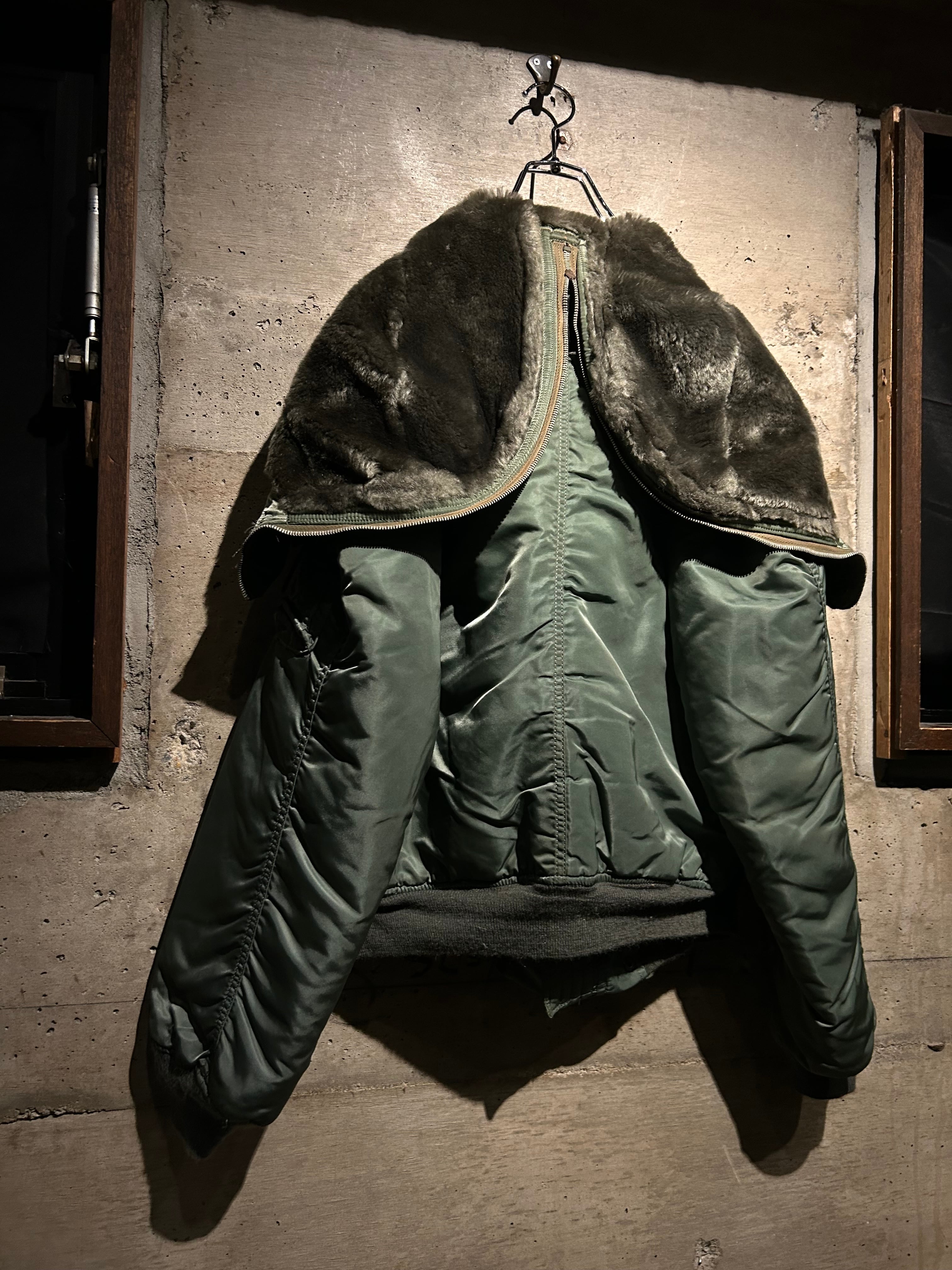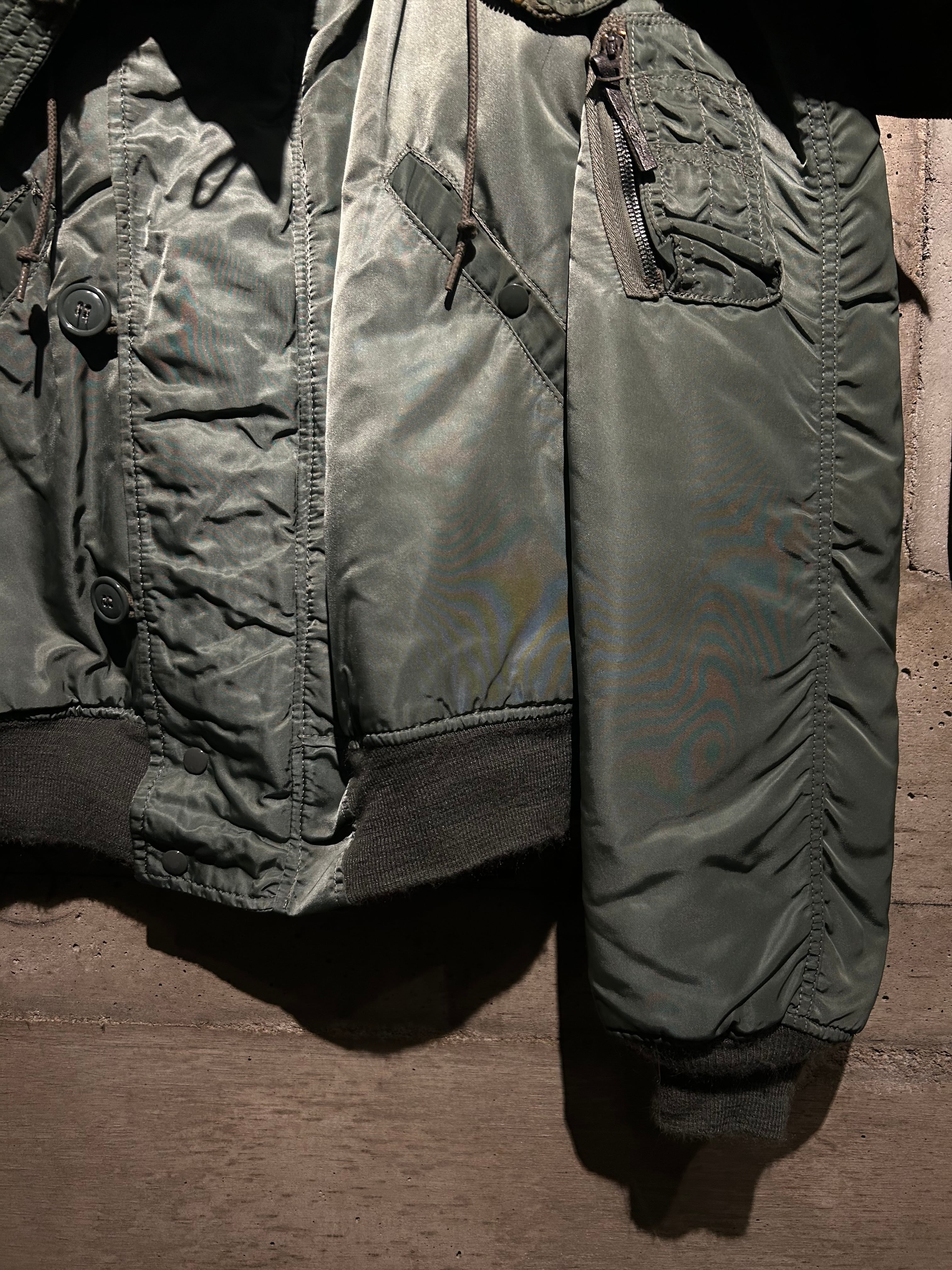 光沢を抑えたセージグリーンのナイロンシェルに、ジップで分割可能なフードの内側には密度の高いフェイクファーを搭載。風を遮断するリブ袖やフロントの比翼構造など、現代でも通用する機能的ディテールが満載。