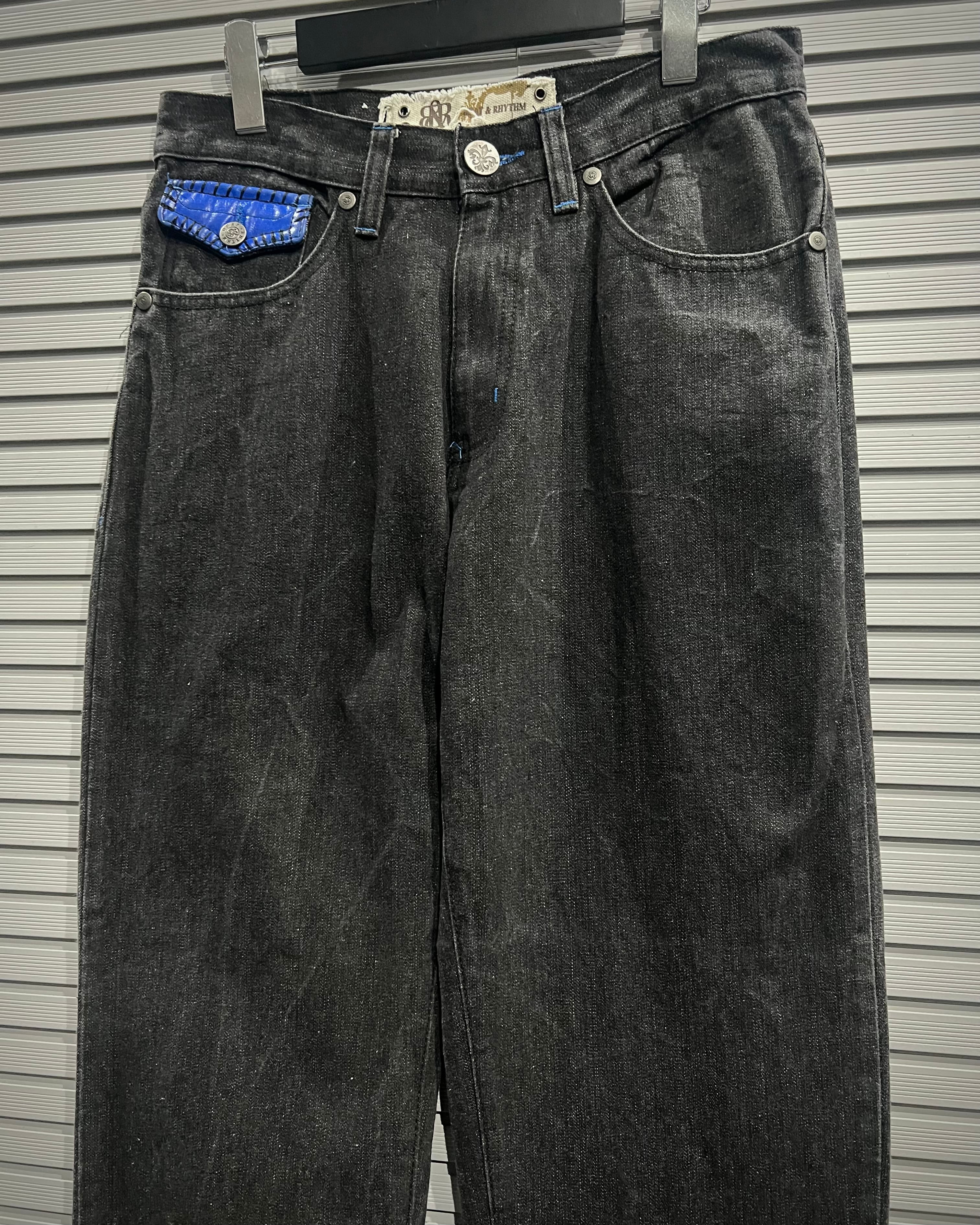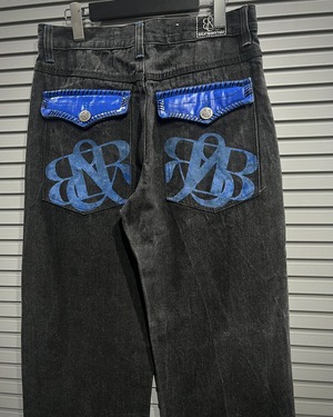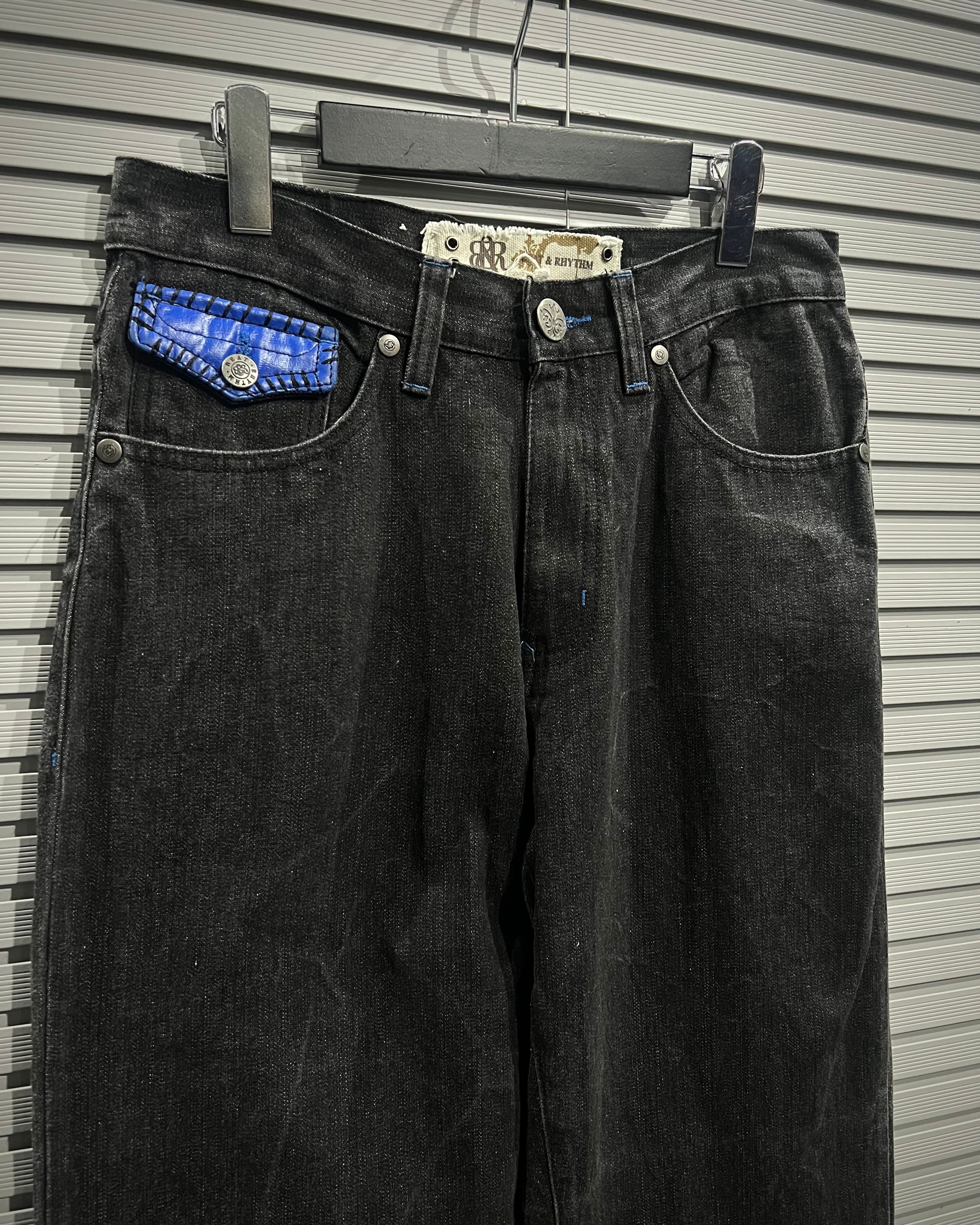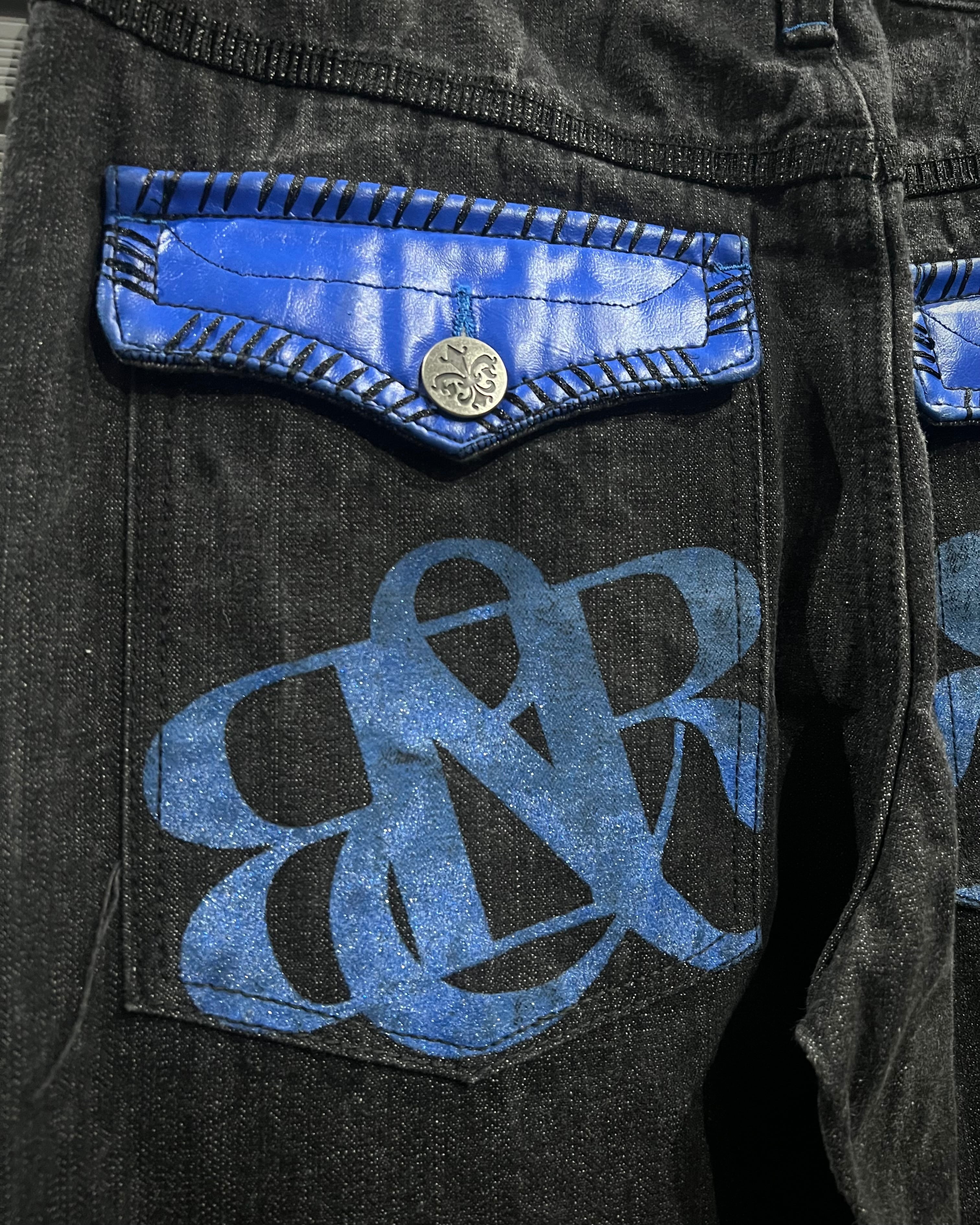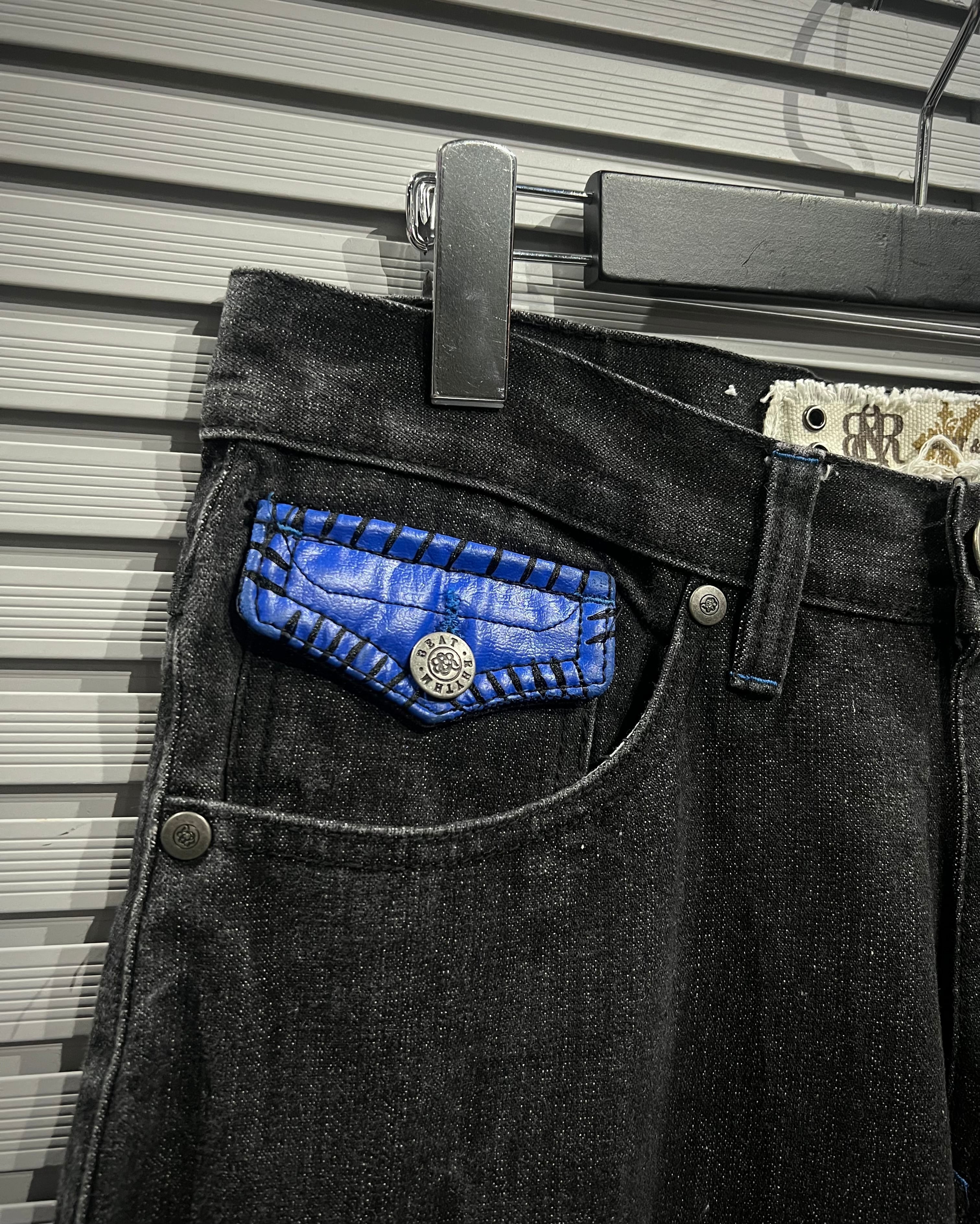 ブラックデニムをベースに、コインポケットとバックフラップに配された鮮烈なロイヤルブルーレザーが一際目を引くバギーパンツ。