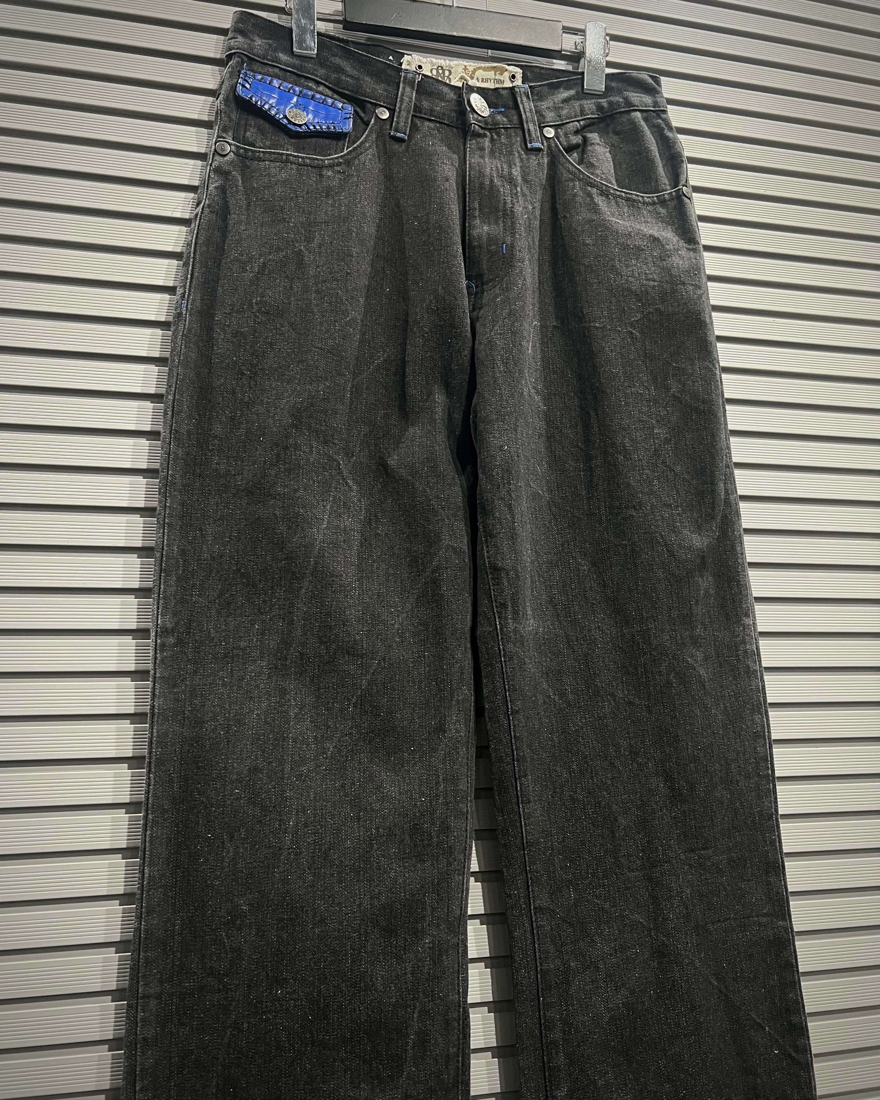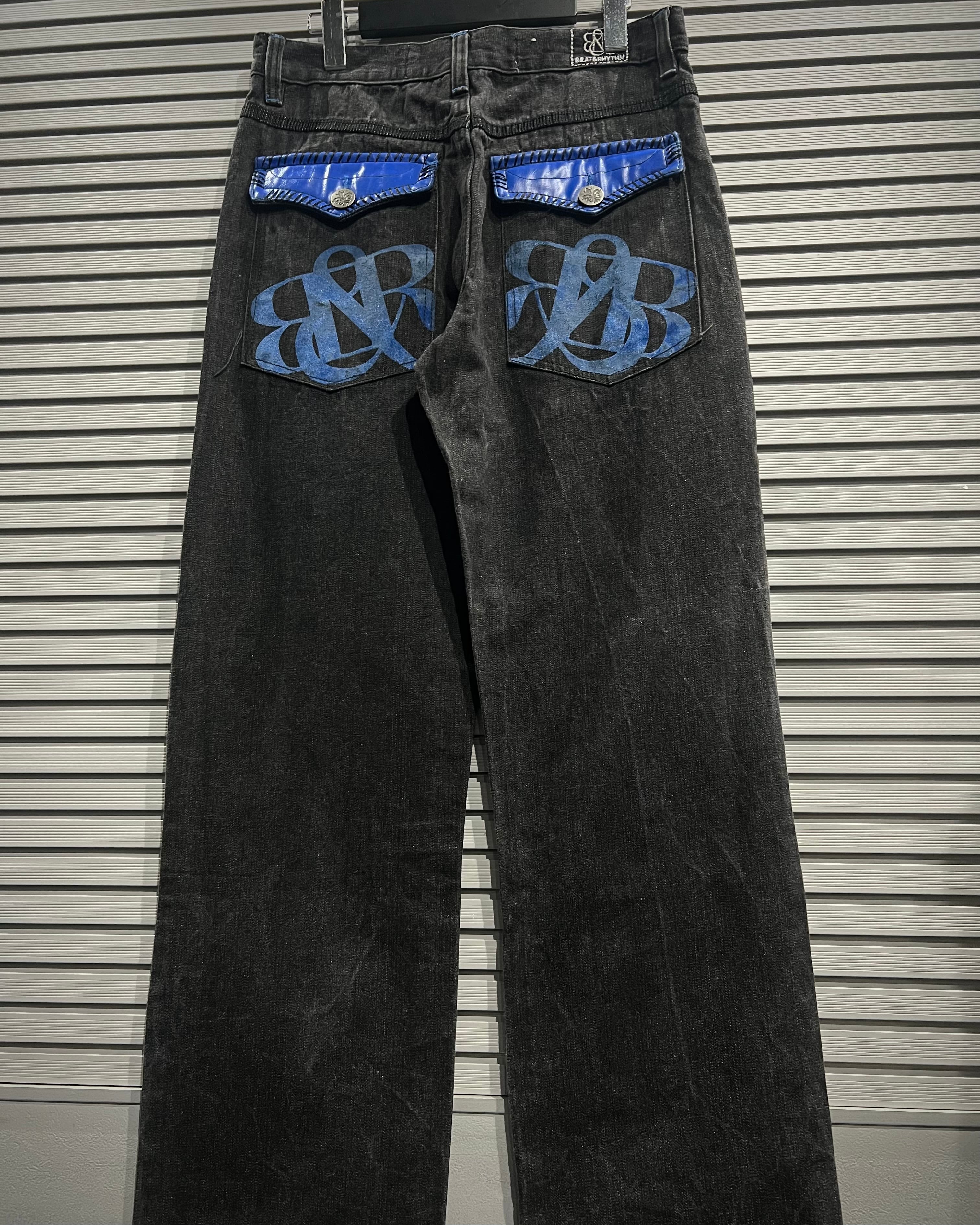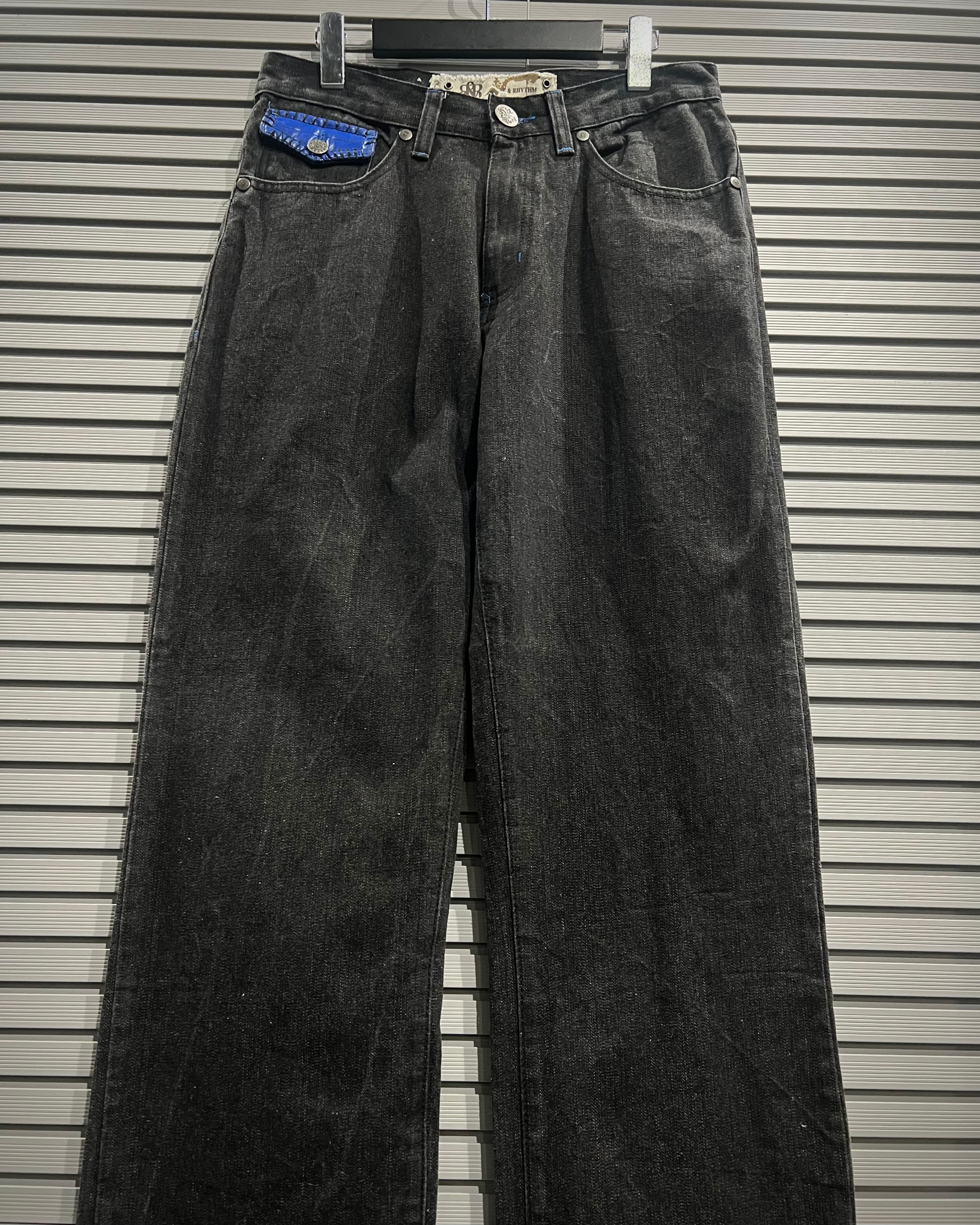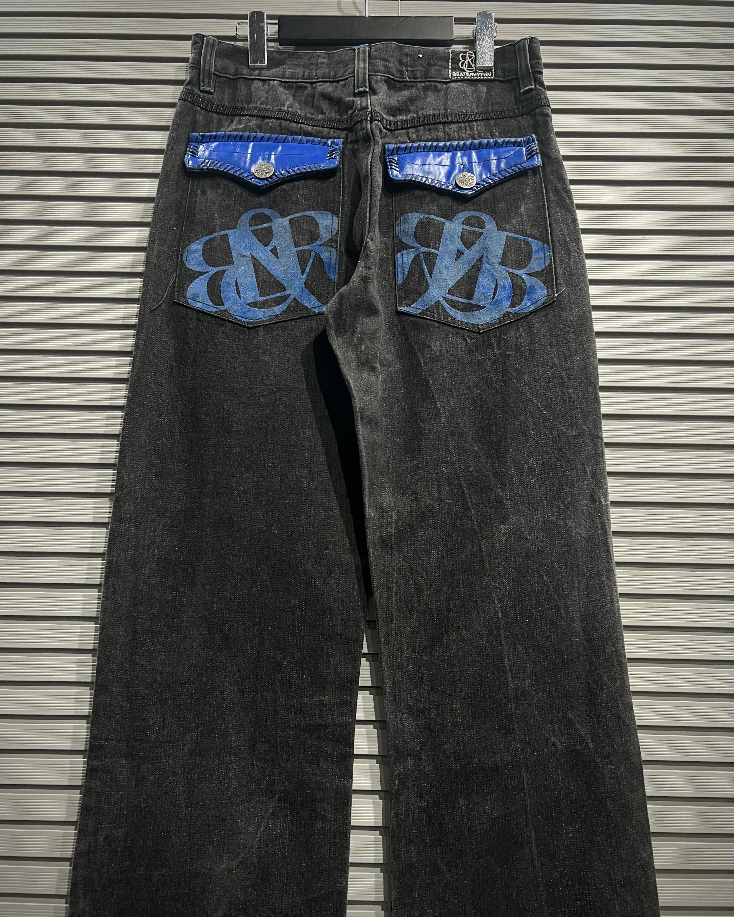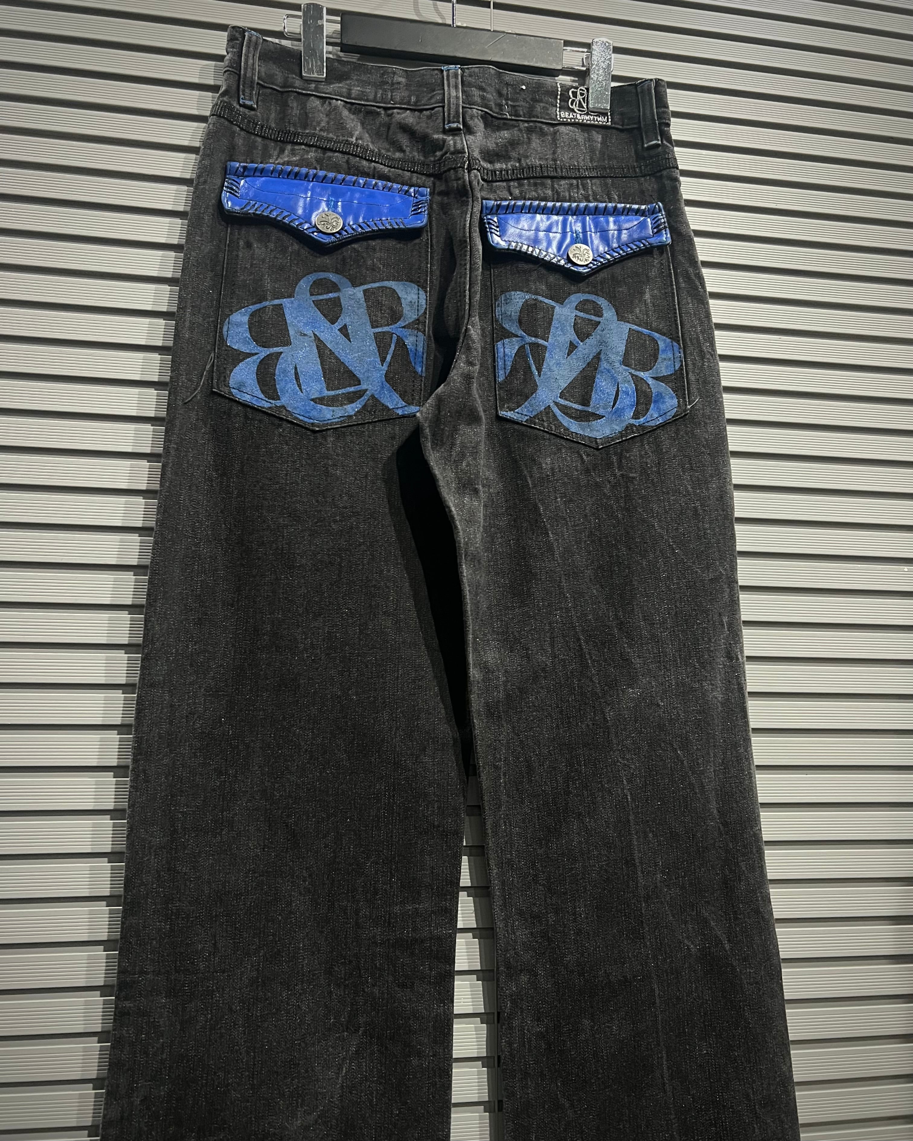 ブラックデニムをベースに、コインポケットとバックフラップに配された鮮烈なロイヤルブルーレザーが一際目を引くバギーパンツ。