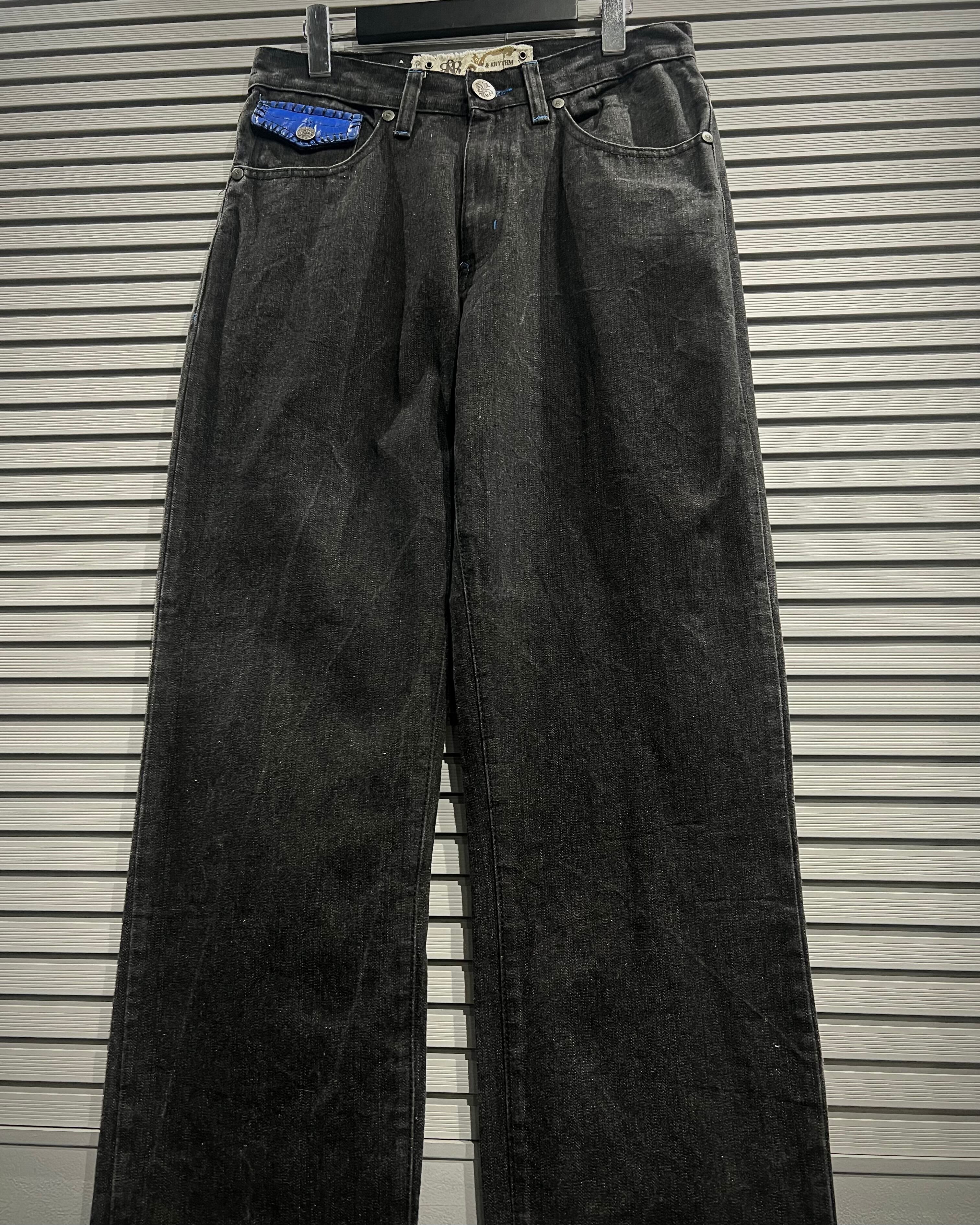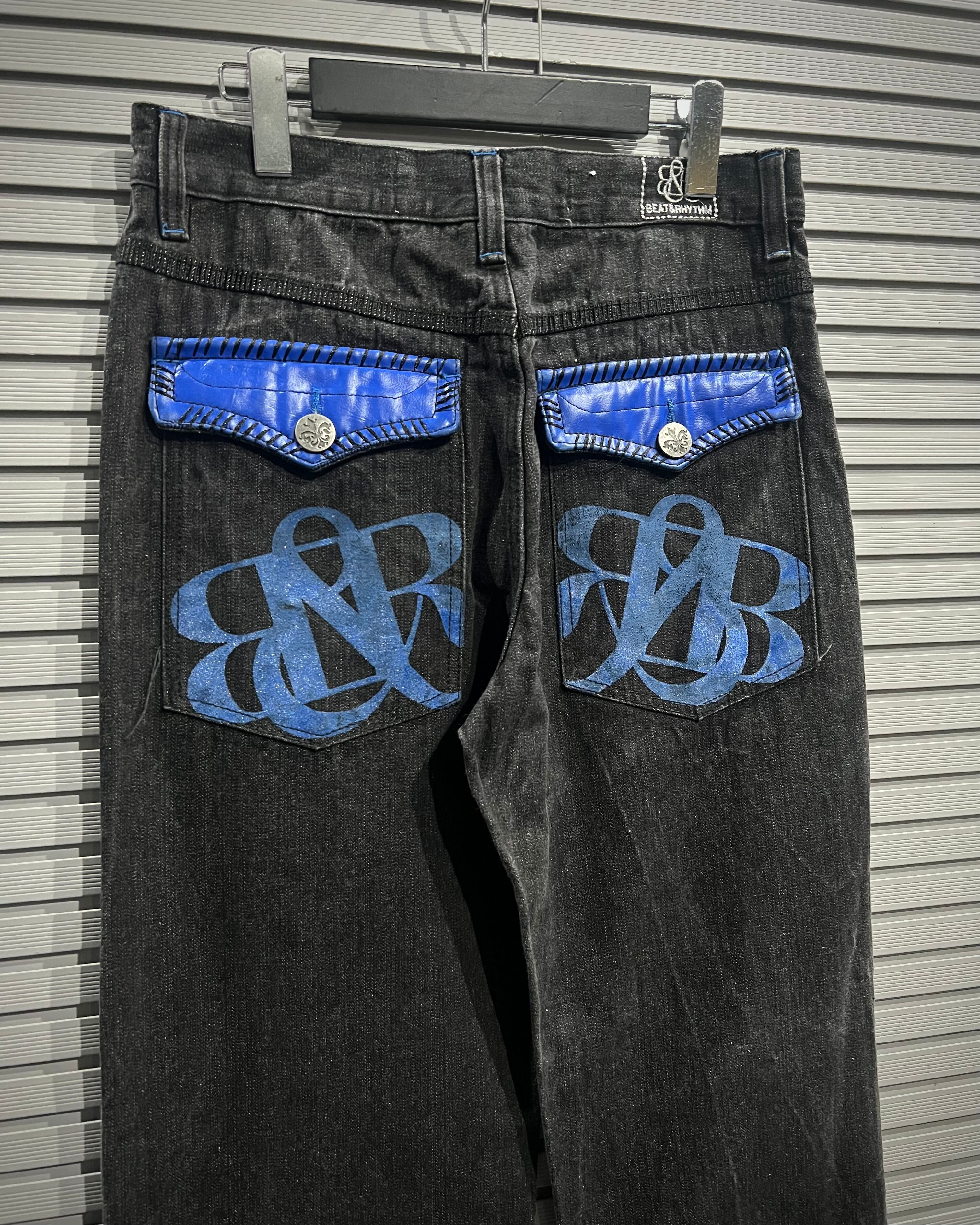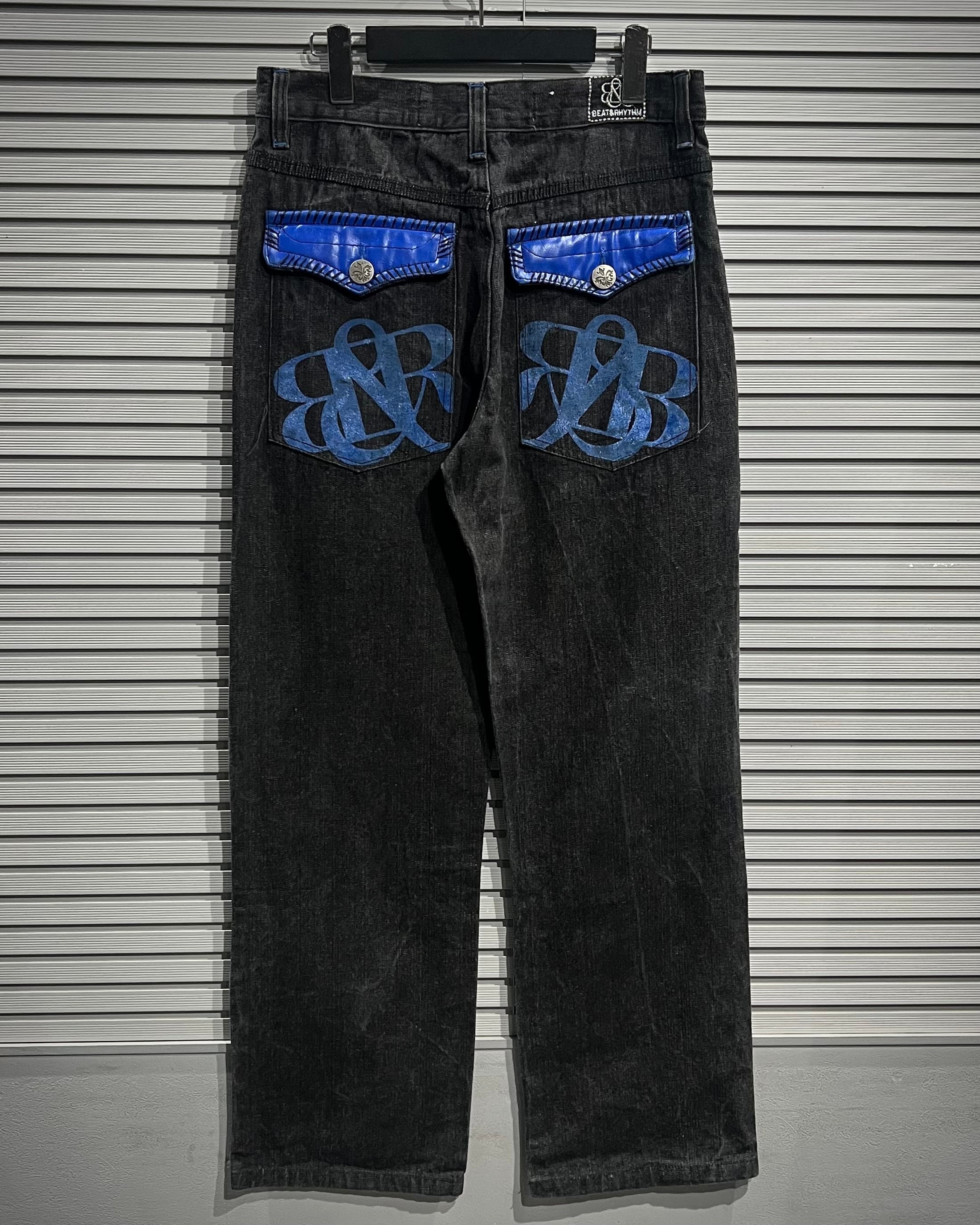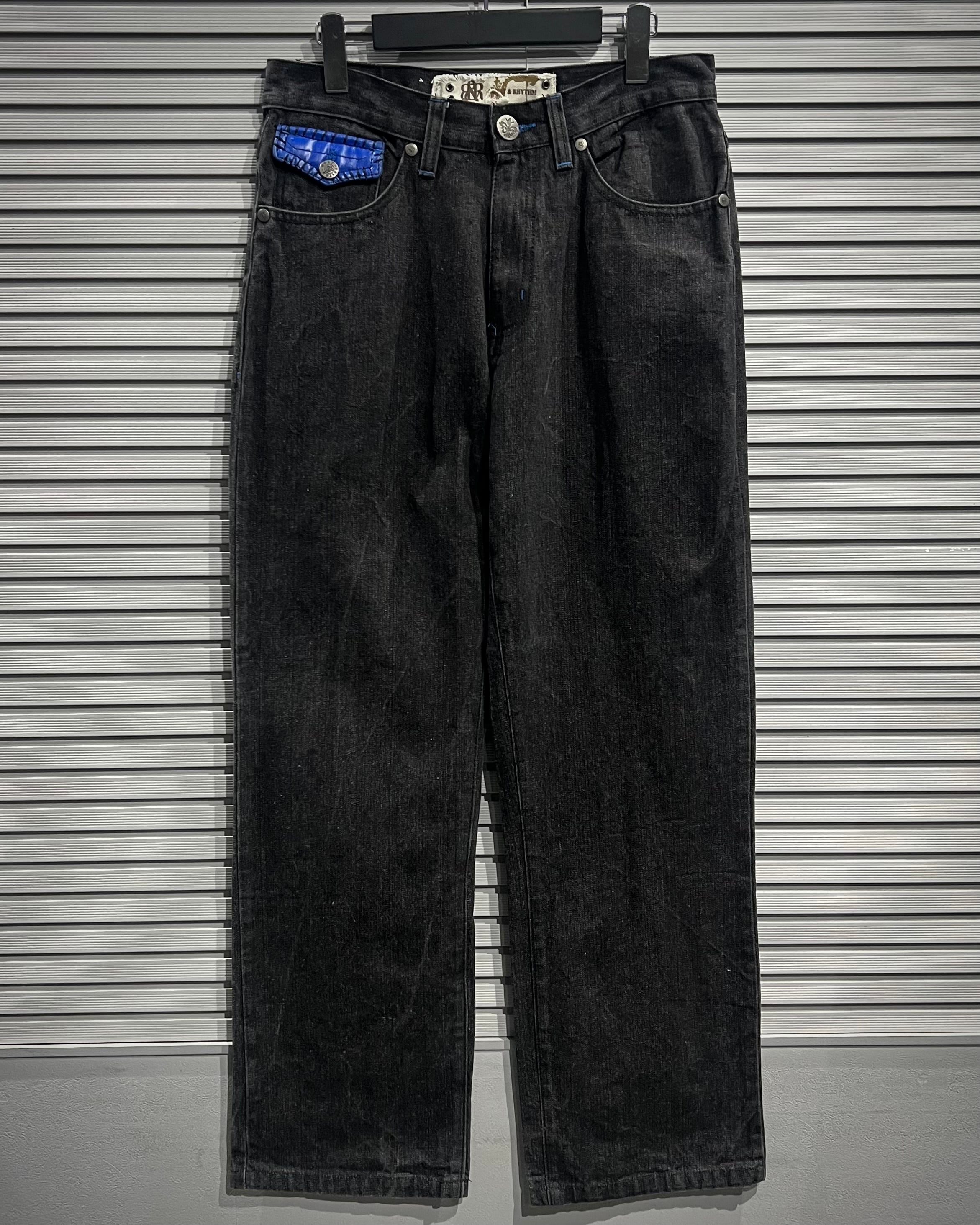 ブラックデニムをベースに、コインポケットとバックフラップに配された鮮烈なロイヤルブルーレザーが一際目を引くバギーパンツ。