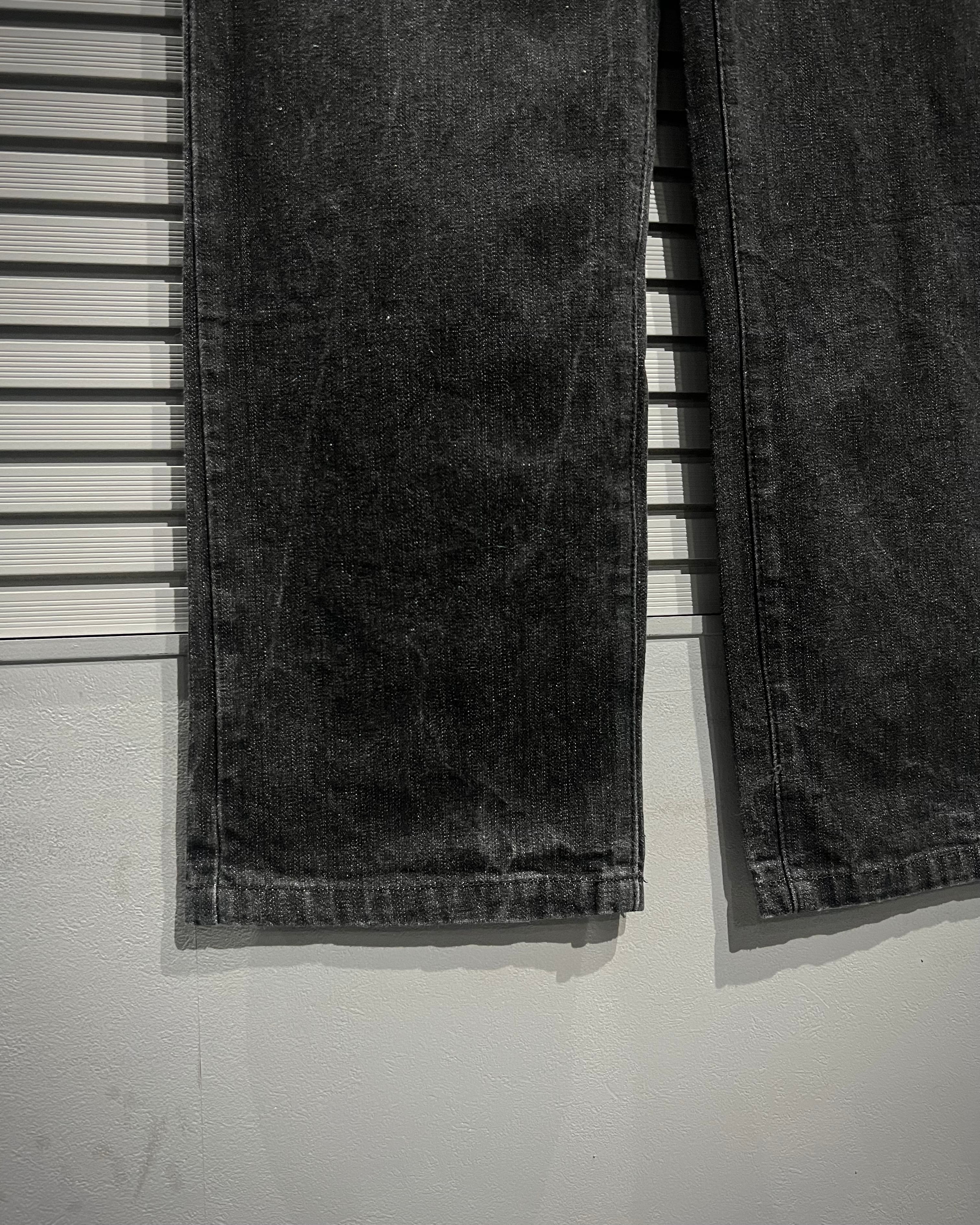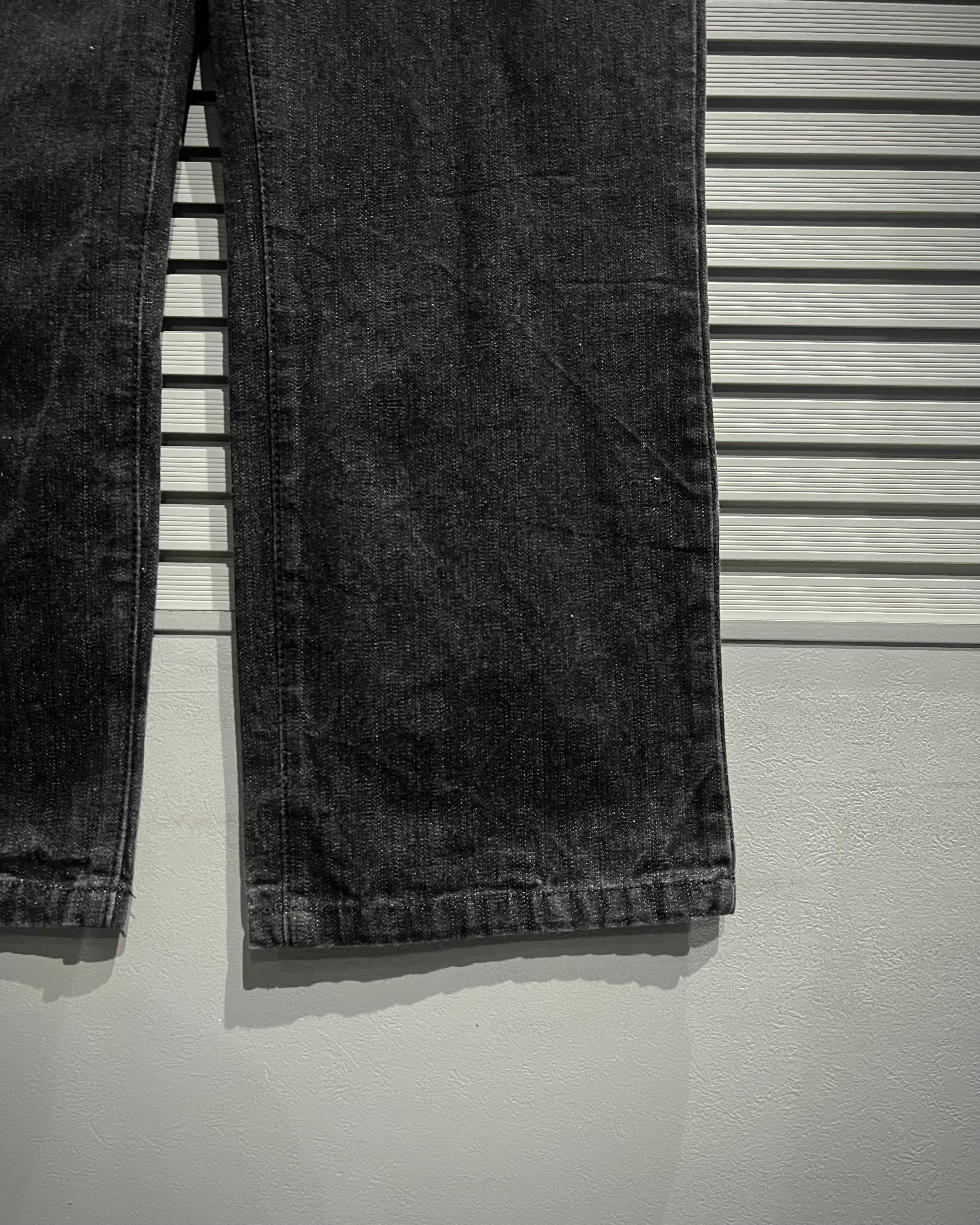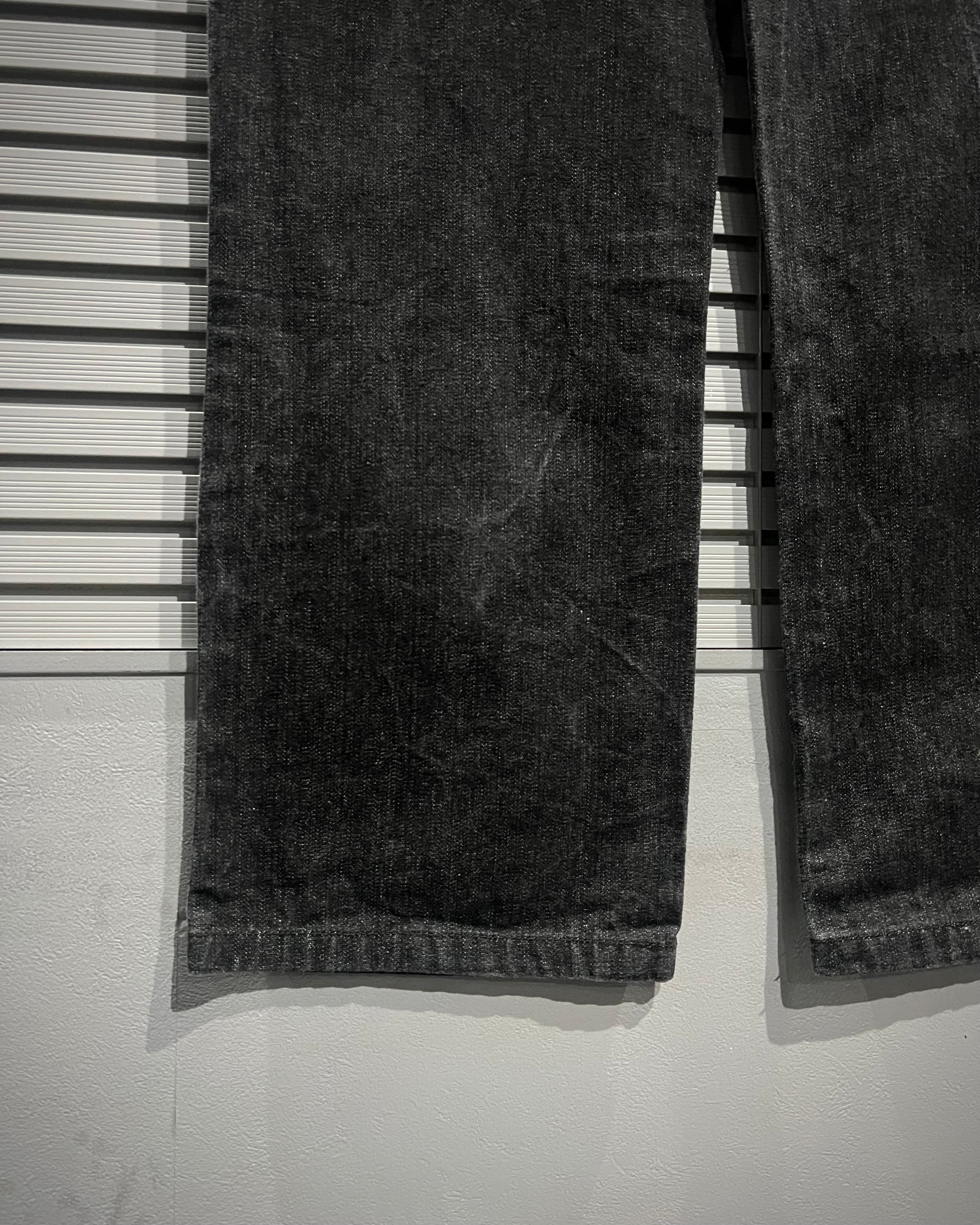 バックポケットにはブランドの象徴でもある大胆なモノグラムプリントを配置。光の加減で鈍く浮かび上がるブルーが、ブラックデニムのマットな質感と絶妙なコントラストを生み出しています。