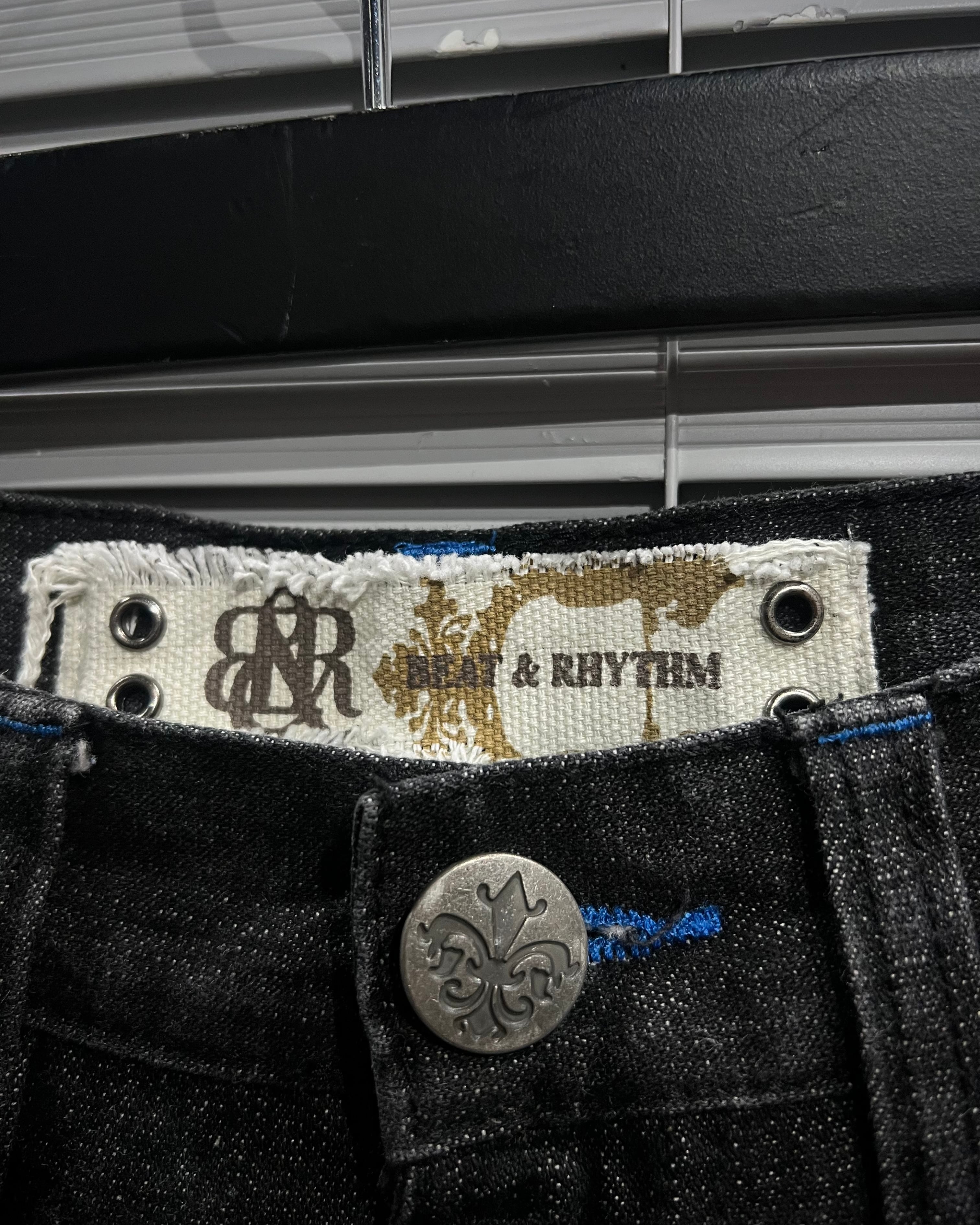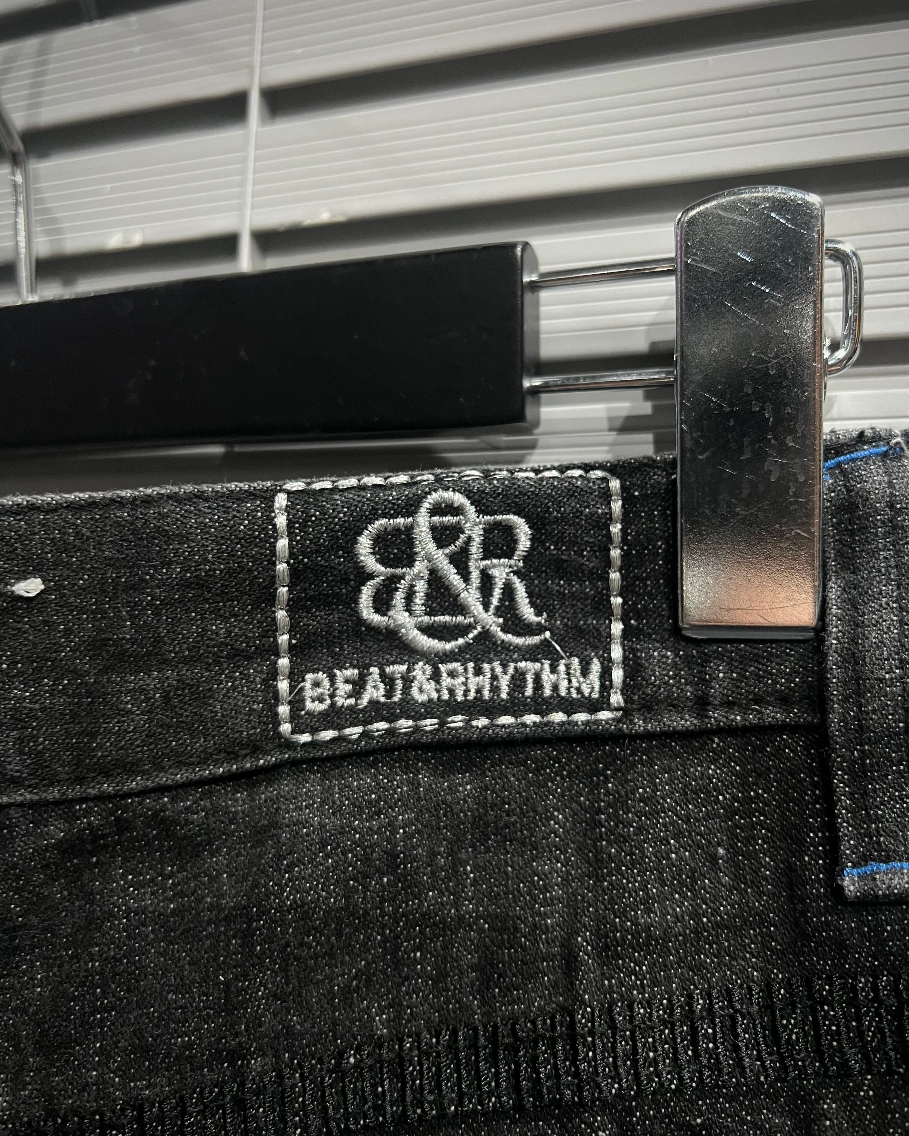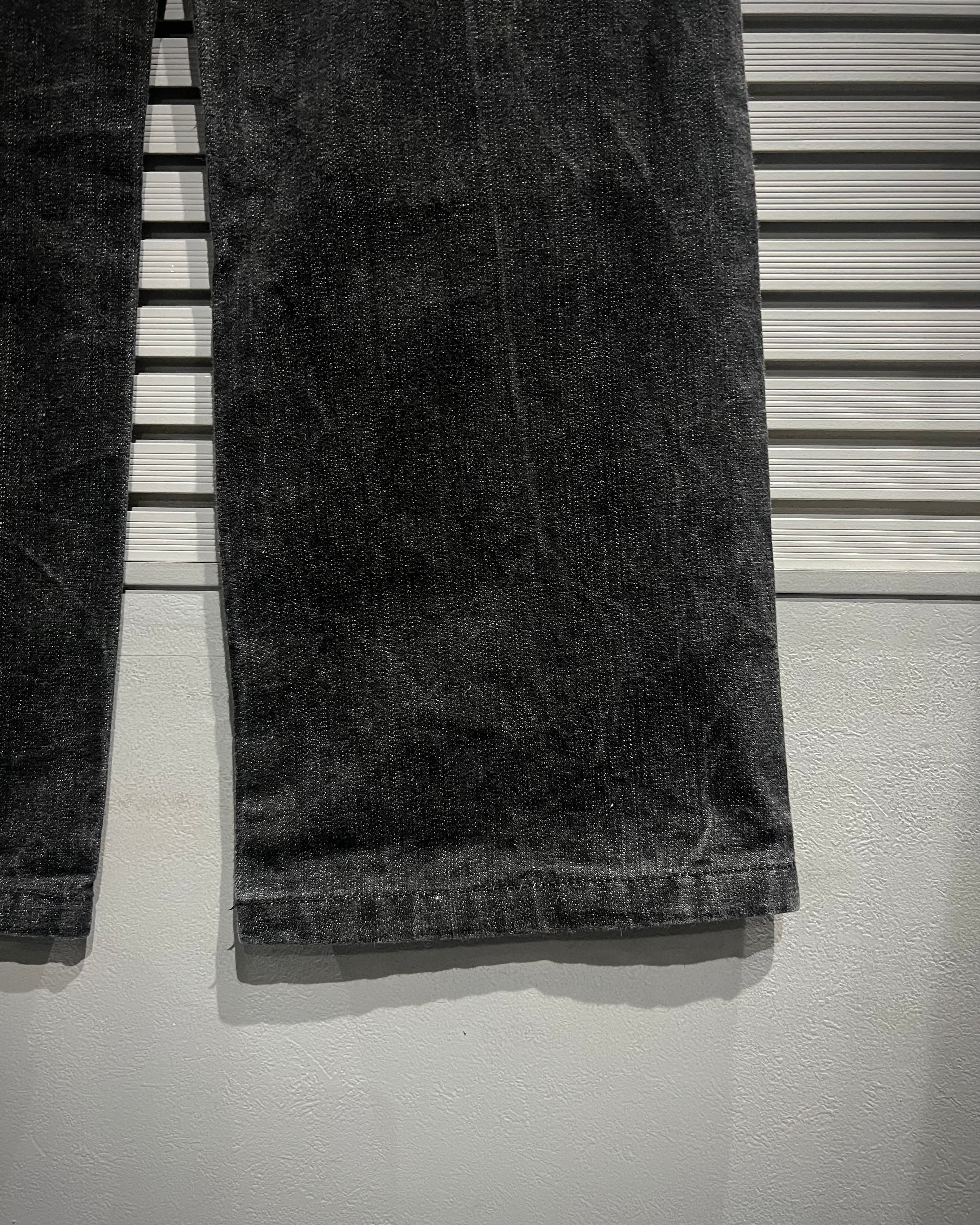 バックポケットにはブランドの象徴でもある大胆なモノグラムプリントを配置。光の加減で鈍く浮かび上がるブルーが、ブラックデニムのマットな質感と絶妙なコントラストを生み出しています。