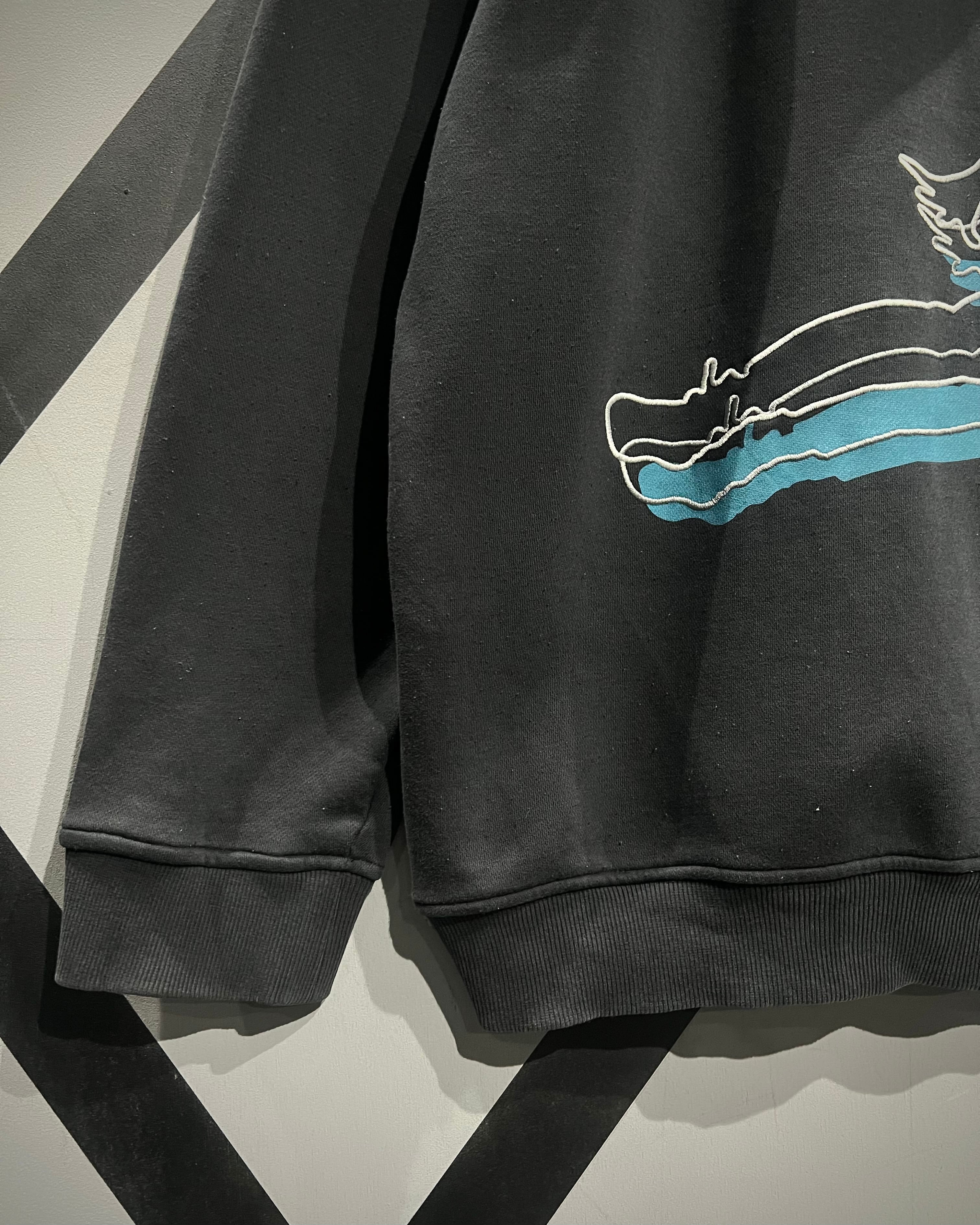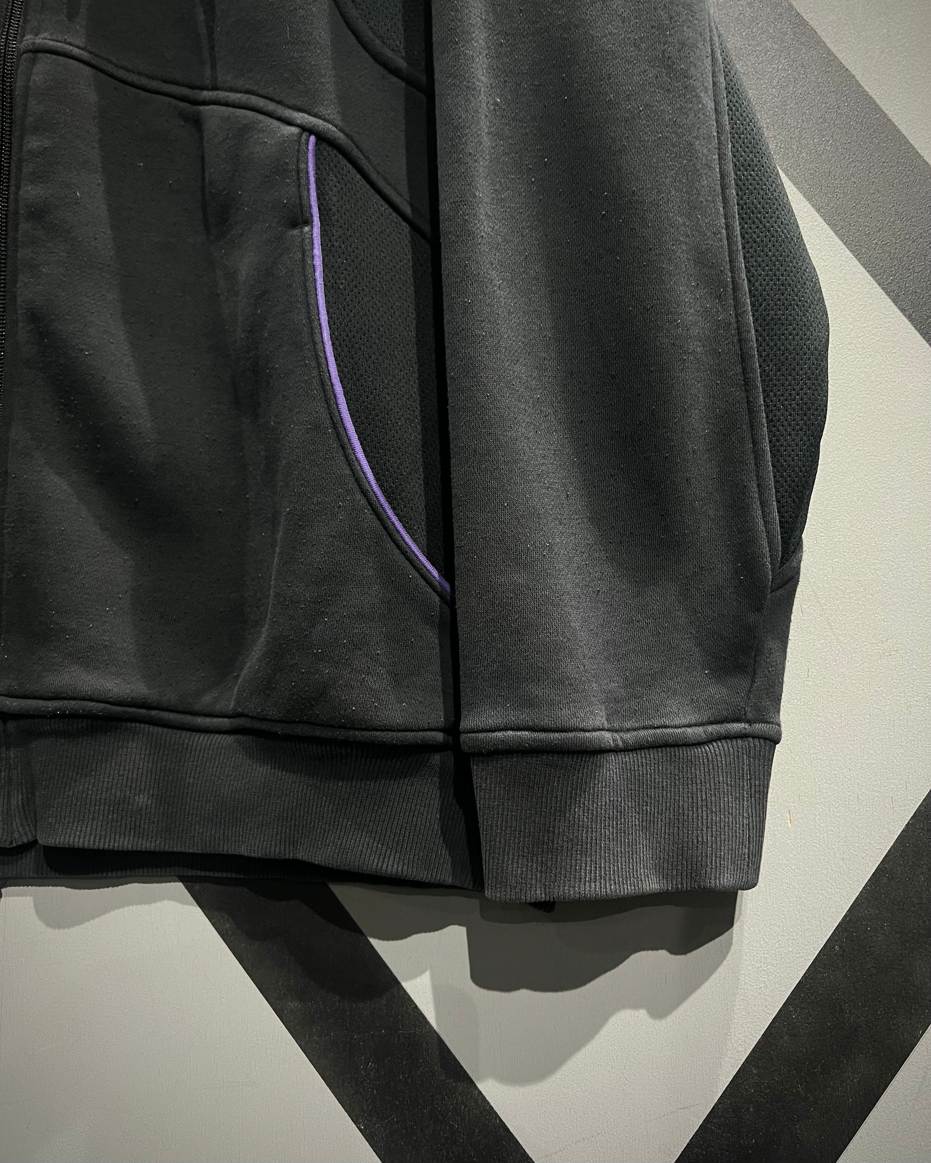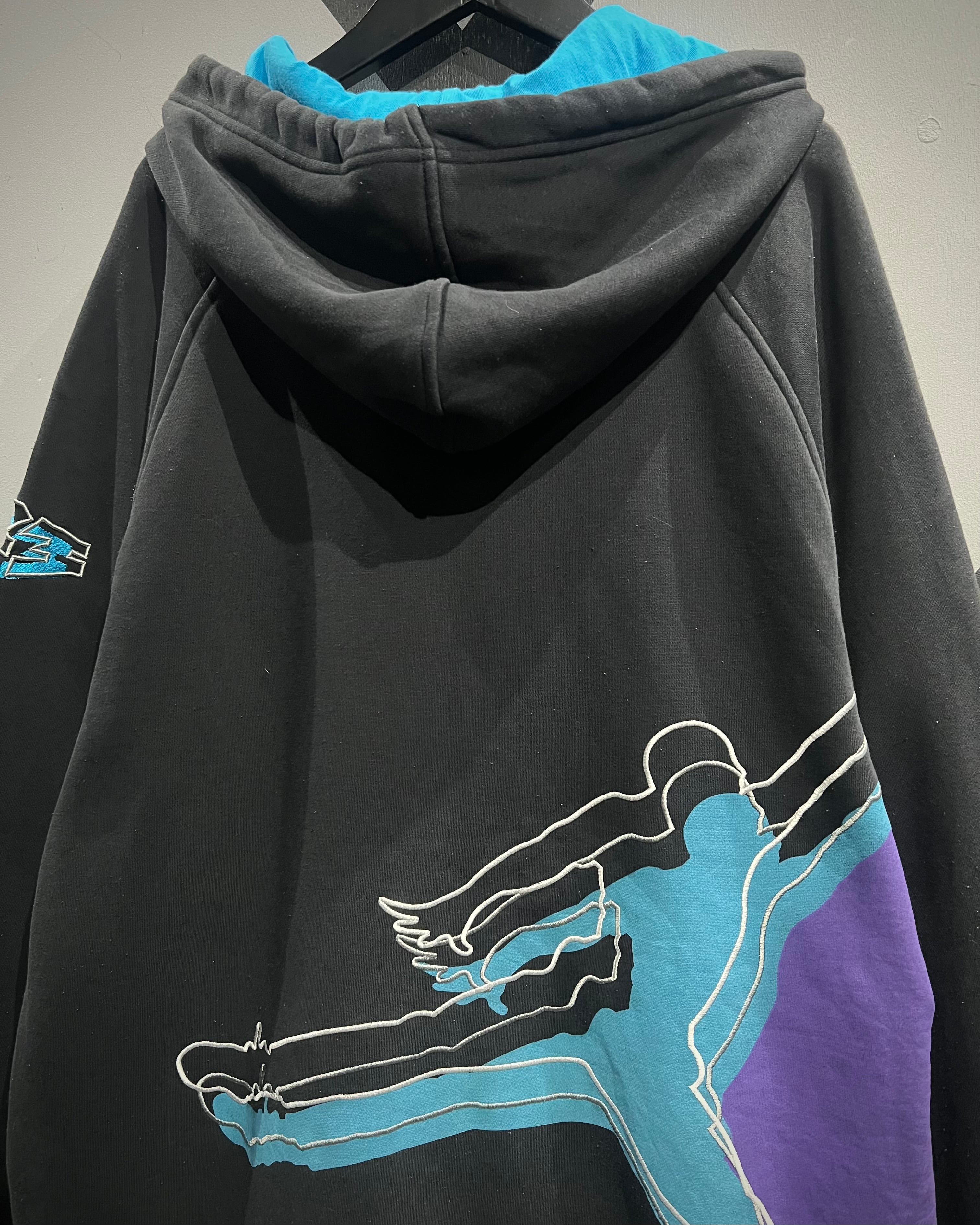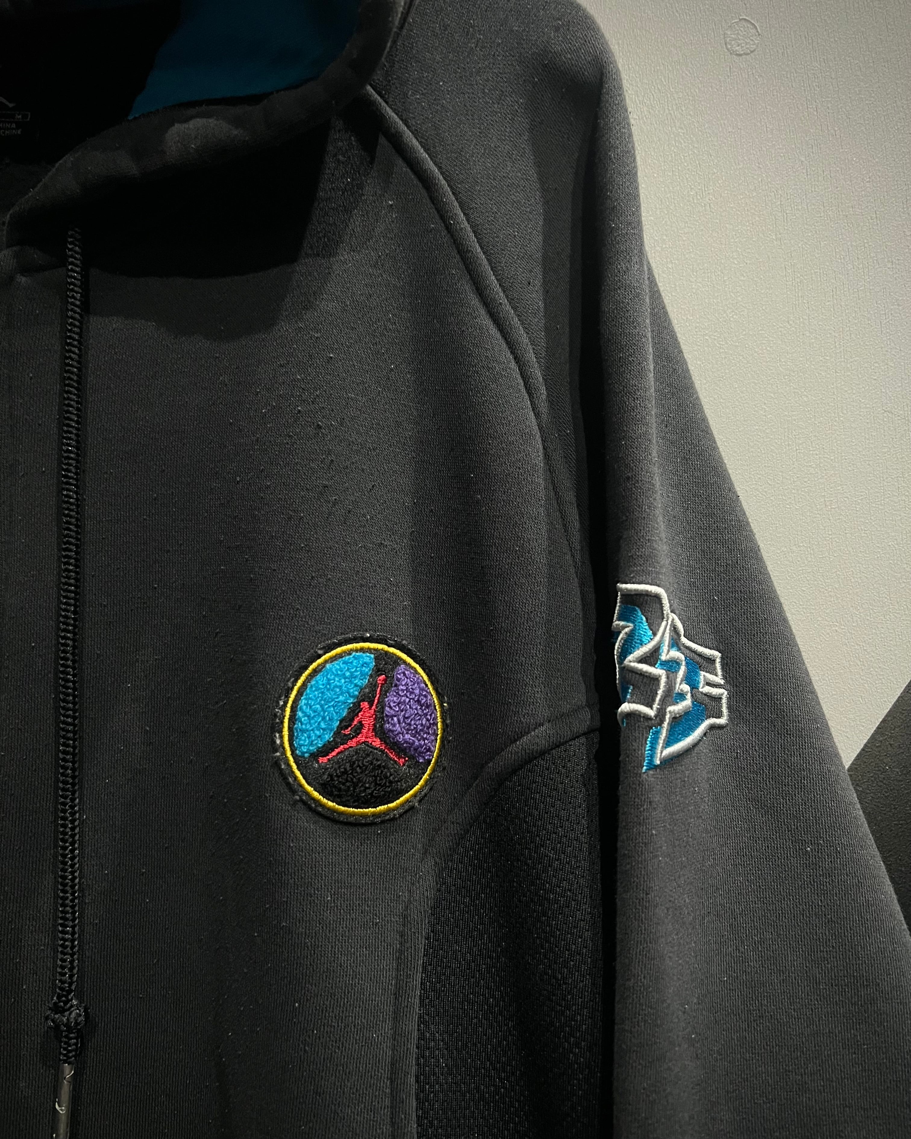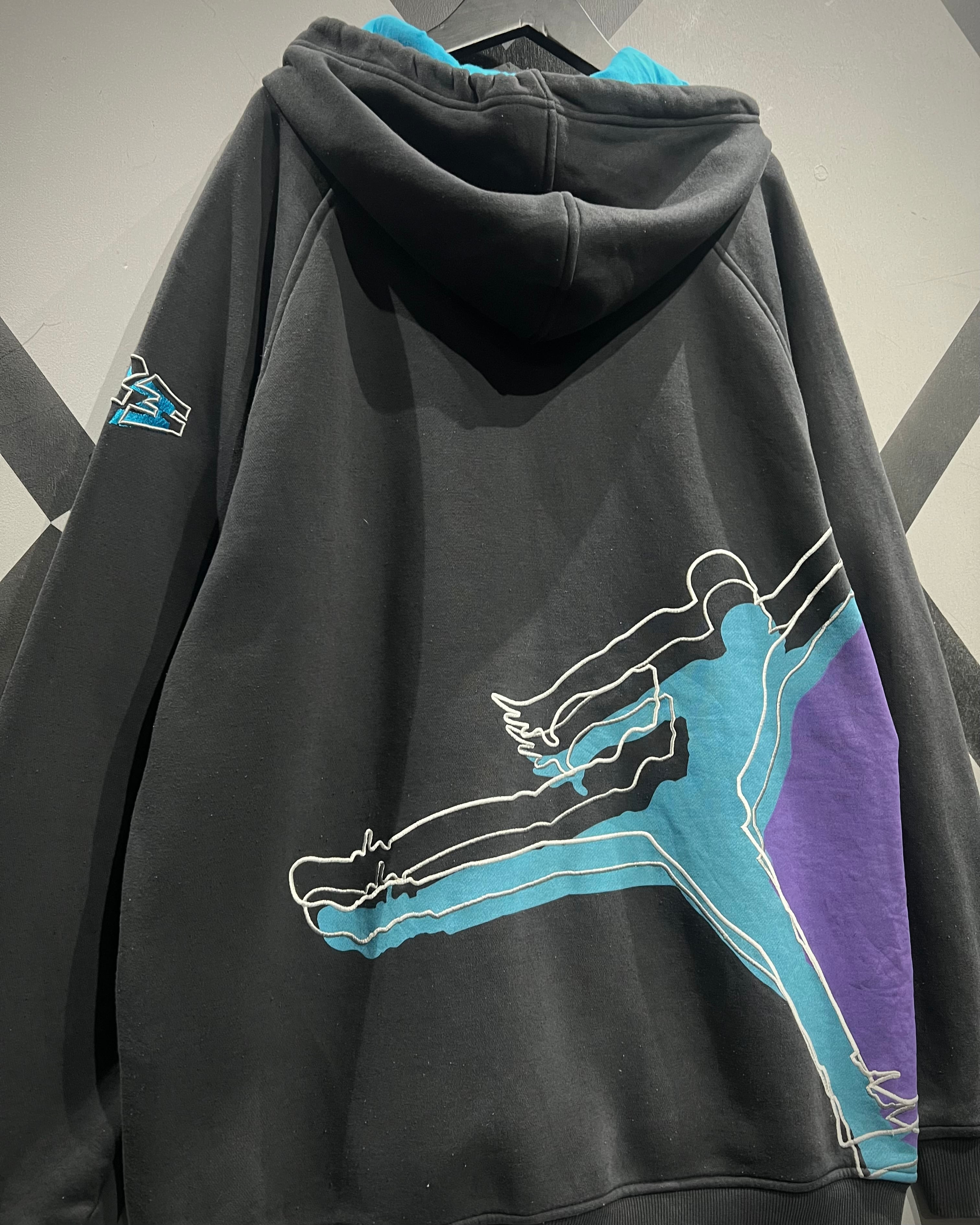 ブラックボディをベースに、アクアブルーとパープルの切り替えを落とし込んだ配色構成は、シューズの象徴的なカラーパレットを忠実に踏襲。胸元の円形ロゴワッペン、スリーブに入はジョーダンの背番号“23”の刺繍、背面には大胆に描かれたジャンプマンと、全方位しっかりとこだわり抜かれています。