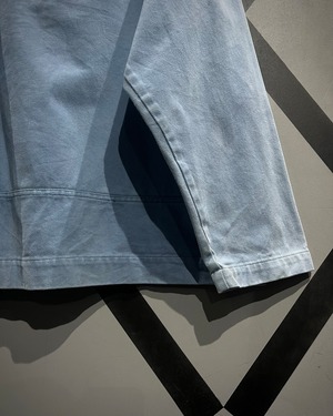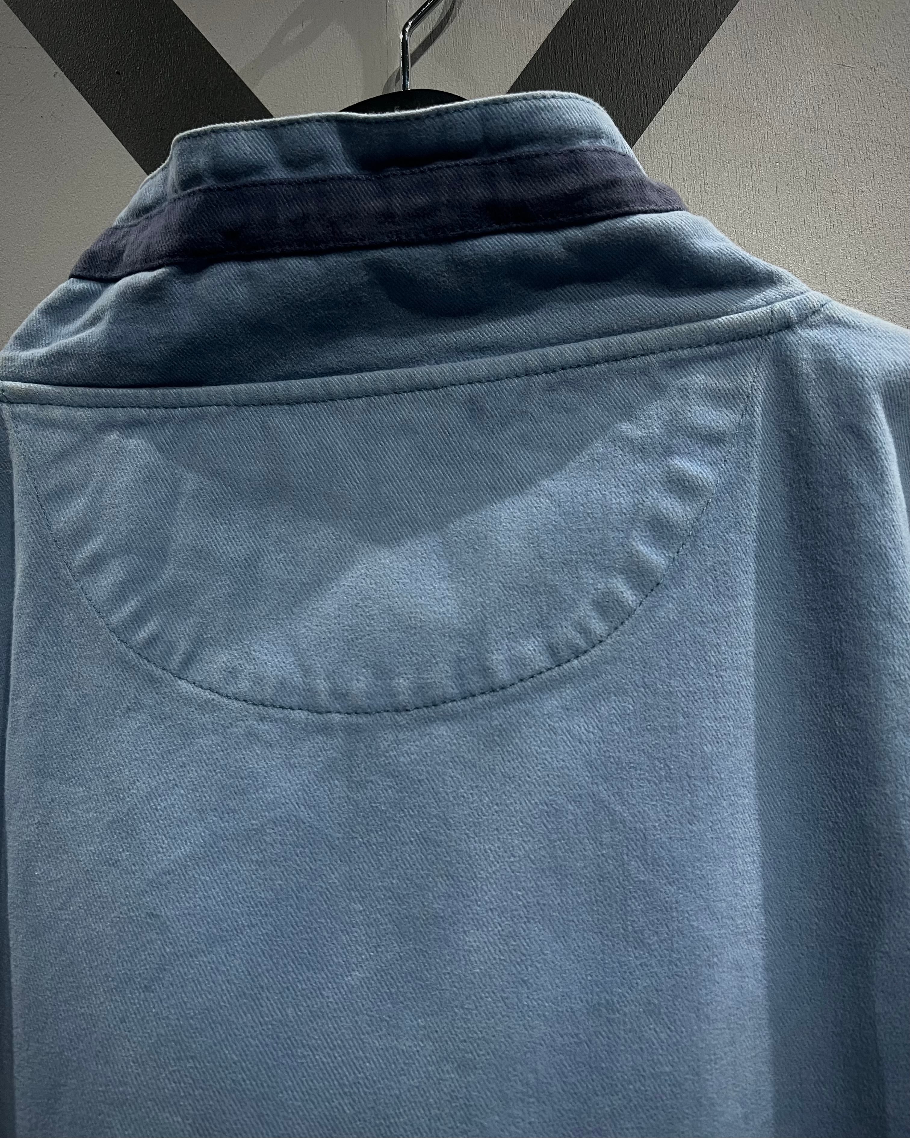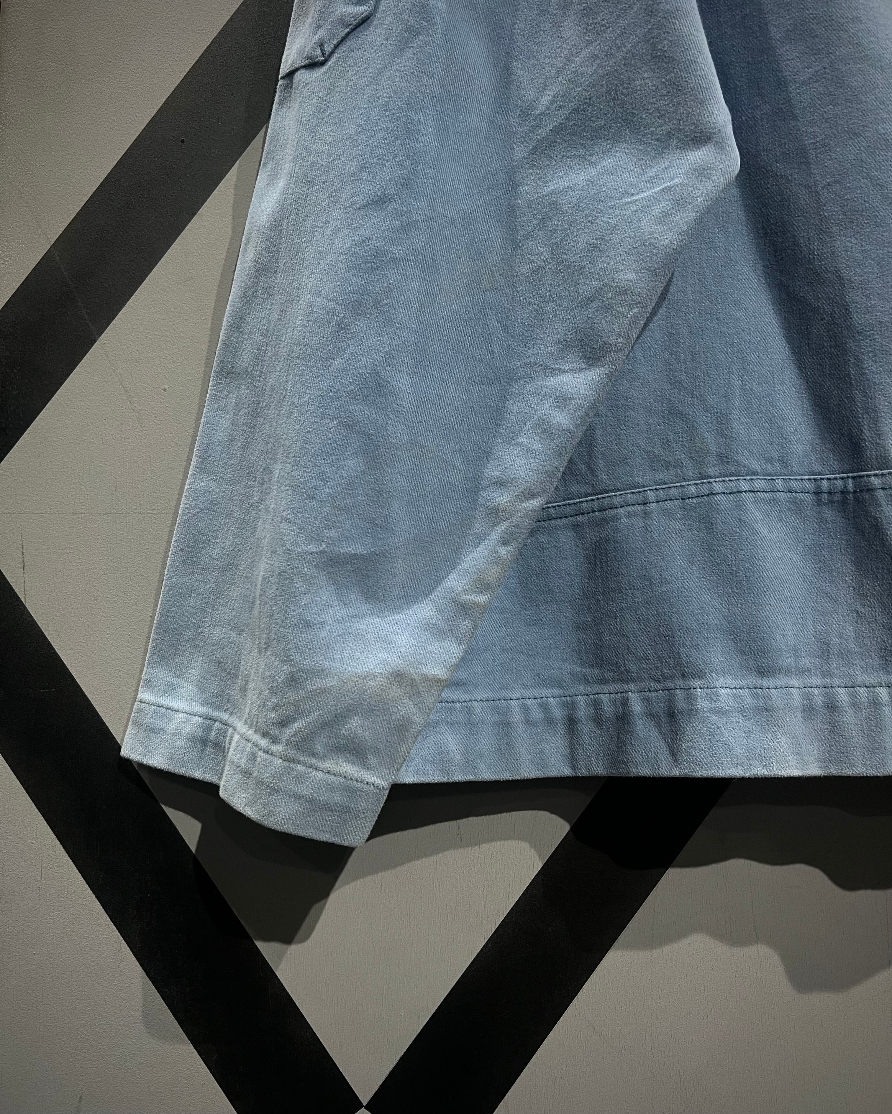 やや高めのネックライン、襟元や袖口の切り替えによって立体感のある表情を演出。素材には厚みのあるウォッシュドコットンを使用し、スウェットのような柔らかさと、ミリタリースモックにも通じる無骨さを併せ持ちます。