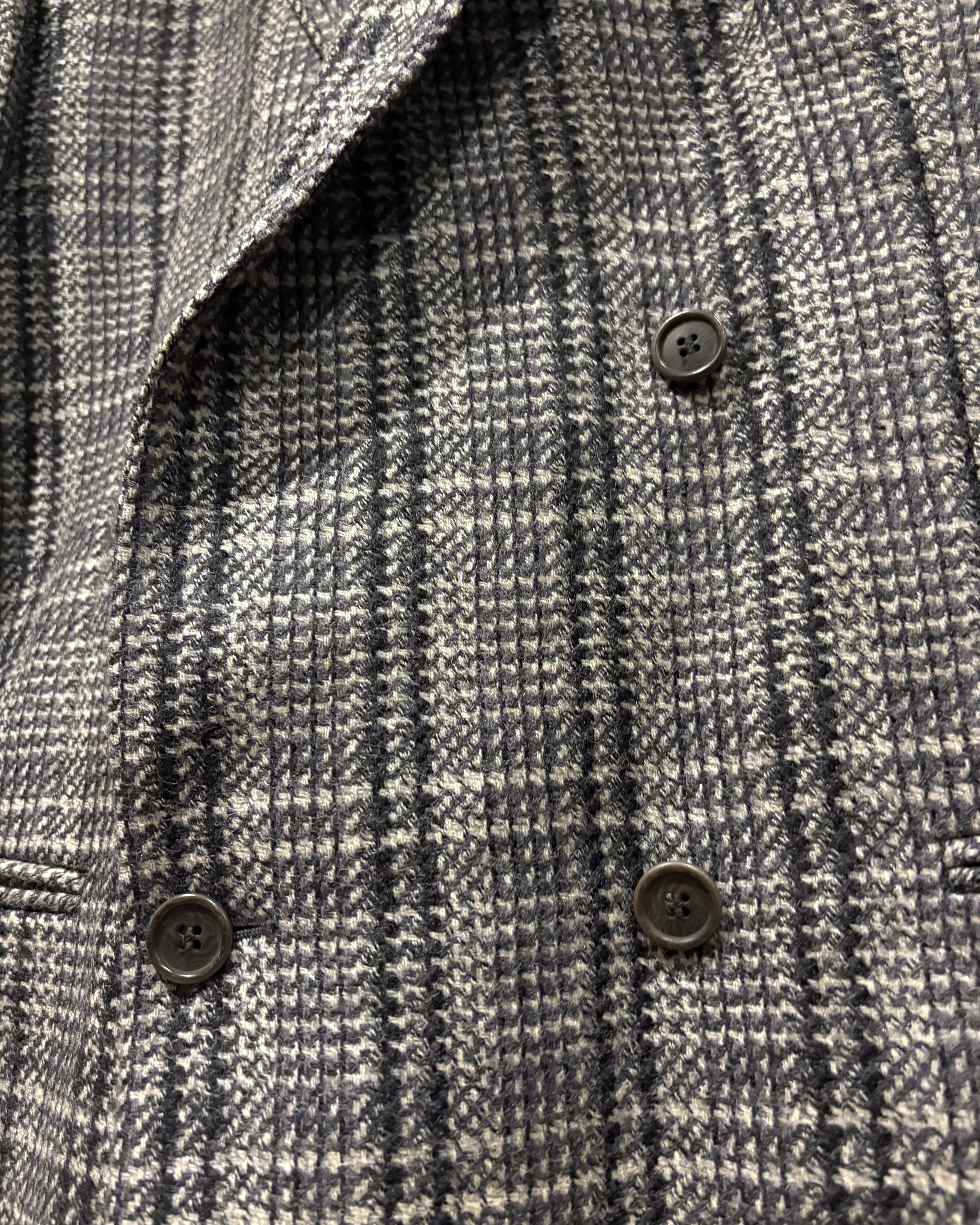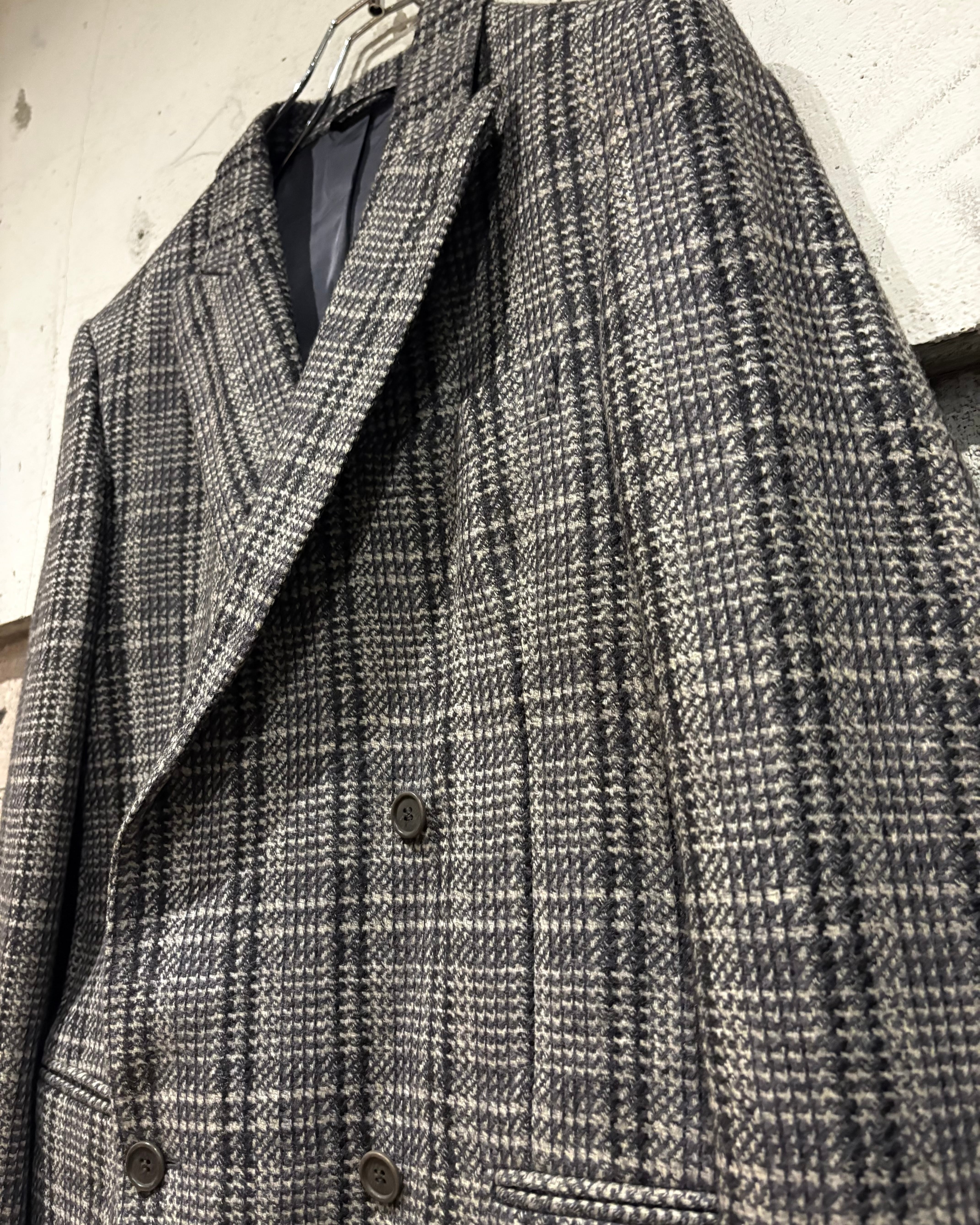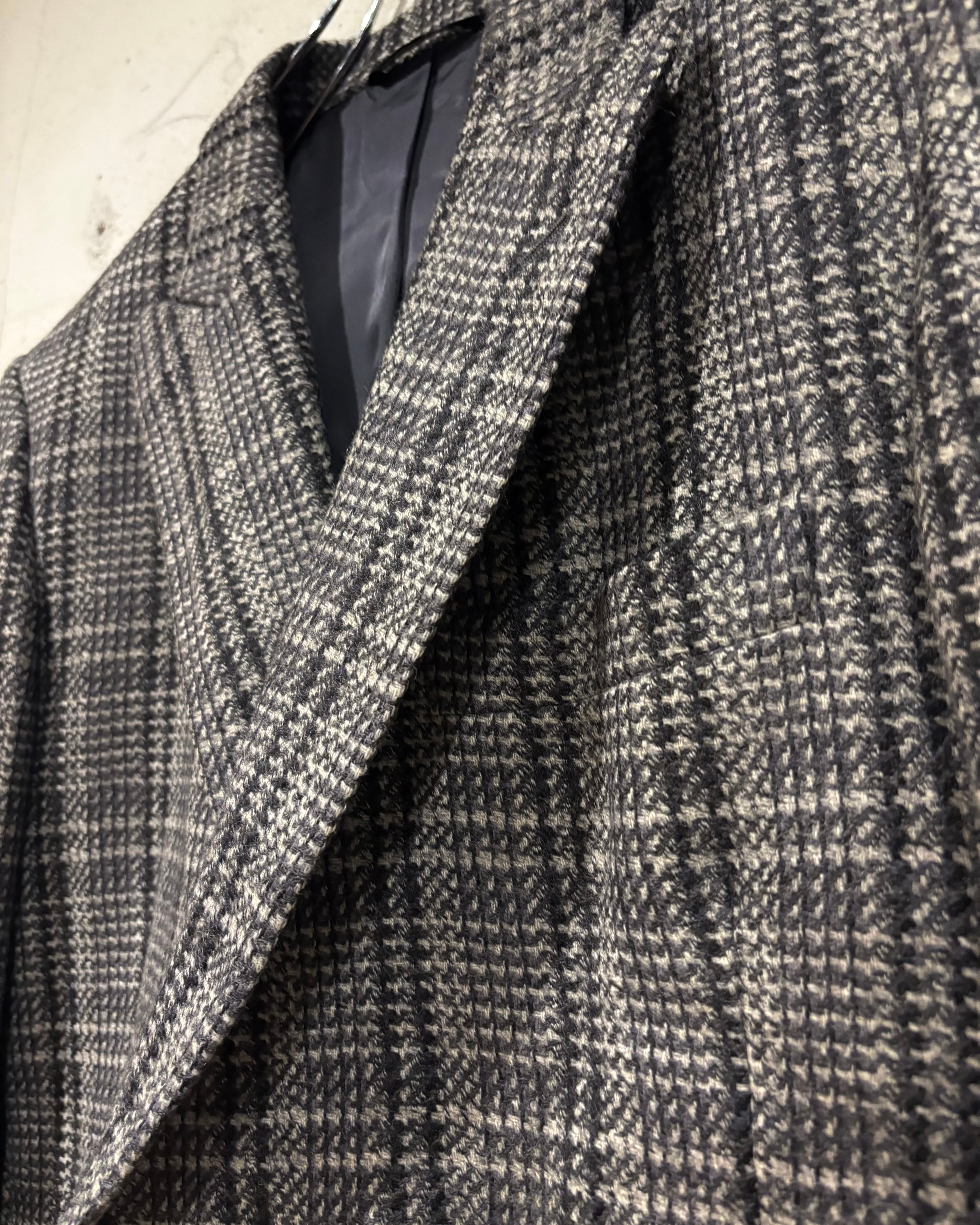 柔らかなショルダーと程よくドロップしたシルエット。ピークドラペルとダブルブレストが重厚なバランスを生み出し、羽織るだけでクラシックな存在感を放ちます。