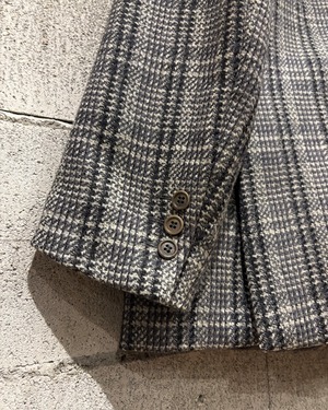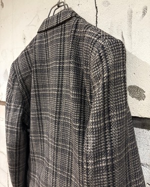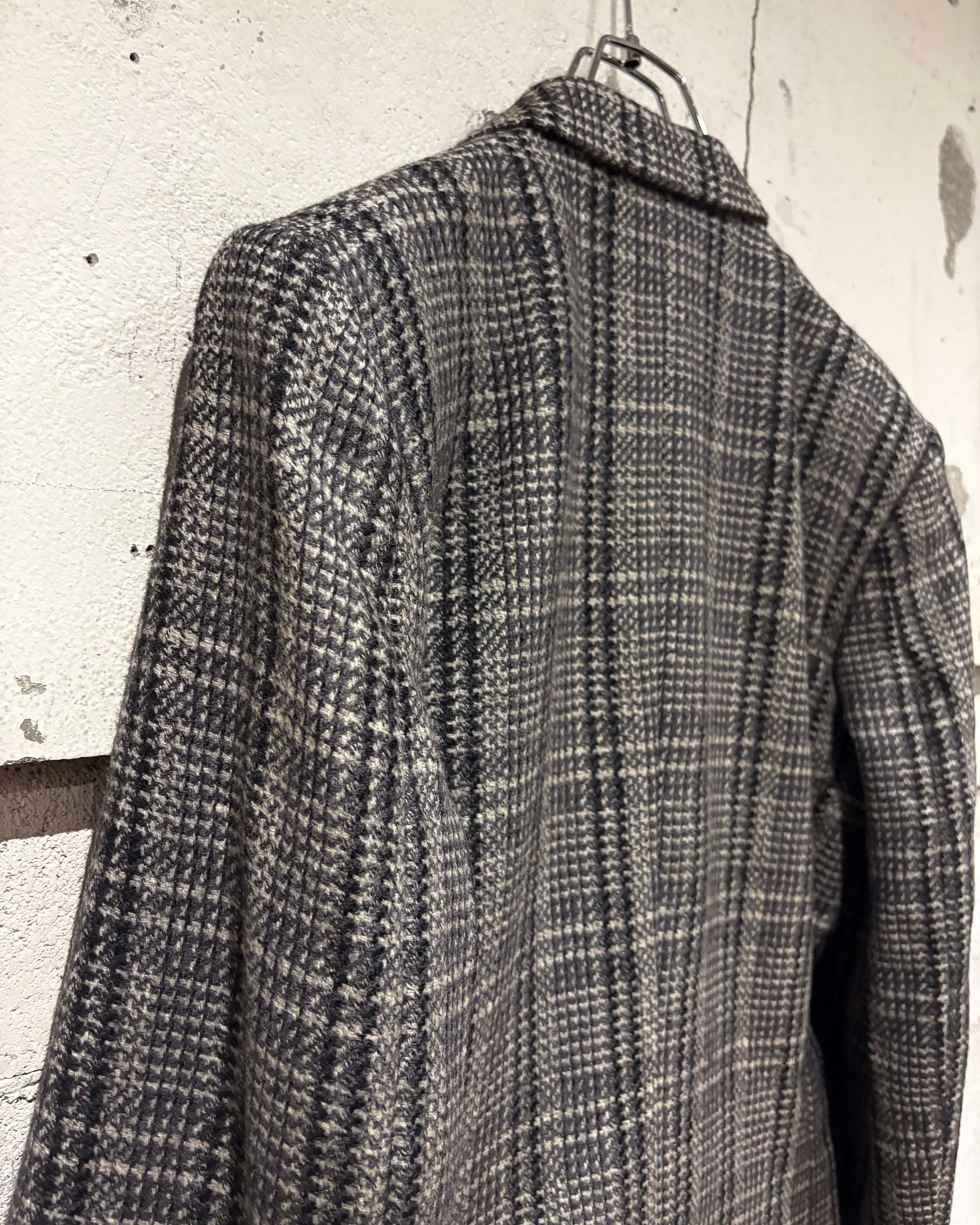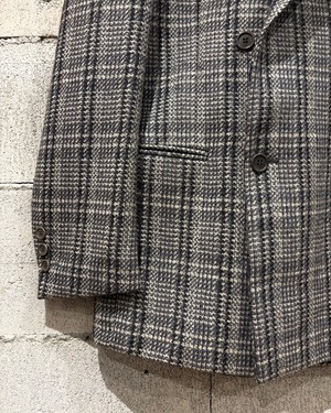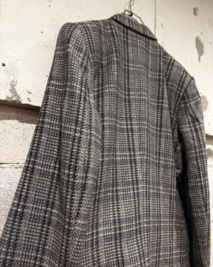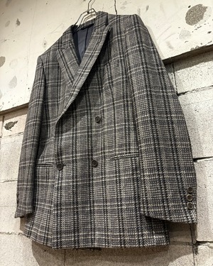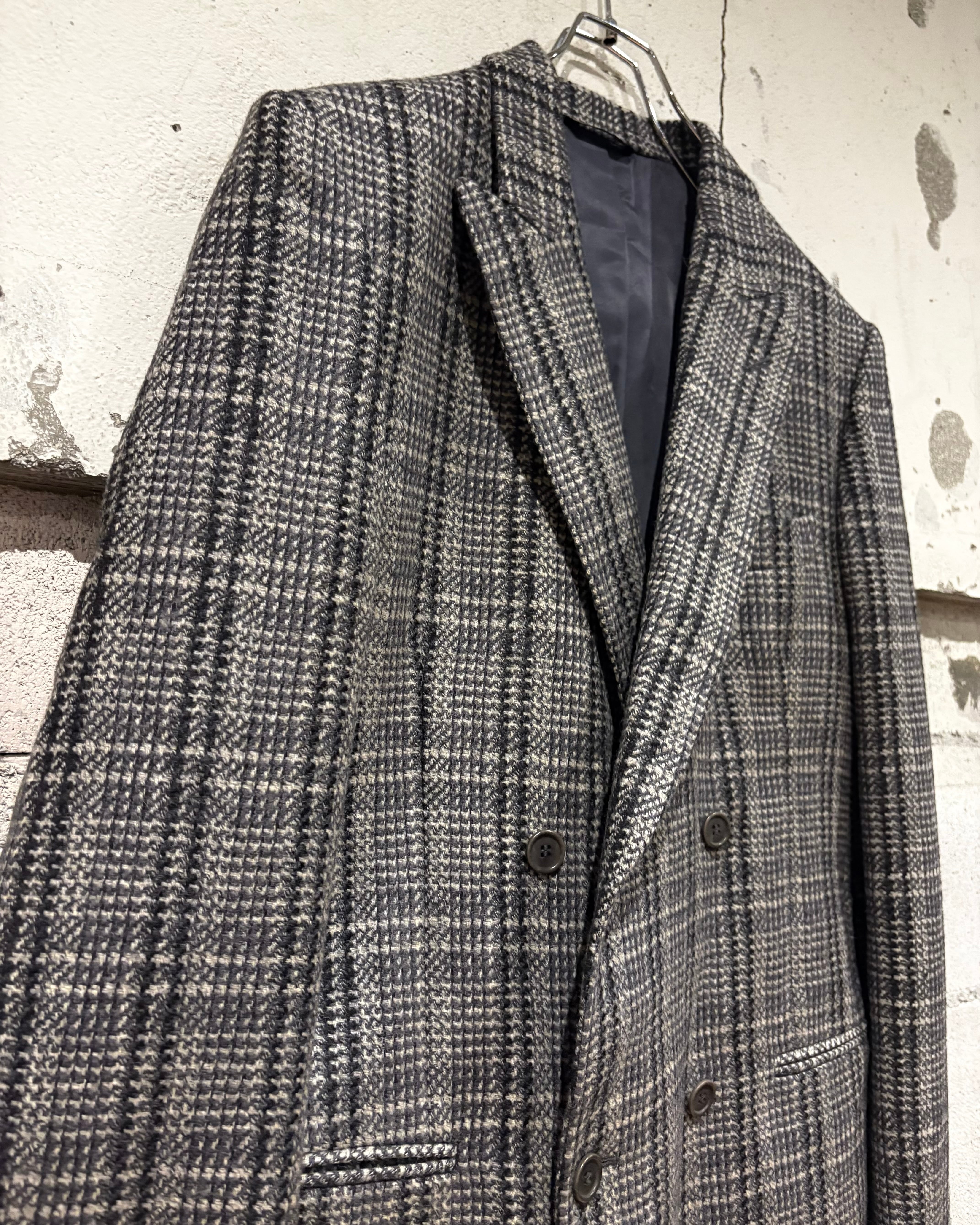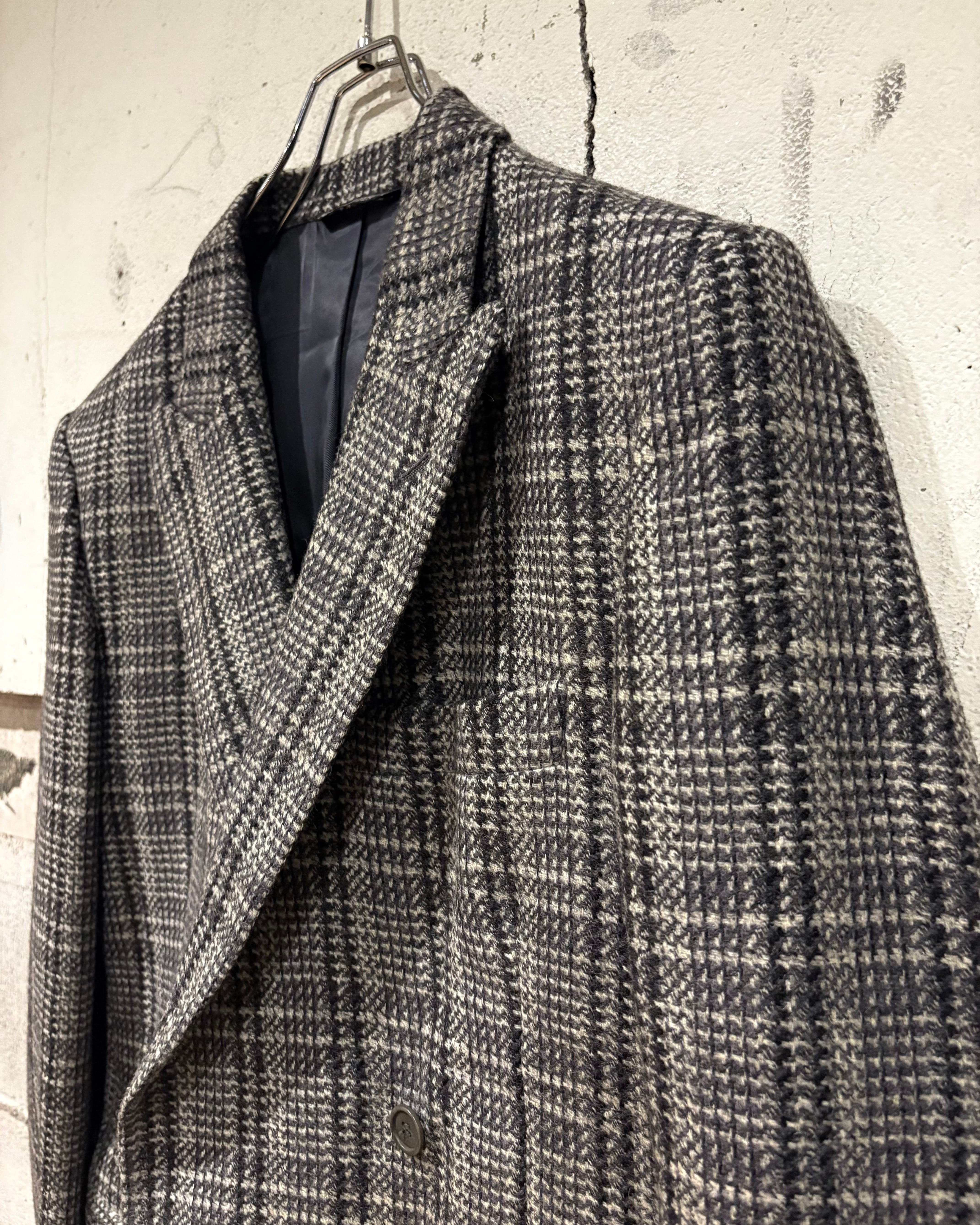 柔らかなショルダーと程よくドロップしたシルエット。ピークドラペルとダブルブレストが重厚なバランスを生み出し、羽織るだけでクラシックな存在感を放ちます。