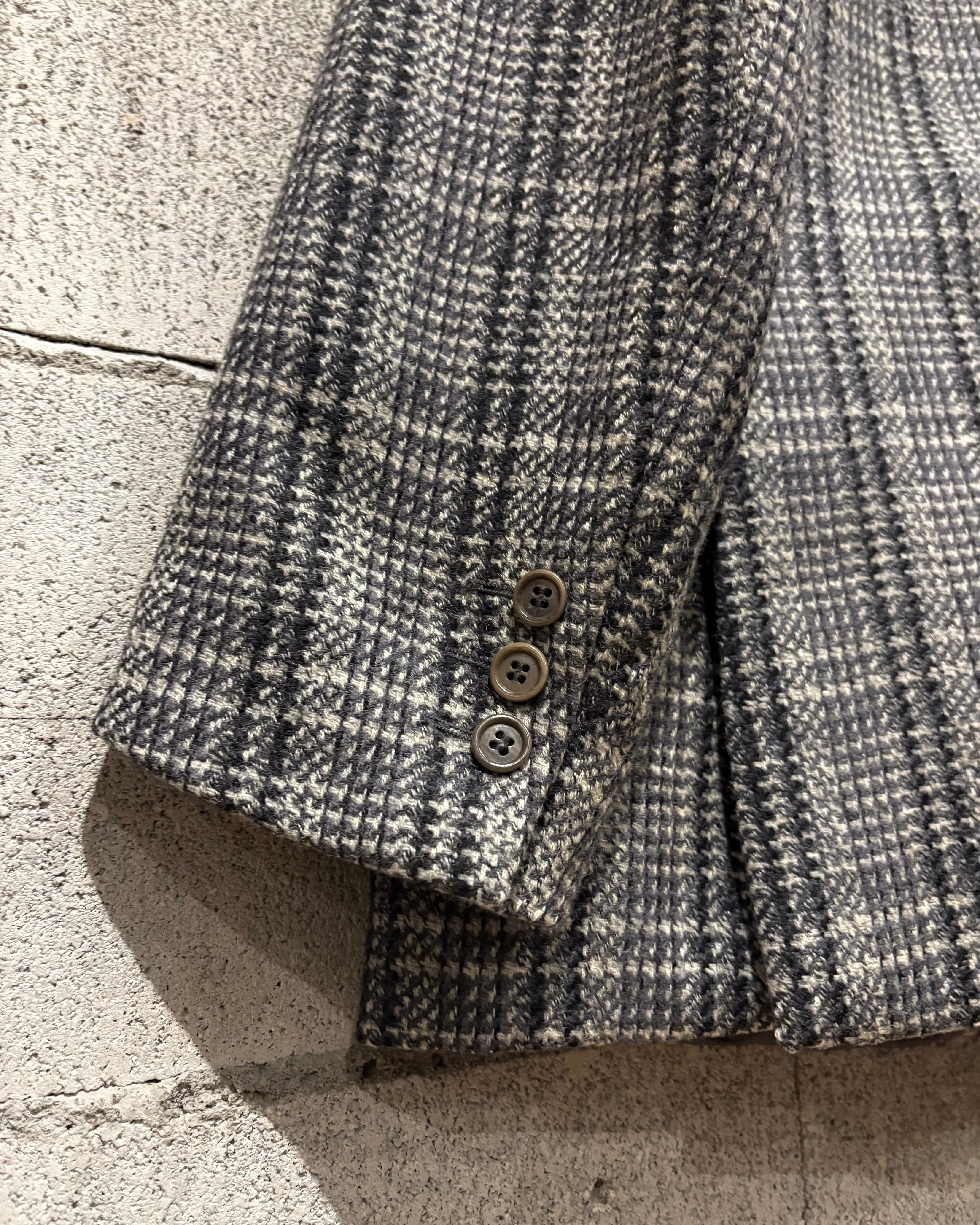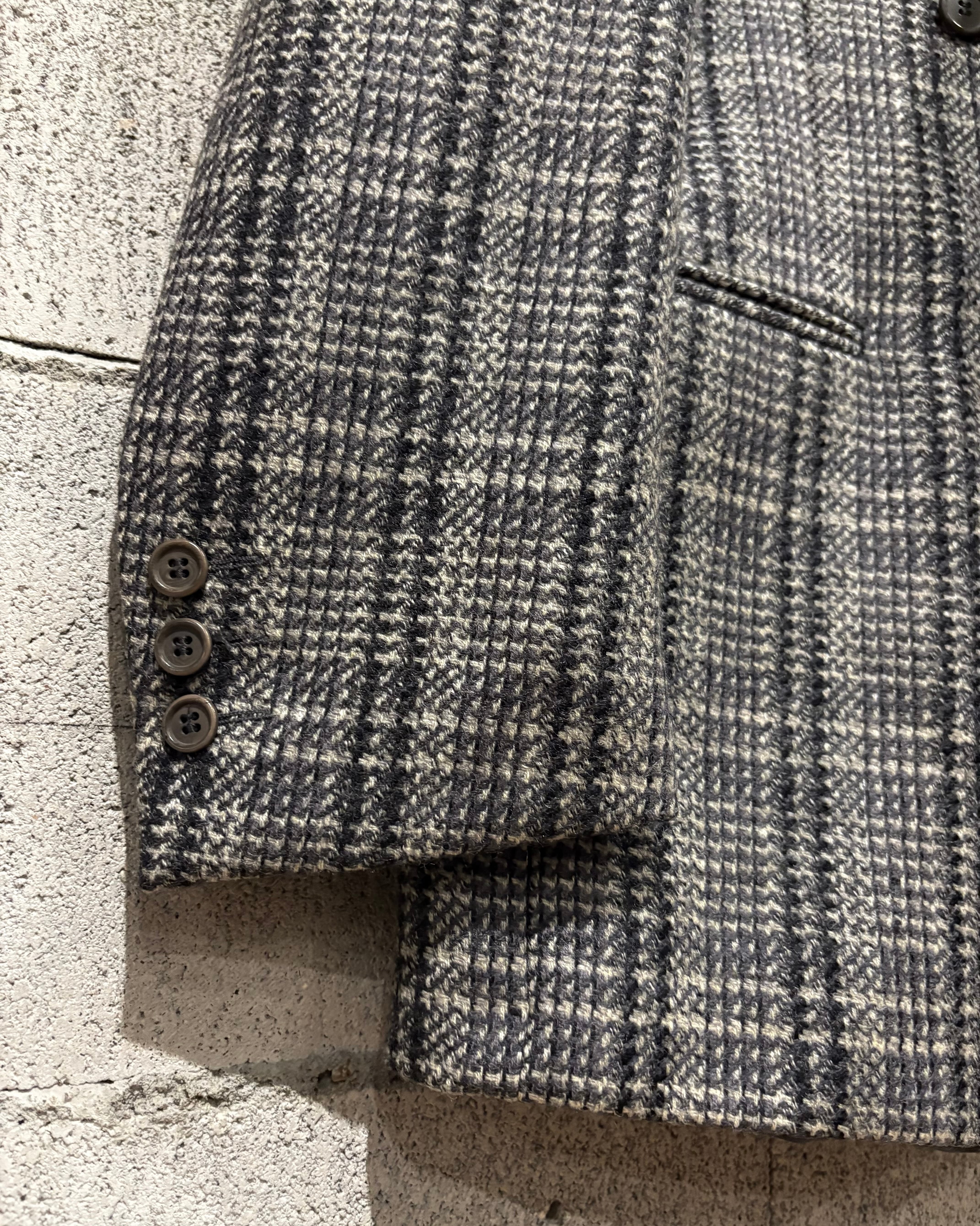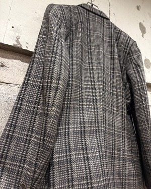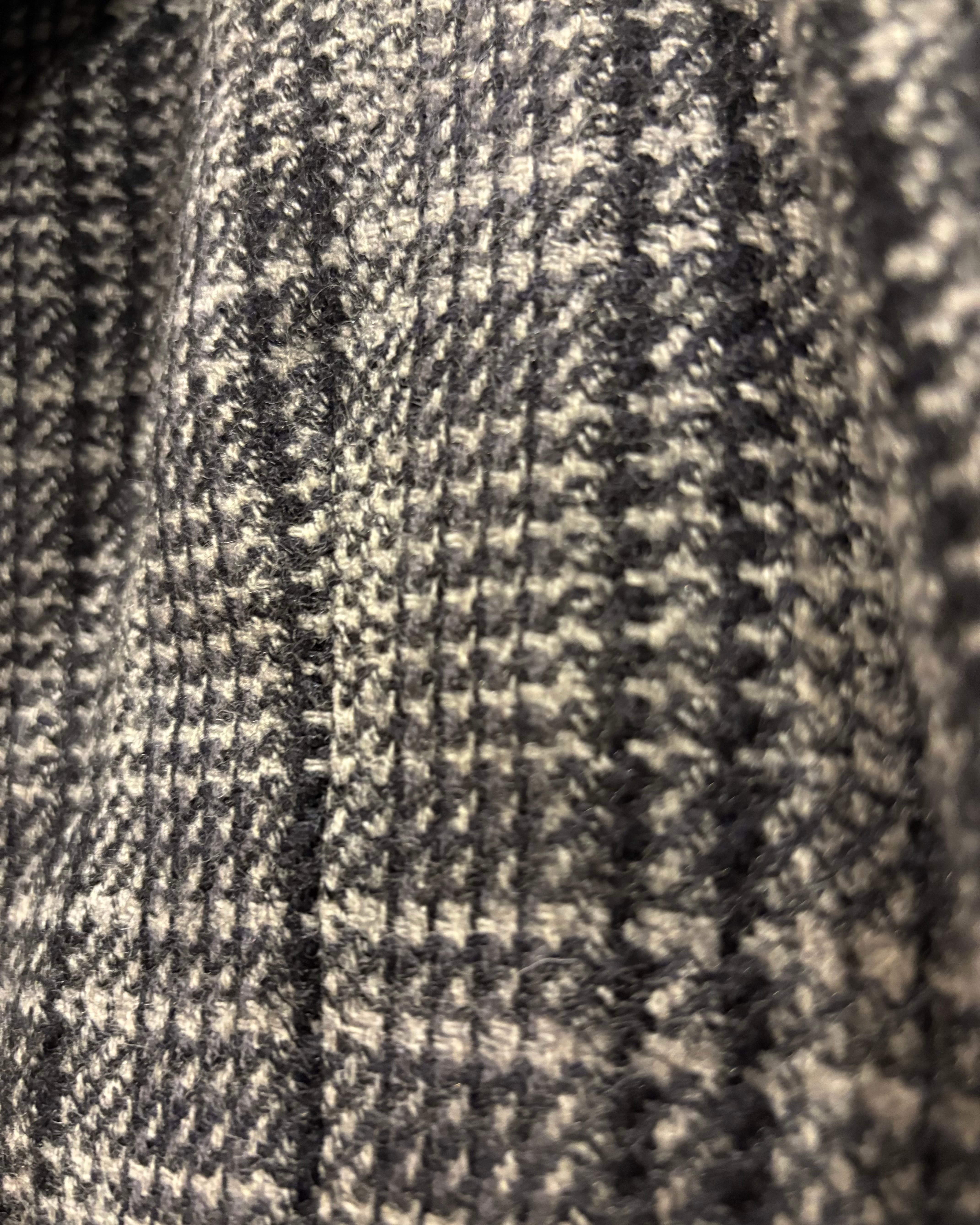 クラシカルなグレンチェック柄をベースにした上質なツイード生地は、ヴァージンウールを使用。肉厚ながらも柔らかく、起毛感のある表面がツイード特有の温もりを演出し、織りの奥行きと陰影が豊かで、光の加減によって見え方が変わる美しいテキスタイルです。
