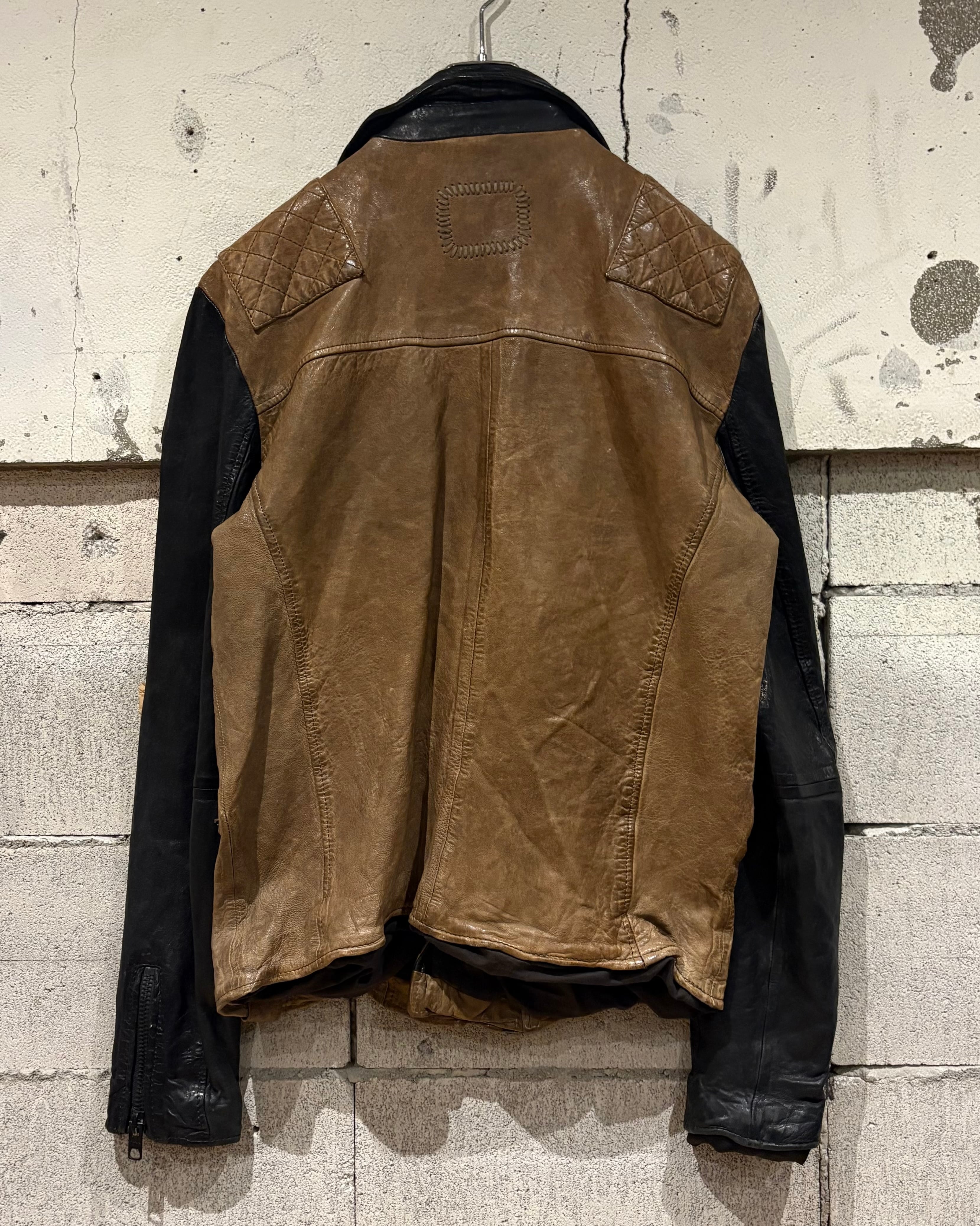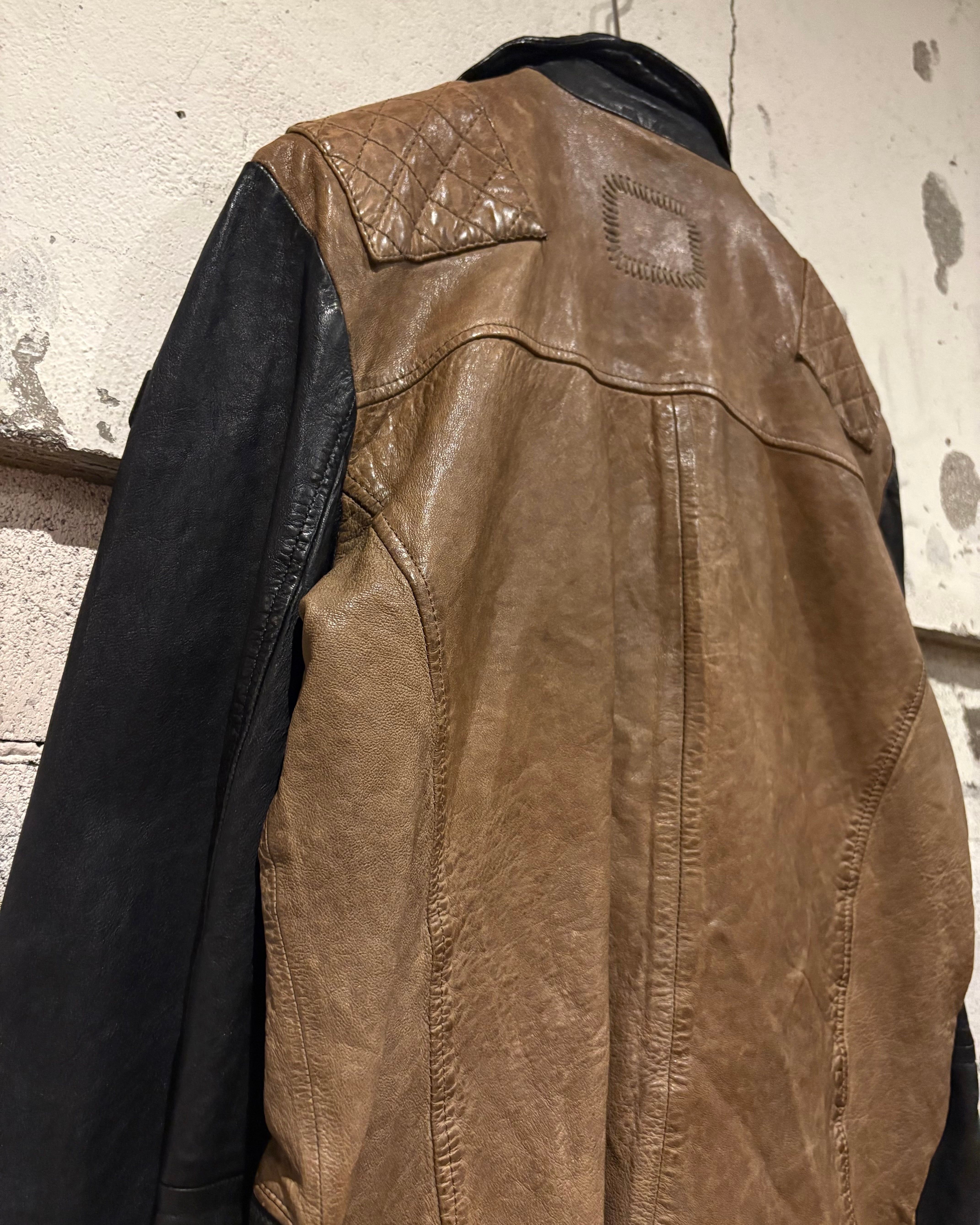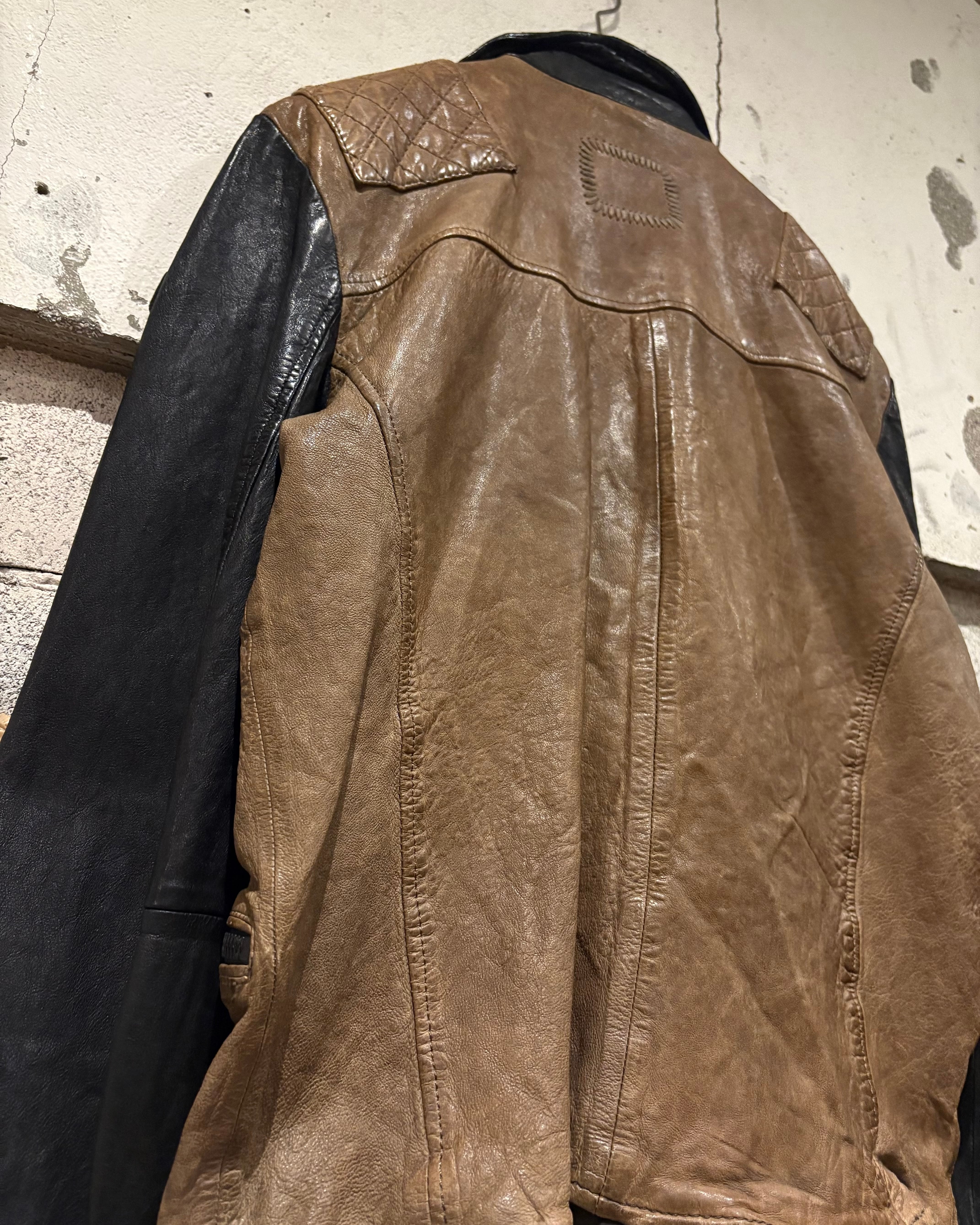 上質なレザーを使用し、ボディにはスモーキーなブラウン、スリーブには深みあるブラックを採用した切り替えのデザインが際立つ1着。