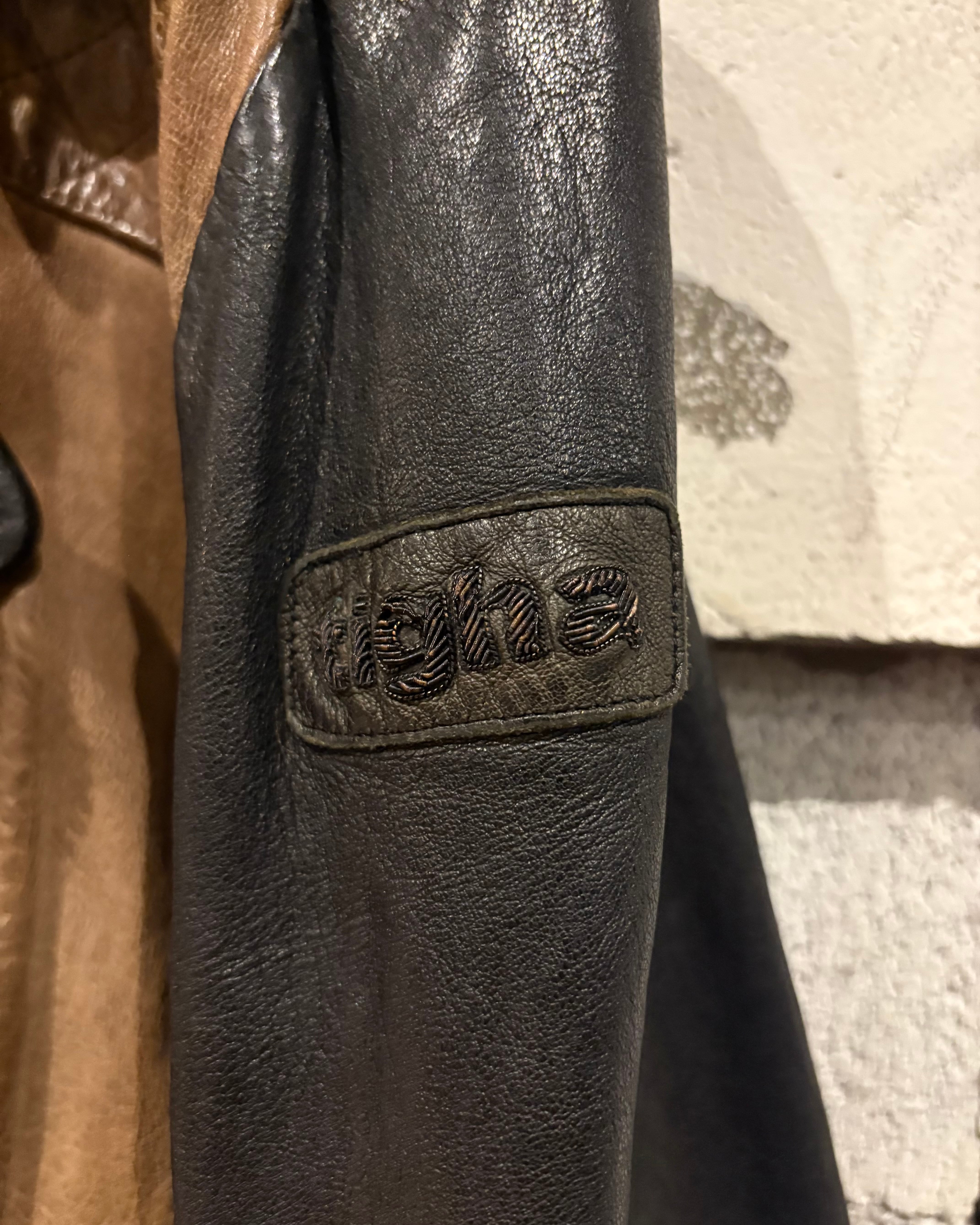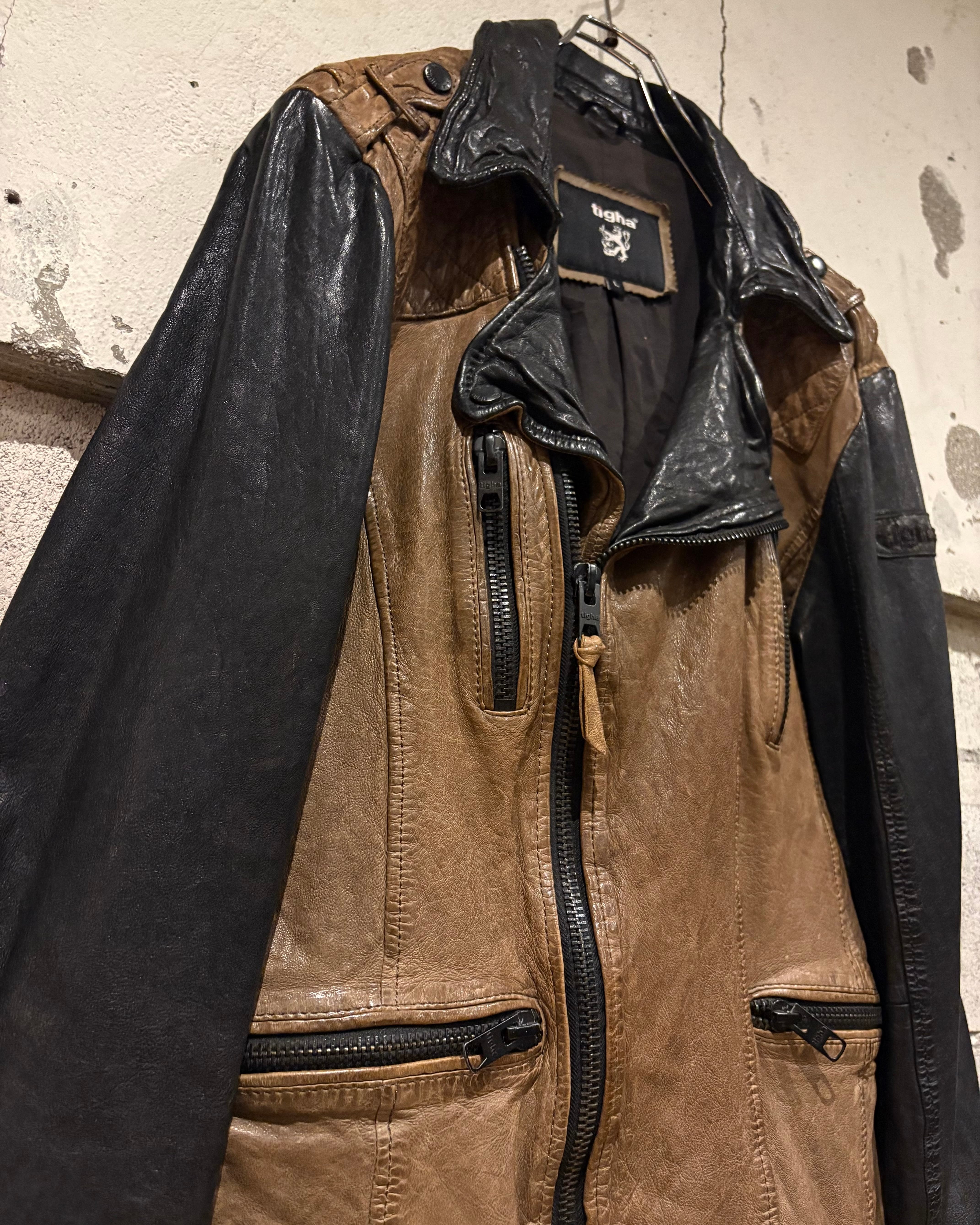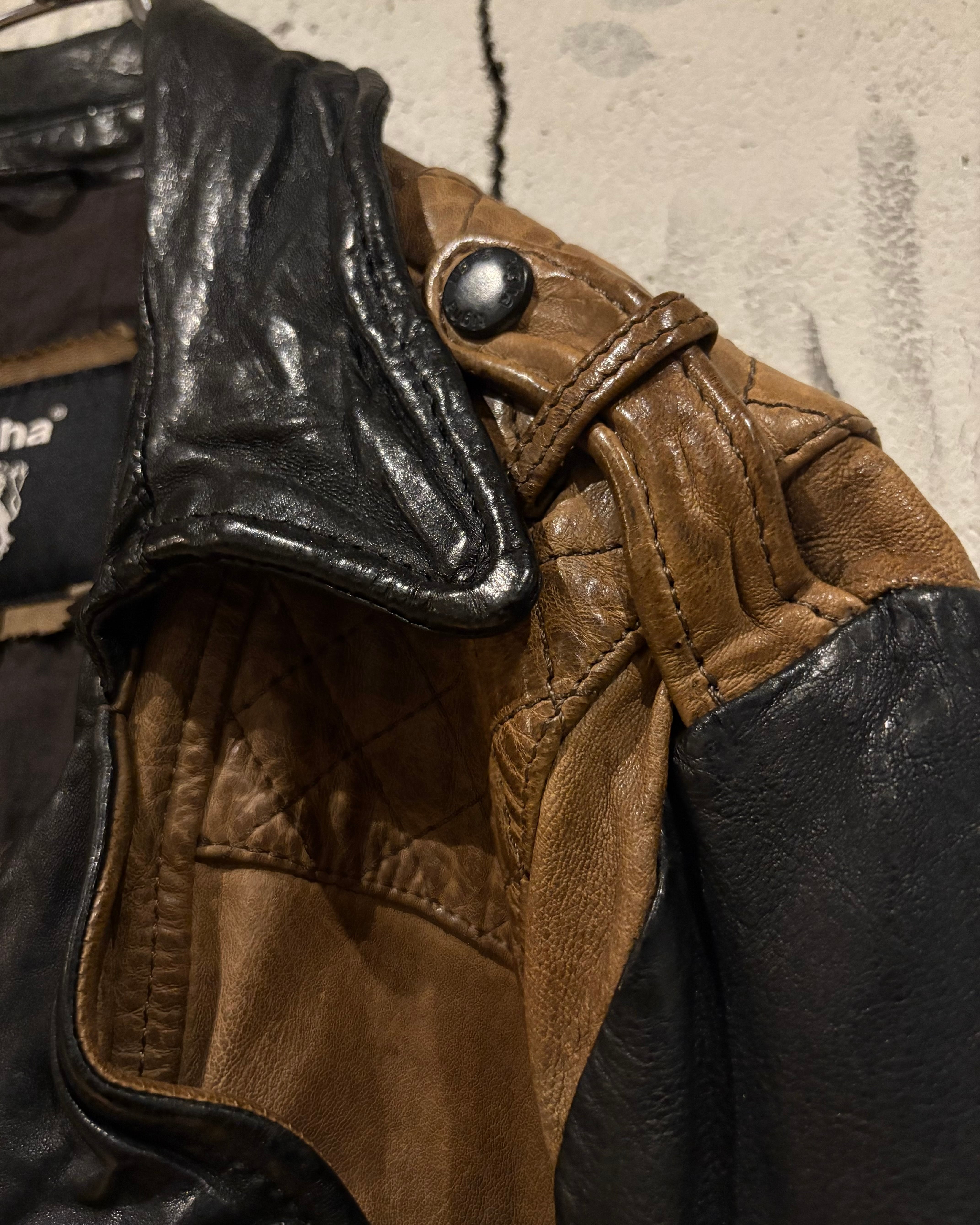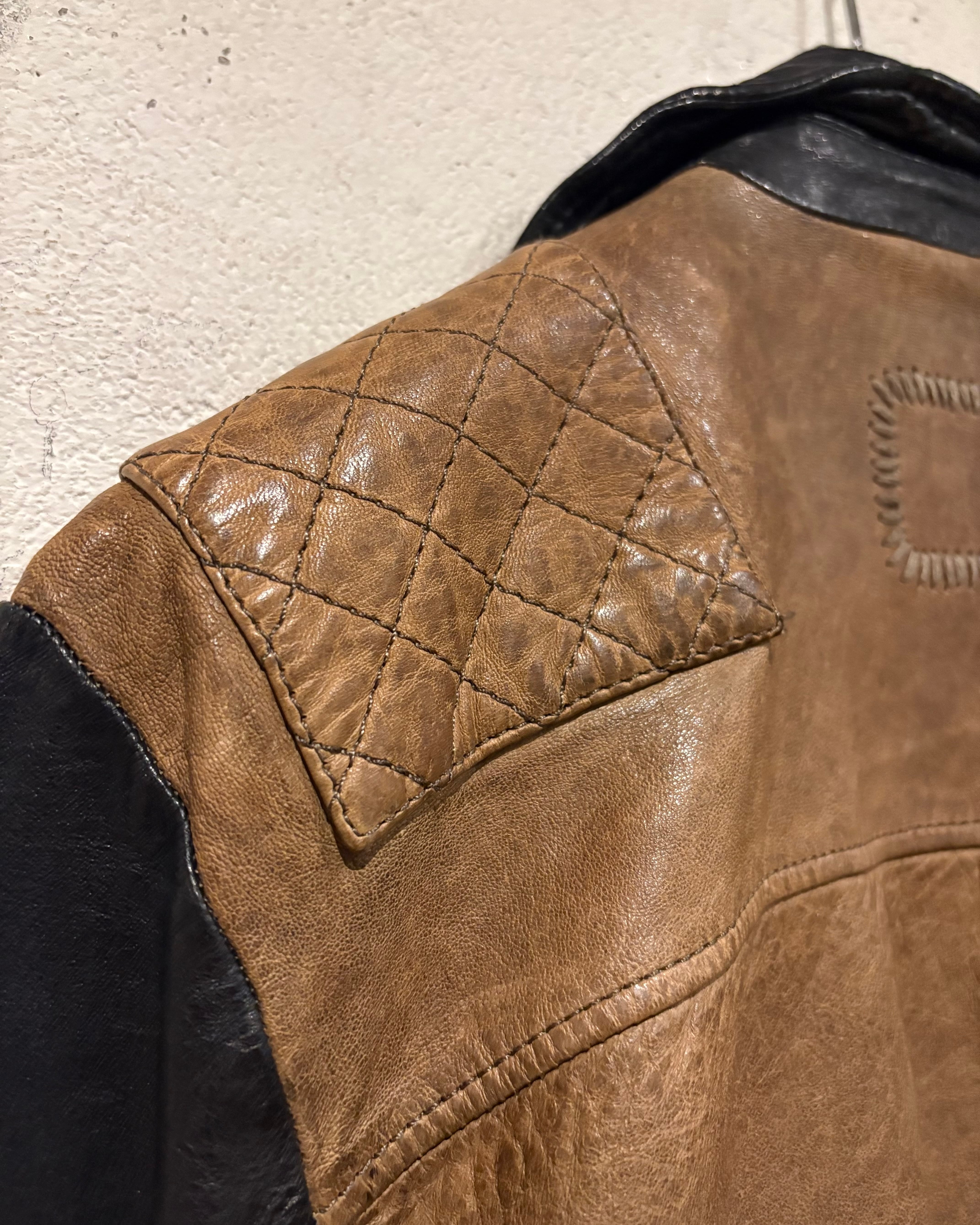 上質なレザーを使用し、ボディにはスモーキーなブラウン、スリーブには深みあるブラックを採用した切り替えのデザインが際立つ1着。