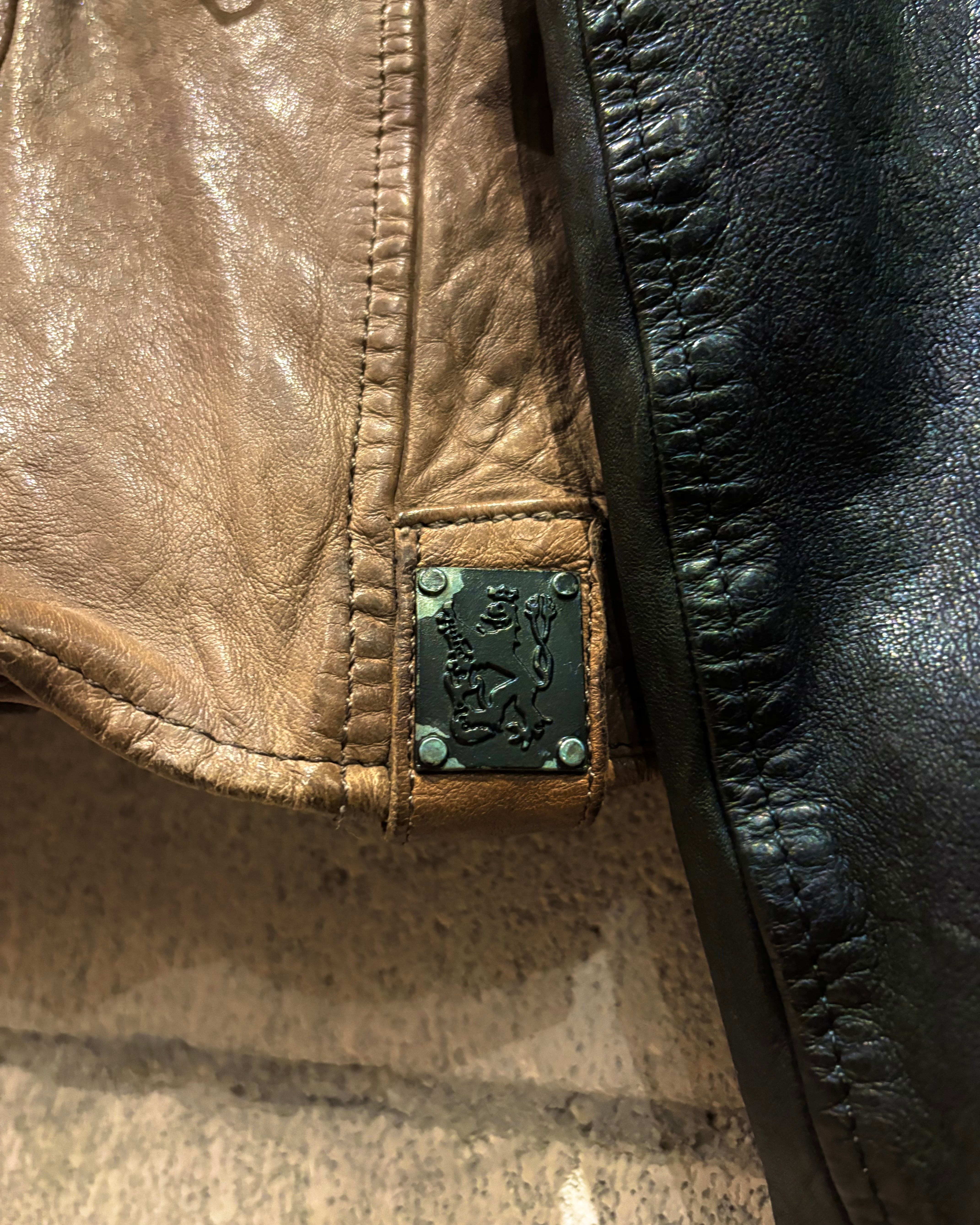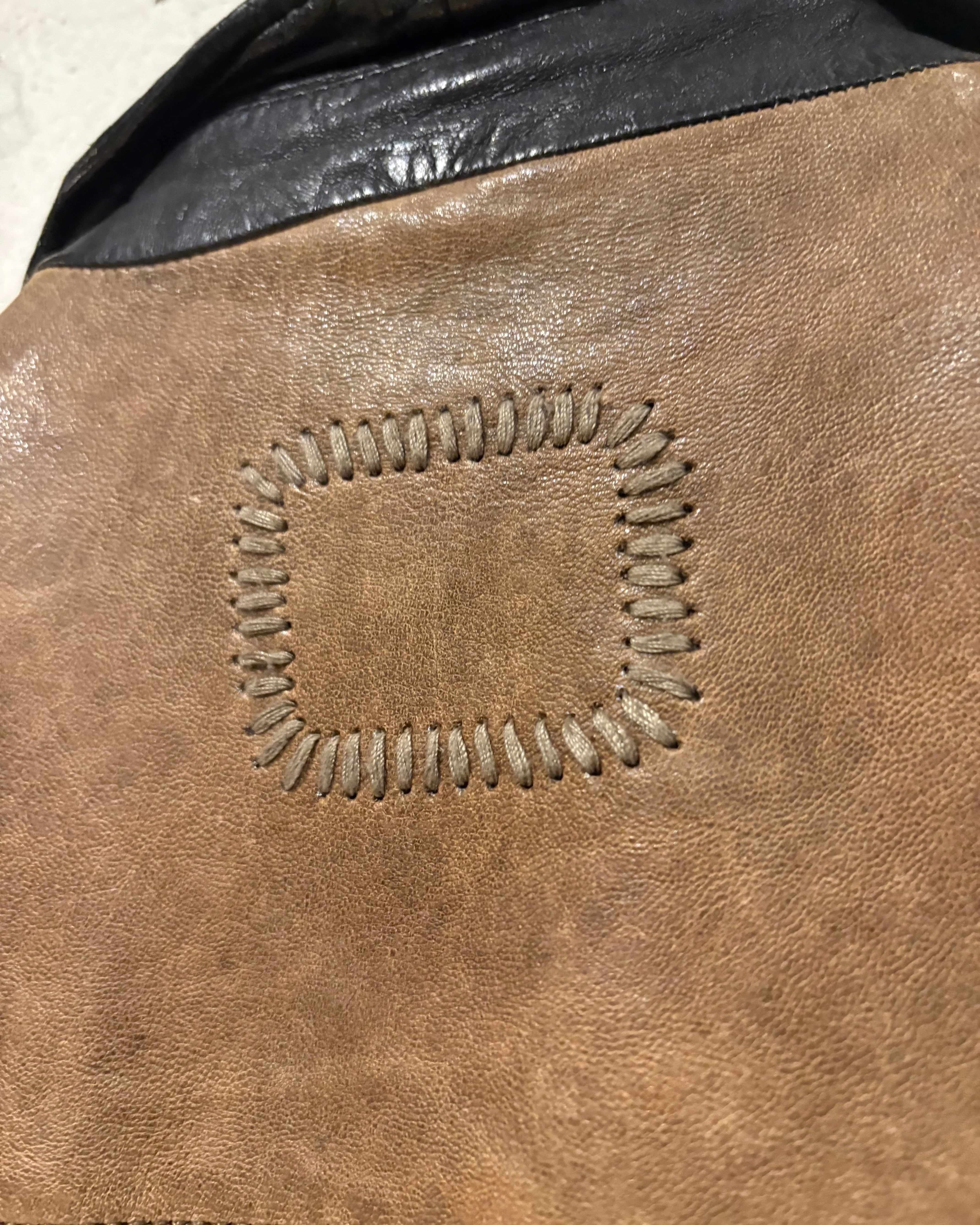異なるトーンのレザーが織りなす奥行きのある表情は経年変化による艶と皺をより際立たせ、着用を重ねることで生まれるエイジングを存分にお楽しみお楽しみいただけるかと。
