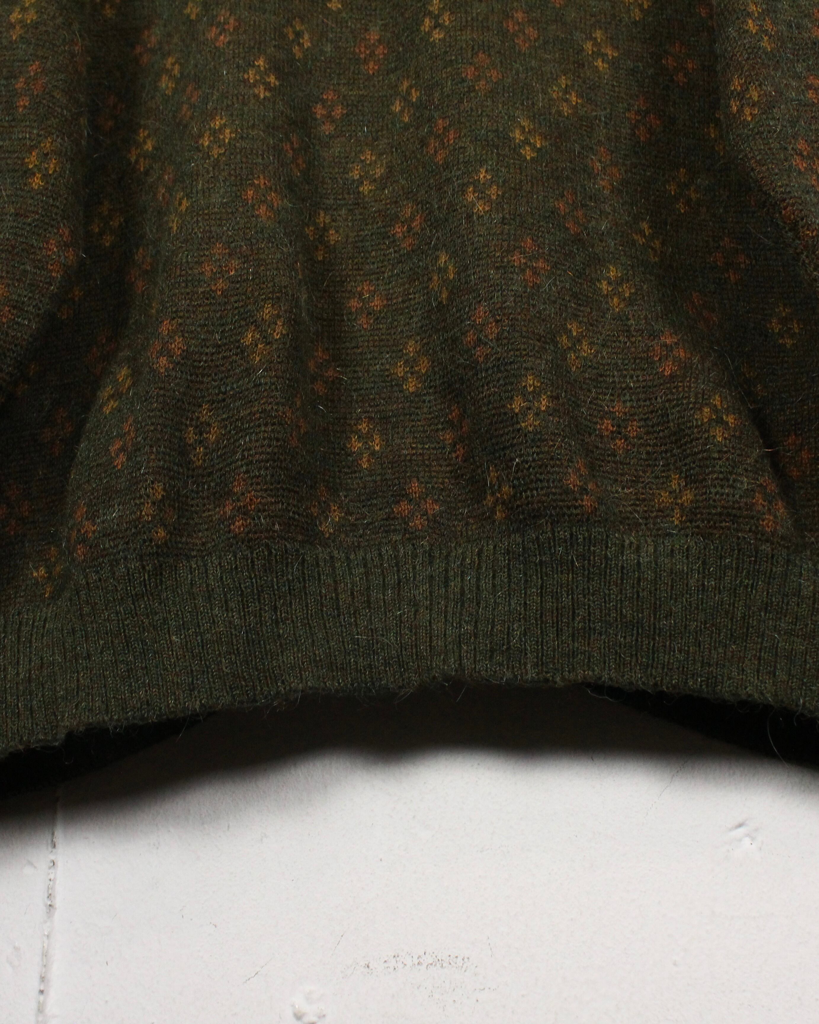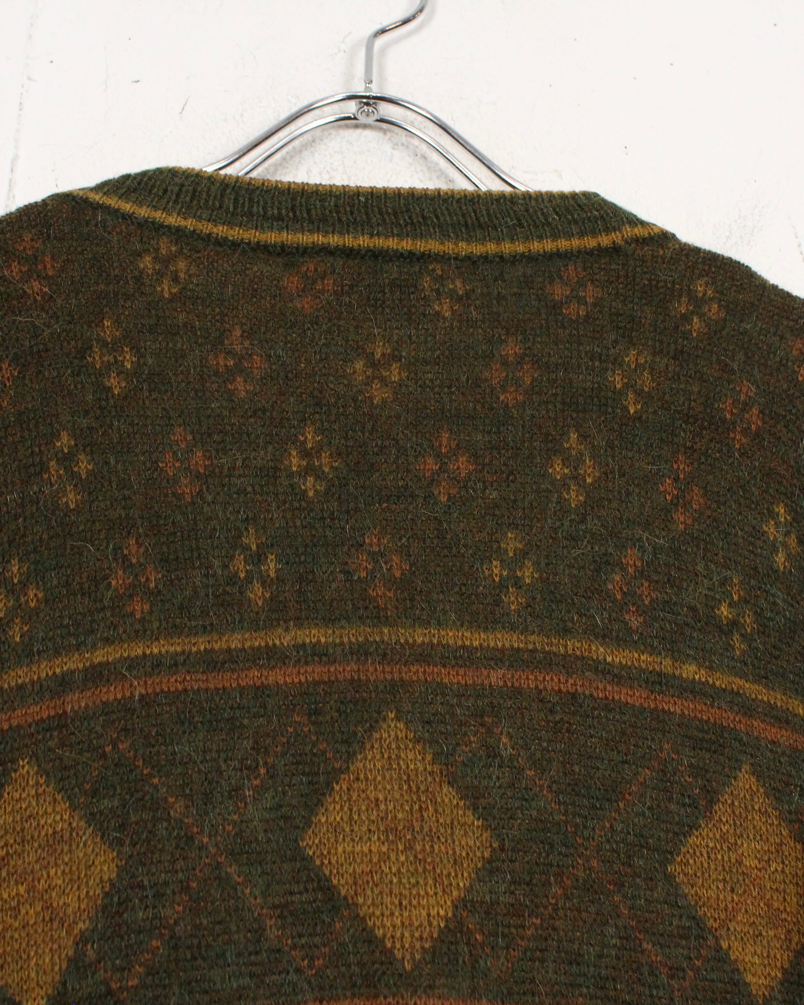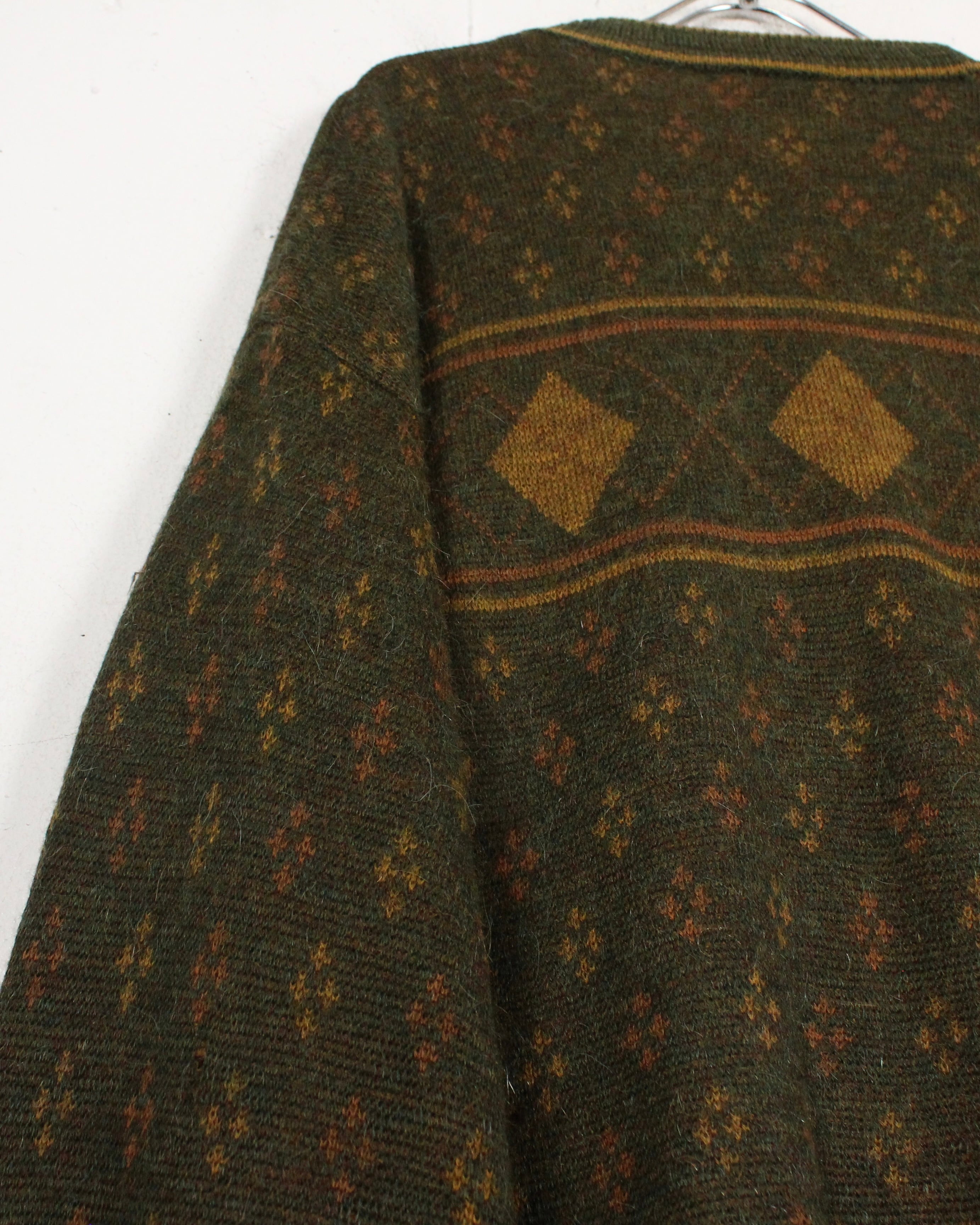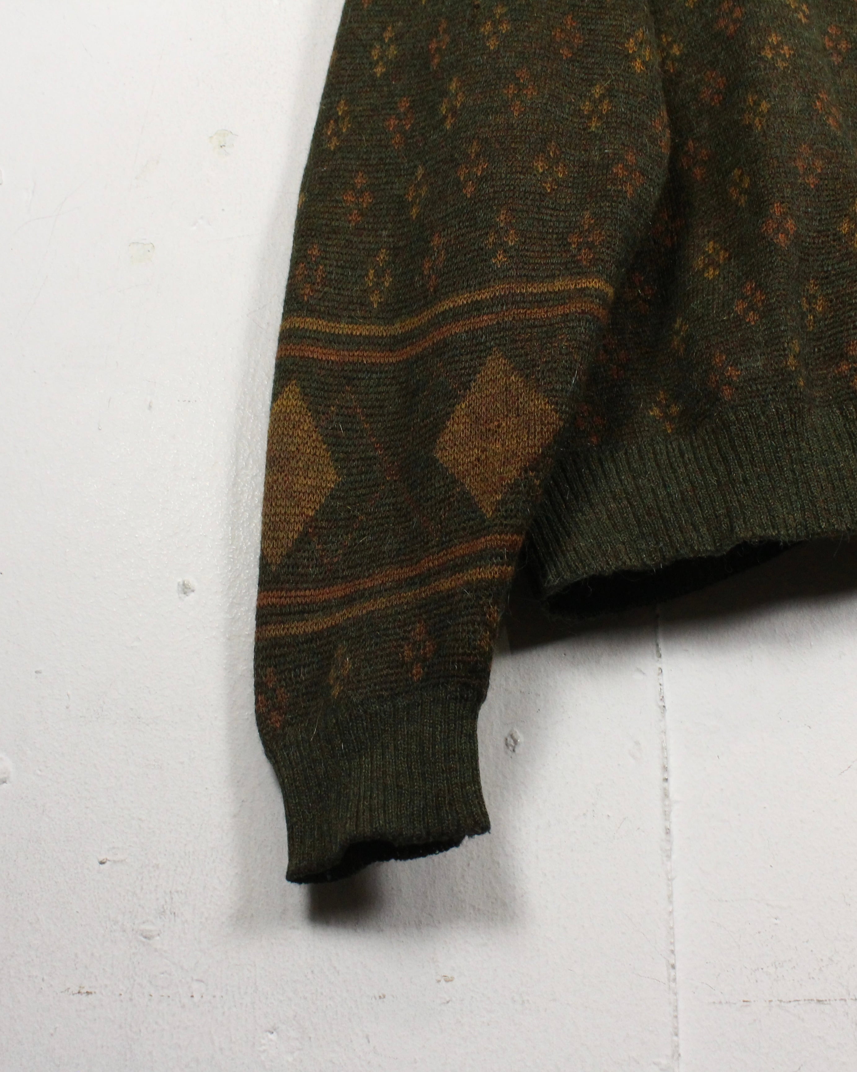 ダークオリーブを基調に、マスタードトーンのダイヤ柄と小紋パターンを散りばめた渋みある1着。