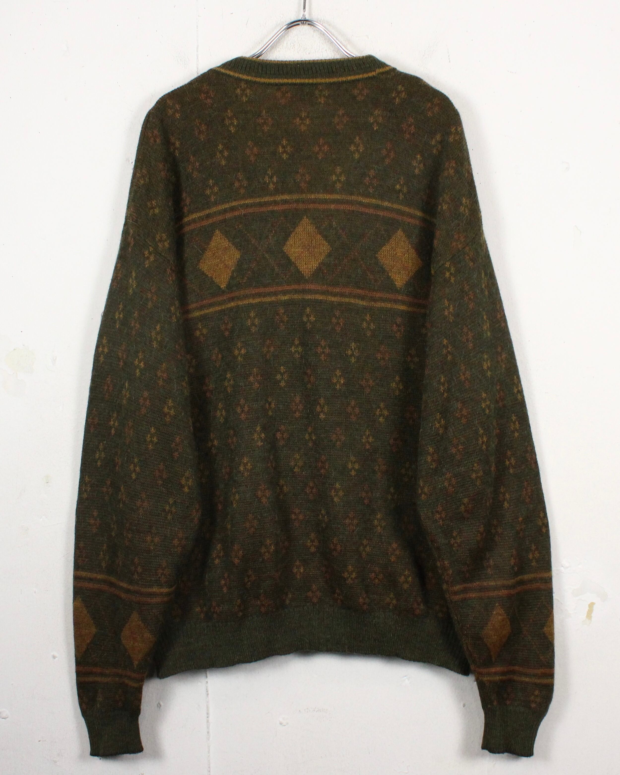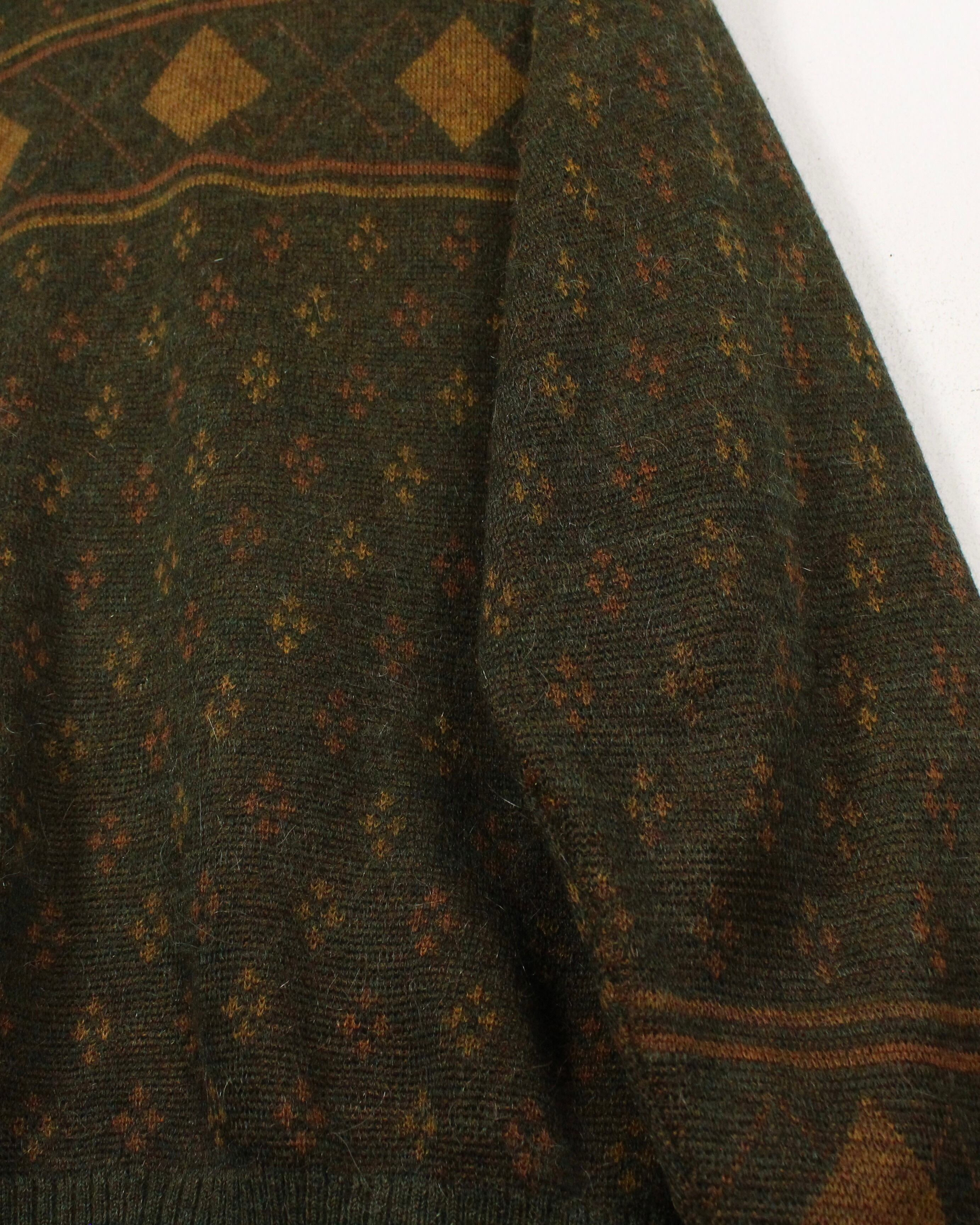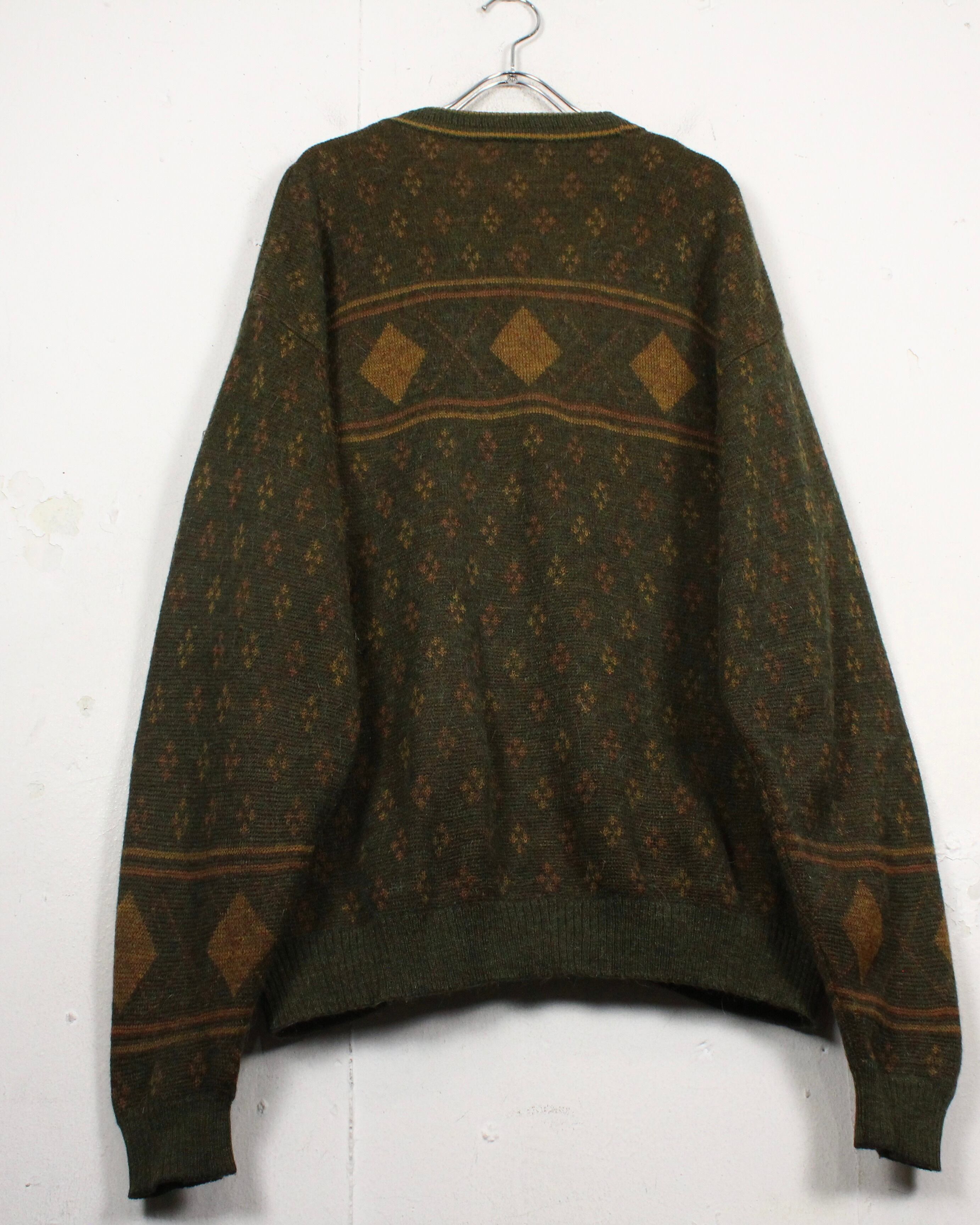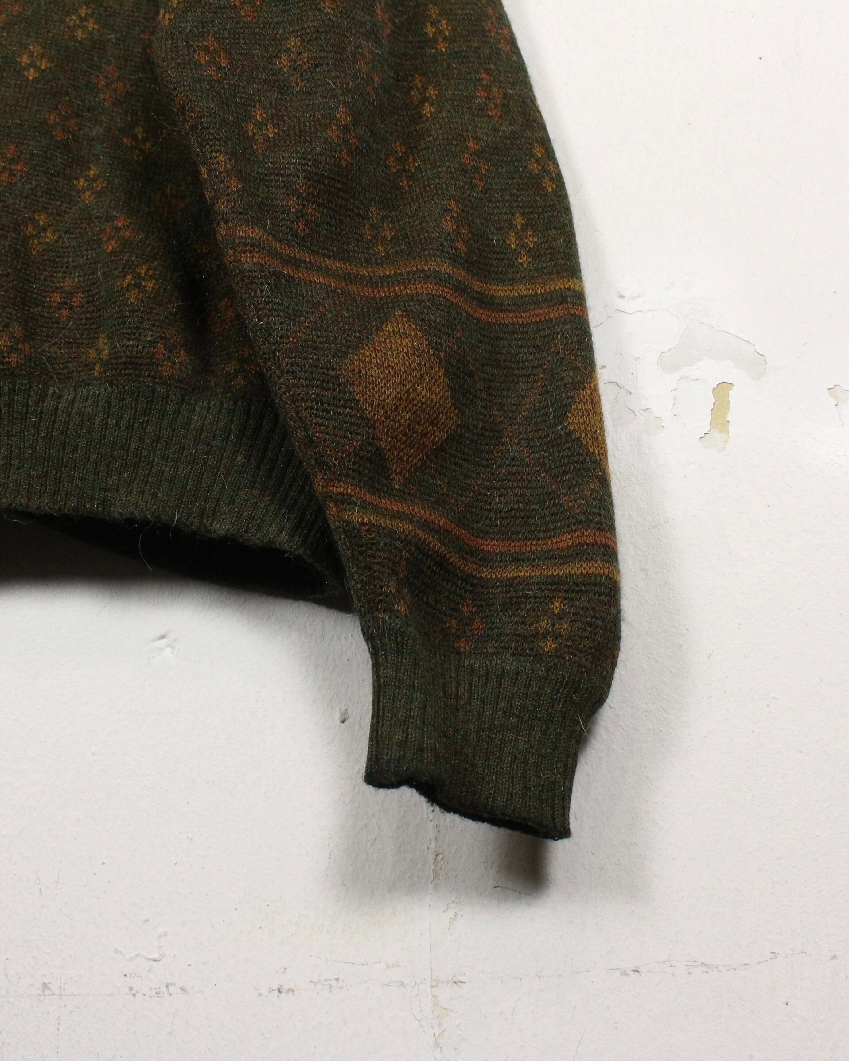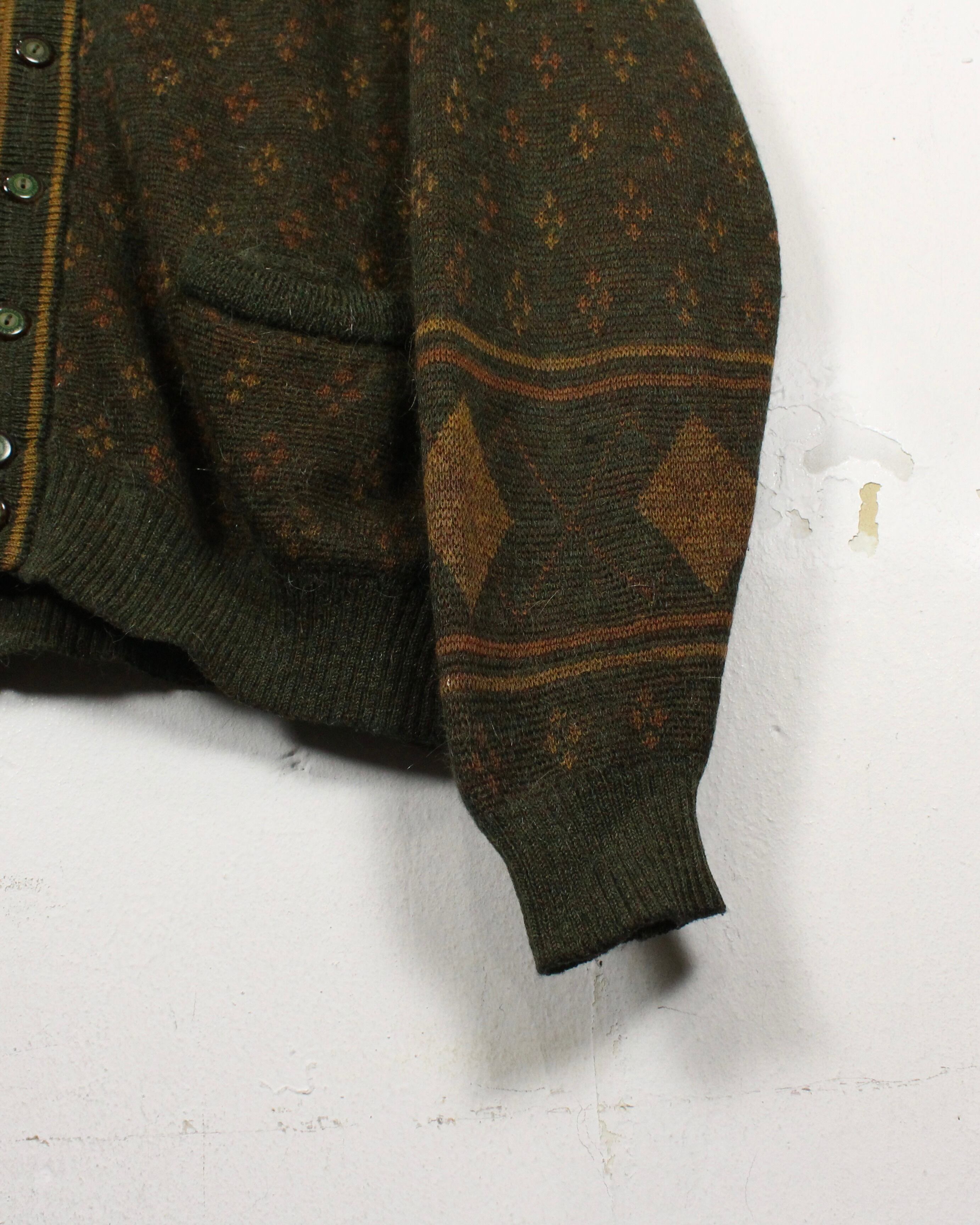 ダークオリーブを基調に、マスタードトーンのダイヤ柄と小紋パターンを散りばめた渋みある1着。