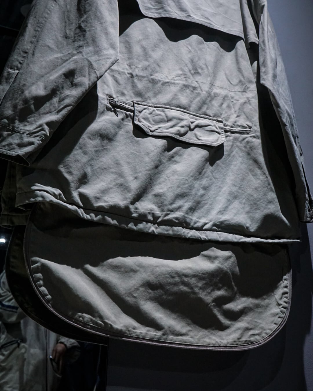 フロントに多数の立体フラップポケットを配し、ユーティリティ性を高めながらもデザインとしても存在感を発揮。背面にはジップ開閉でラウンド状の長い裾を展開し延長できるギミックが搭載されており、機能性とファッション性を両立した仕上がりに。