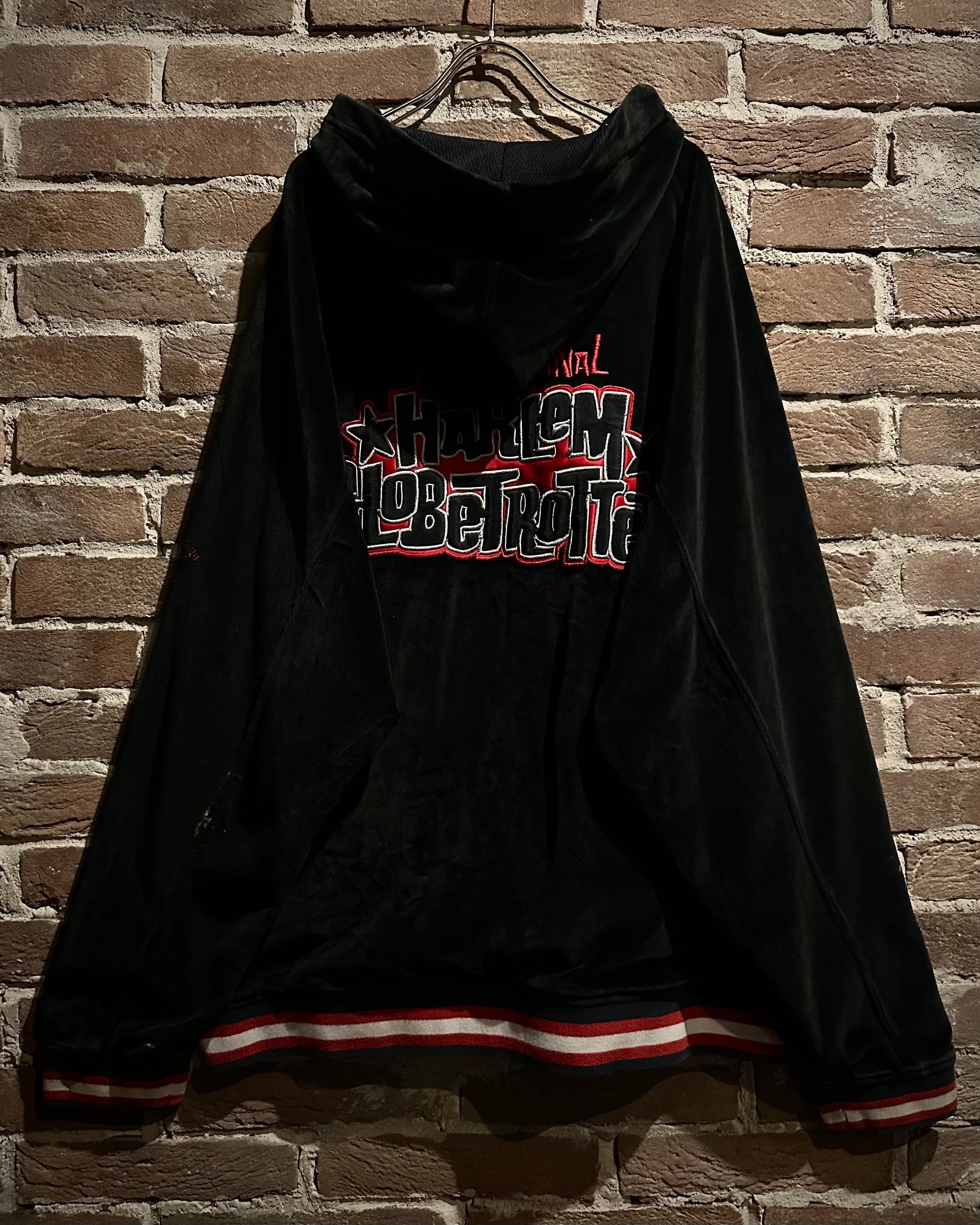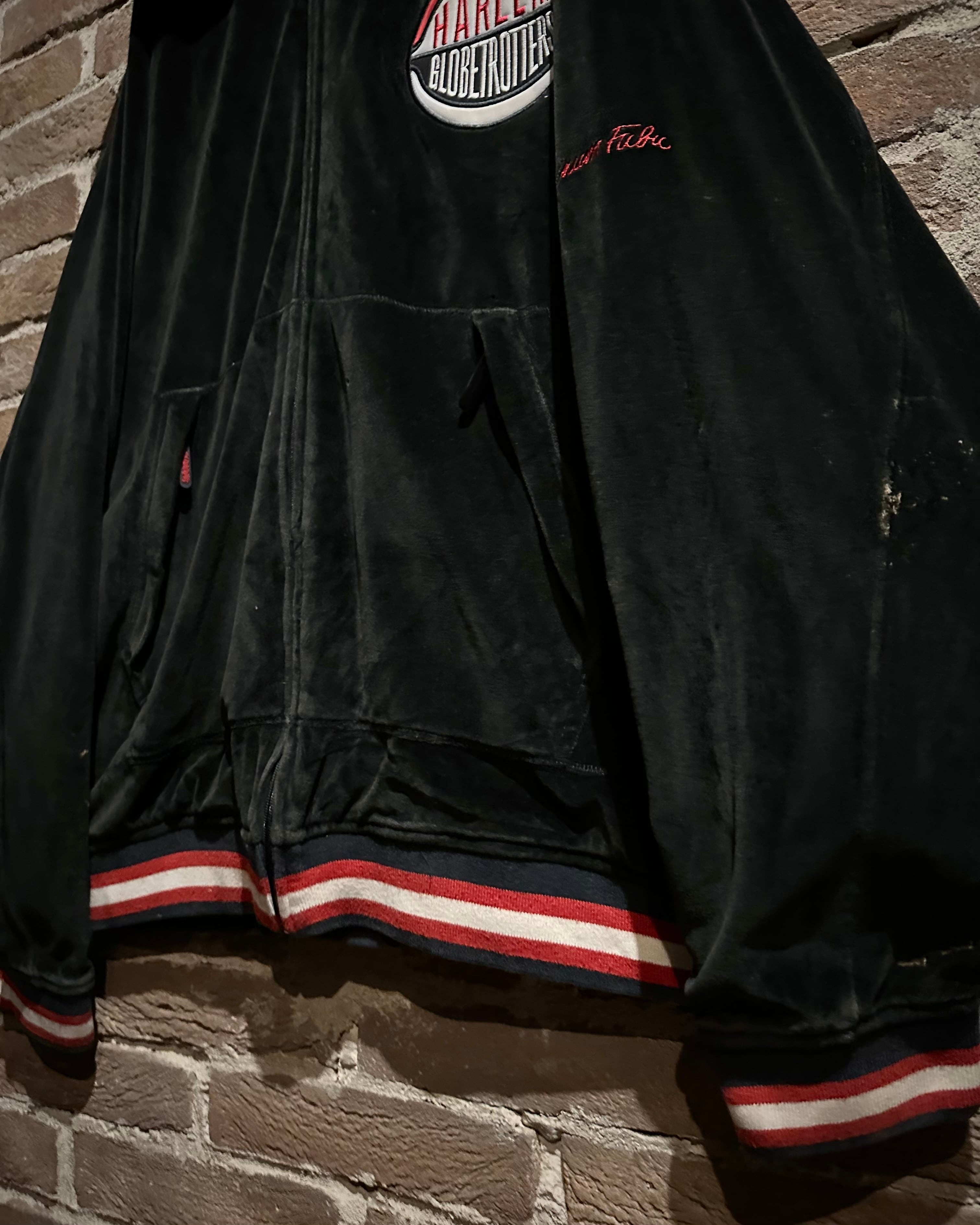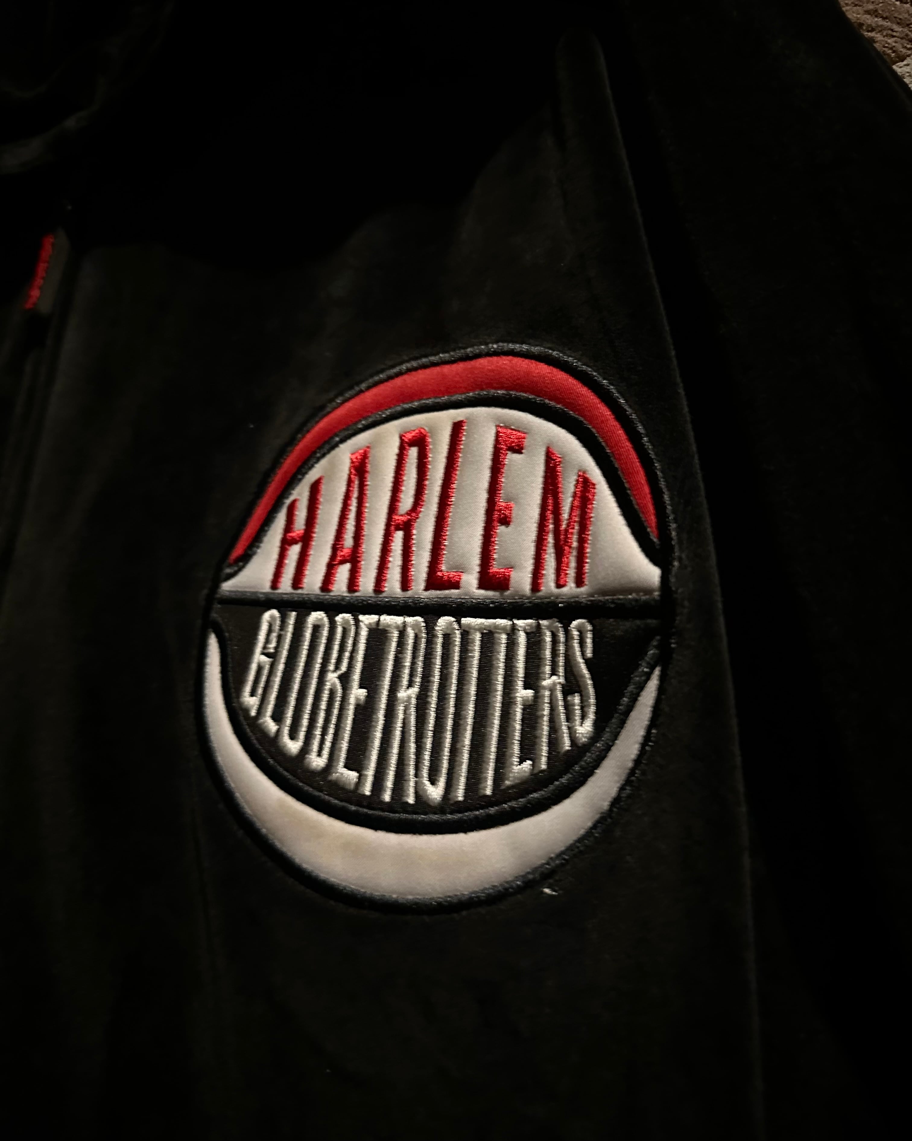 フロントには“HARLEM GLOBETROTTERS”の刺繍ロゴ、背面にはインパクト抜群のロゴグラフィックを大胆に配置。袖には“Platinum Fubu”の刺繍が入り、ブランドの威信をしっかりと主張します。