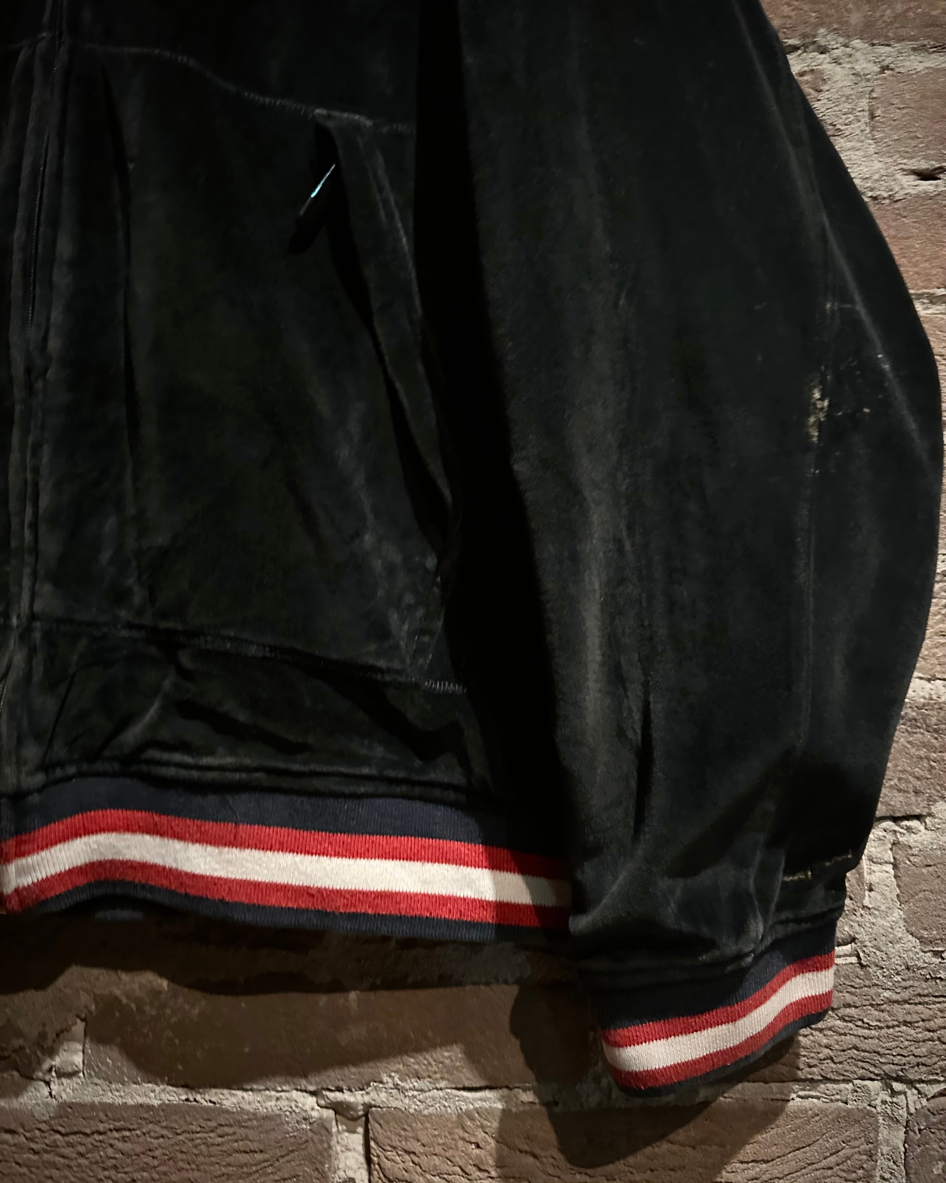 深みあるブラックのベロアボディを用いたジップアップフーディ。