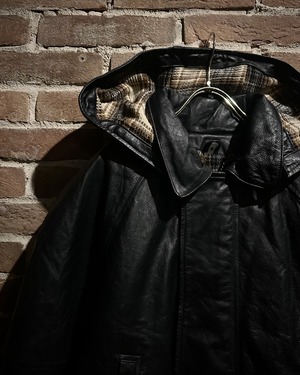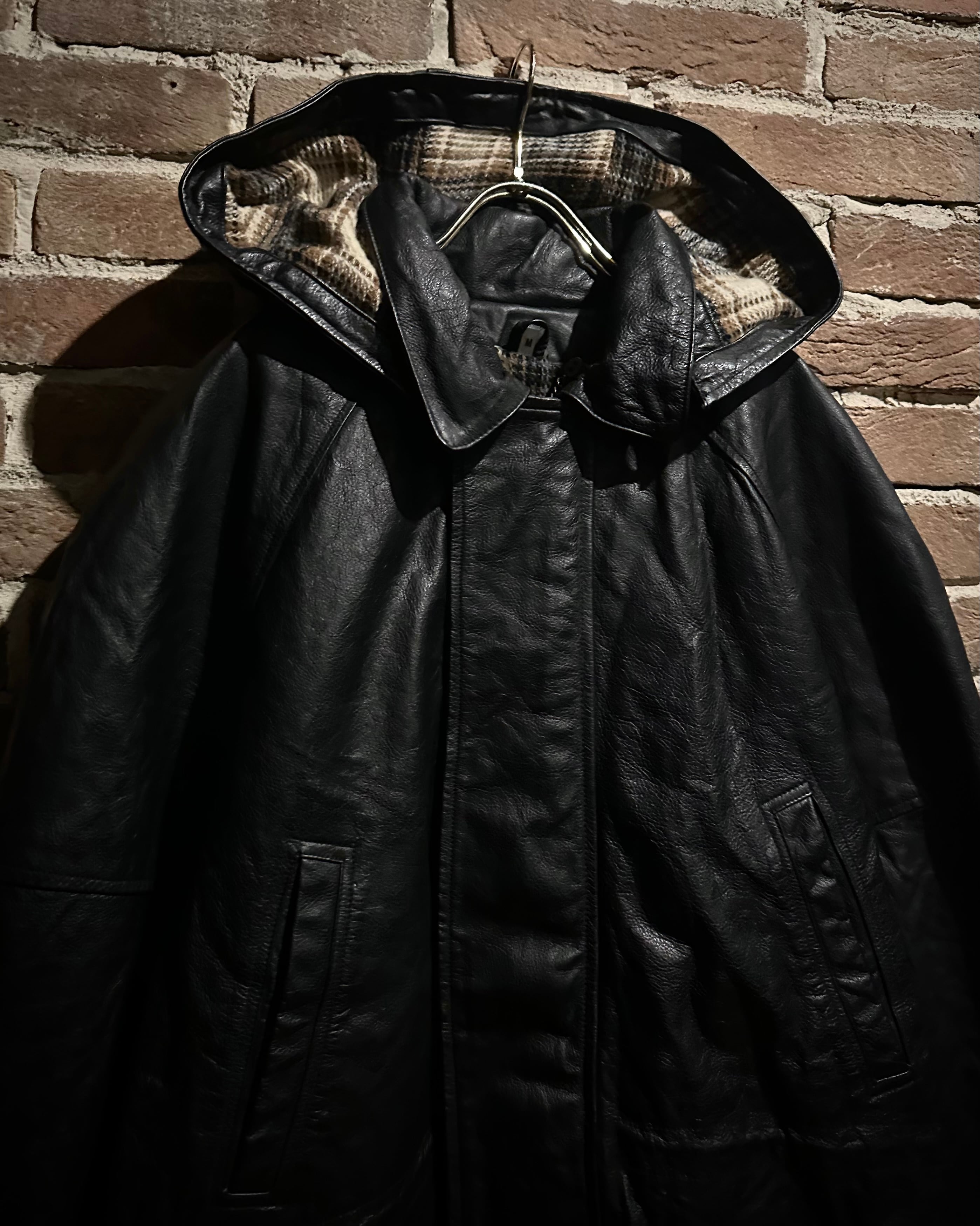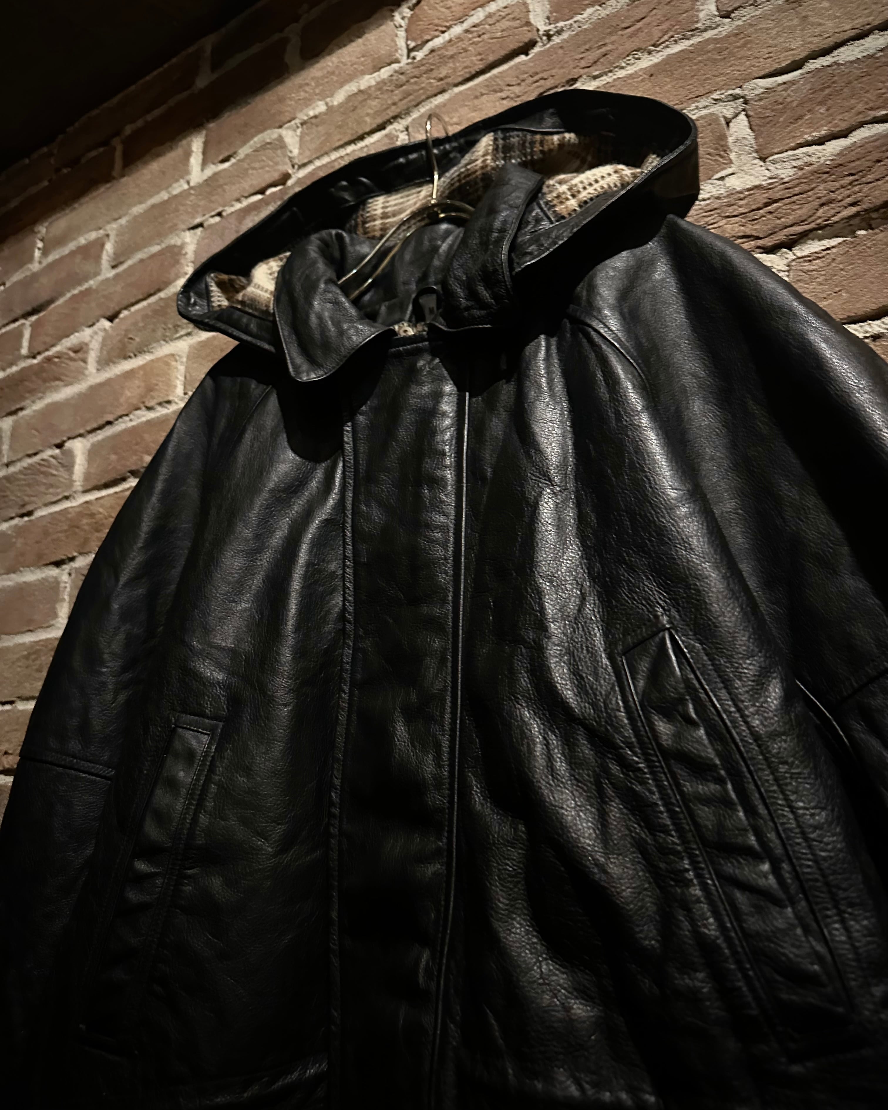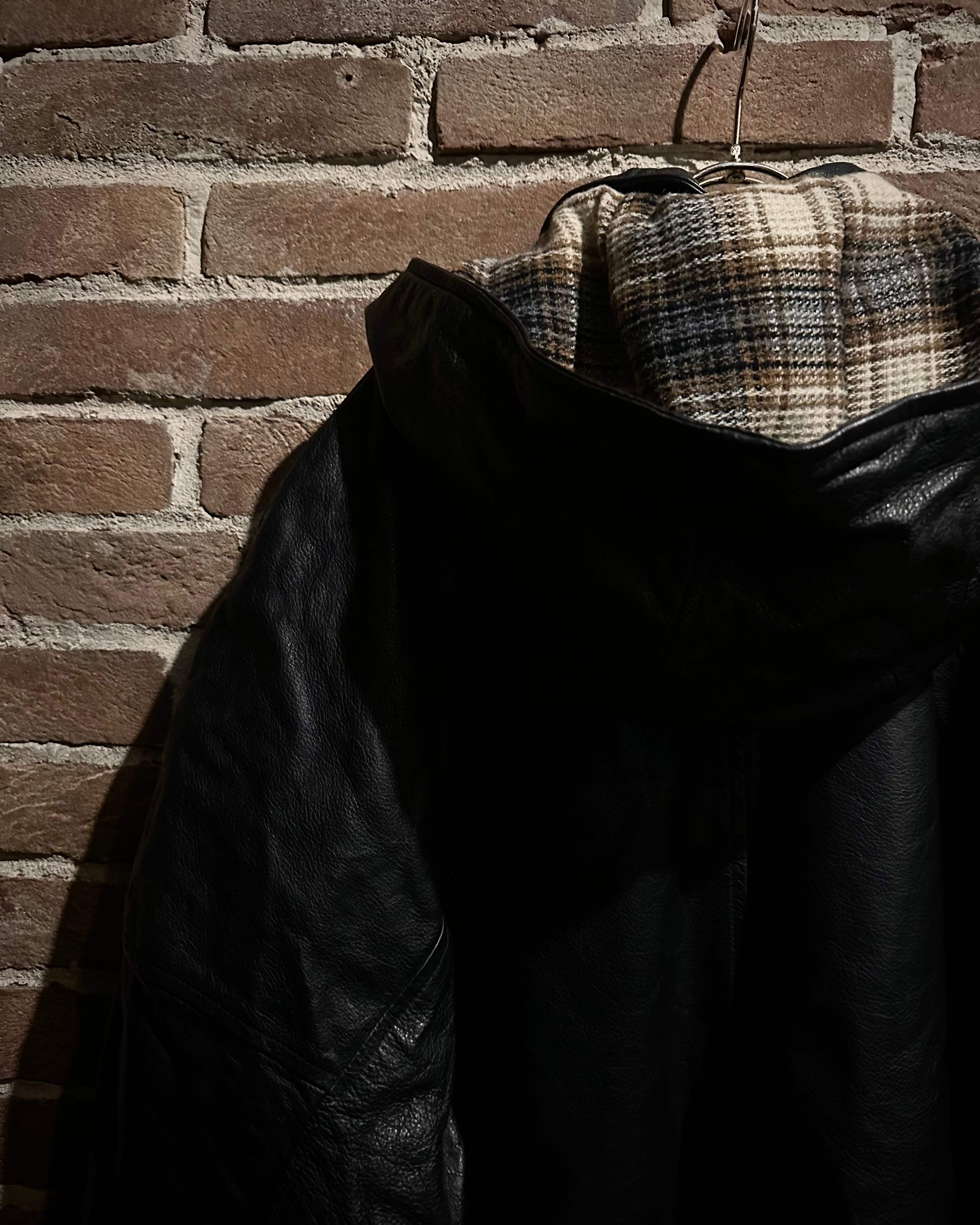 しっとりとした質感と鈍い光沢を放つブラックレザーが、重厚感と品格を両立。フード部分は着脱可能仕様となっており、スタンドカラーとしても着用できます。