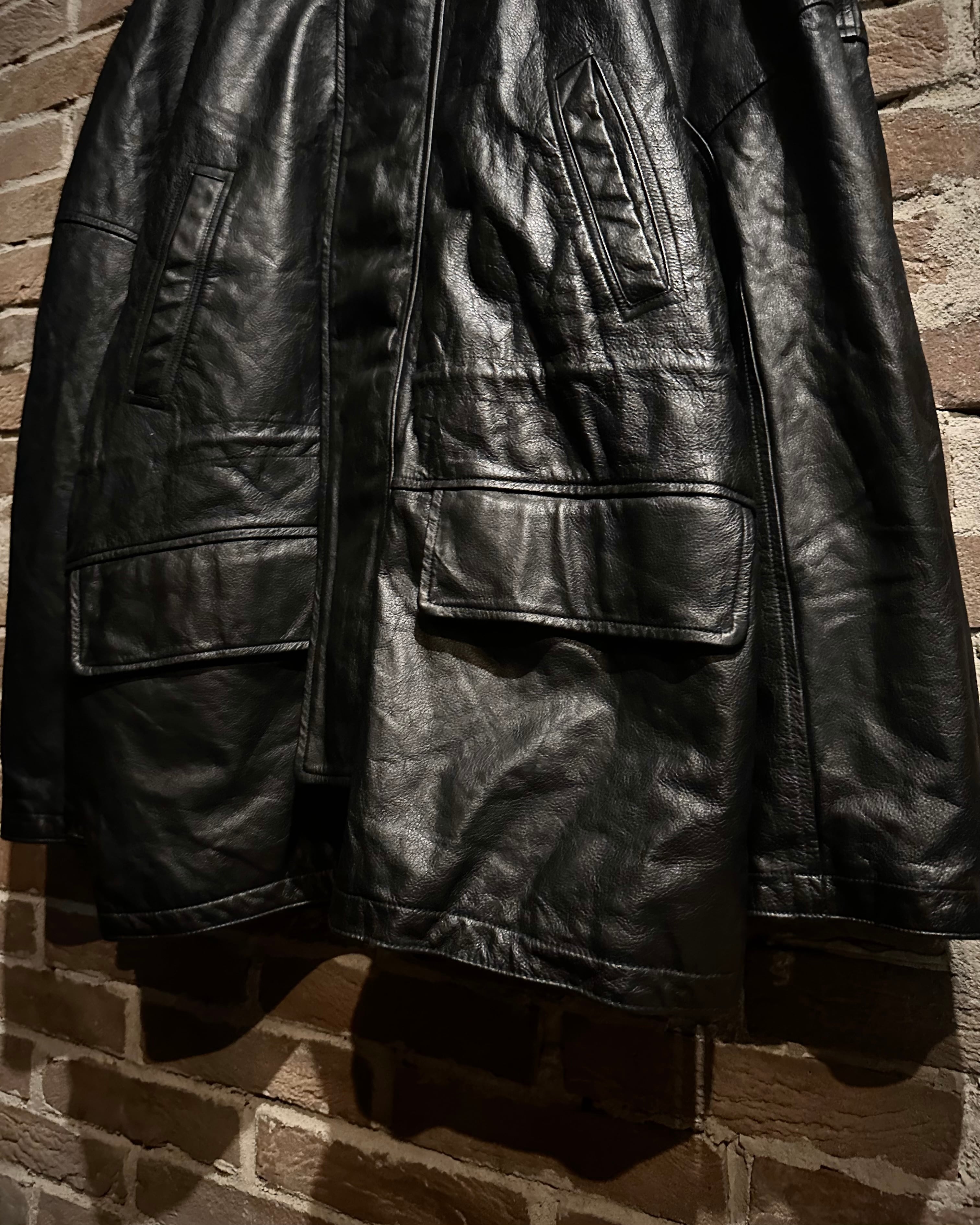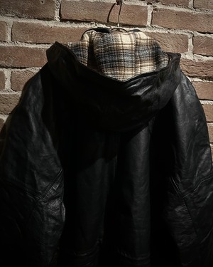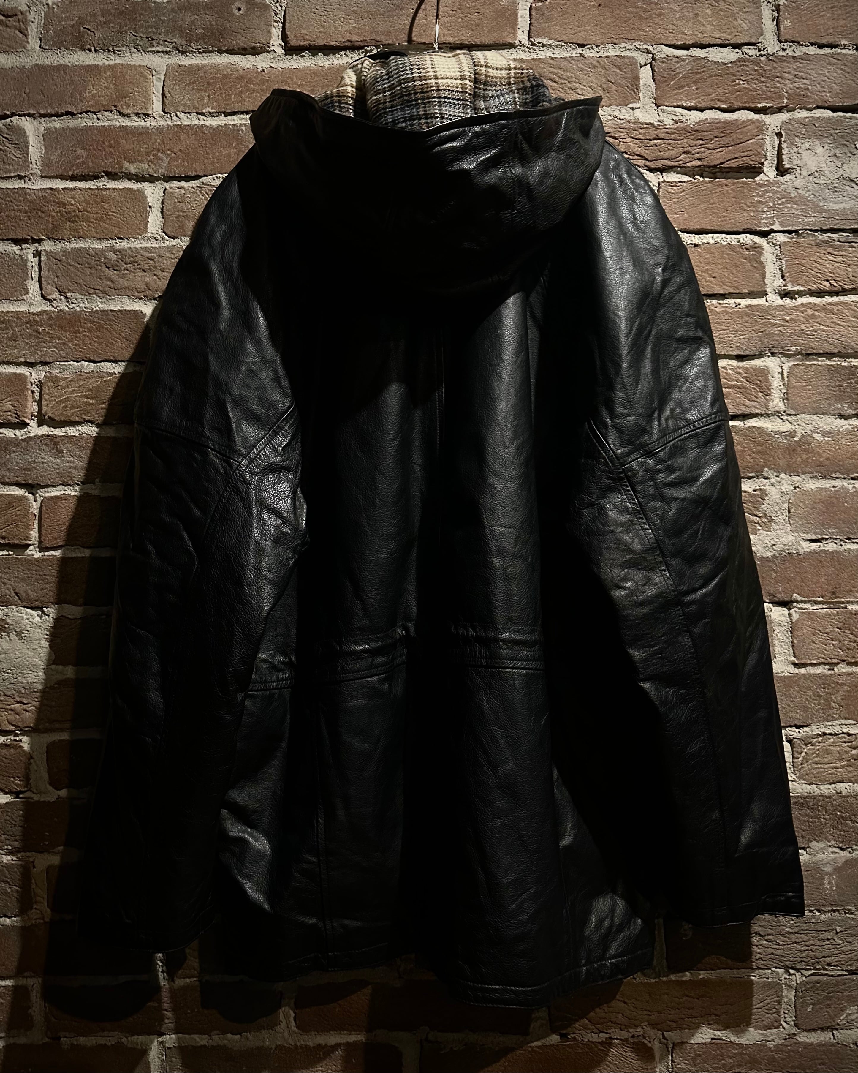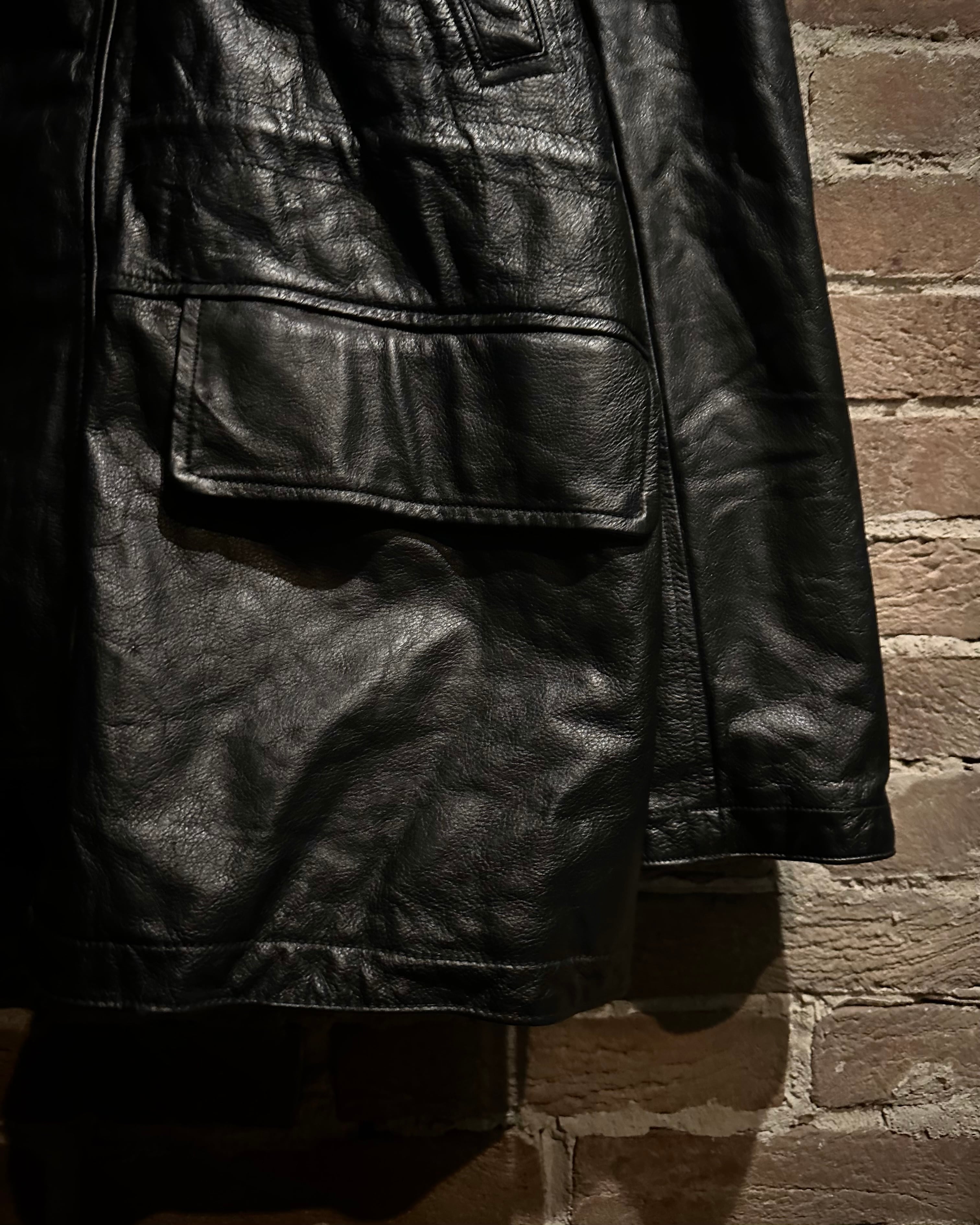 しっとりとした質感と鈍い光沢を放つブラックレザーが、重厚感と品格を両立。フード部分は着脱可能仕様となっており、スタンドカラーとしても着用できます。