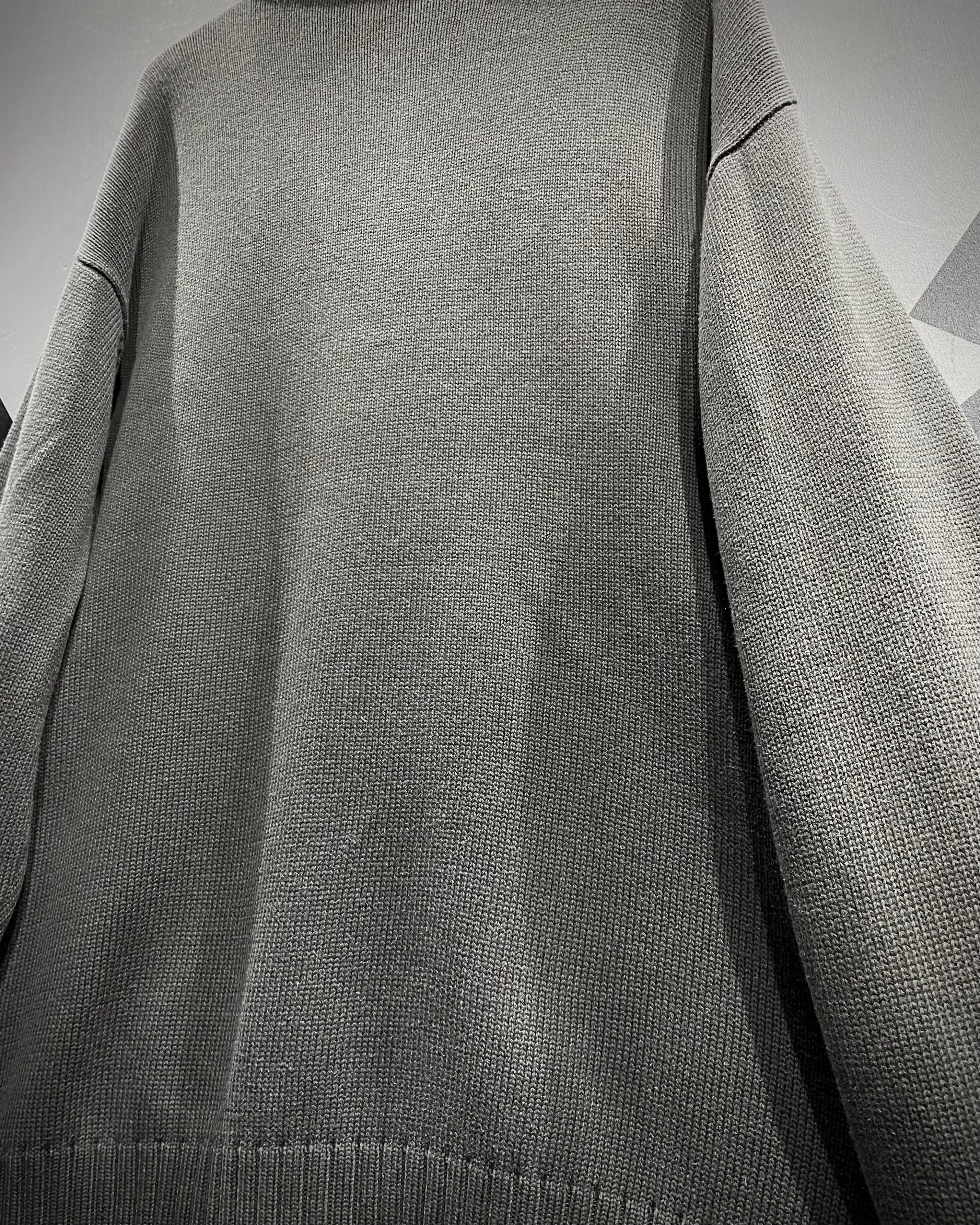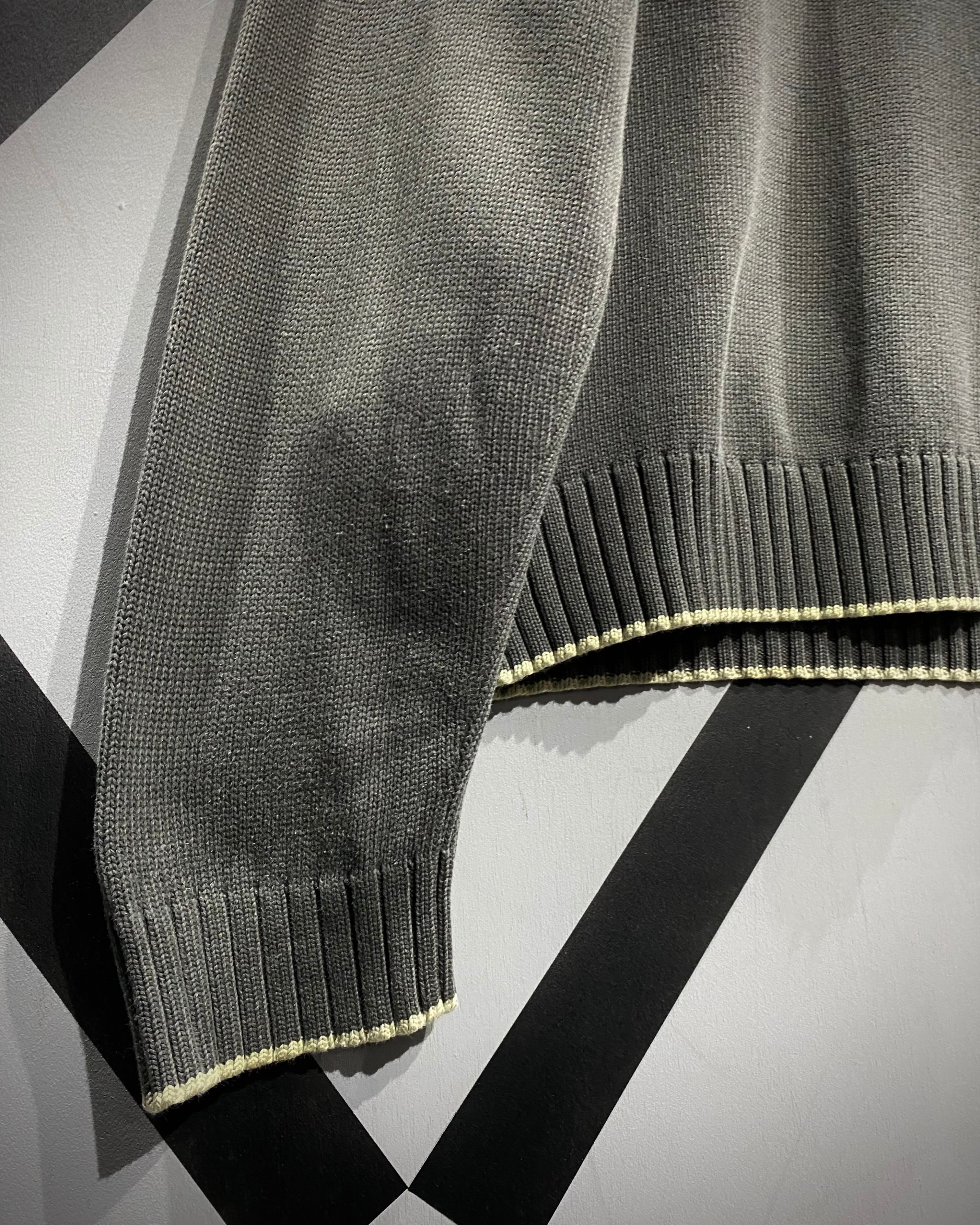 深みあるグレートーンに、胸元のオレンジの刺繍ロゴが映える絶妙な配色バランスが魅力で、ネック部分にはリブ編みを大胆に切り替え、首元までしっかり立ち上がるハーフジップ仕様。ジップを開けることで抜け感を作り、閉じればモードな印象に切り替わる、2WAY仕様のデザインが光ります。