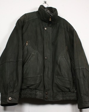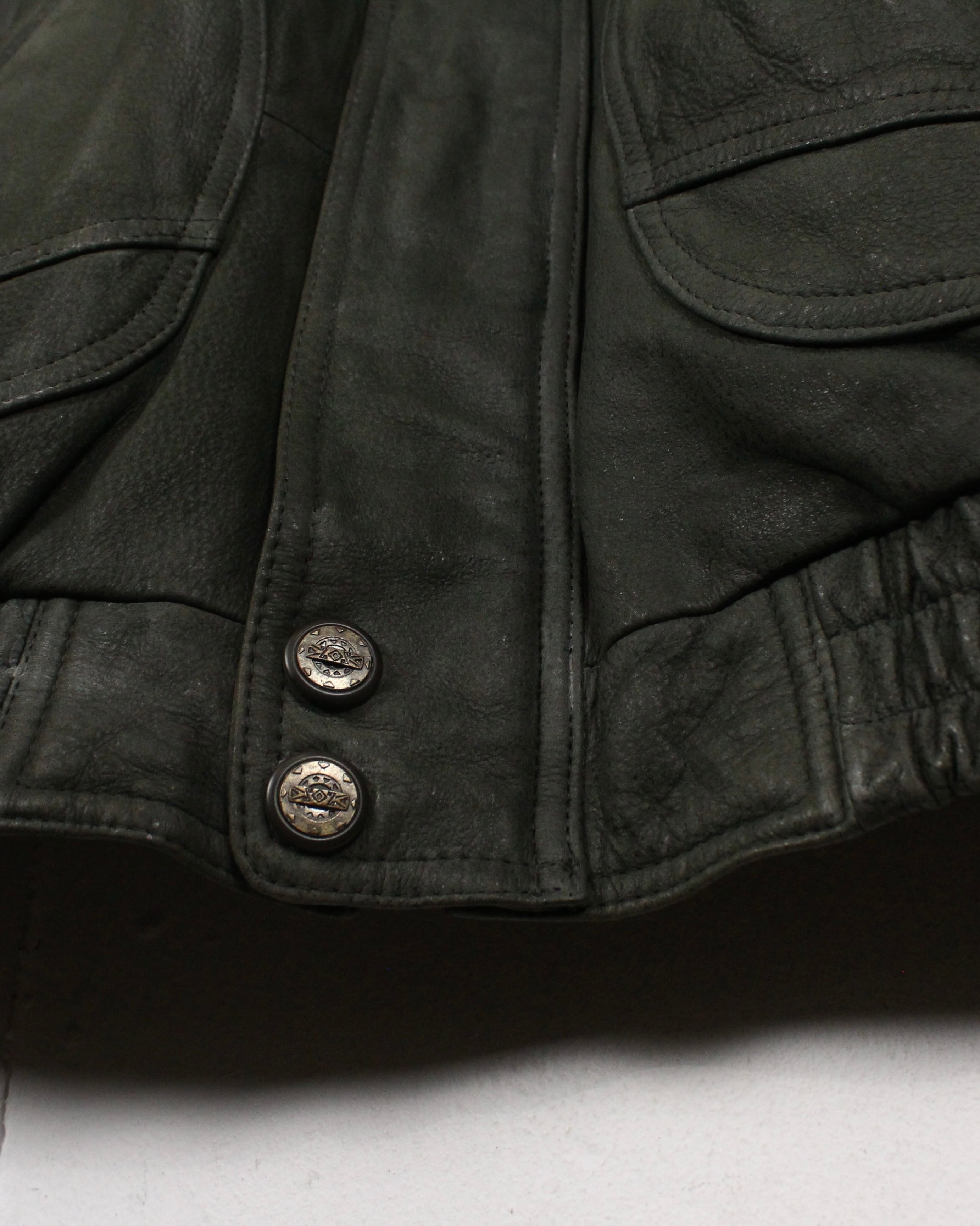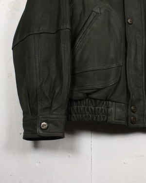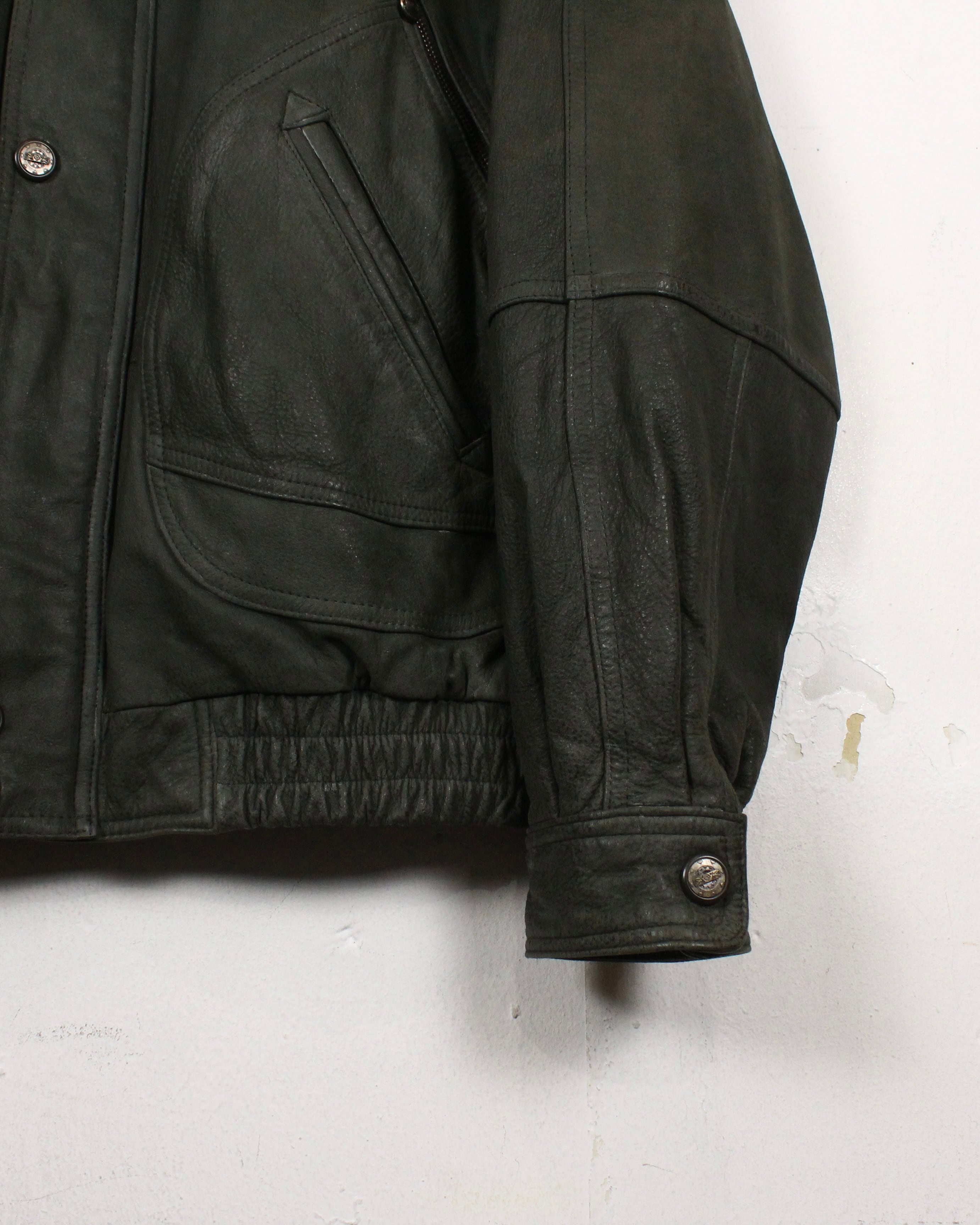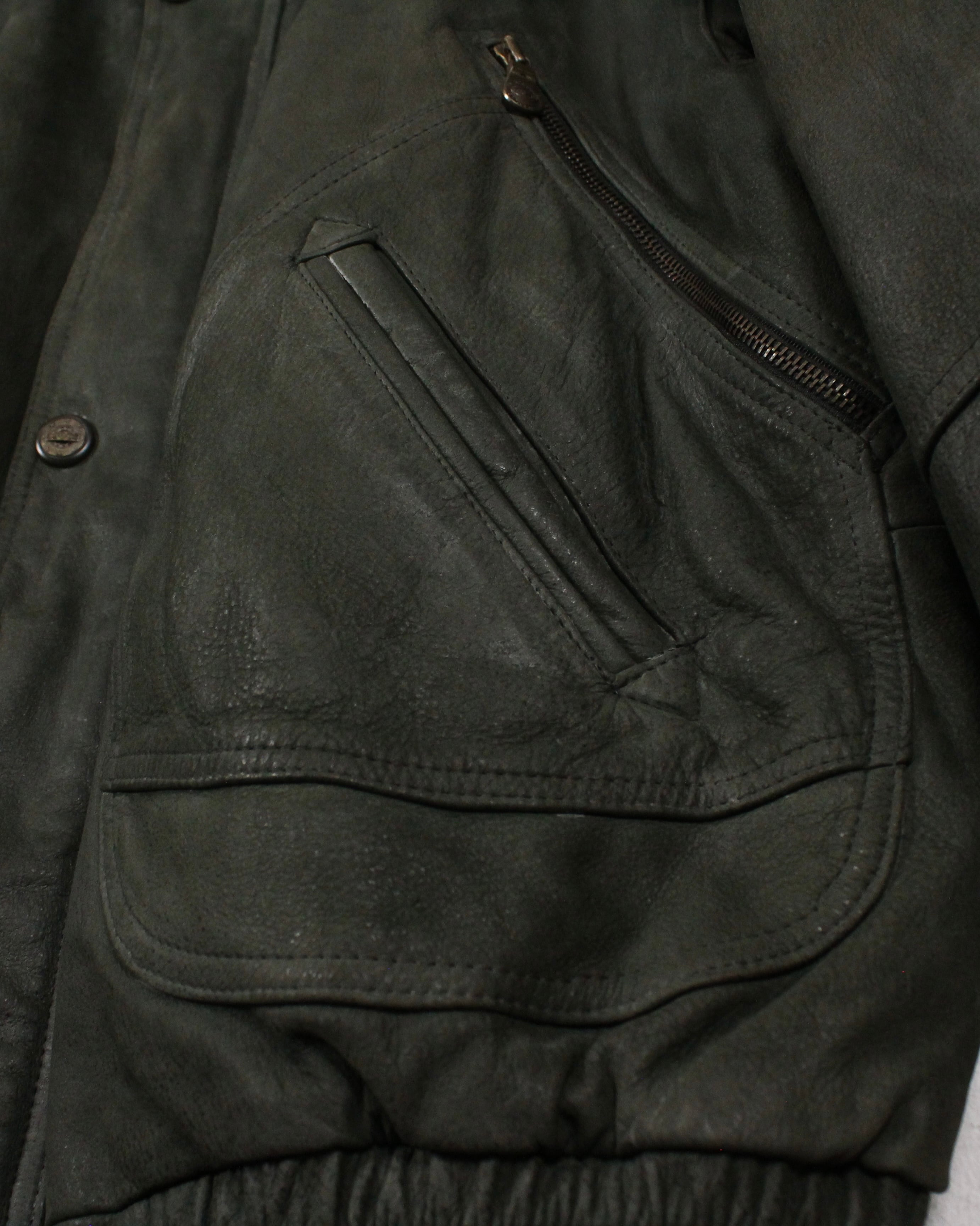 上質なレザー特有の重量感と鈍い光沢を放つ、深みのあるダークグリーンが魅力的なレザーボンバージャケット。