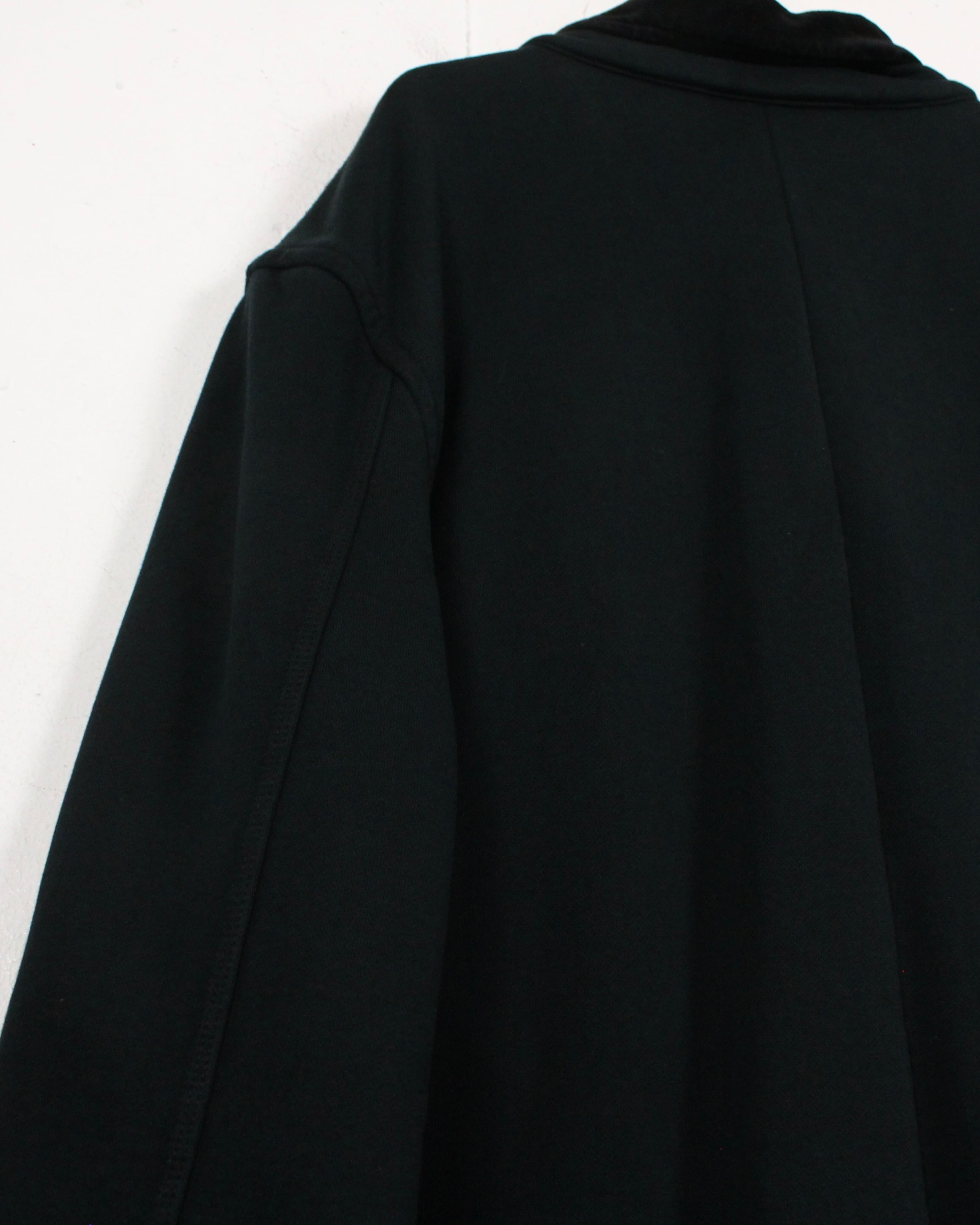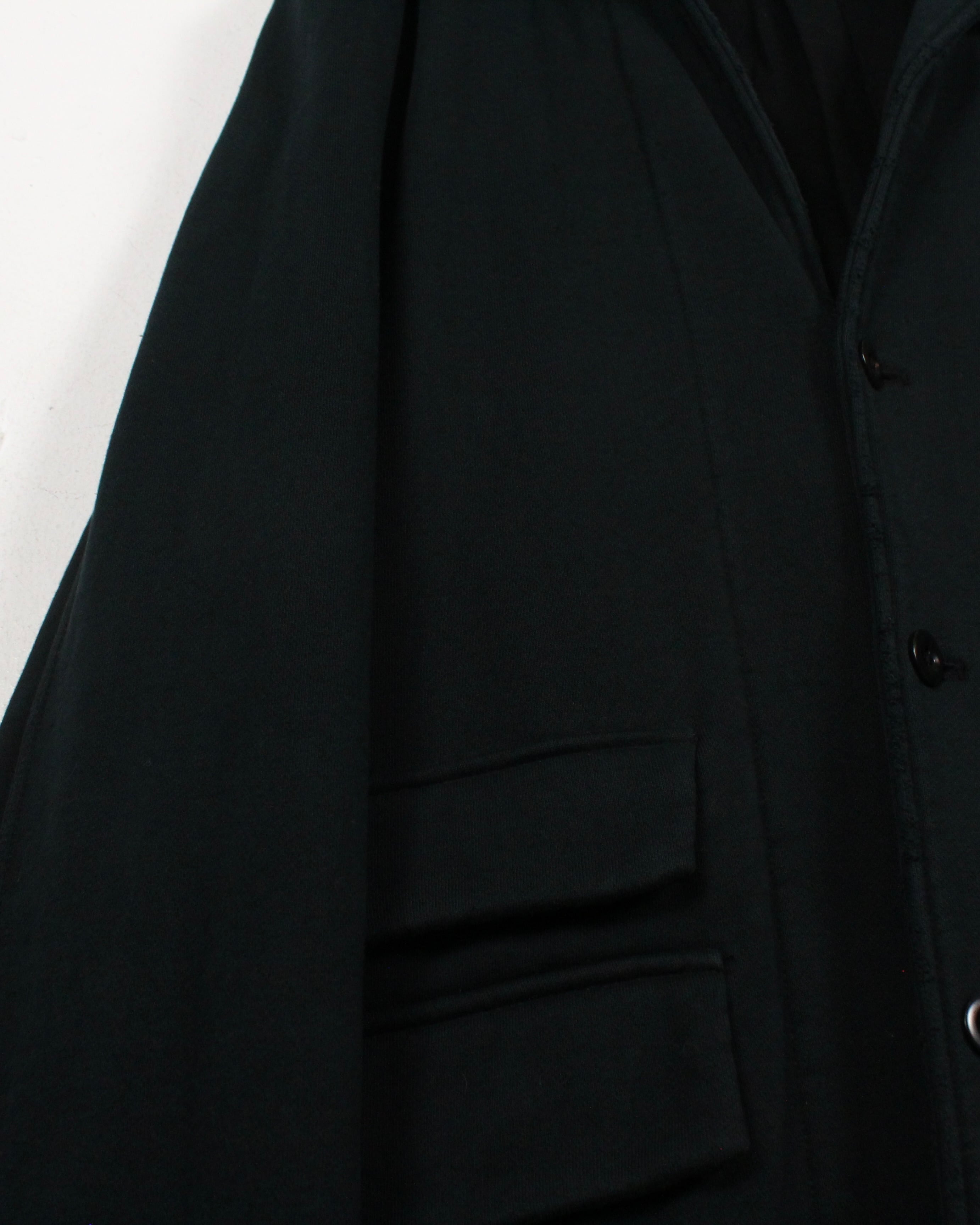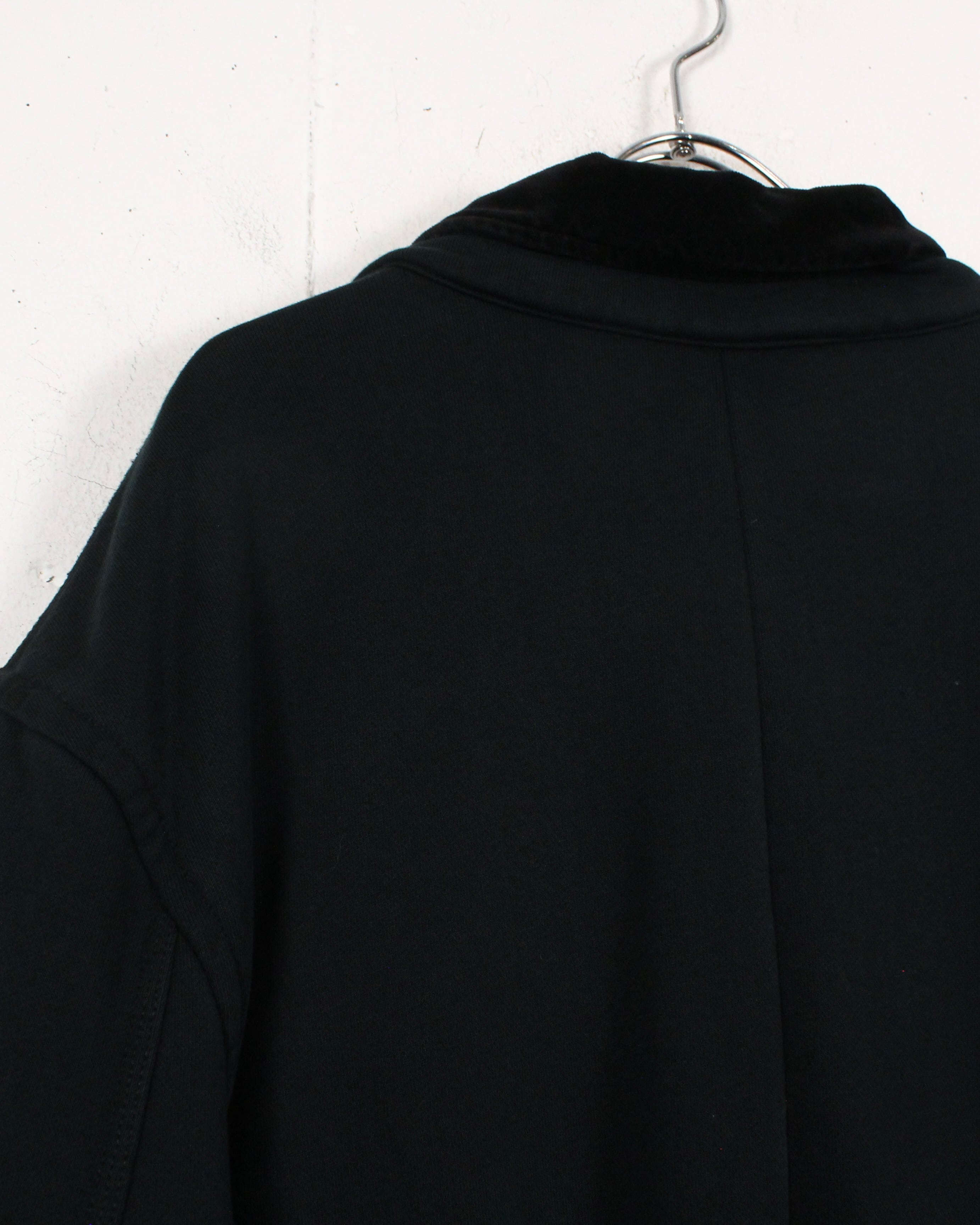 ベースには肉厚で柔らかなスウェット素材を採用し、ジャケットシルエットにスウェット特有の抜け感をプラス。襟元にはベルベット生地をあしらい、ラフな素材ながらもラグジュアリーな印象を引き立てています。