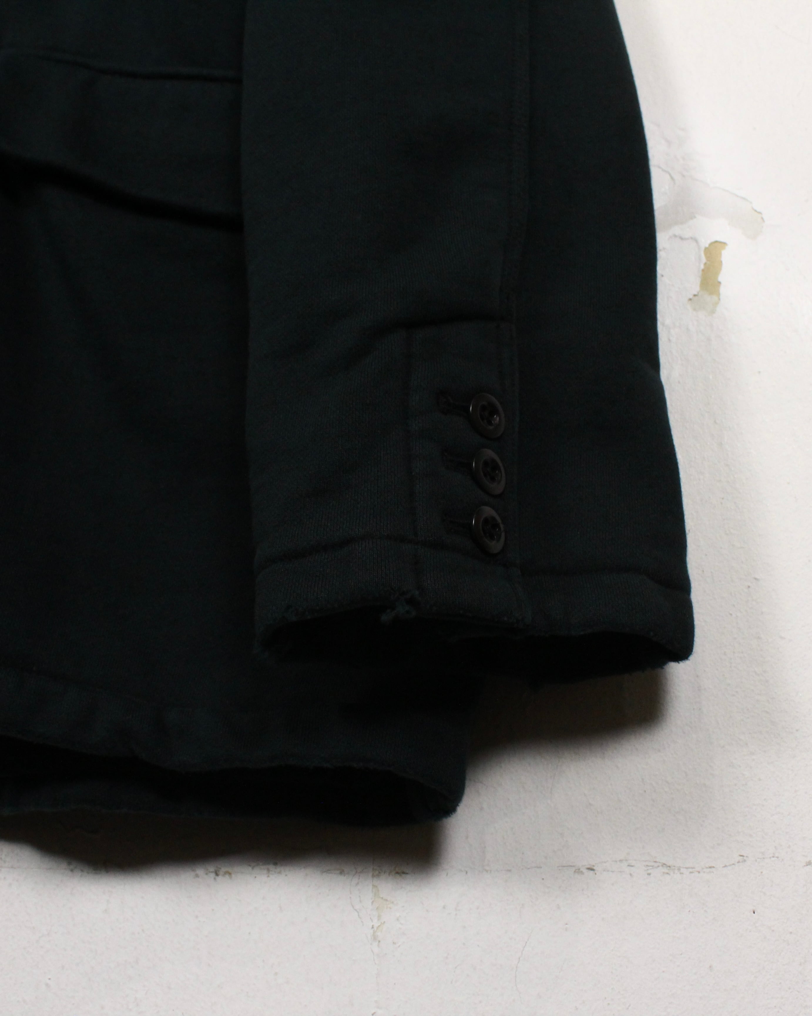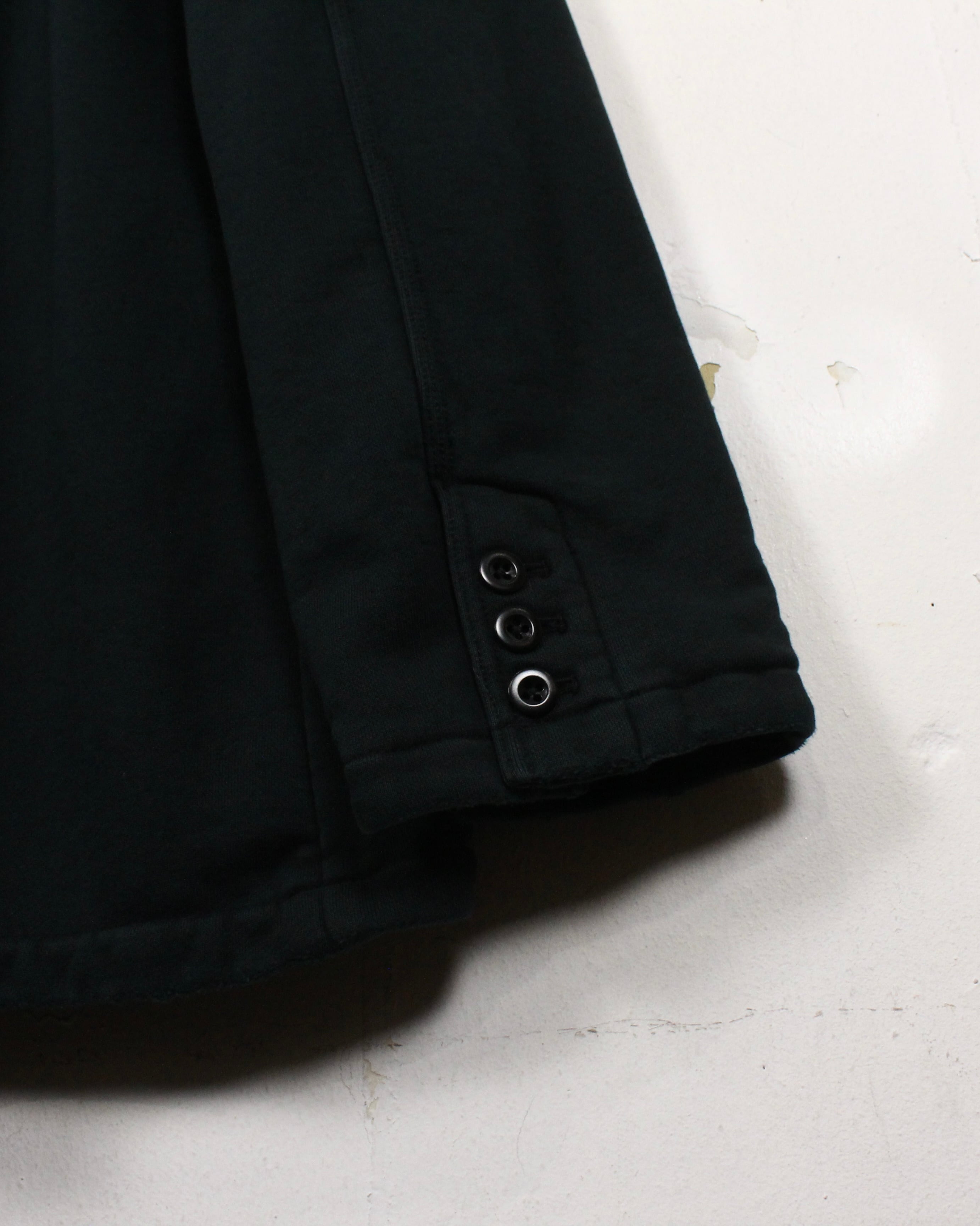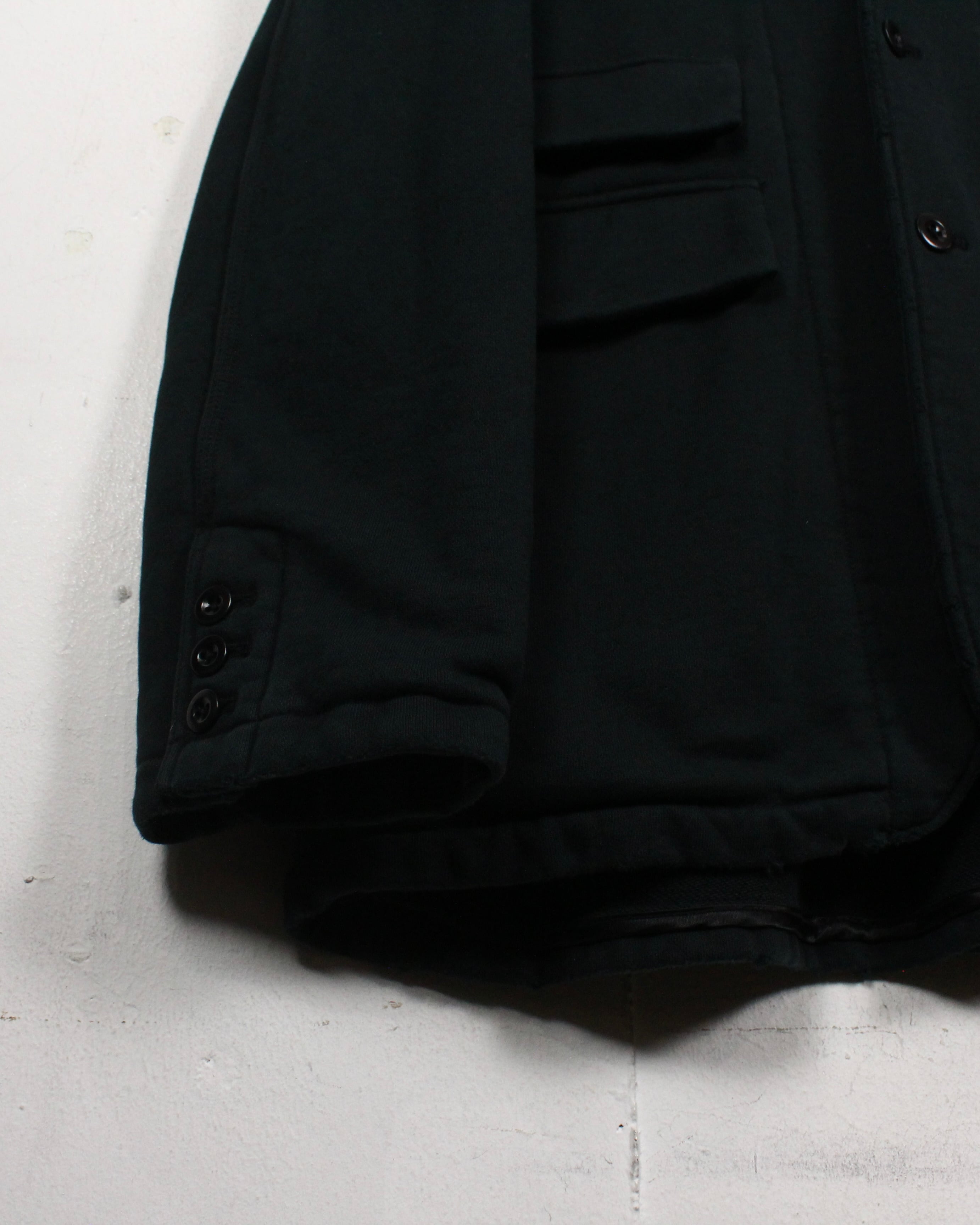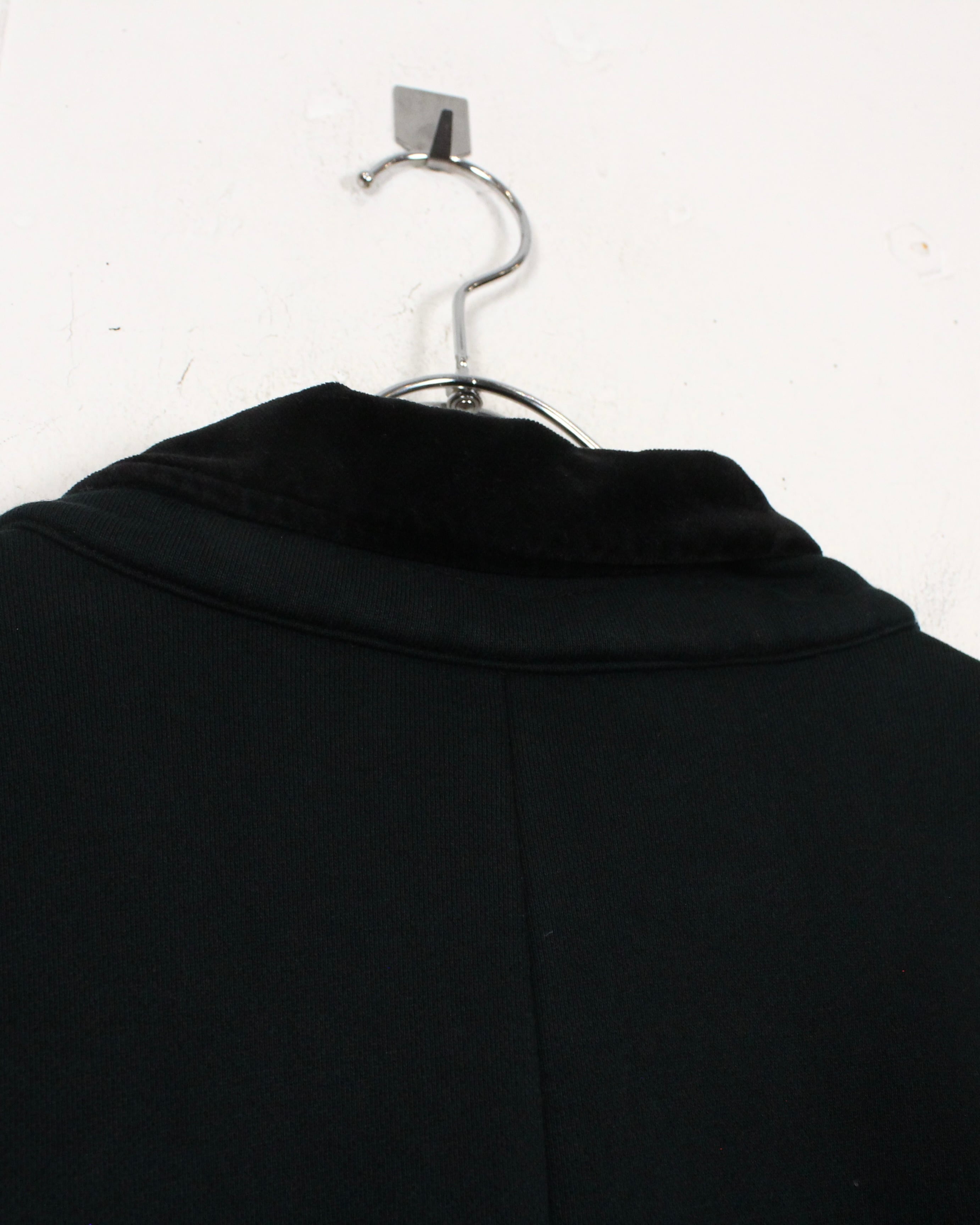 ベースには肉厚で柔らかなスウェット素材を採用し、ジャケットシルエットにスウェット特有の抜け感をプラス。襟元にはベルベット生地をあしらい、ラフな素材ながらもラグジュアリーな印象を引き立てています。