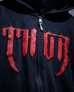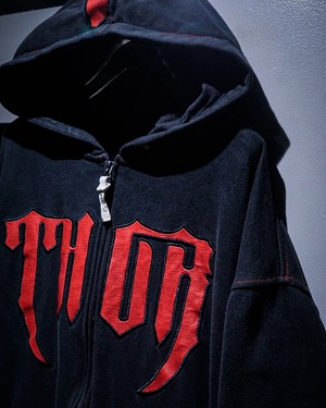 胸元に配された「THOR」ロゴのフェイクレザーパッチは、レッドの艶感と型押しによる立体感が強烈なインパクトを放ち、ブラックのスウェット地とのコントラストが見事なバランスで落とし込まれています。