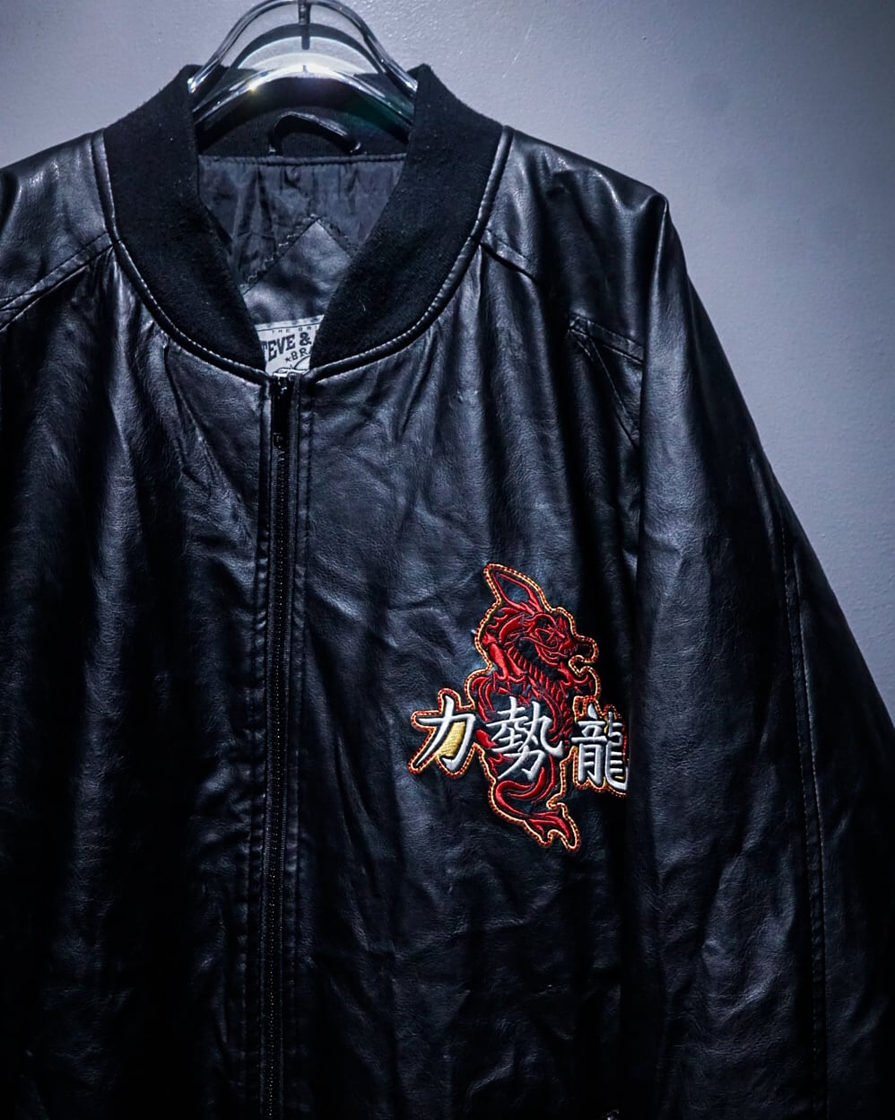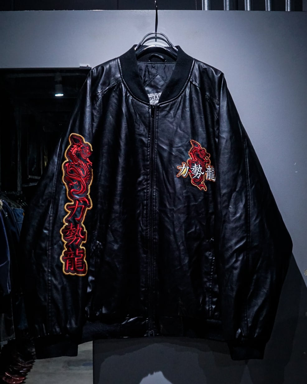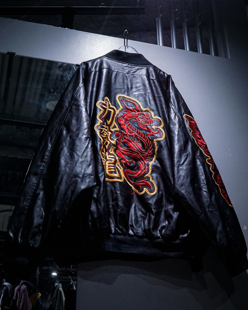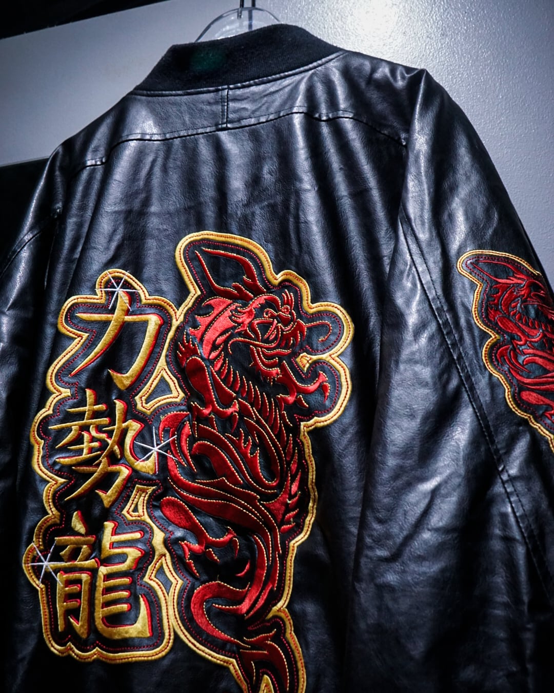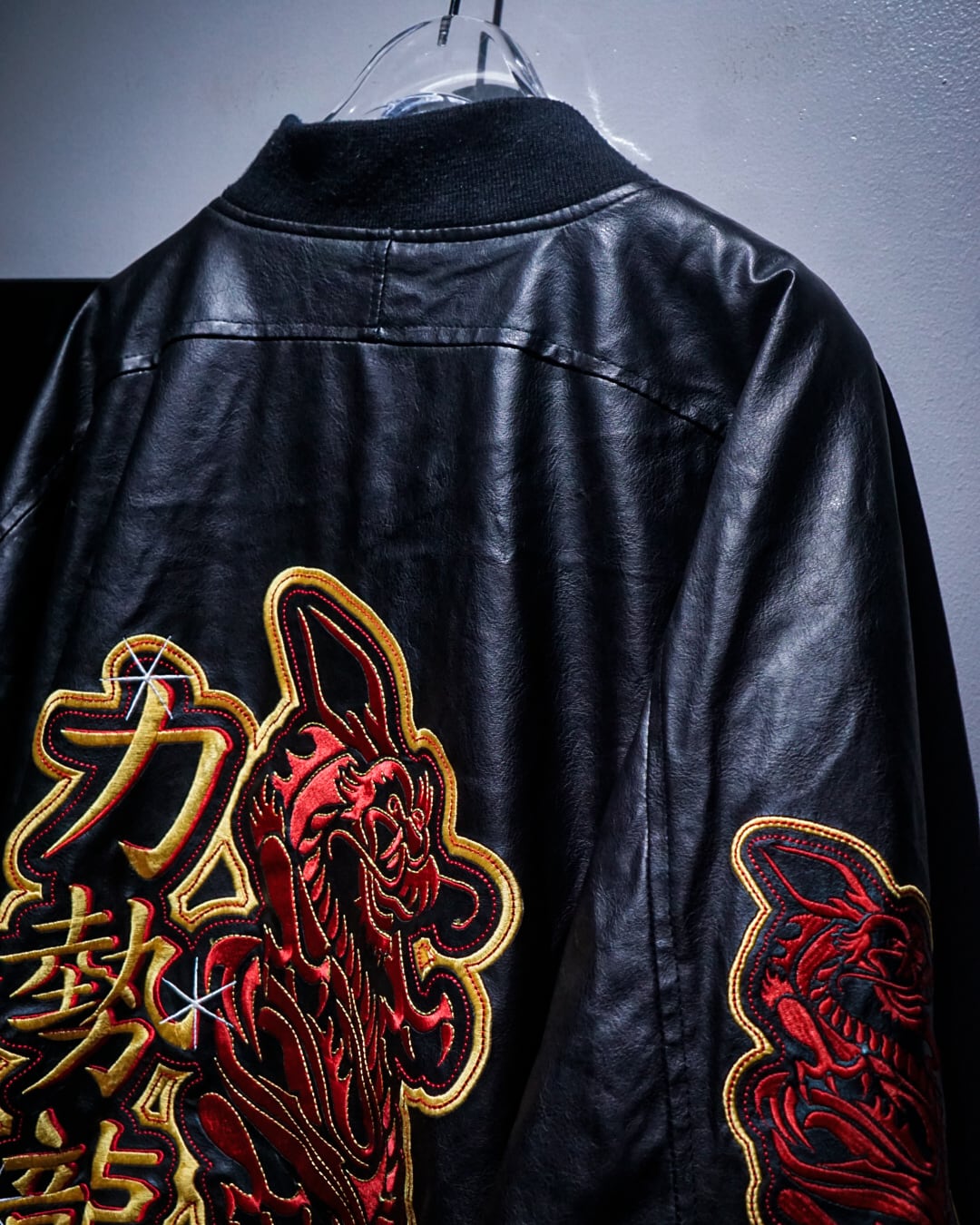 艶感あるブラックフェイクレザーをボディに使用し、フロント、スリーブ、背面にかけて大胆な龍の刺繍を落とし込んだボンバージャケット。