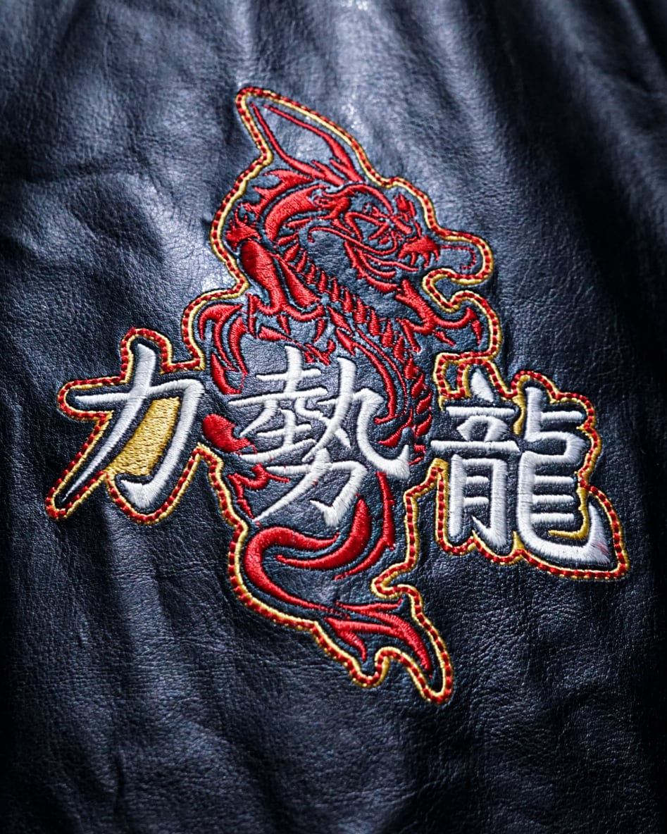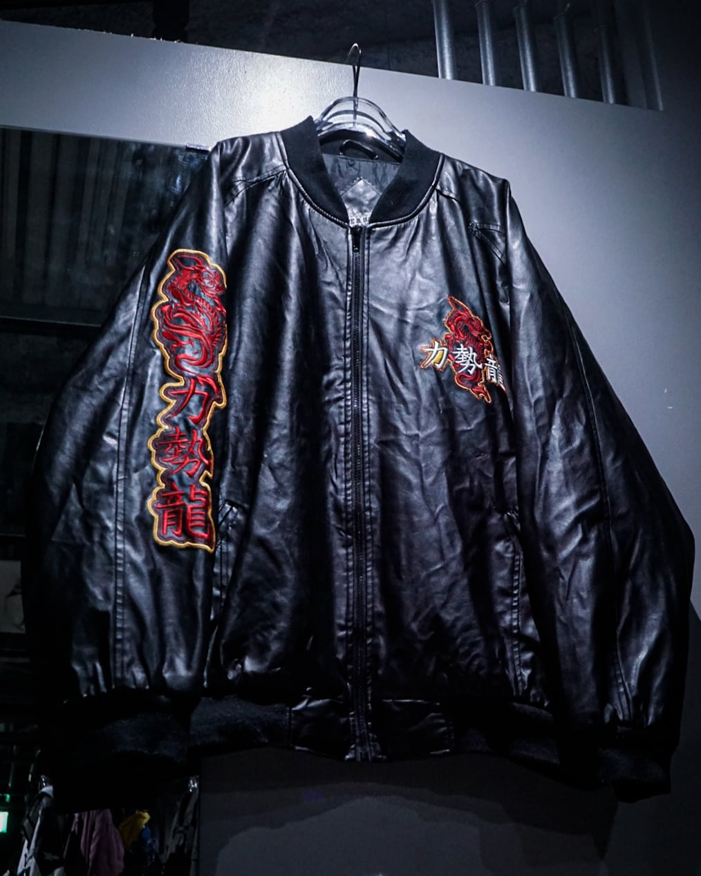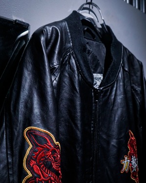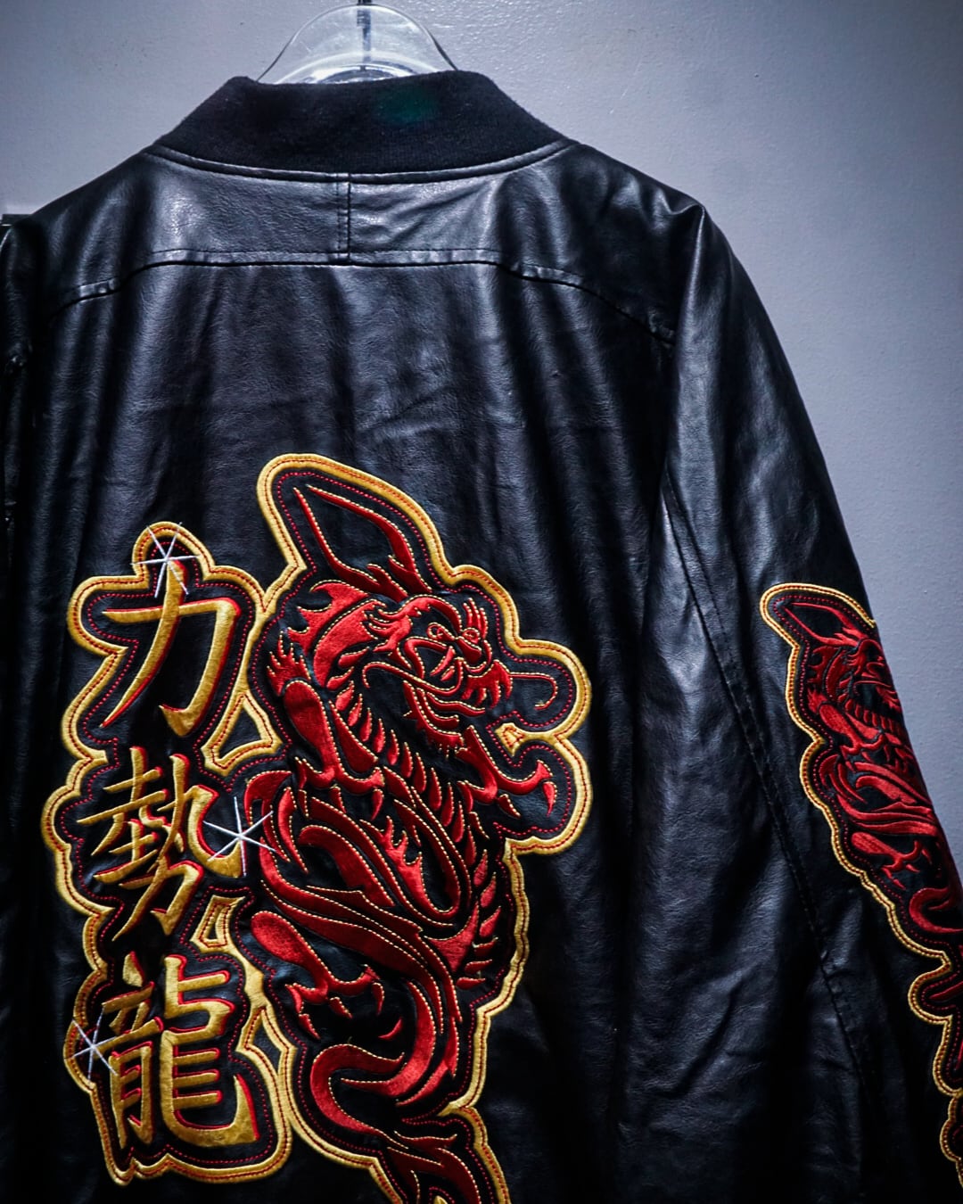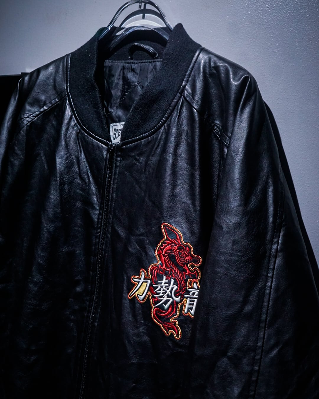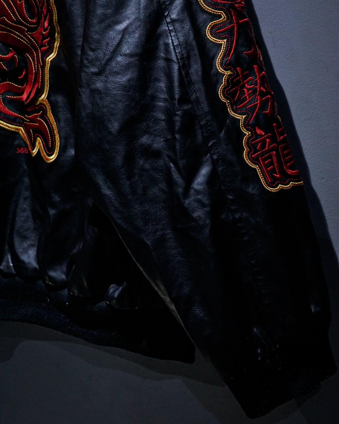 艶感あるブラックフェイクレザーをボディに使用し、フロント、スリーブ、背面にかけて大胆な龍の刺繍を落とし込んだボンバージャケット。