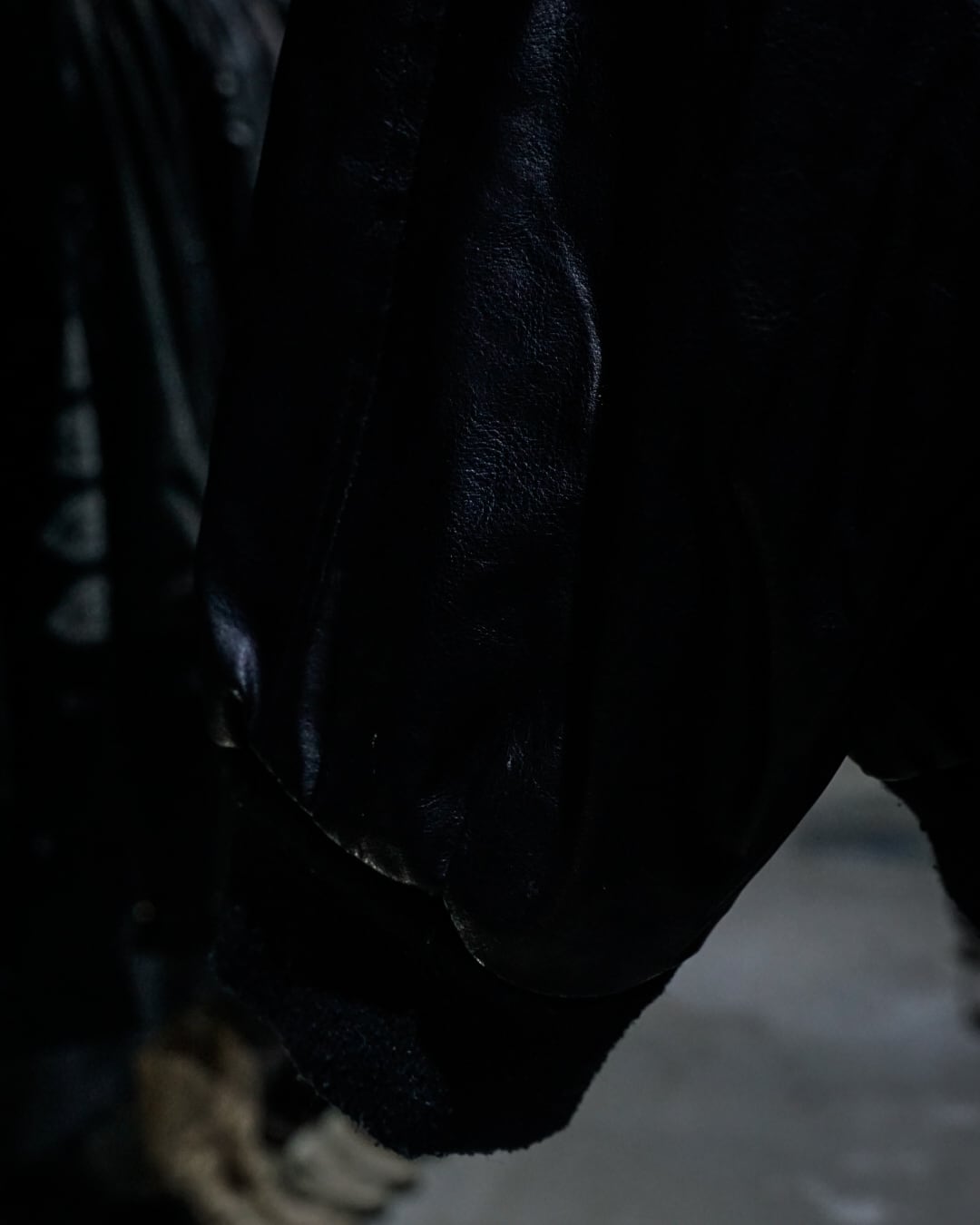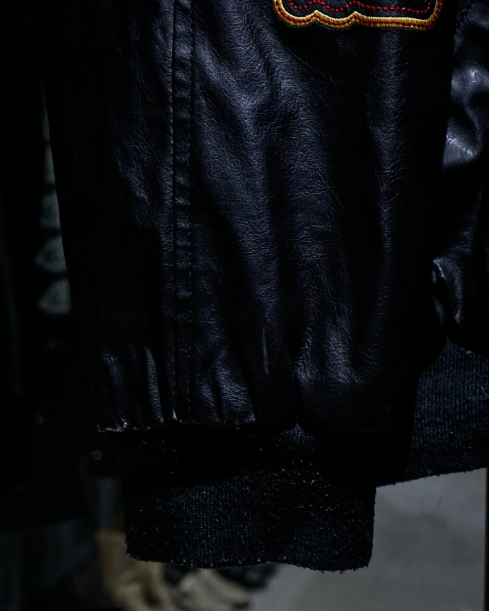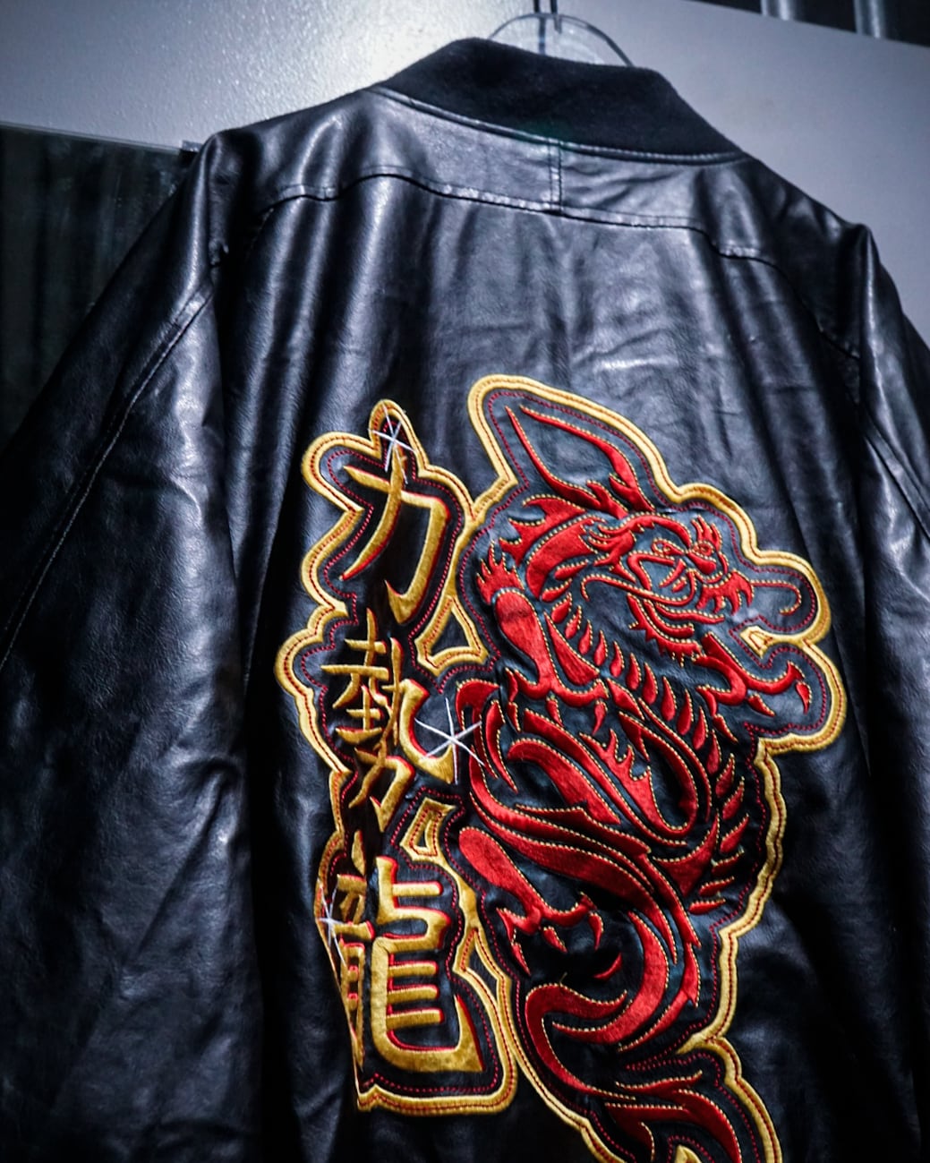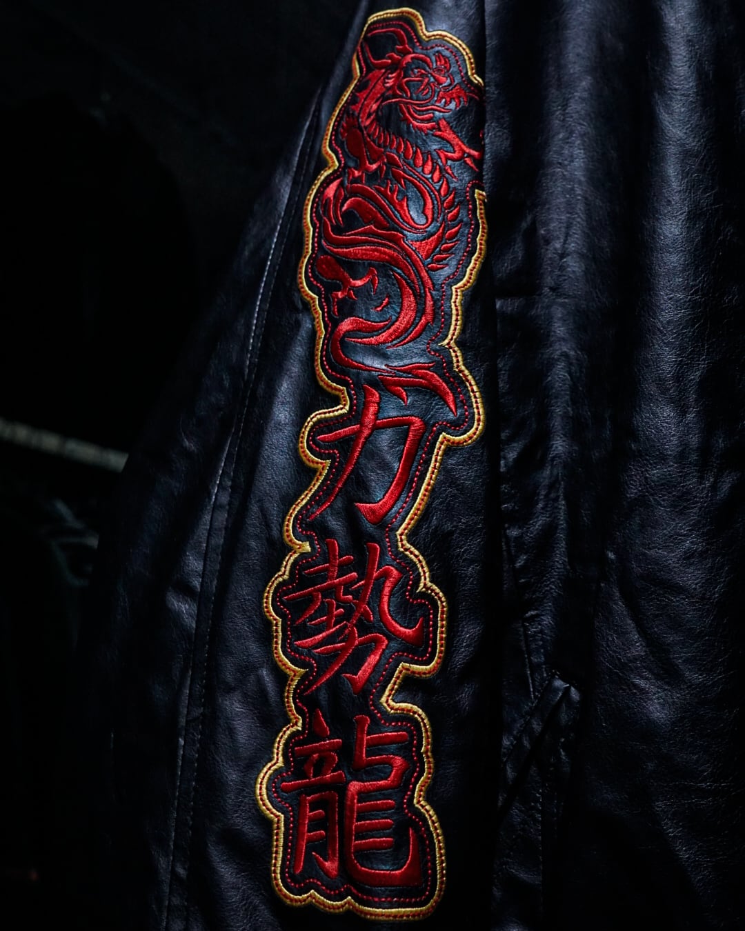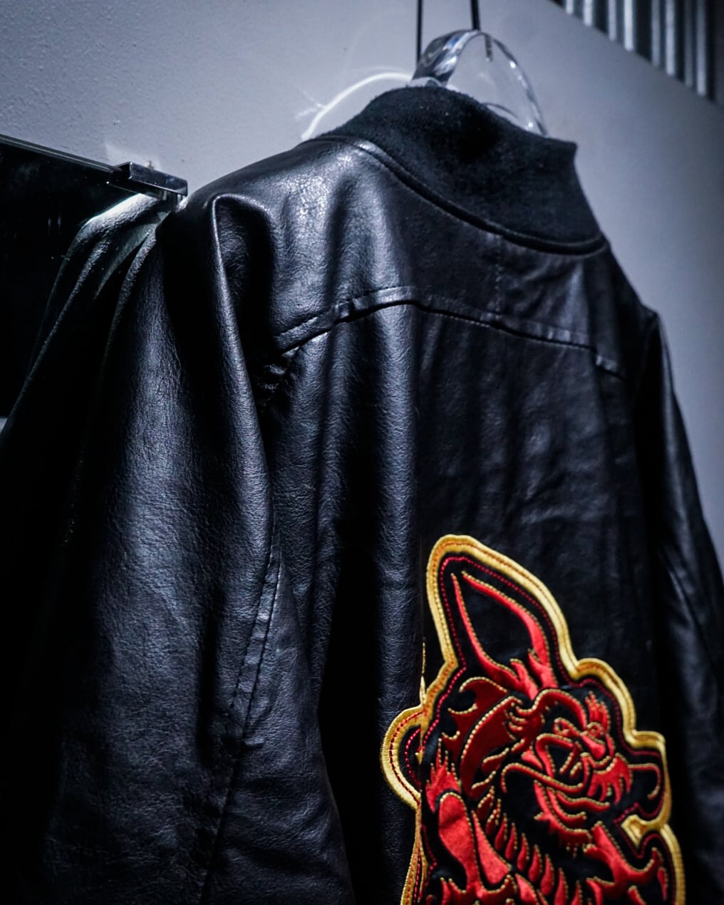 艶感あるブラックフェイクレザーをボディに使用し、フロント、スリーブ、背面にかけて大胆な龍の刺繍を落とし込んだボンバージャケット。