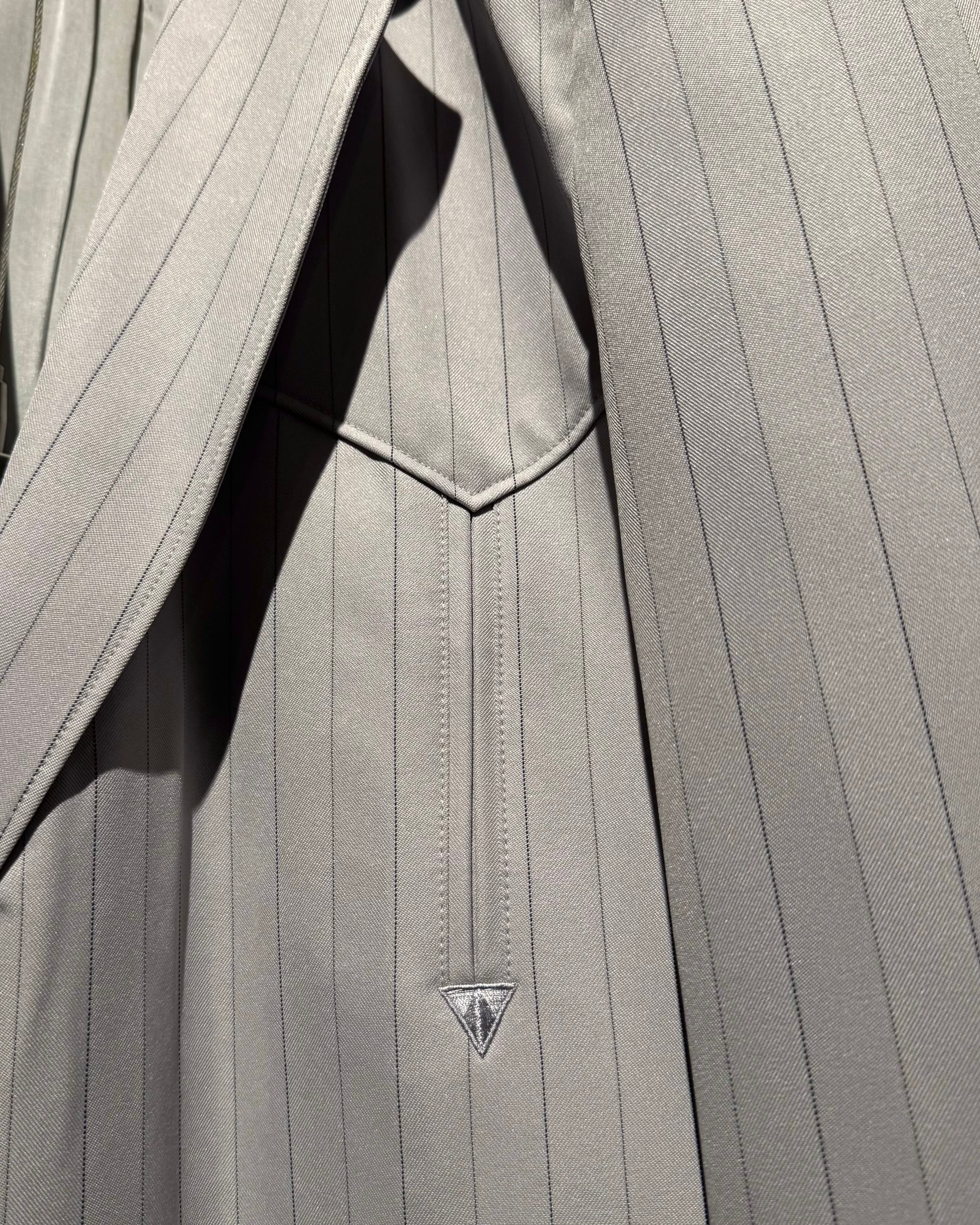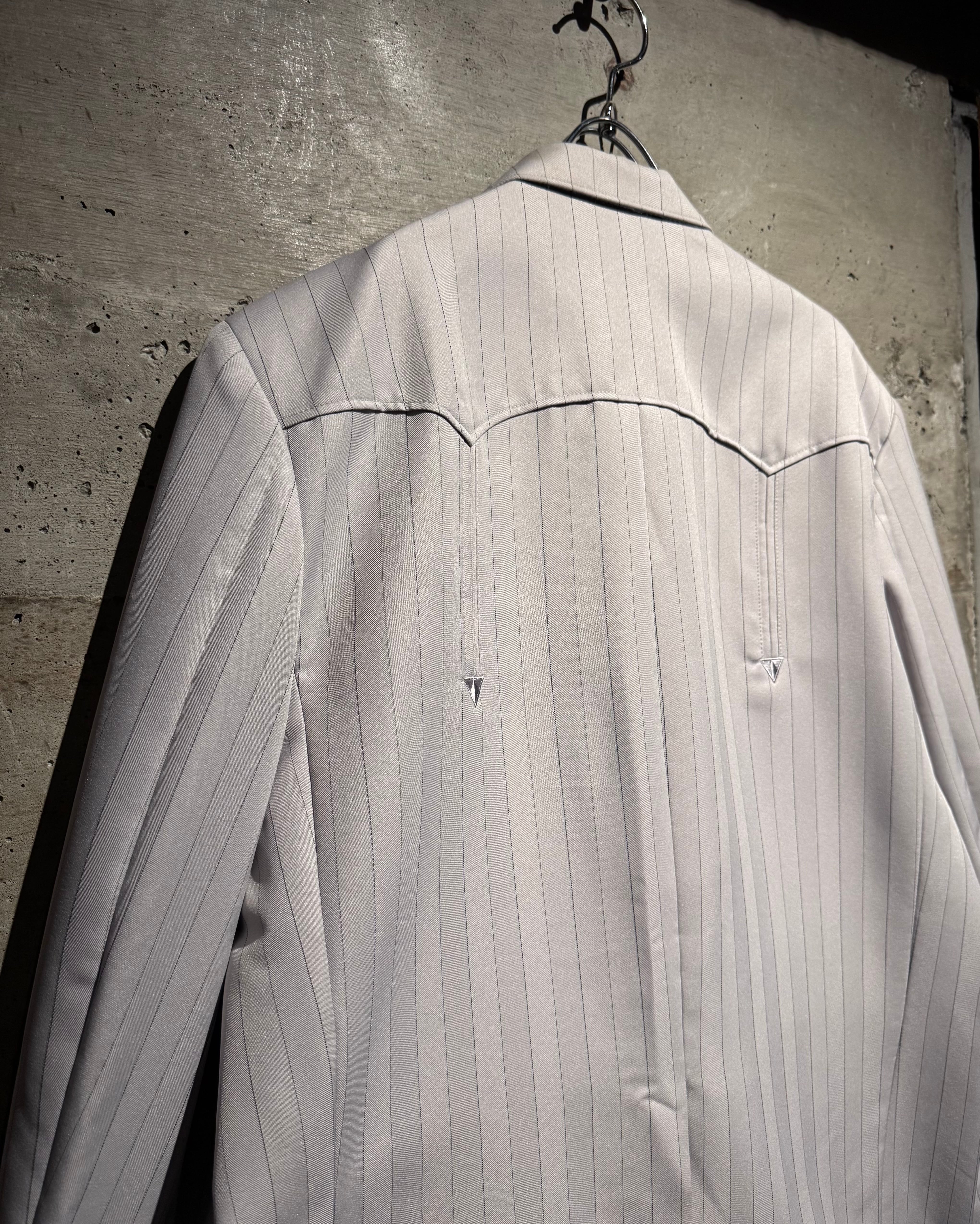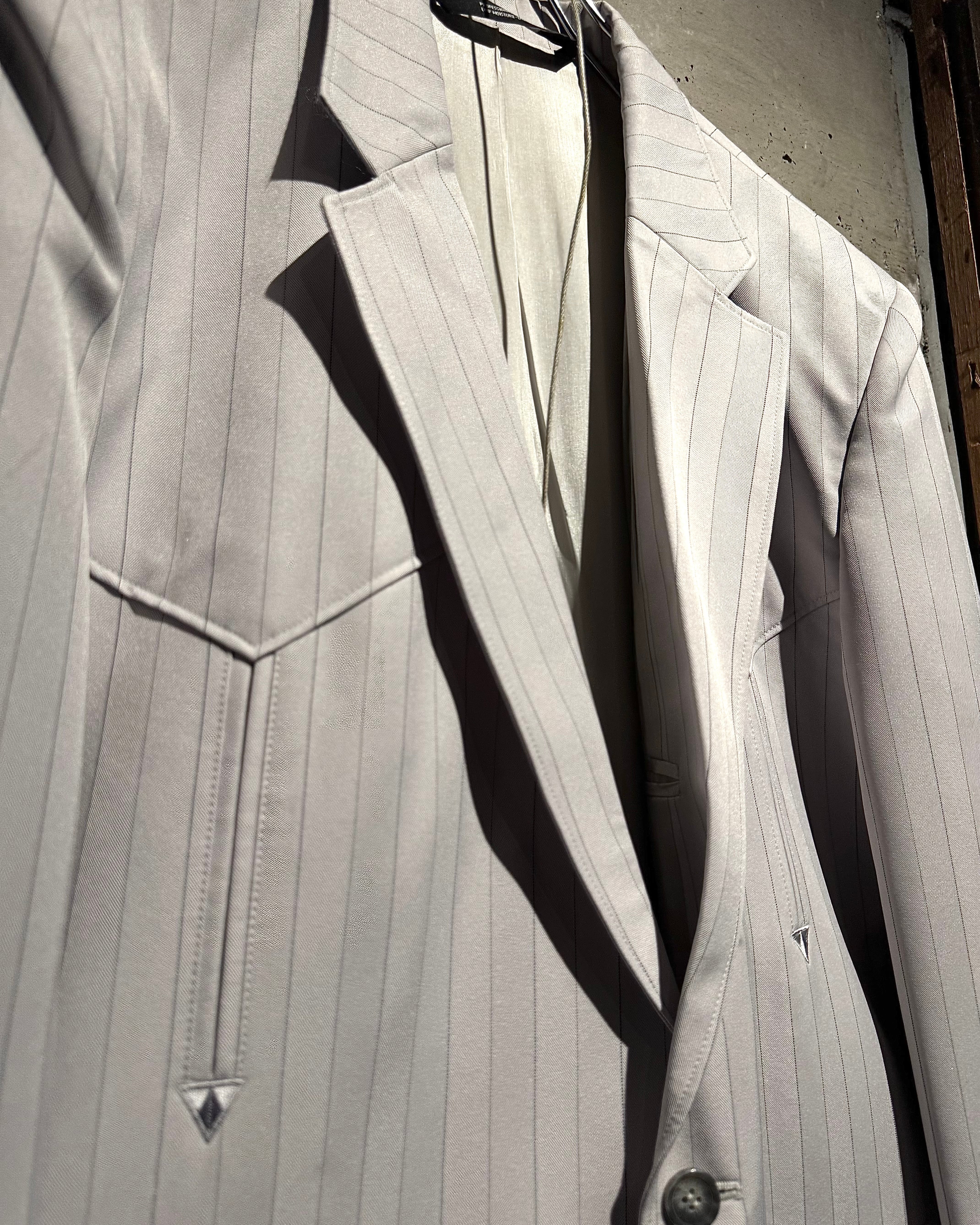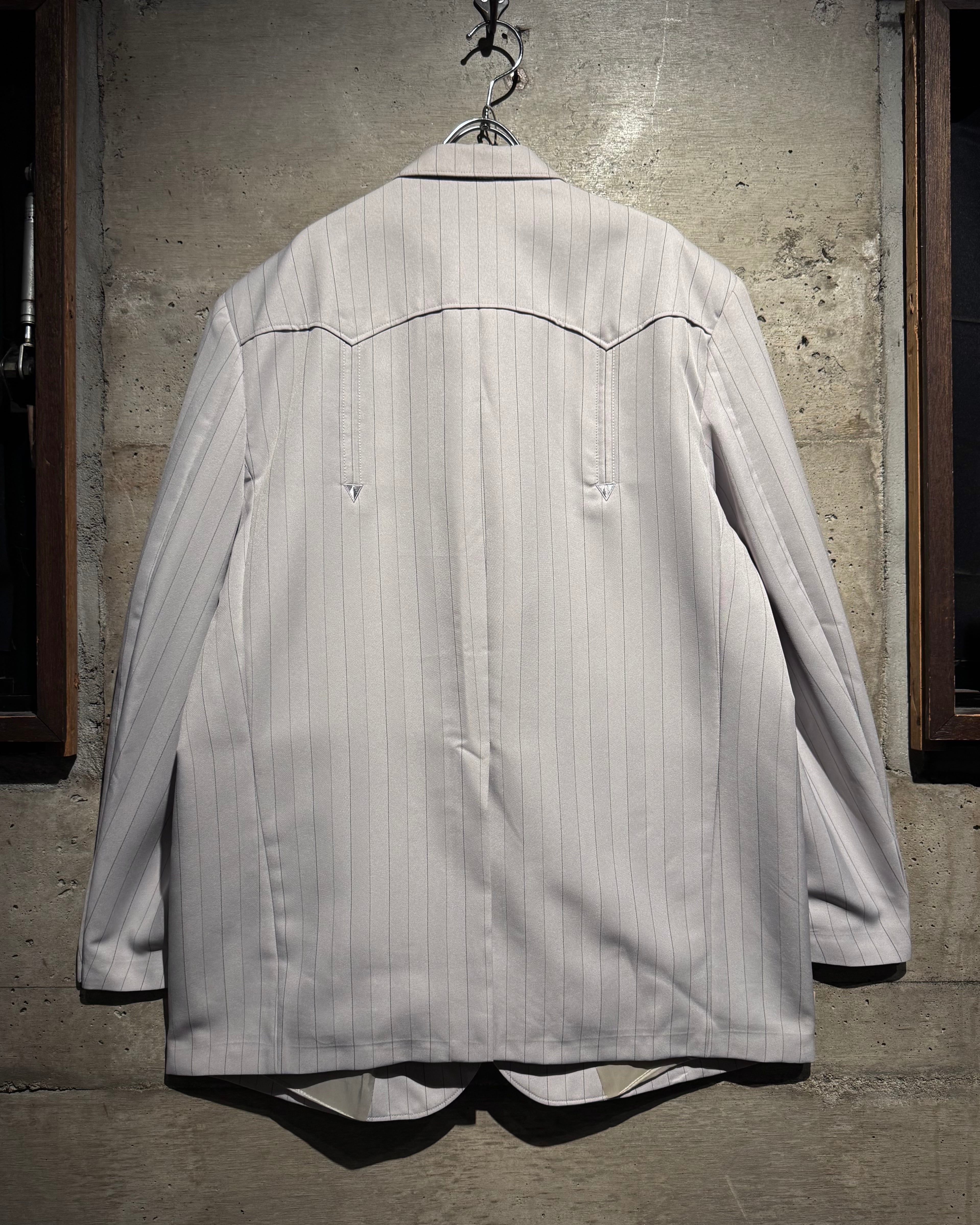 クラシックなテーラードをベースに、ヨーク切り替えやアーチを描いたフラップポケットなど、ウエスタンならではのディテールをON。ワイドラペルとスクエアショルダーが特徴で、程よいハリのある生地感がシルエットを美しく際立たせています。