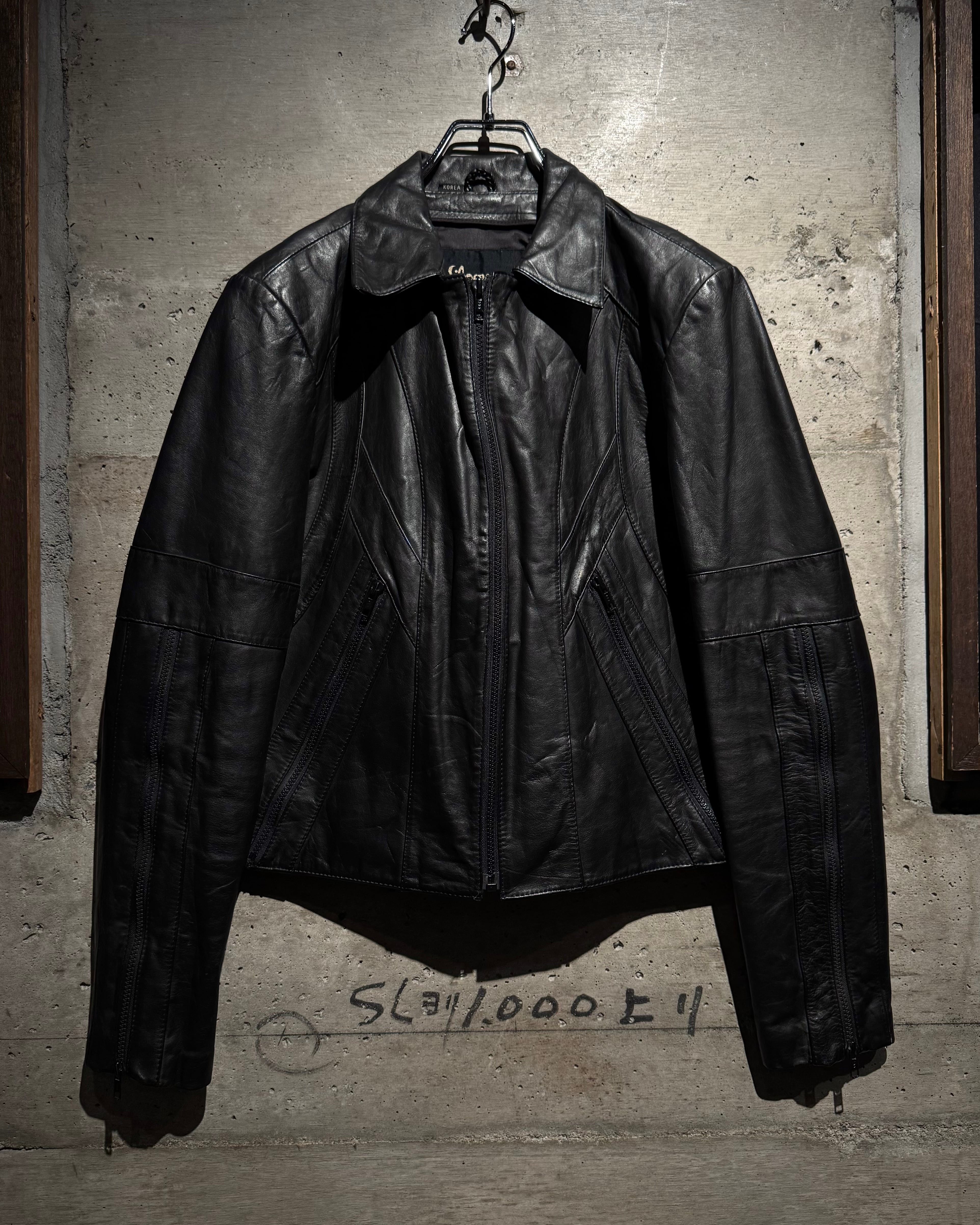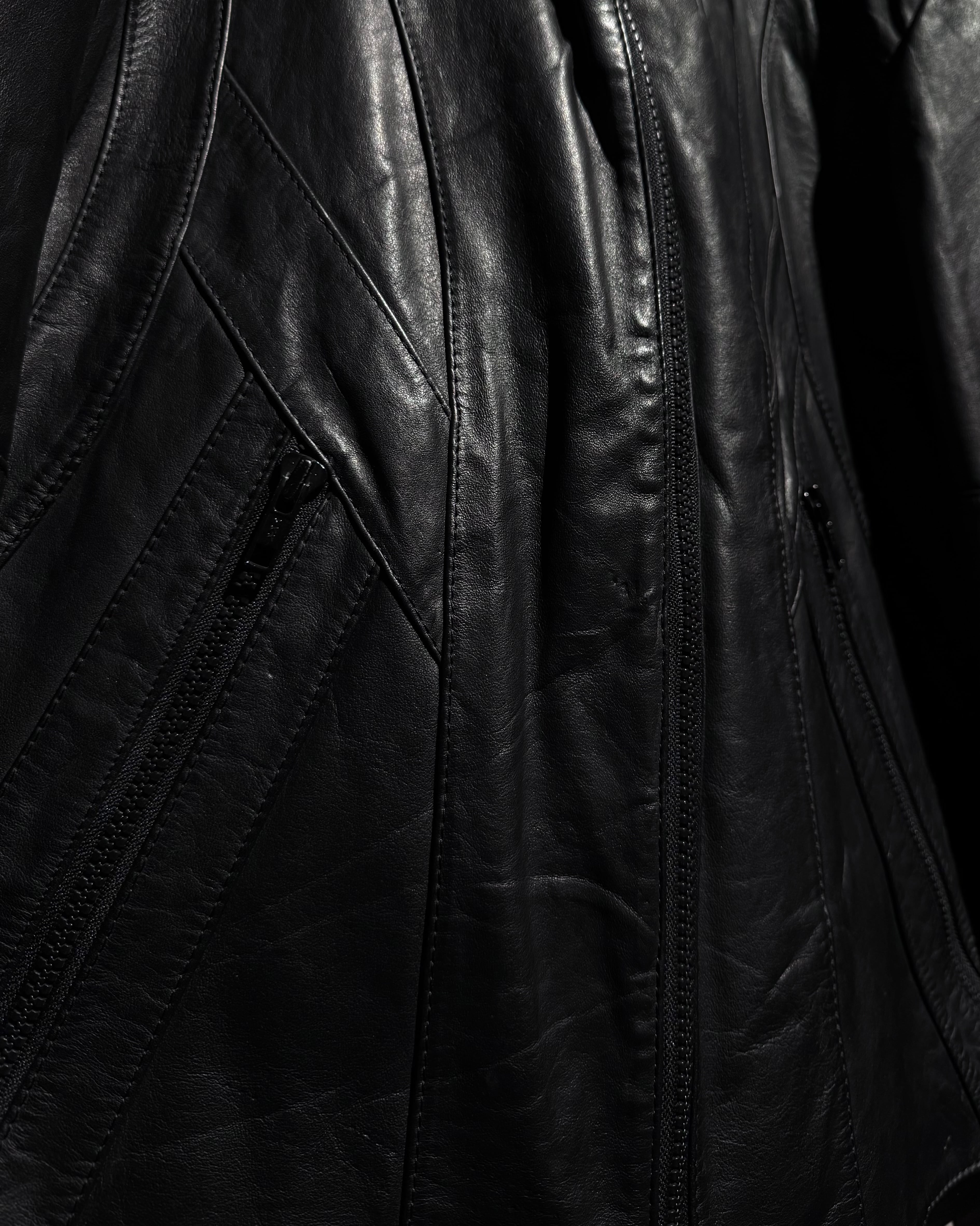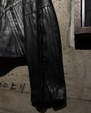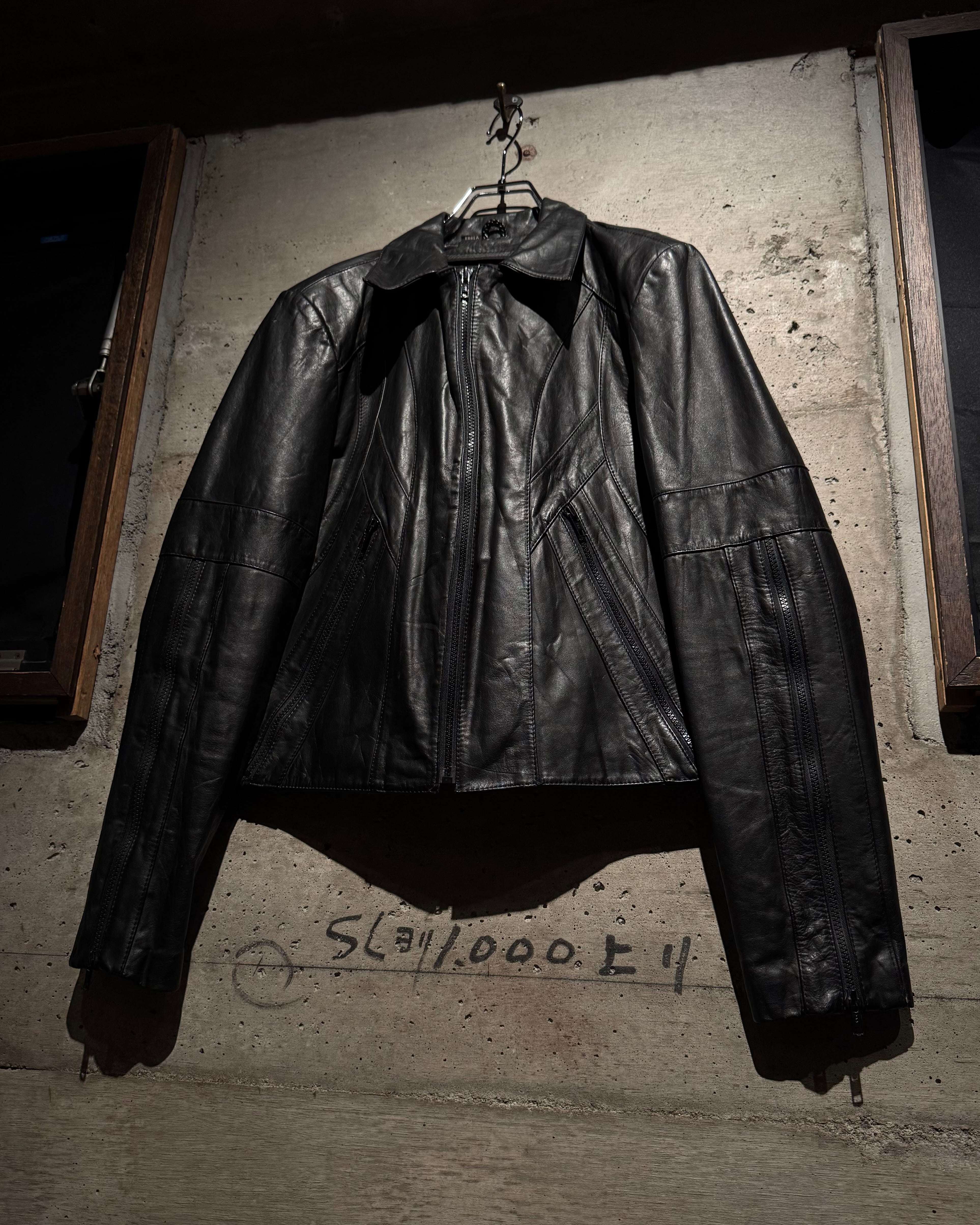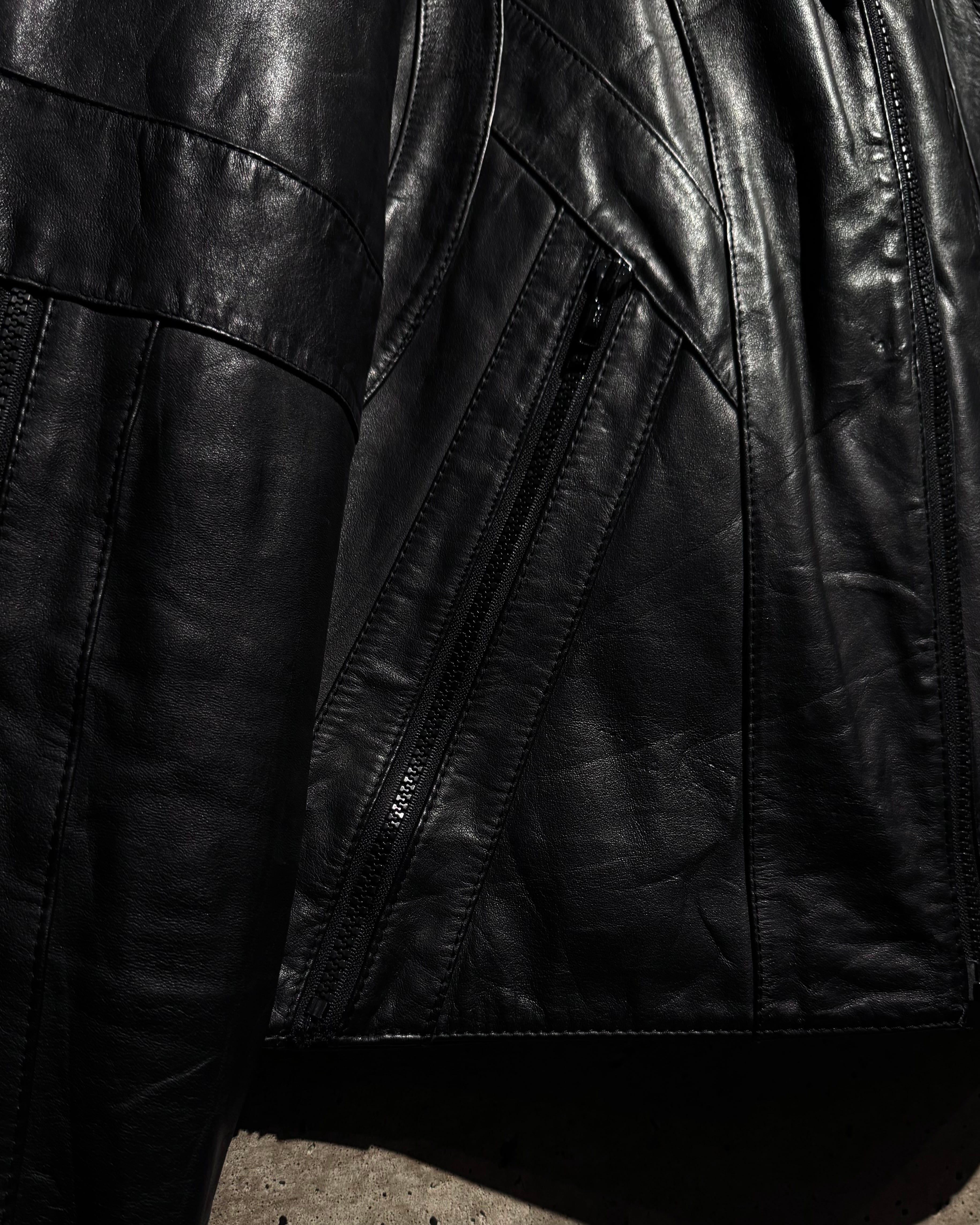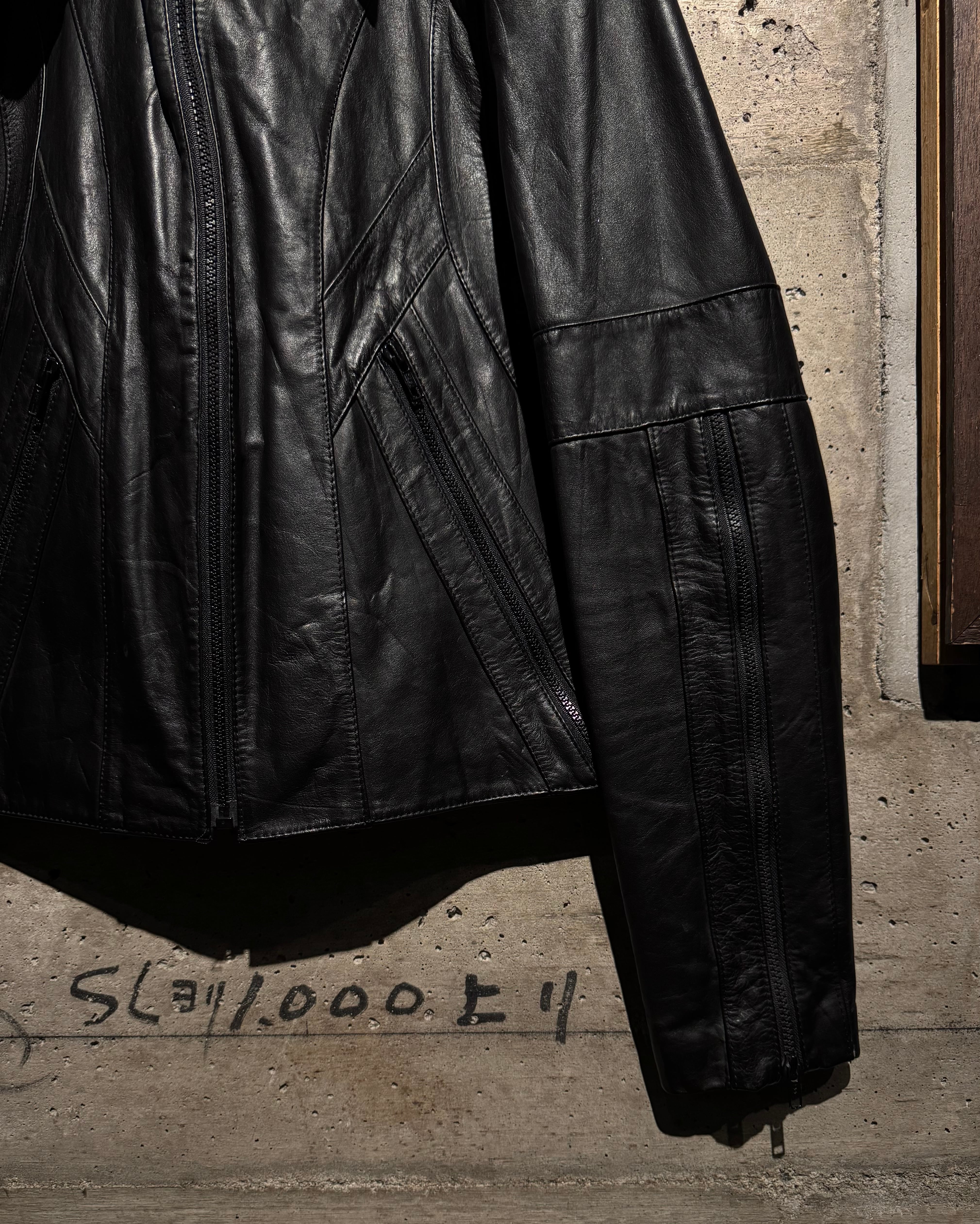 袖口の長めのジップ、そしてフロント、袖にかけて直線的に走る複数のジップと切り替えが立体感を生み出し、シンプルながらも存在感抜群に仕上げられています。レザーでここまで趣向の凝らされたアイテムはかなり稀少かと。ツギハギ物もそうですが、レザーを複数縫製する作業は匠の技なんですよね。