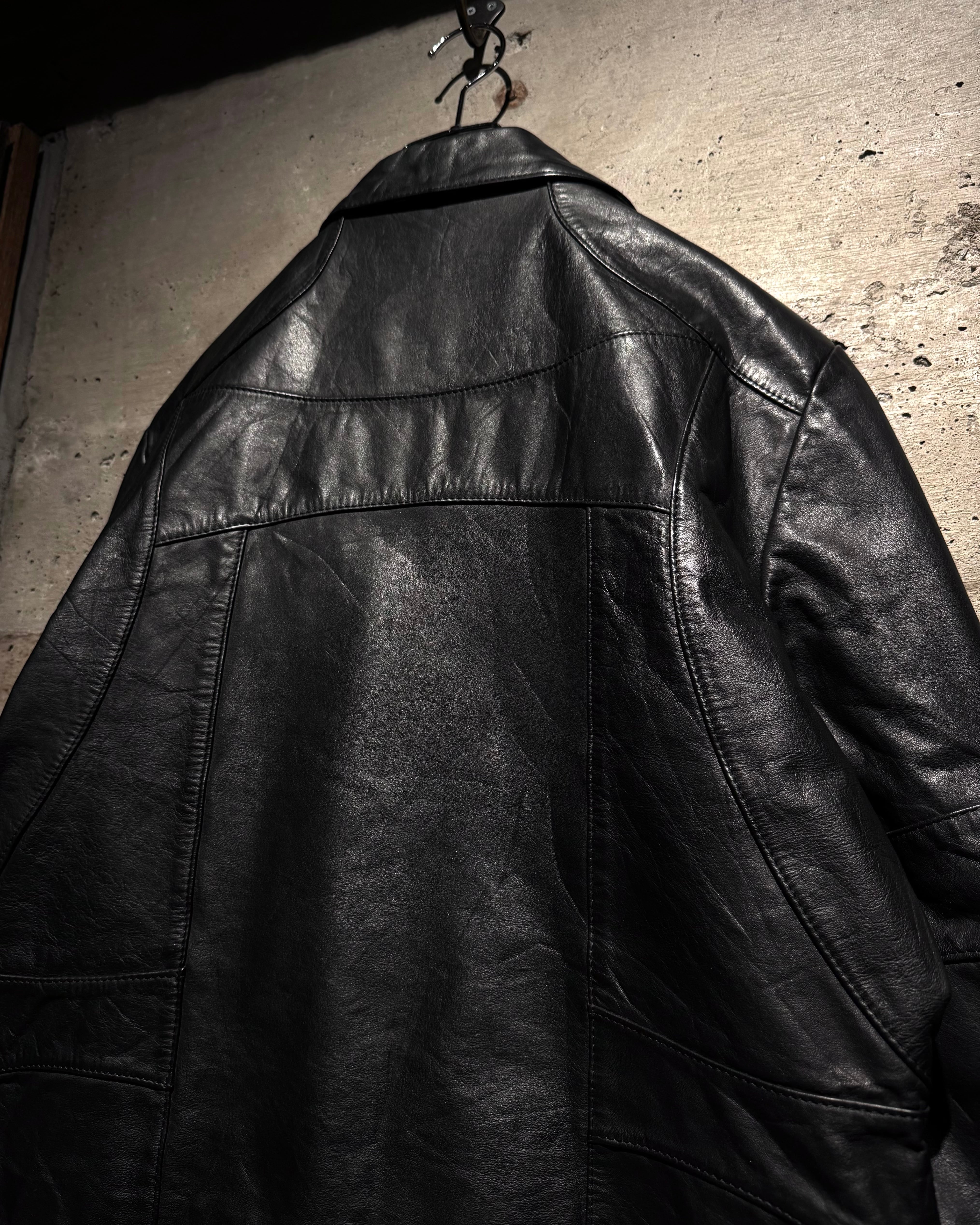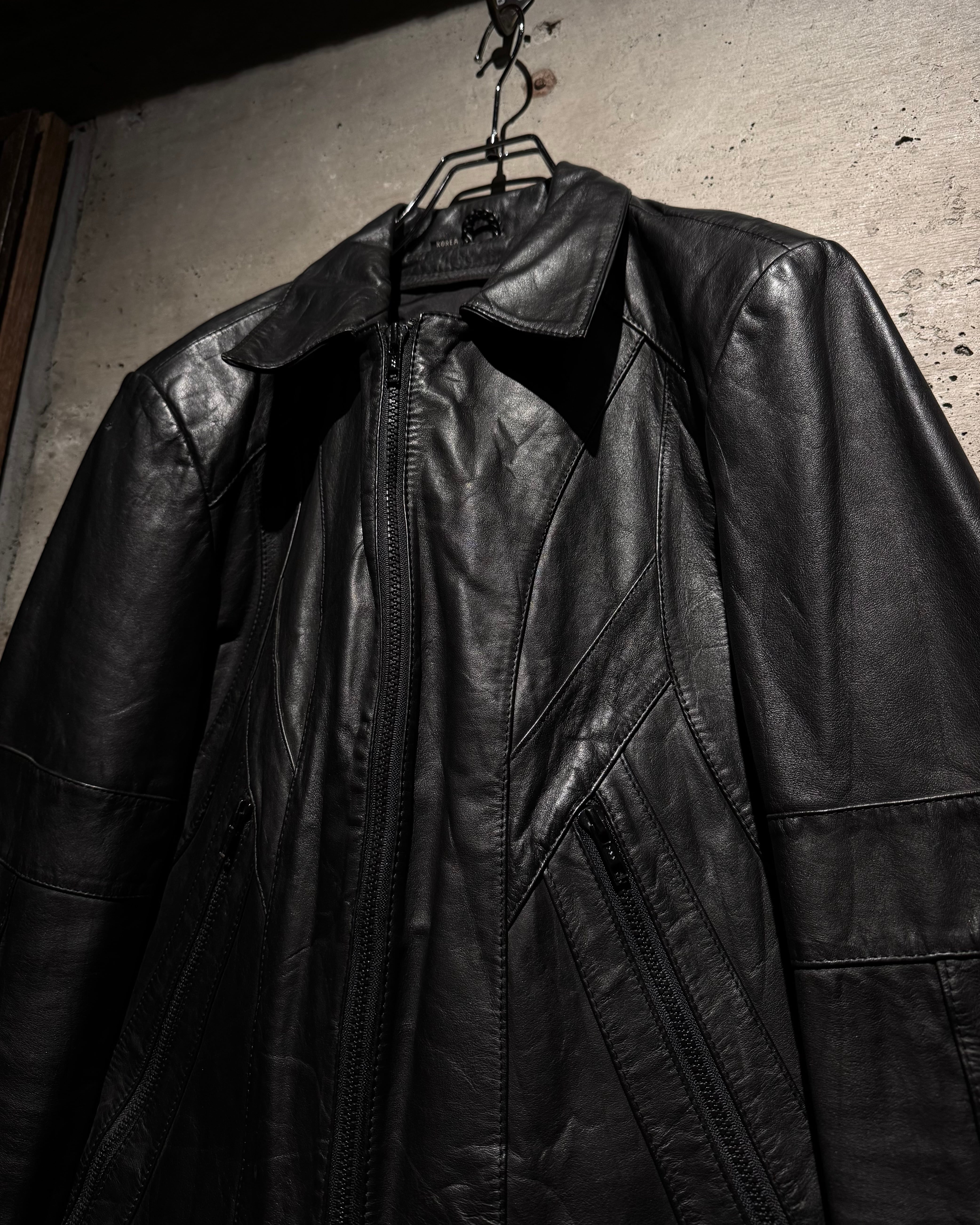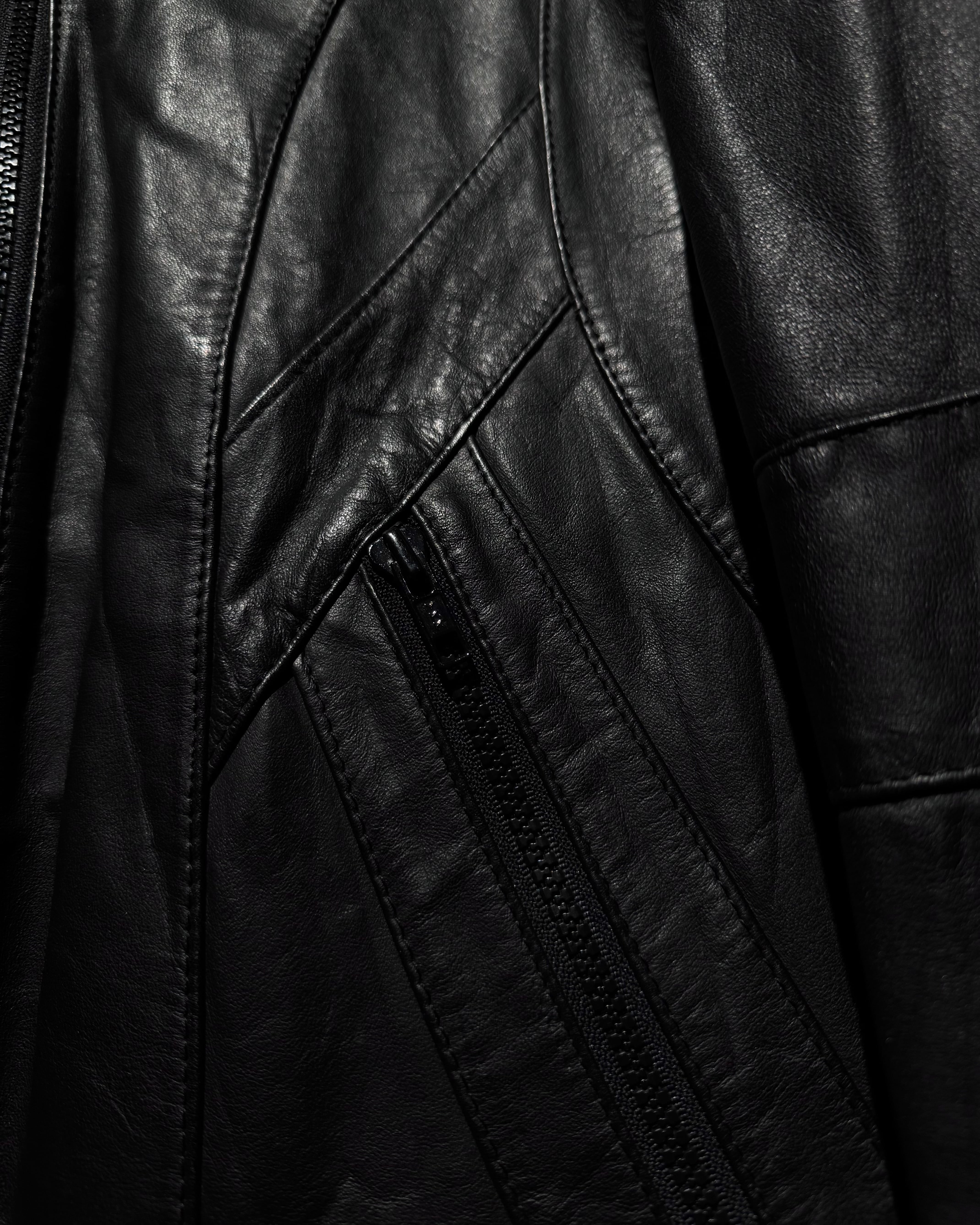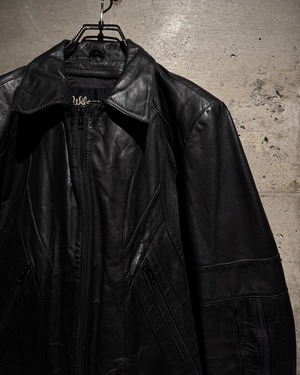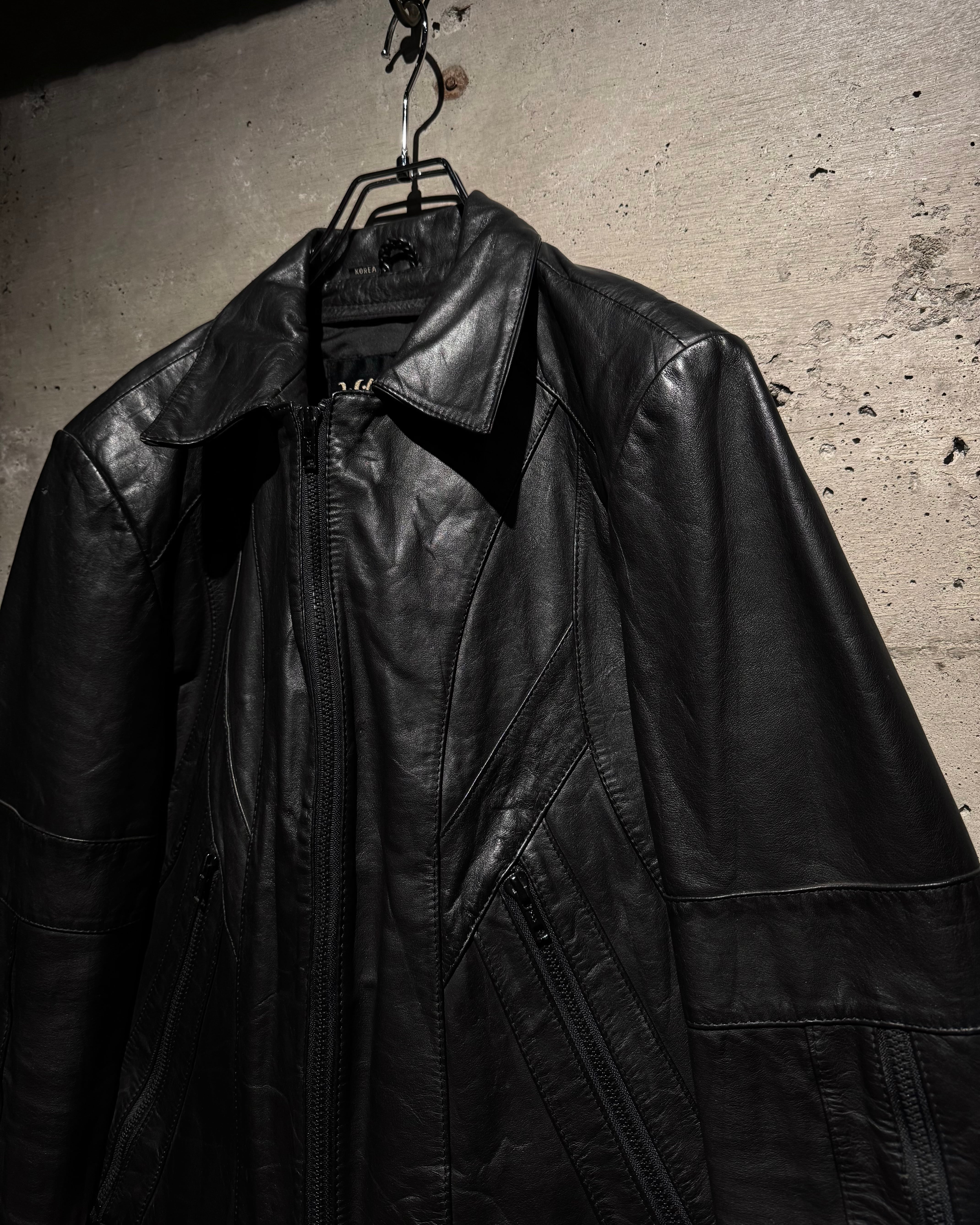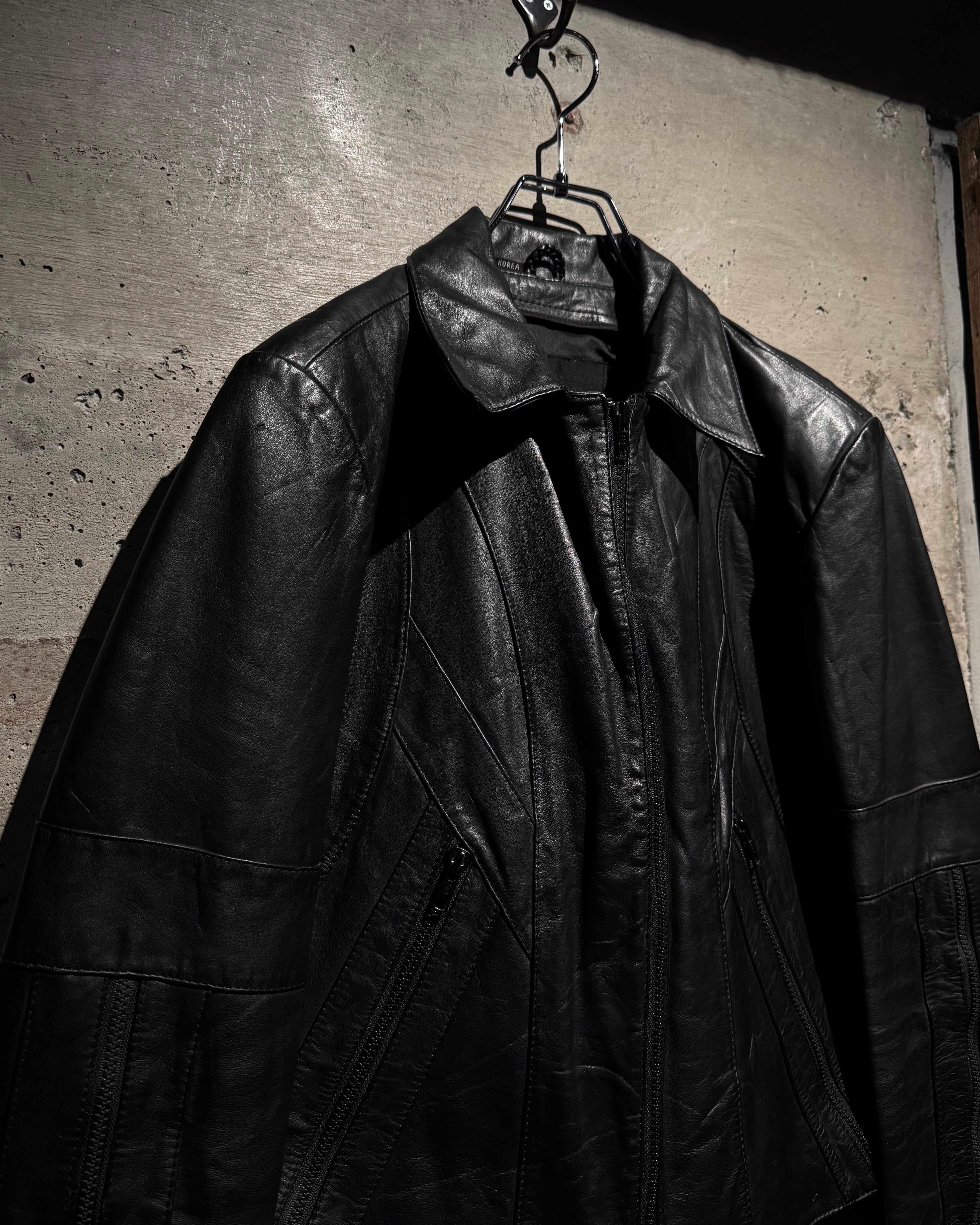 袖口の長めのジップ、そしてフロント、袖にかけて直線的に走る複数のジップと切り替えが立体感を生み出し、シンプルながらも存在感抜群に仕上げられています。レザーでここまで趣向の凝らされたアイテムはかなり稀少かと。ツギハギ物もそうですが、レザーを複数縫製する作業は匠の技なんですよね。