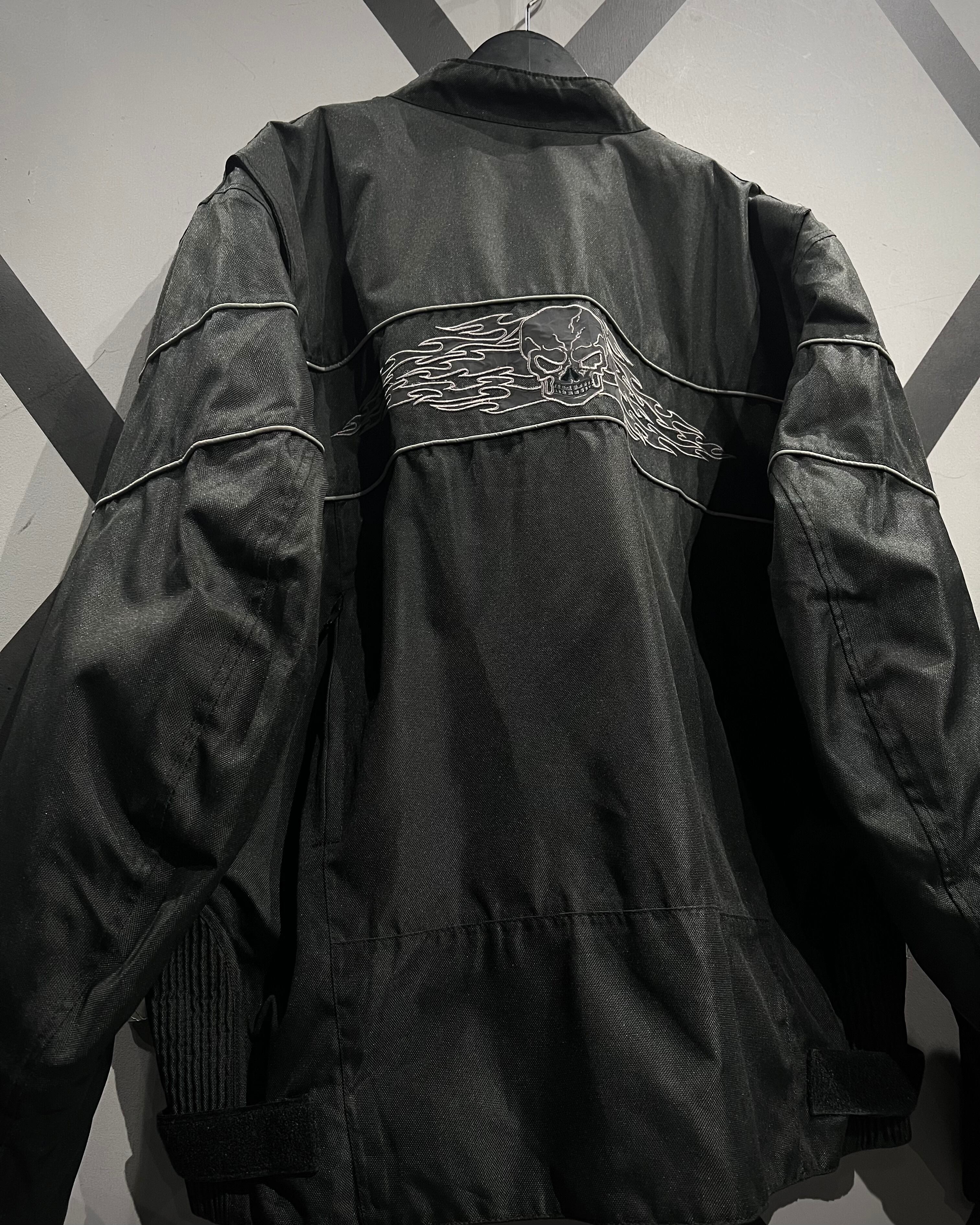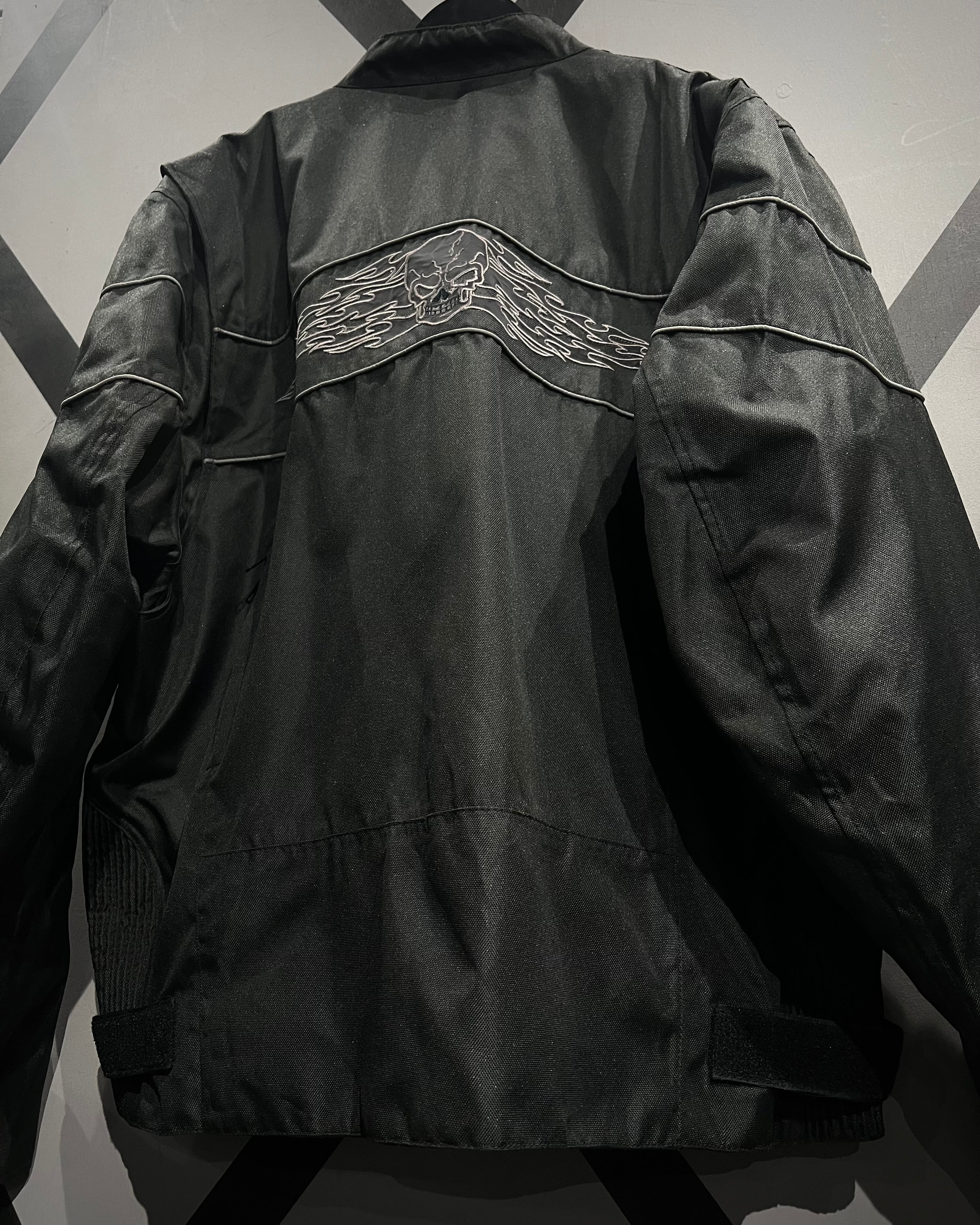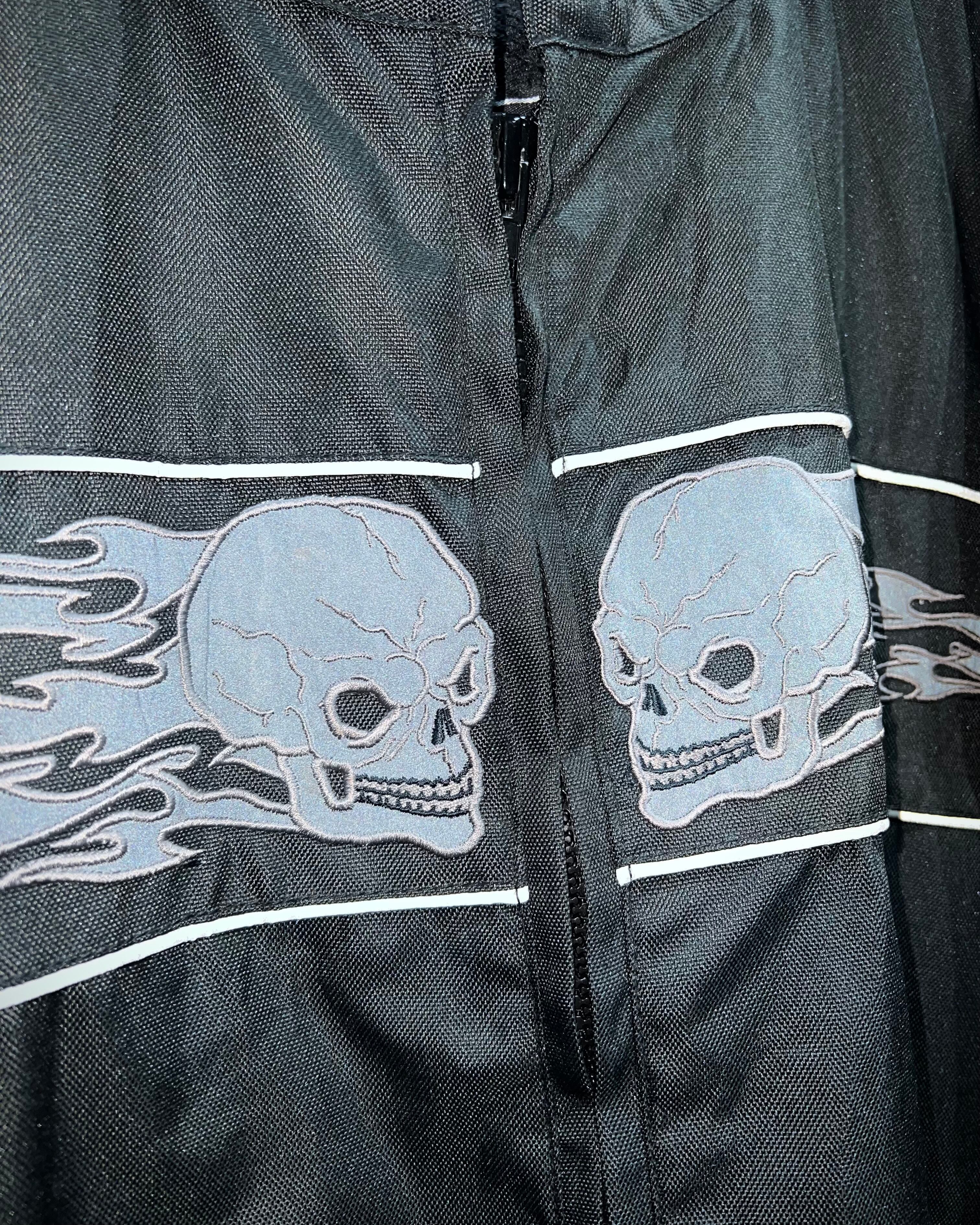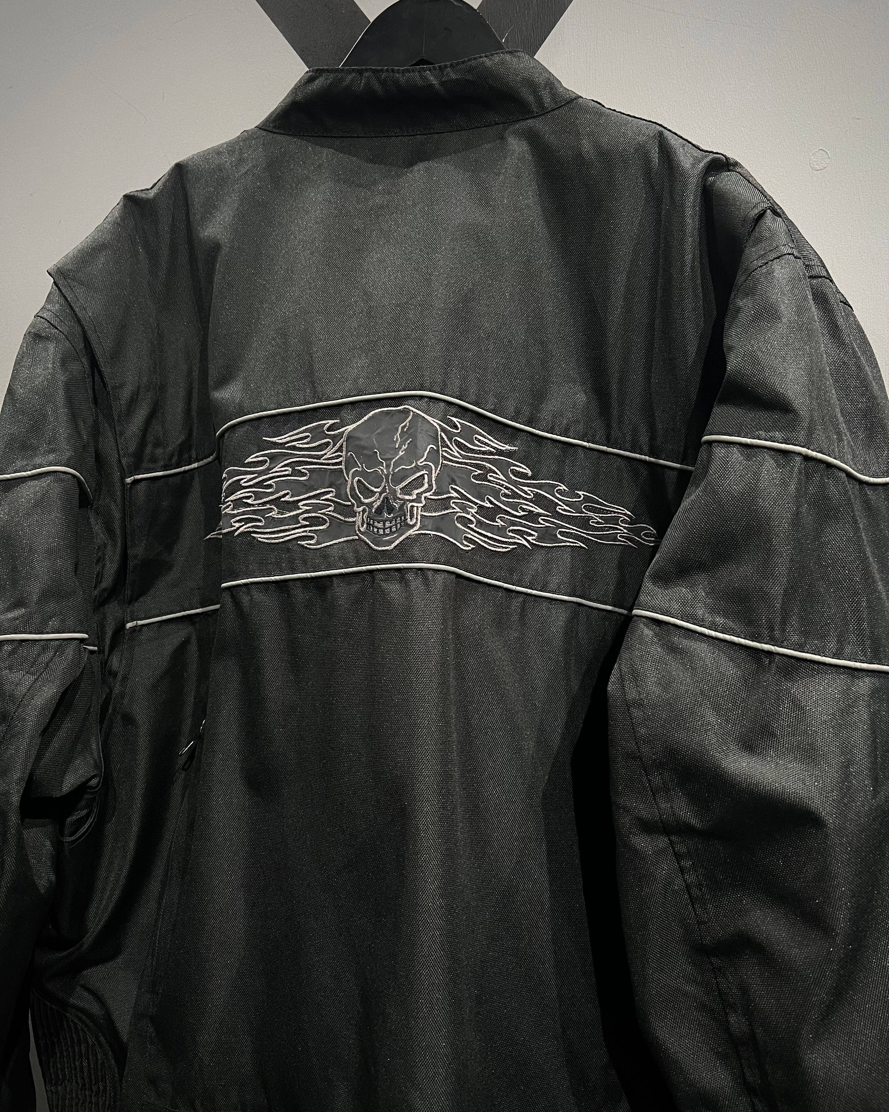 フロントと背面に施されたスカル×フレイムモチーフは、光を反射するリフレクター仕様となっており、夜間でも存在感を放つ圧巻のディテール。