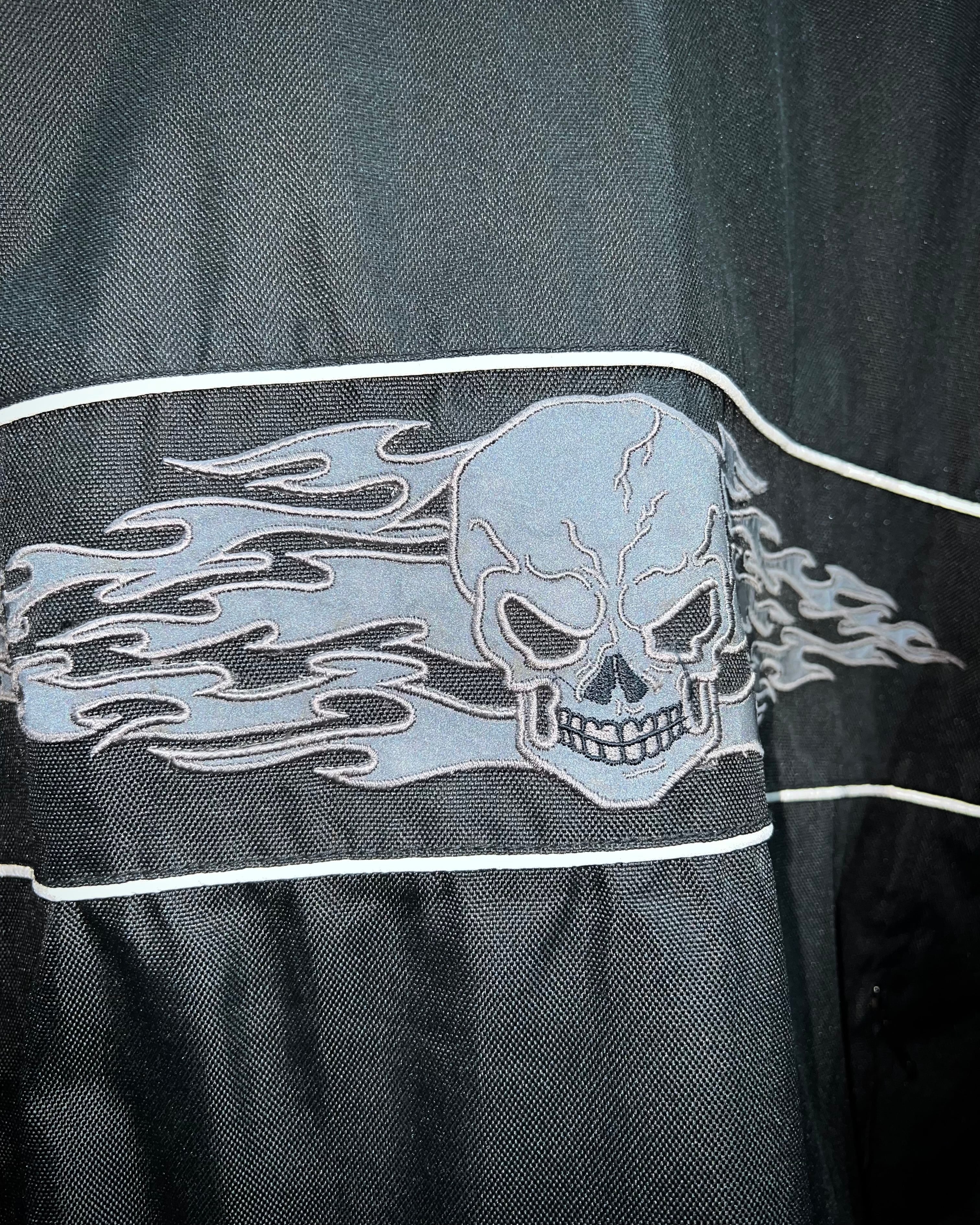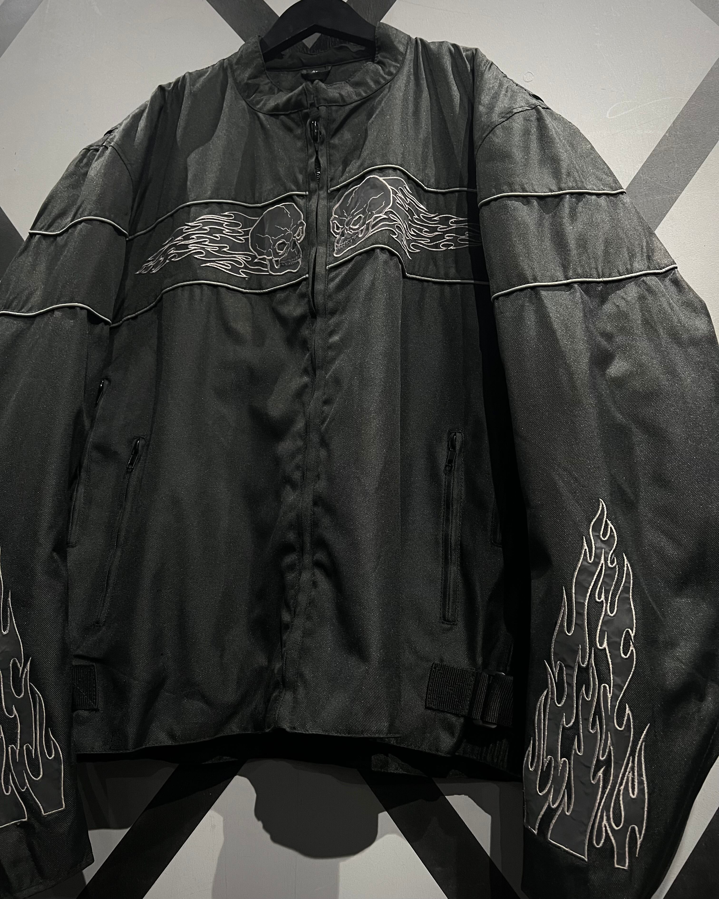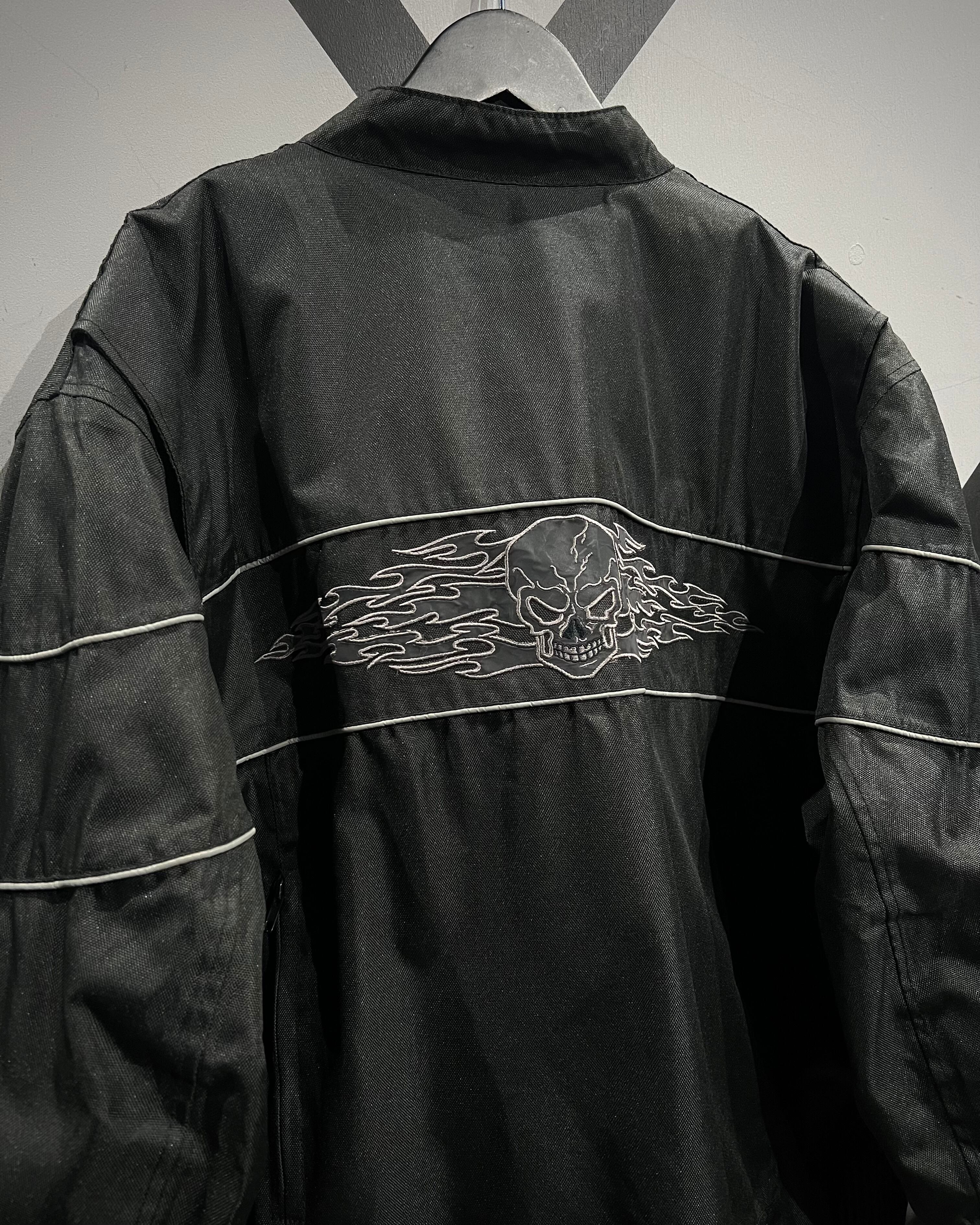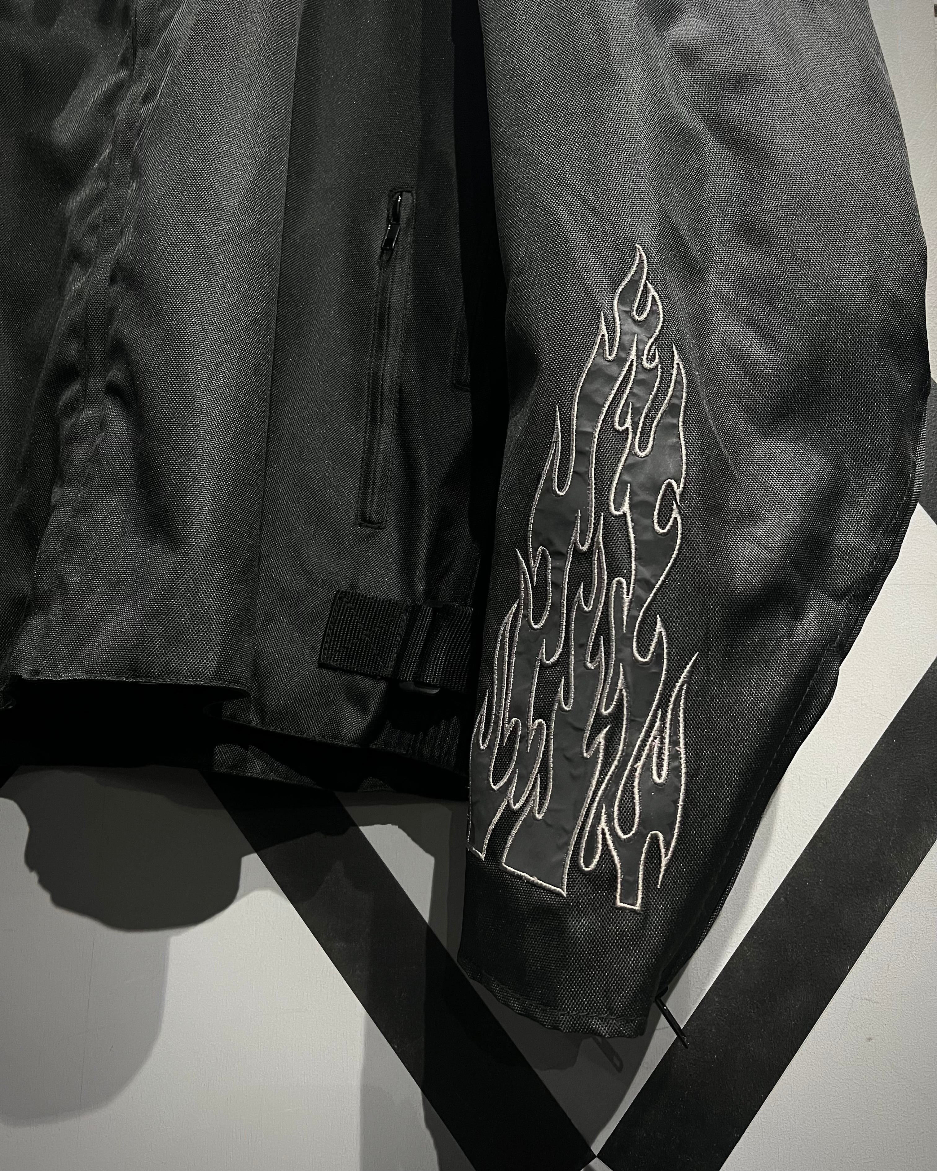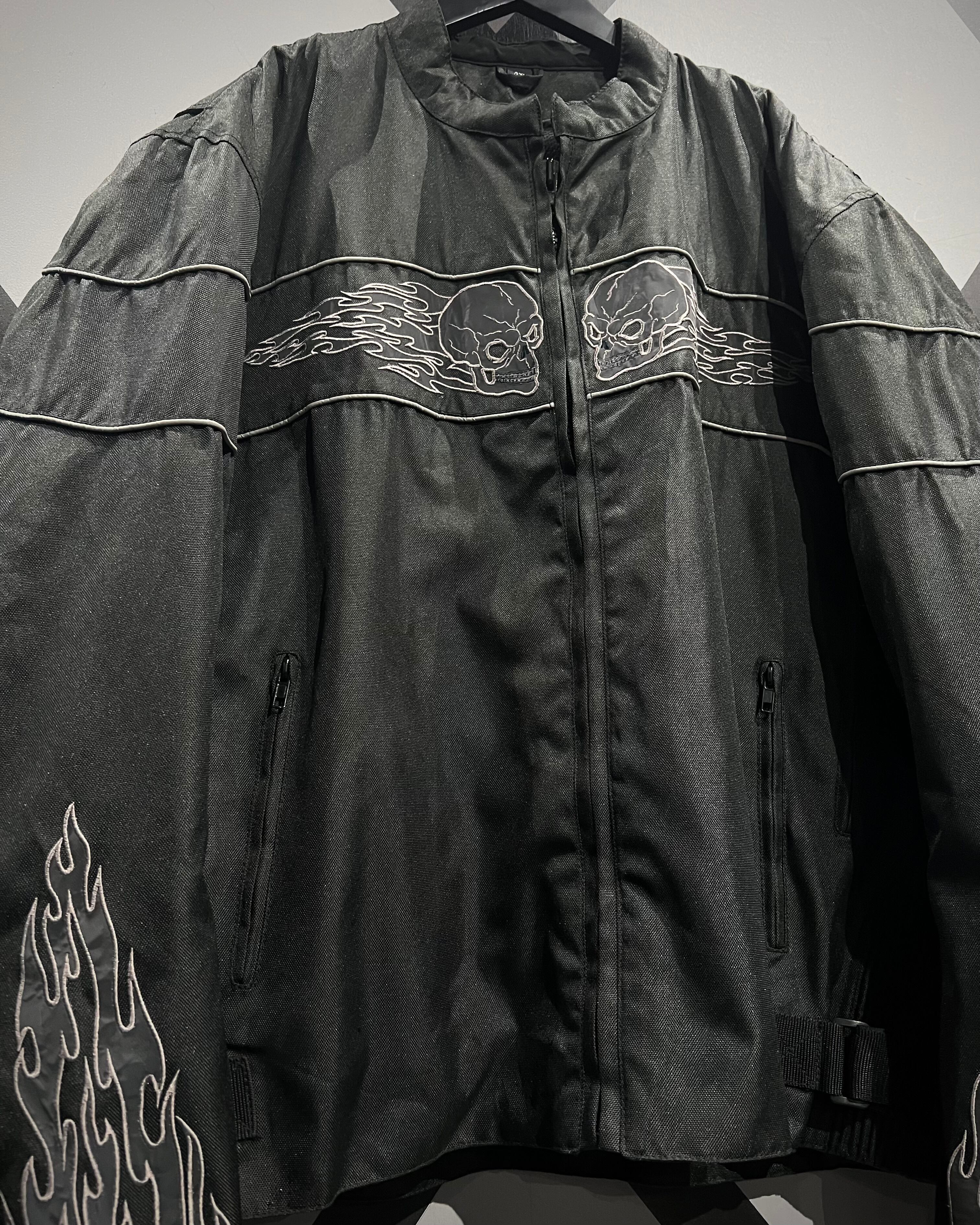 フロントと背面に施されたスカル×フレイムモチーフは、光を反射するリフレクター仕様となっており、夜間でも存在感を放つ圧巻のディテール。