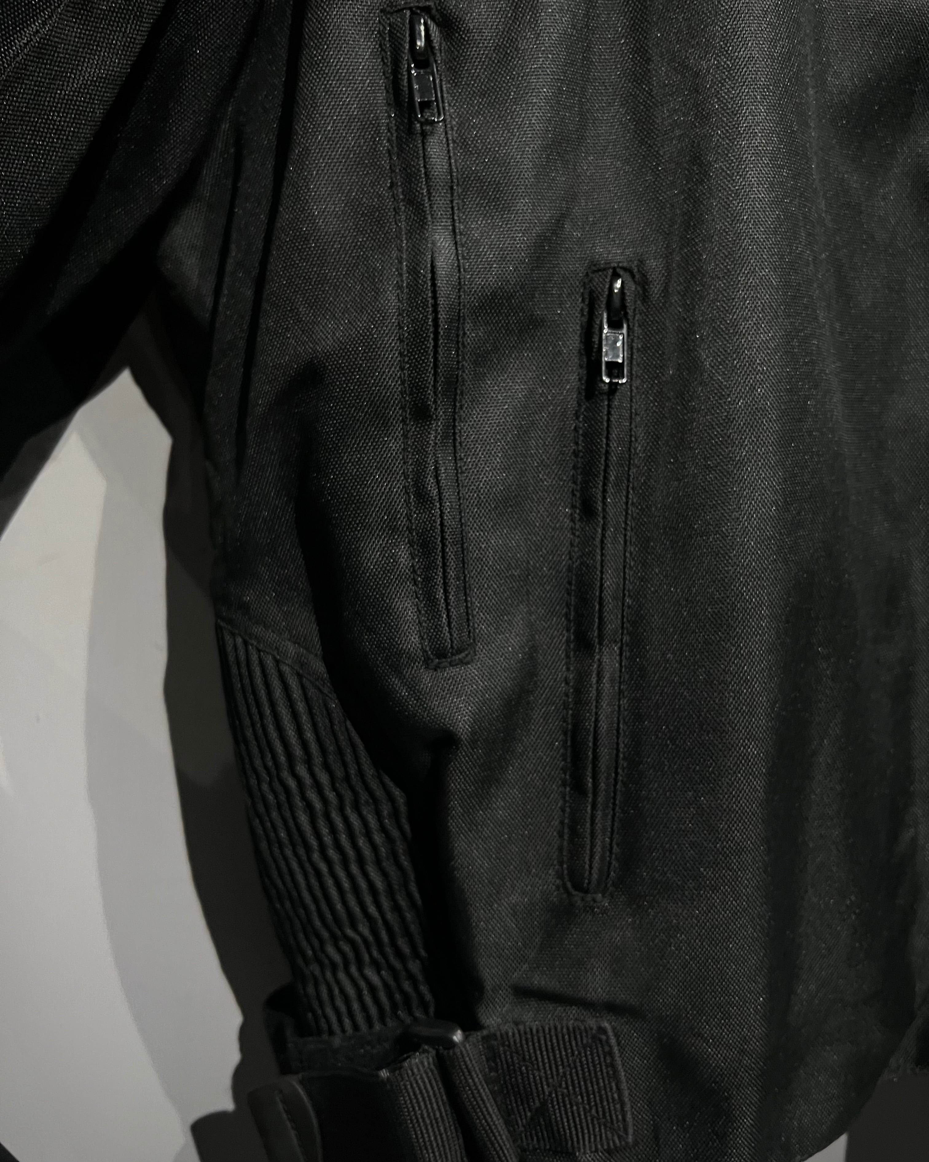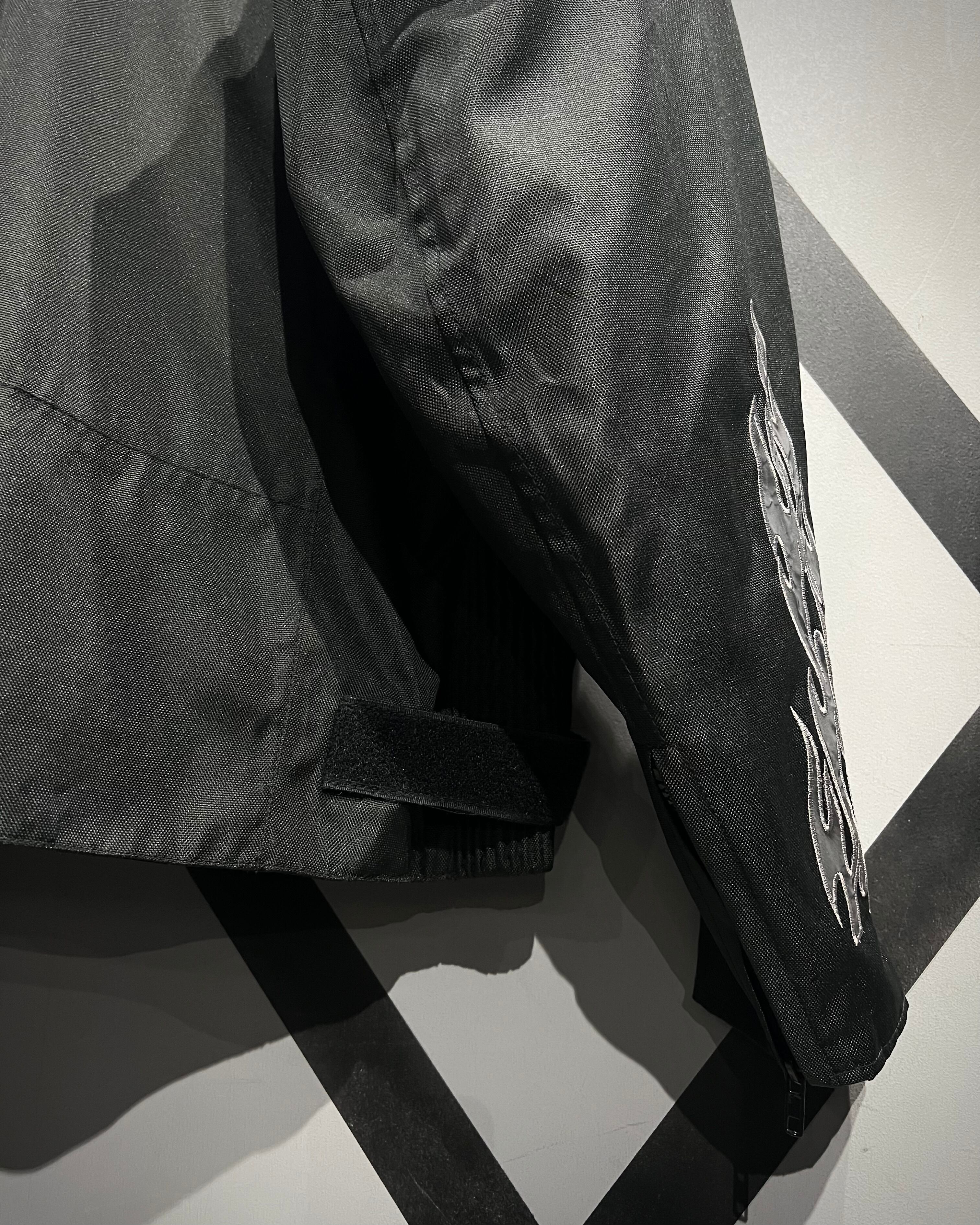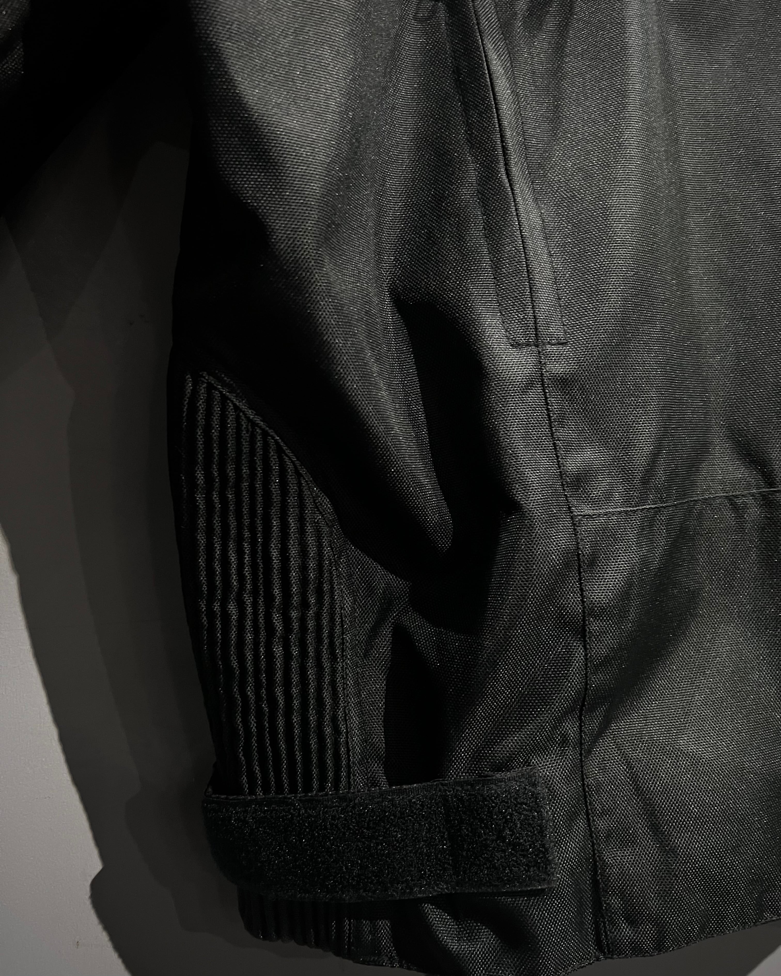 袖やウエストにはアジャスターベルトを配し、シルエットの微調整も自在。ジップポケット、ベンチレーション仕様など、ライディングウェア由来の実用的な設計が随所に光ります。