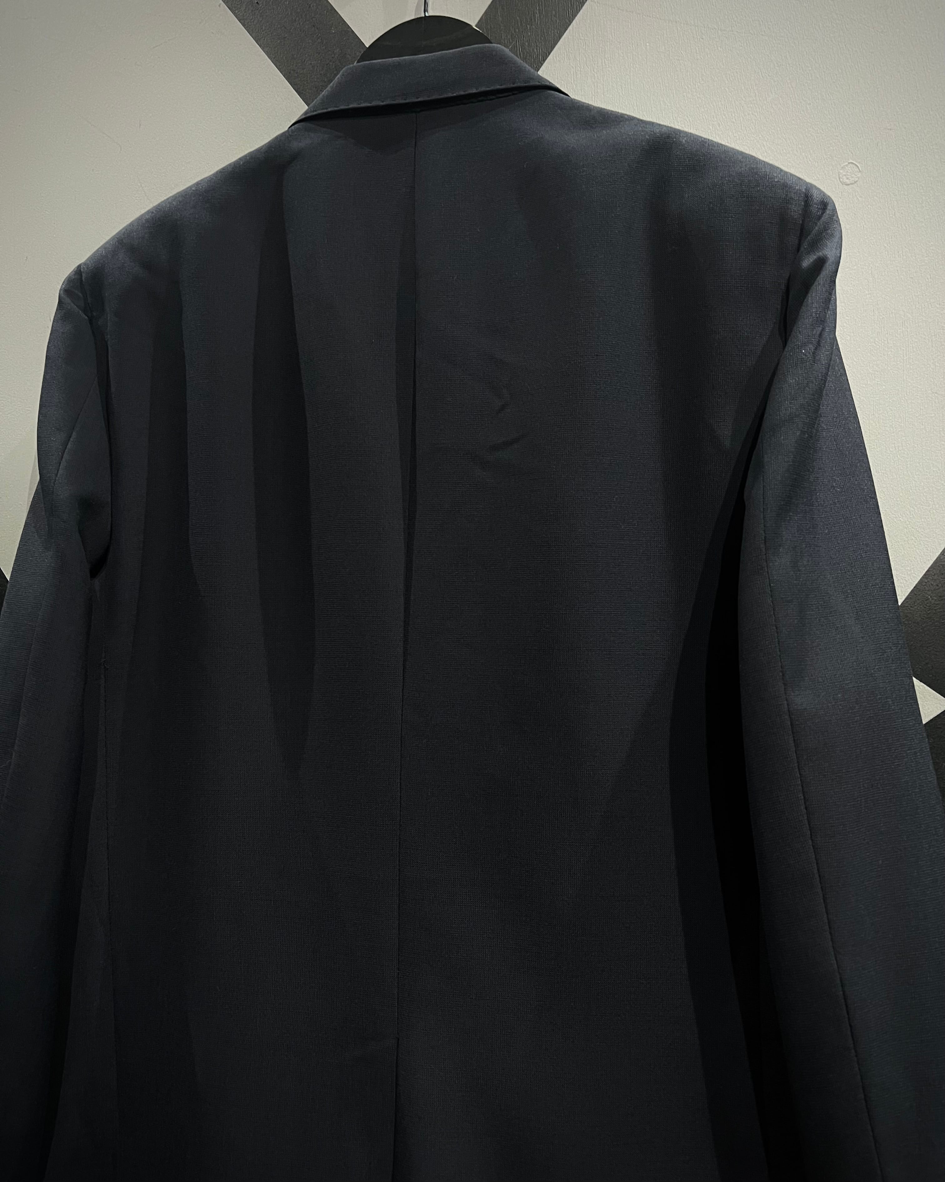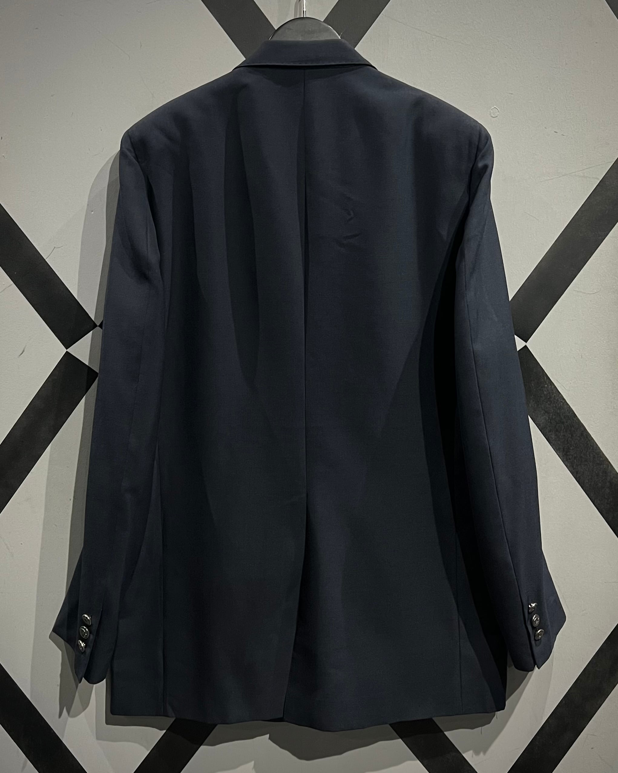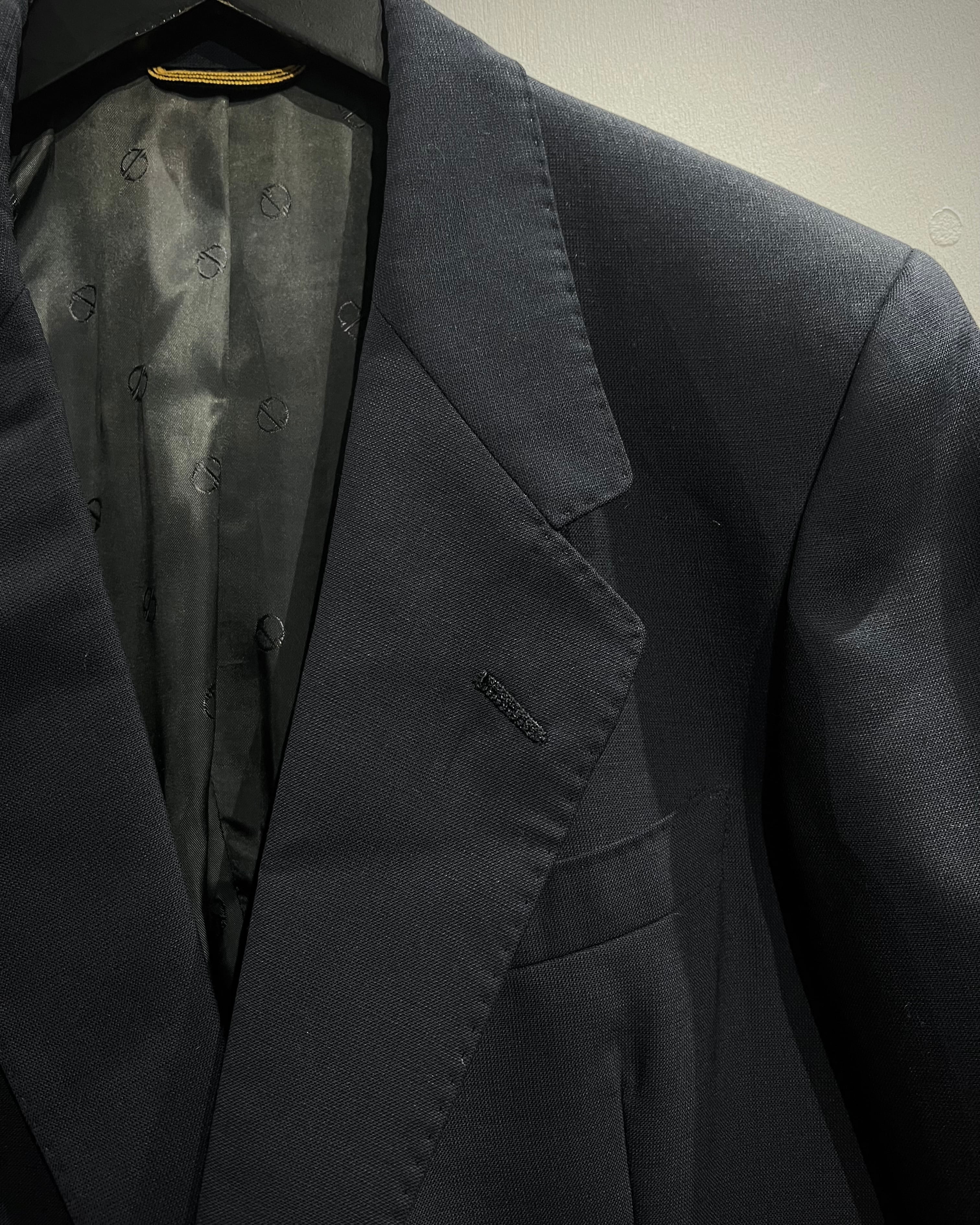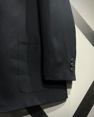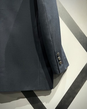 深みのあるネイビーのボディは、ウール混の上質な生地感で、程よいハリと柔らかさを兼ね備えた仕立て。胸元のノッチドラペルや、ポケットのバランス感が美しく、流石の一言に尽きますね。