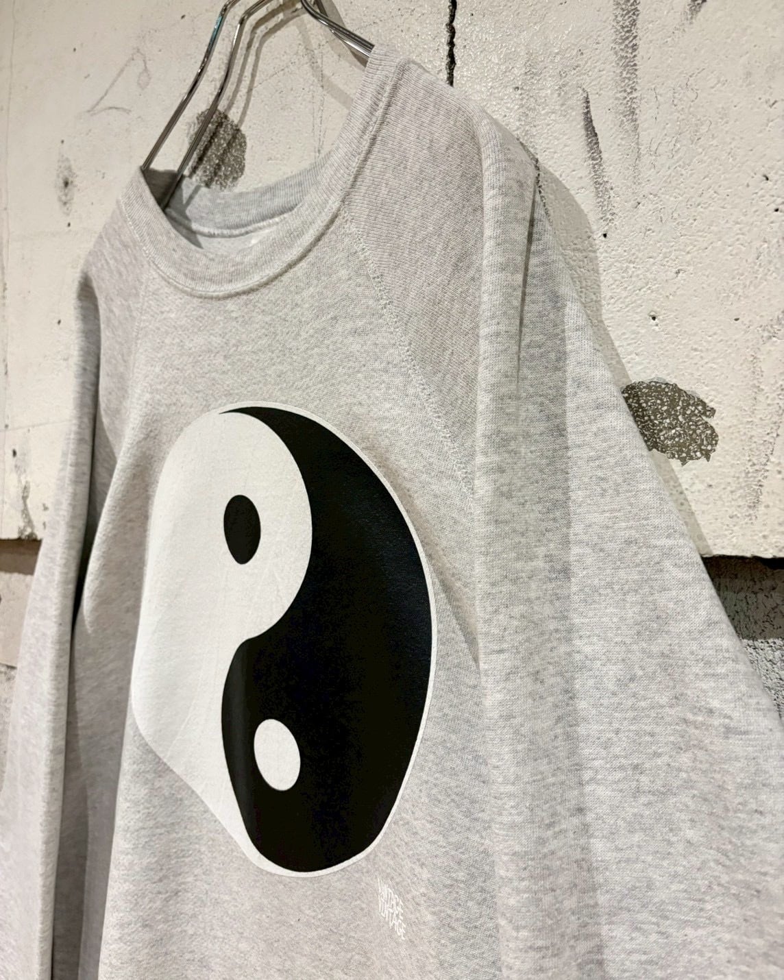 ベースは扱いやすいライトグレー。主張の強すぎない陰陽グラフィックが絶妙な抜け感を演出し、一枚着はもちろん、レイヤードスタイルにも最適。