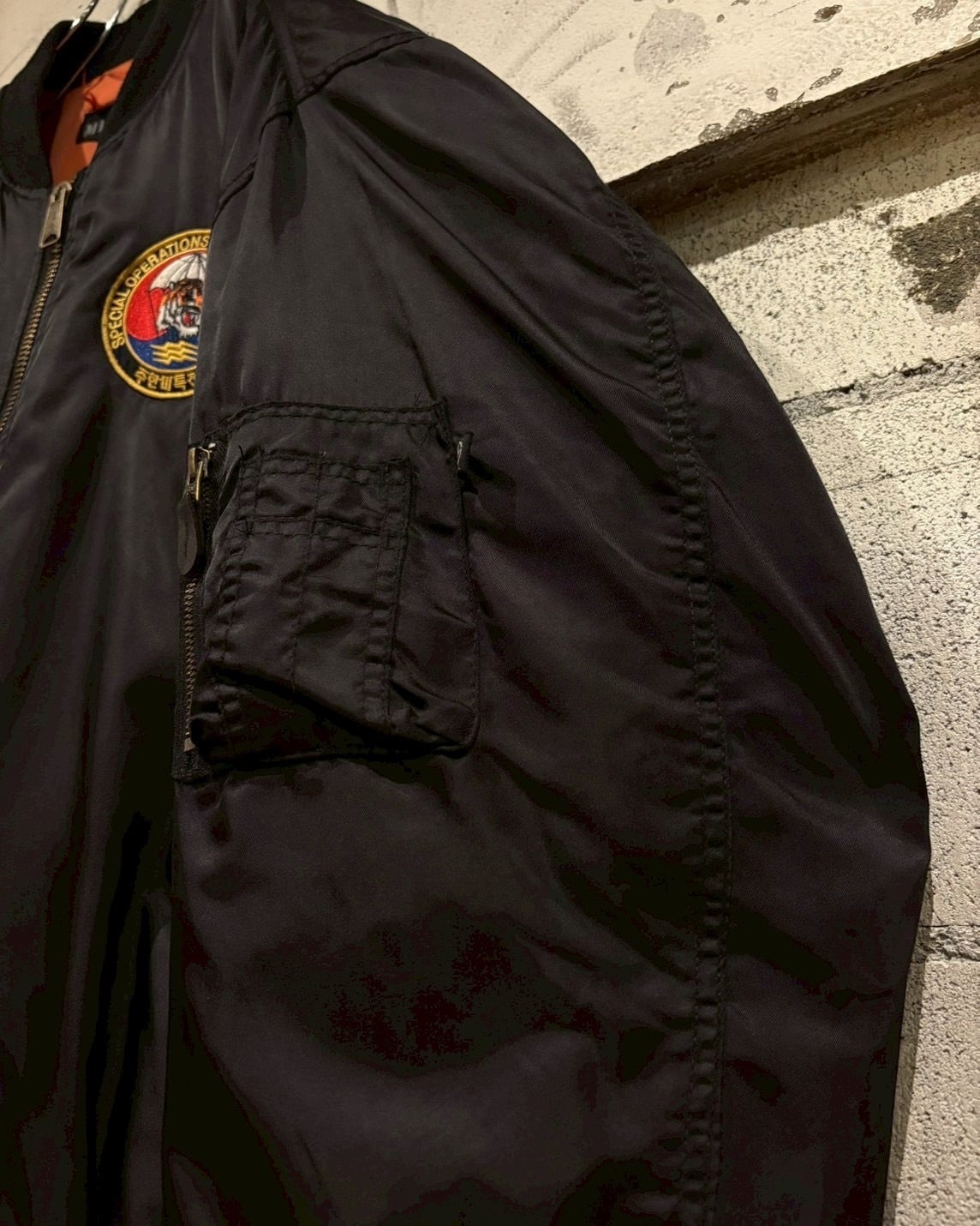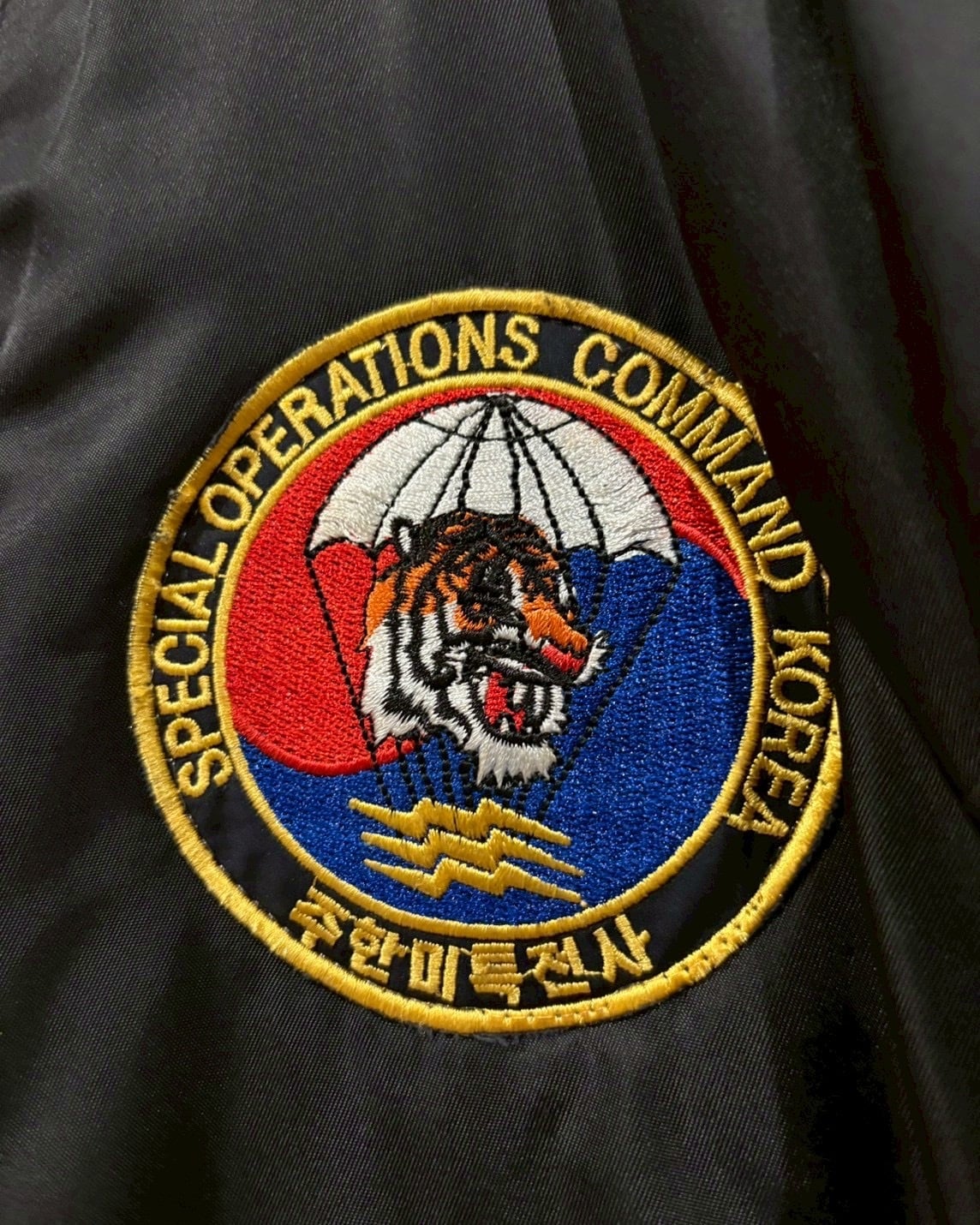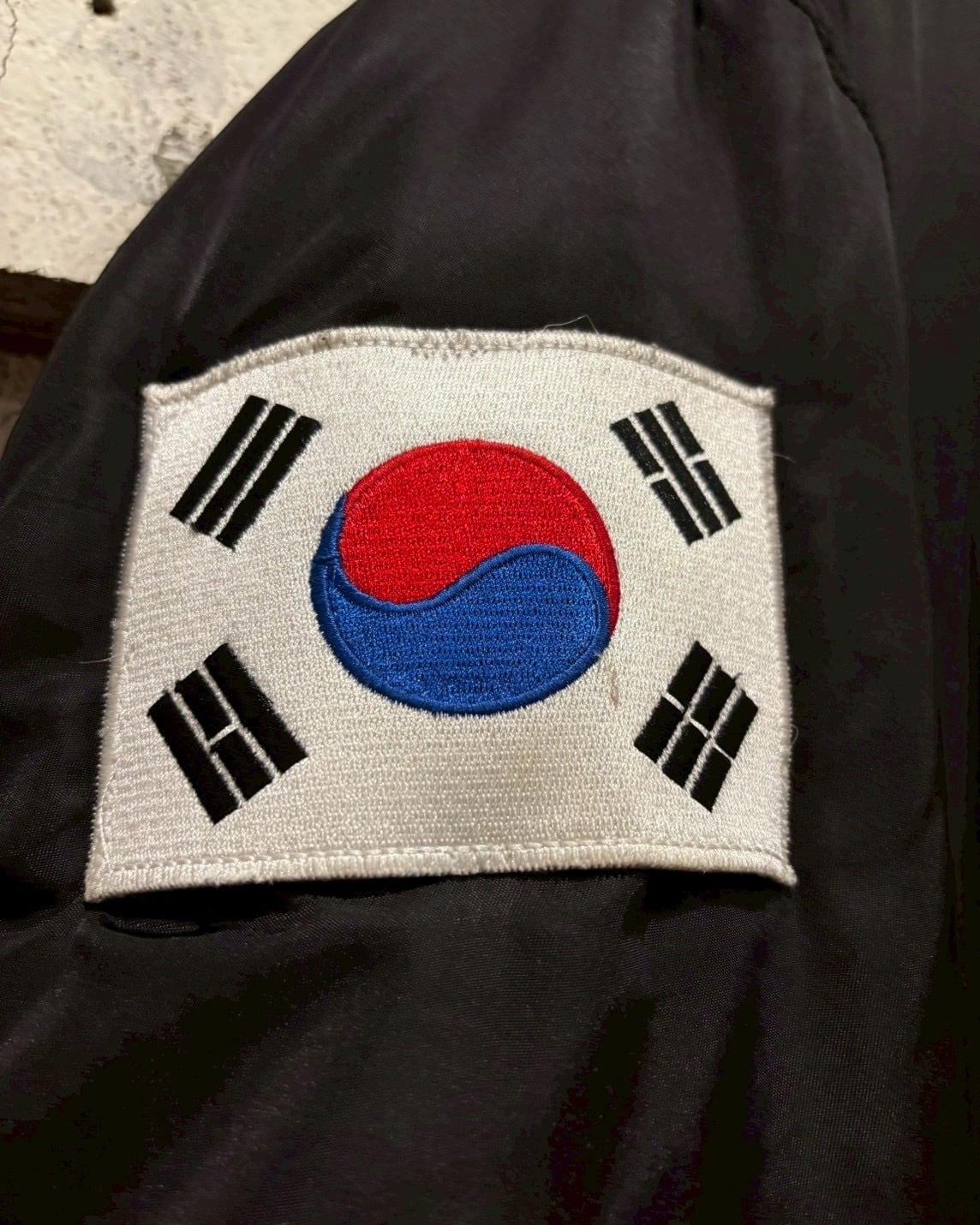 上品な光沢を帯びたブラックナイロンボディを採用し、左胸には“韓国特殊作戦軍”の刺繍ワッペン、右袖には韓国国旗パッチを備えた存在感抜群のMA-1。