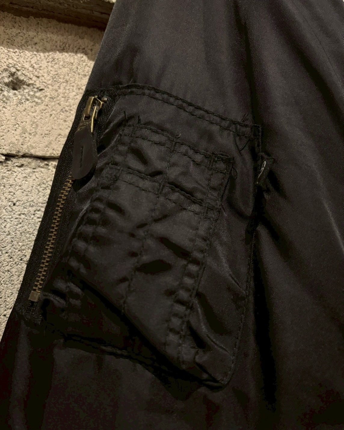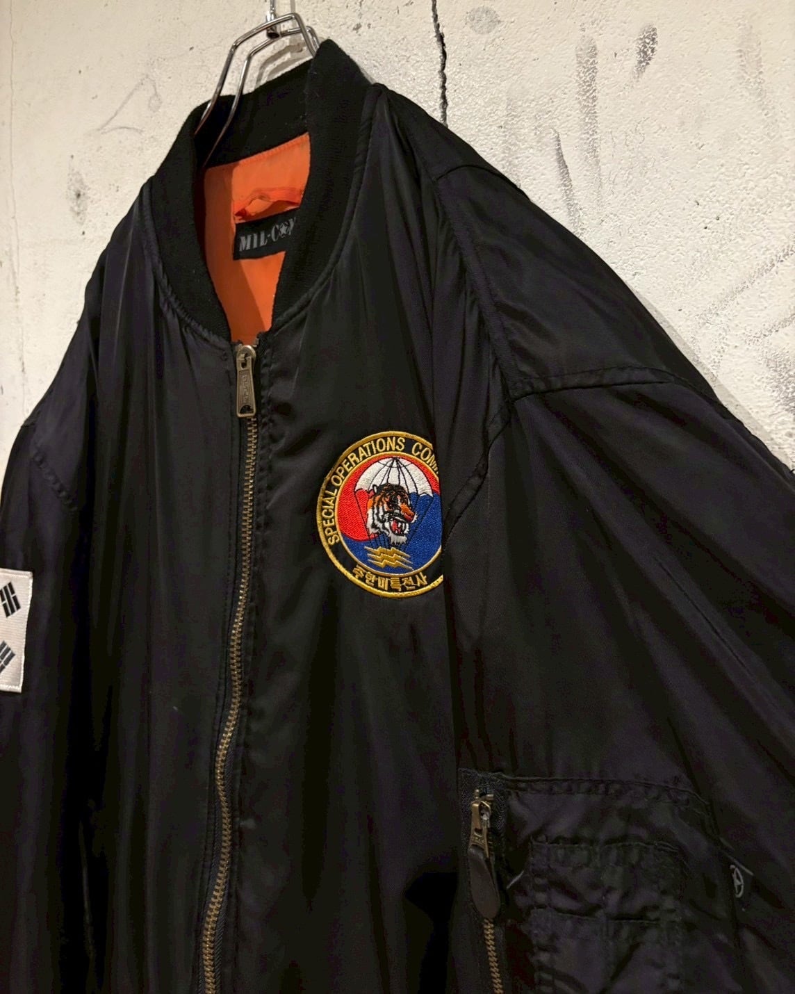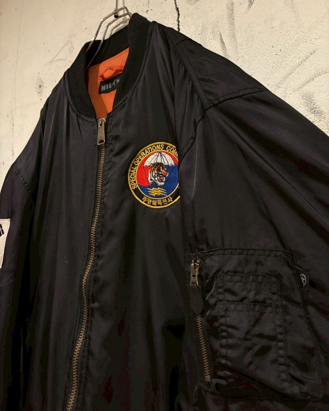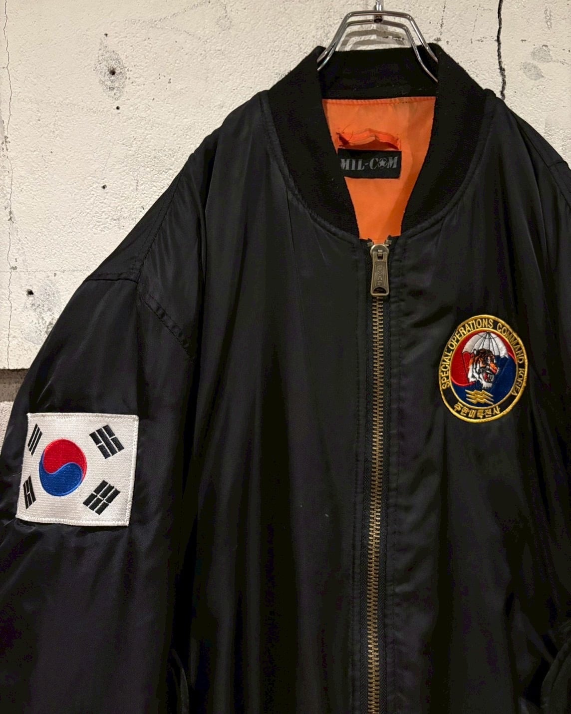 上品な光沢を帯びたブラックナイロンボディを採用し、左胸には“韓国特殊作戦軍”の刺繍ワッペン、右袖には韓国国旗パッチを備えた存在感抜群のMA-1。